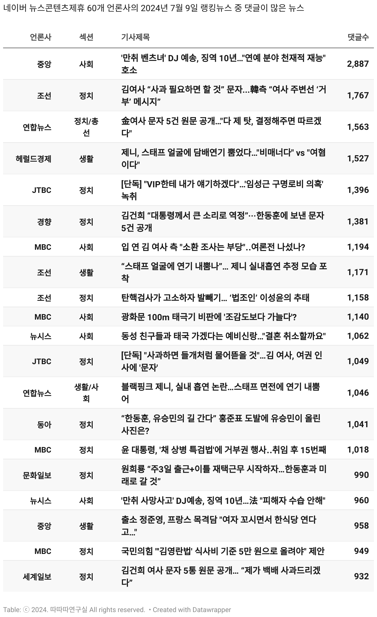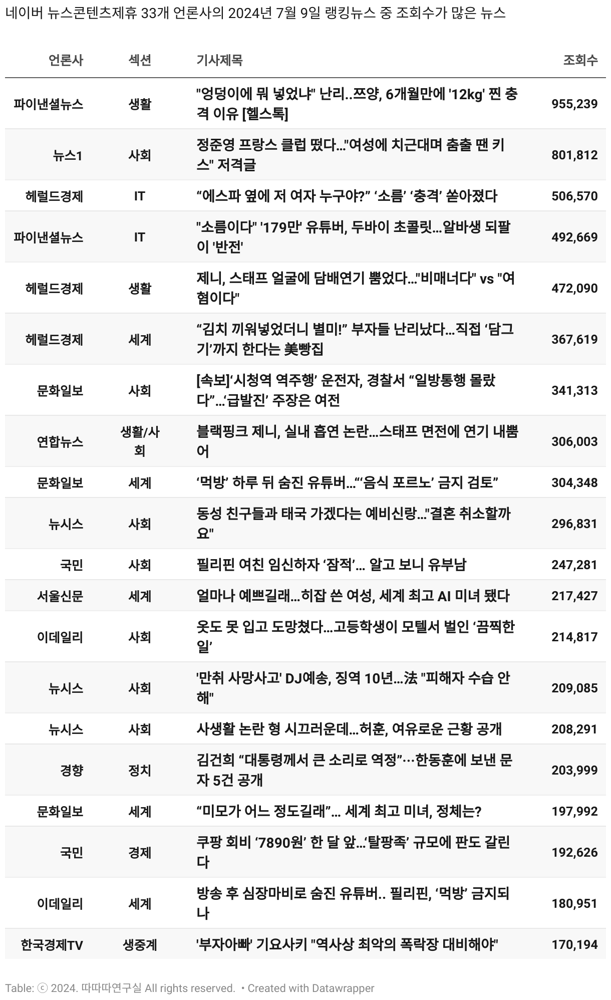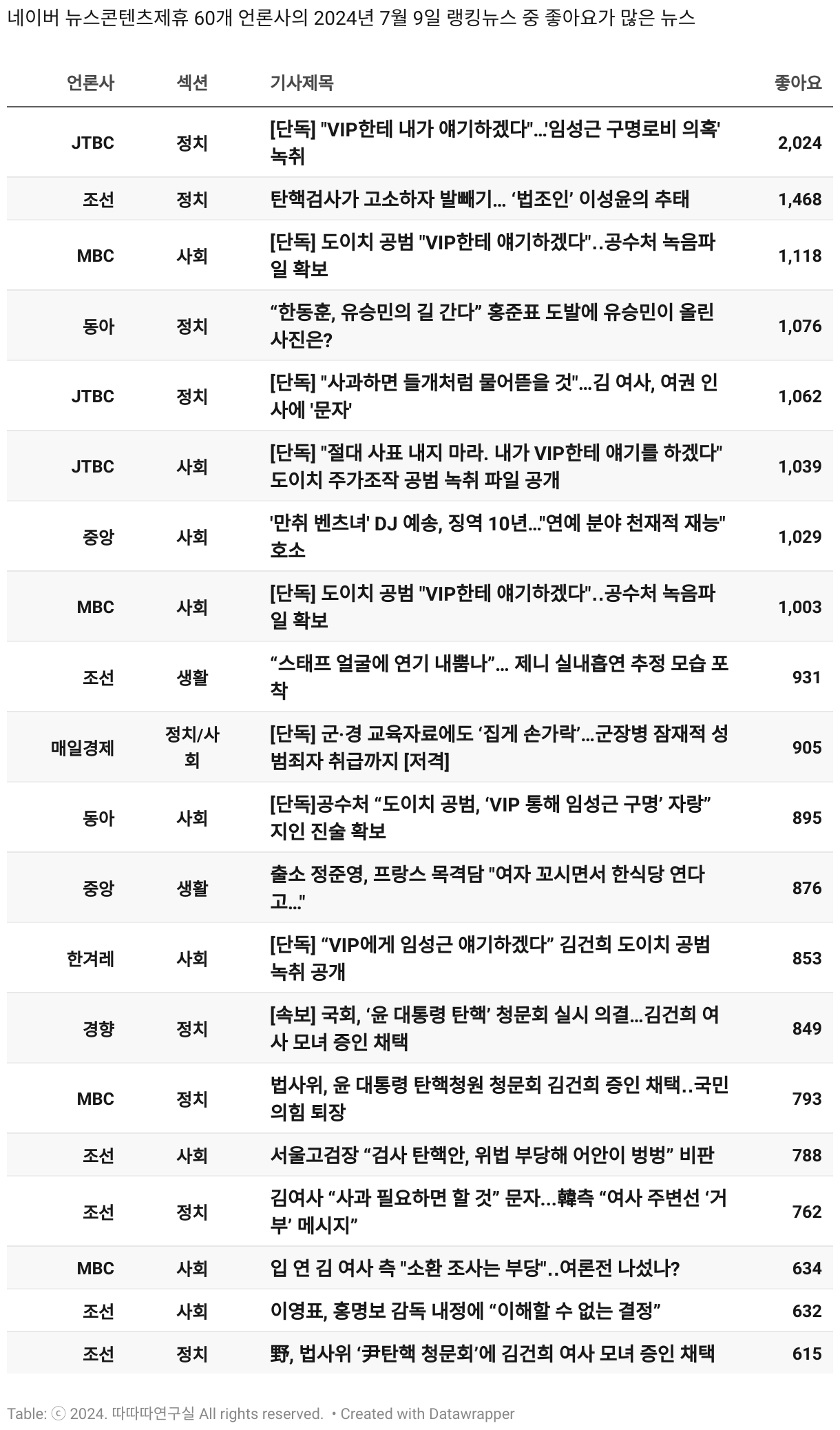 *데이터 수집 기간 : 2024년 6월 10일 *데이터 수집 대상 : 네이버 뉴스콘텐츠제휴 60개 언론사. 종합일간지 10개(경향신문, 국민일보, 동아일보, 문화일보, 서울신문, 세계일보, 조선일보, 중앙일보, 한겨레신문, 한국일보), 방송/통신사 14개(뉴스1, 뉴시스, 연합뉴스, 연합뉴스TV, 채널A, 한국경제TV, JTBC, KBS, MBC, MBN, SBS, SBS BIZ, TV조선, YTN), 경제지 11개(매일경제, 머니투데이, 비즈워치, 서울경제, 아시아경제, 이데일리, 조선비즈, 조세일보, 파이낸셜뉴스, 한국경제(유튜브제외), 헤럴드경제) 인터넷 8개(노컷뉴스, 더팩트, 데일리안, 머니S, 미디어오늘, 아이뉴스24, 오마이뉴스, 프레시안), IT 5개(디지털데일리,디지털타임스, 블로터, 전자신문, 지디넷코리아), 지역 12개(강원도민일보, 강원일보, 경기일보, 국제신문, 대구MBC, 대전일보, 매일신문, 부산일보, 전주MBC, CJB청주방송, JIBS, kbc광주방송)