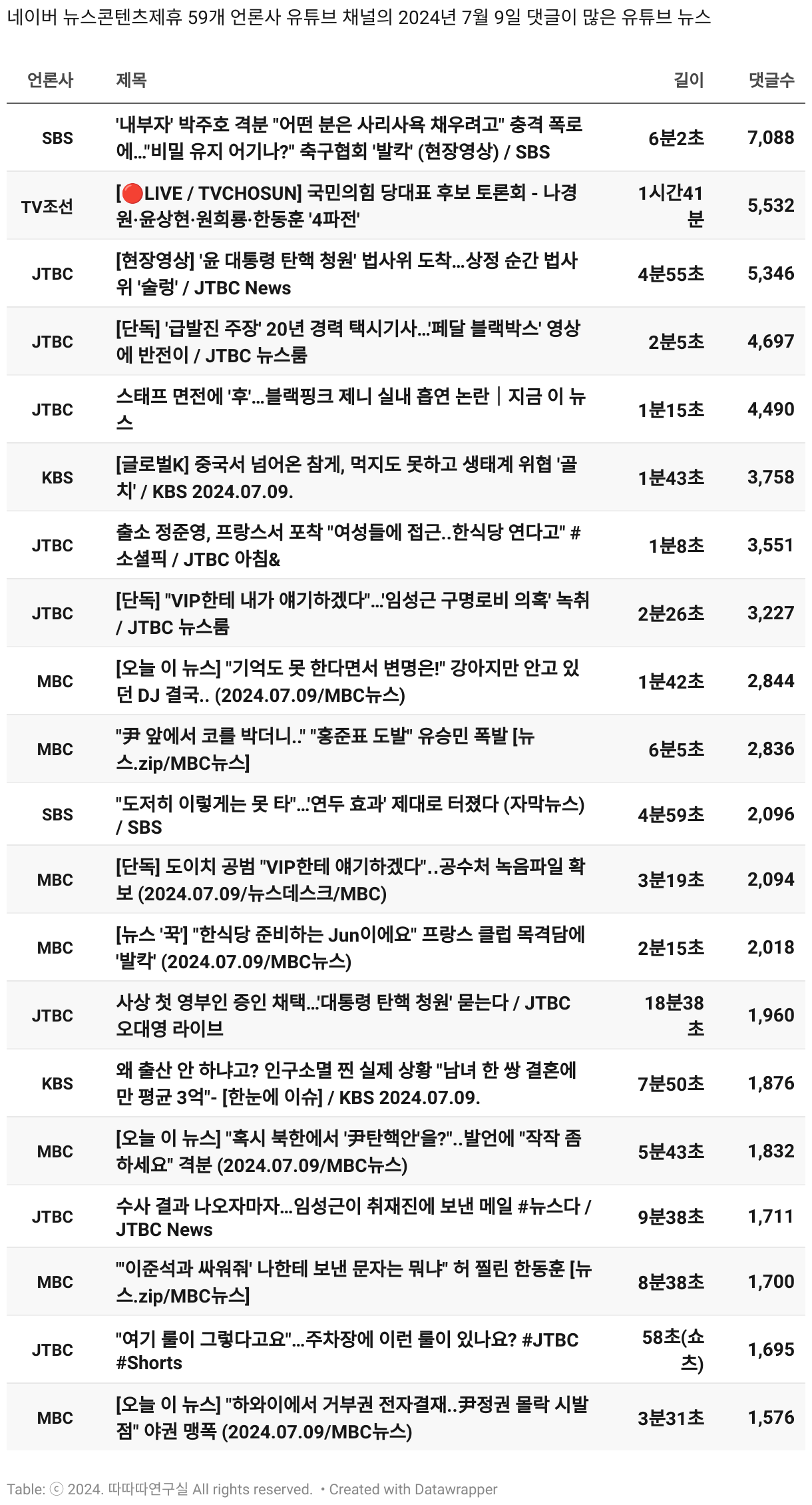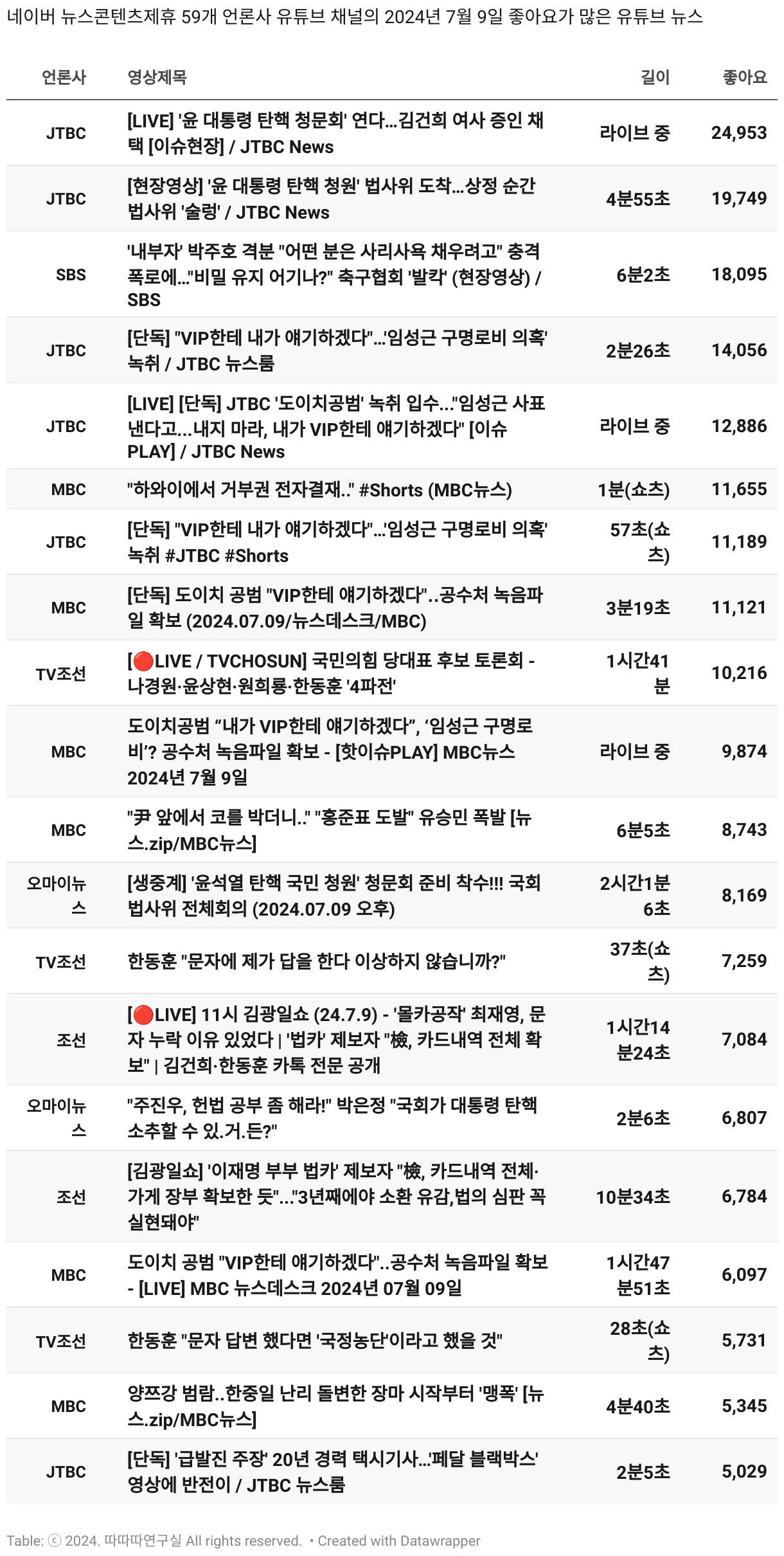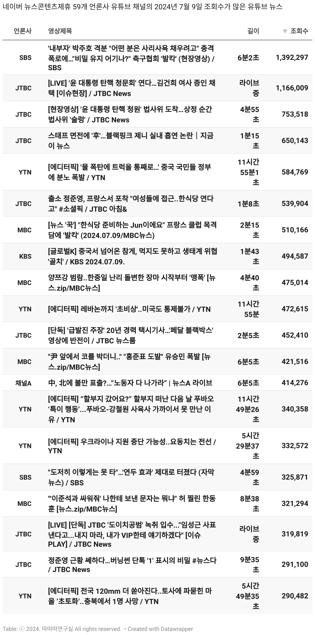 *데이터 수집 기간 : 2024년 6월 10일 *데이터 수집 대상 : 네이버 뉴스콘텐츠제휴 60개 언론사. 종합일간지 10개(경향신문, 국민일보, 동아일보, 문화일보, 서울신문, 세계일보, 조선일보, 중앙일보, 한겨레신문, 한국일보), 방송/통신사 14개(뉴스1, 뉴시스, 연합뉴스, 연합뉴스TV, 채널A, 한국경제TV, JTBC, KBS, MBC, MBN, SBS, SBS BIZ, TV조선, YTN), 경제지 11개(매일경제, 머니투데이, 비즈워치, 서울경제, 아시아경제, 이데일리, 조선비즈, 조세일보, 파이낸셜뉴스, 한국경제(유튜브제외), 헤럴드경제) 인터넷 8개(노컷뉴스, 더팩트, 데일리안, 머니S, 미디어오늘, 아이뉴스24, 오마이뉴스, 프레시안), IT 5개(디지털데일리,디지털타임스, 블로터, 전자신문, 지디넷코리아), 지역 12개(강원도민일보, 강원일보, 경기일보, 국제신문, 대구MBC, 대전일보, 매일신문, 부산일보, 전주MBC, CJB청주방송, JIBS, kbc광주방송)