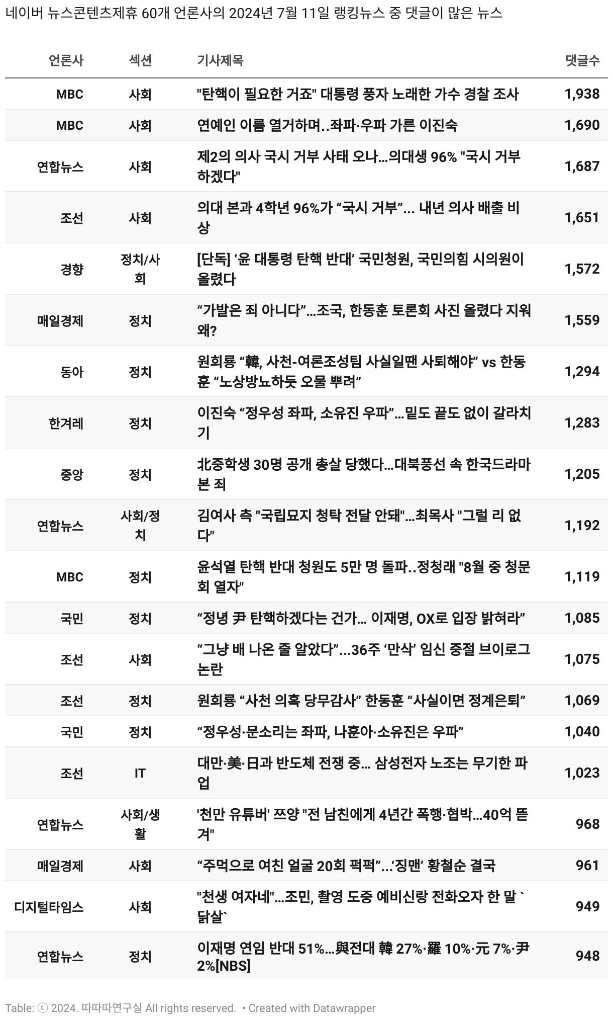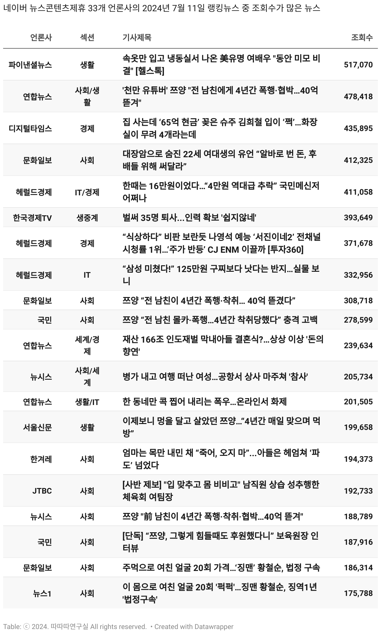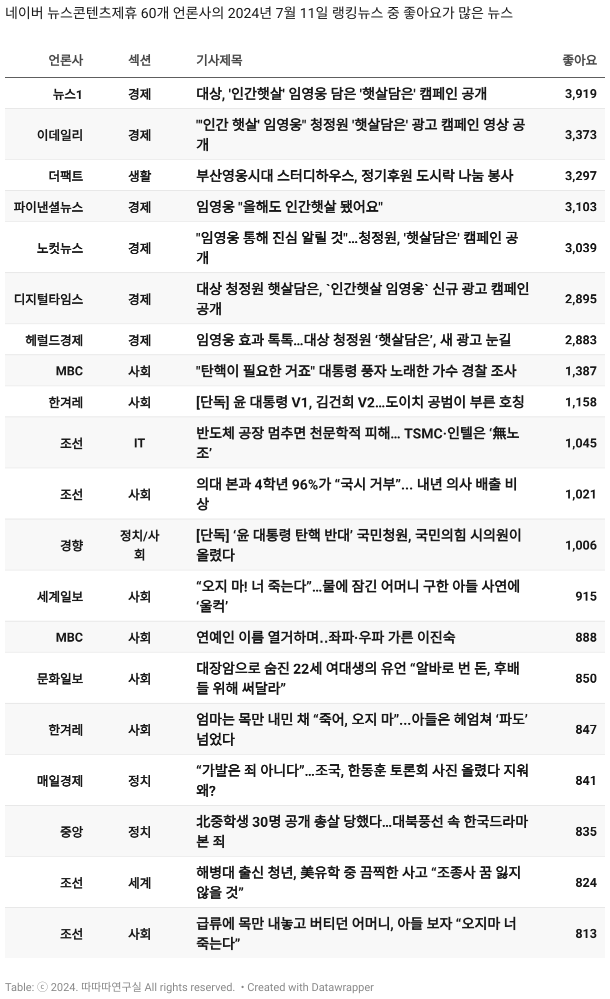 *데이터 수집 기간 : 2024년 6월 10일 *데이터 수집 대상 : 네이버 뉴스콘텐츠제휴 60개 언론사. 종합일간지 10개(경향신문, 국민일보, 동아일보, 문화일보, 서울신문, 세계일보, 조선일보, 중앙일보, 한겨레신문, 한국일보), 방송/통신사 14개(뉴스1, 뉴시스, 연합뉴스, 연합뉴스TV, 채널A, 한국경제TV, JTBC, KBS, MBC, MBN, SBS, SBS BIZ, TV조선, YTN), 경제지 11개(매일경제, 머니투데이, 비즈워치, 서울경제, 아시아경제, 이데일리, 조선비즈, 조세일보, 파이낸셜뉴스, 한국경제(유튜브제외), 헤럴드경제) 인터넷 8개(노컷뉴스, 더팩트, 데일리안, 머니S, 미디어오늘, 아이뉴스24, 오마이뉴스, 프레시안), IT 5개(디지털데일리,디지털타임스, 블로터, 전자신문, 지디넷코리아), 지역 12개(강원도민일보, 강원일보, 경기일보, 국제신문, 대구MBC, 대전일보, 매일신문, 부산일보, 전주MBC, CJB청주방송, JIBS, kbc광주방송)