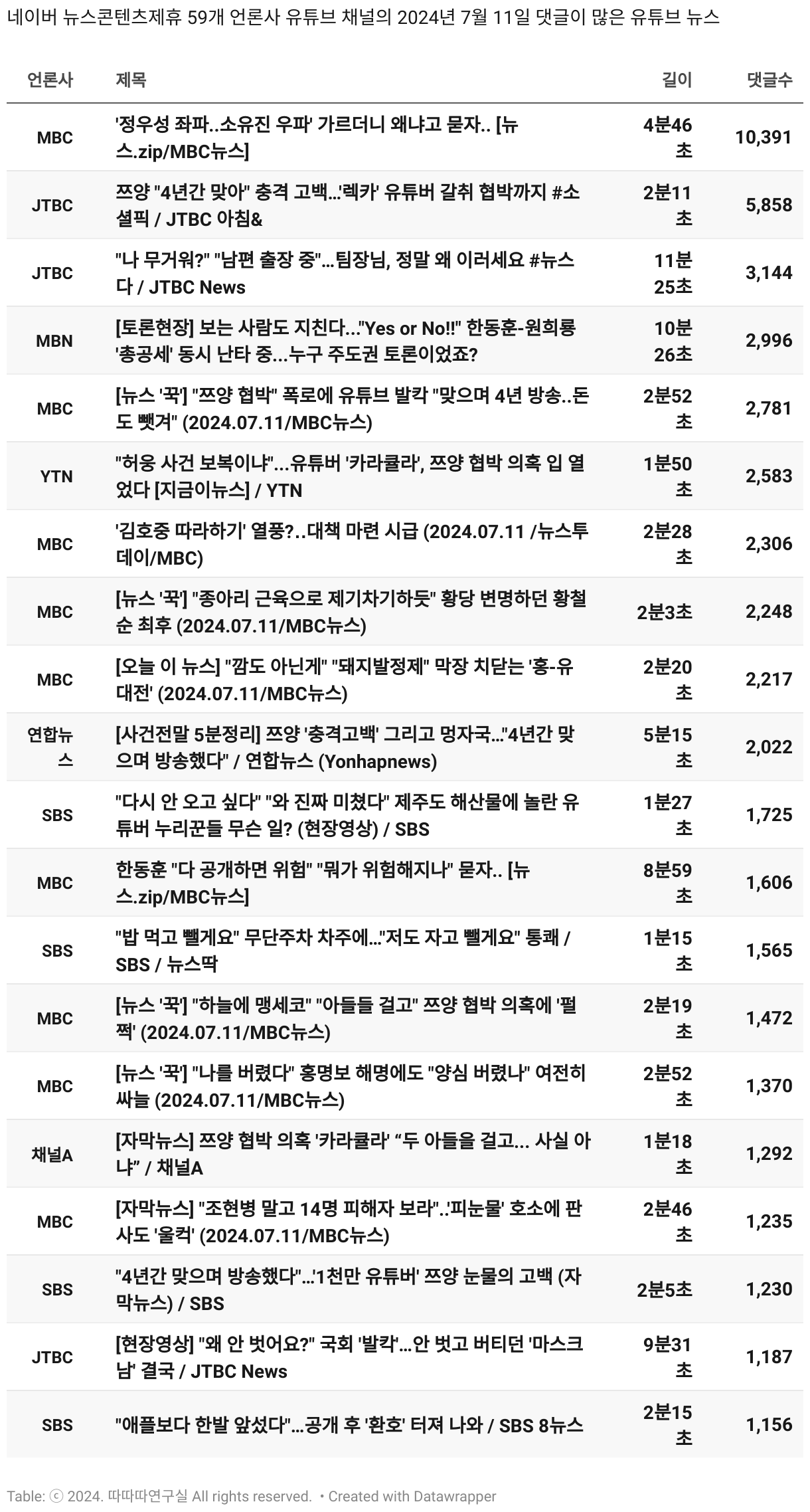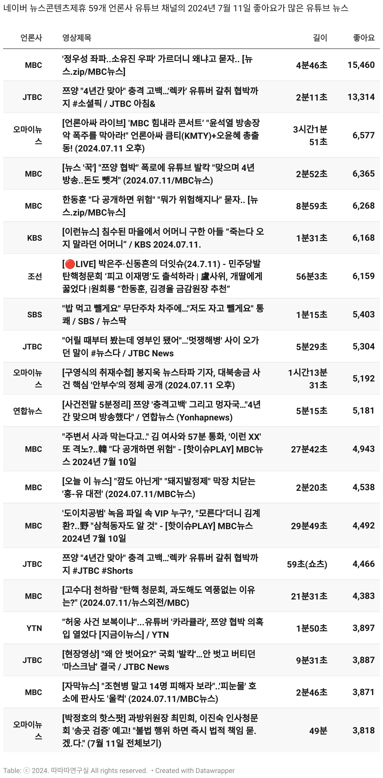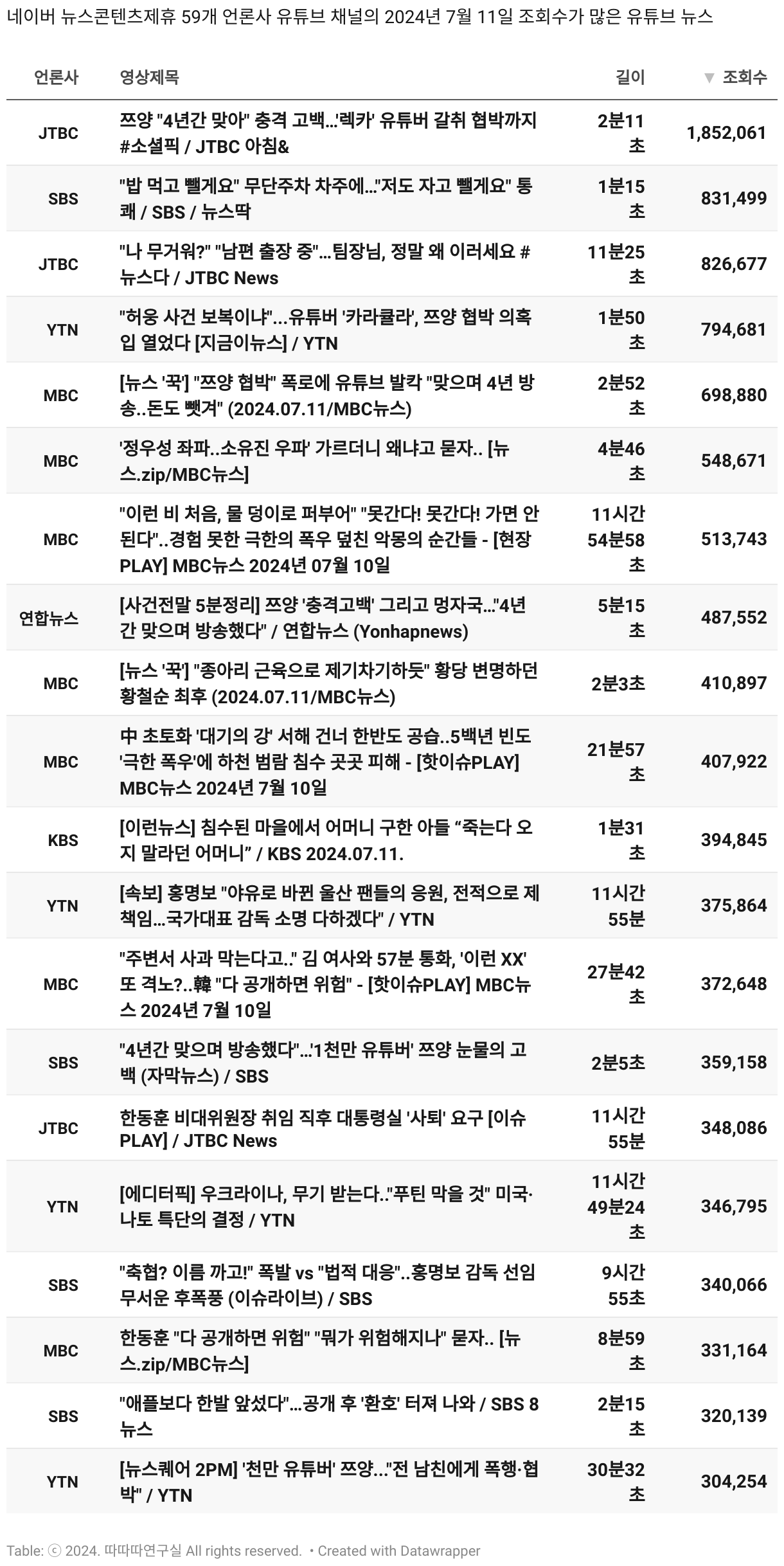 *데이터 수집 기간 : 2024년 6월 10일 *데이터 수집 대상 : 네이버 뉴스콘텐츠제휴 60개 언론사. 종합일간지 10개(경향신문, 국민일보, 동아일보, 문화일보, 서울신문, 세계일보, 조선일보, 중앙일보, 한겨레신문, 한국일보), 방송/통신사 14개(뉴스1, 뉴시스, 연합뉴스, 연합뉴스TV, 채널A, 한국경제TV, JTBC, KBS, MBC, MBN, SBS, SBS BIZ, TV조선, YTN), 경제지 11개(매일경제, 머니투데이, 비즈워치, 서울경제, 아시아경제, 이데일리, 조선비즈, 조세일보, 파이낸셜뉴스, 한국경제(유튜브제외), 헤럴드경제) 인터넷 8개(노컷뉴스, 더팩트, 데일리안, 머니S, 미디어오늘, 아이뉴스24, 오마이뉴스, 프레시안), IT 5개(디지털데일리,디지털타임스, 블로터, 전자신문, 지디넷코리아), 지역 12개(강원도민일보, 강원일보, 경기일보, 국제신문, 대구MBC, 대전일보, 매일신문, 부산일보, 전주MBC, CJB청주방송, JIBS, kbc광주방송)