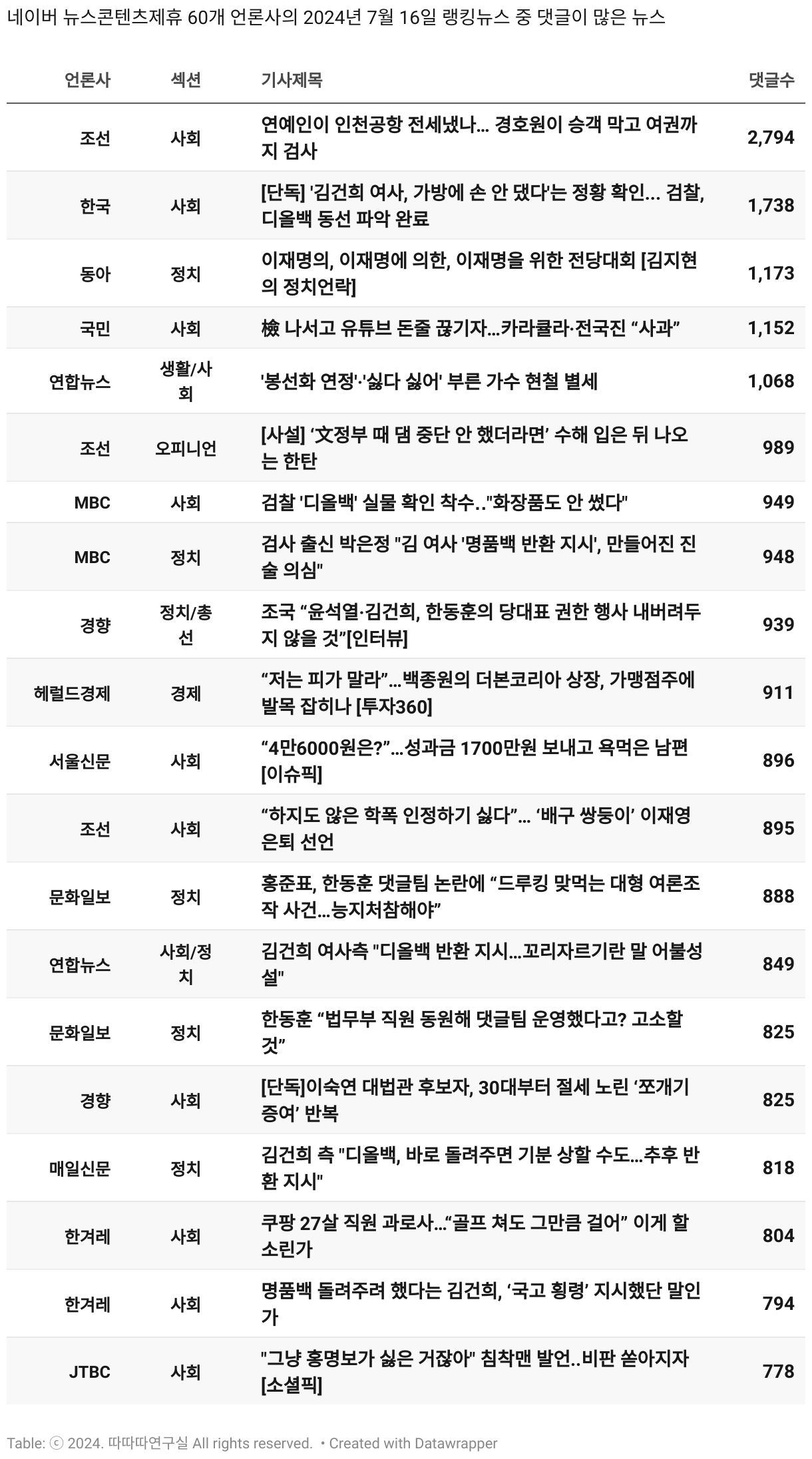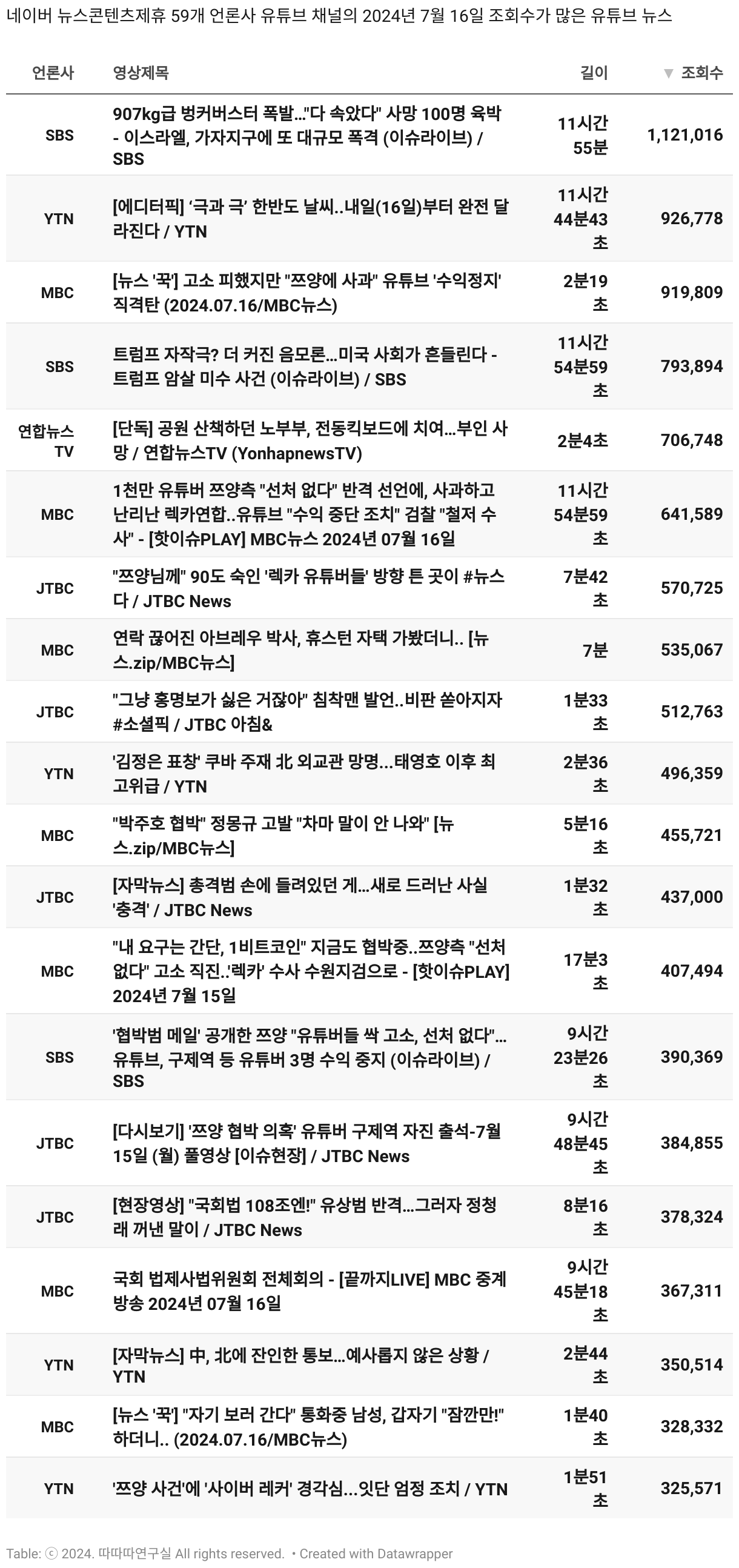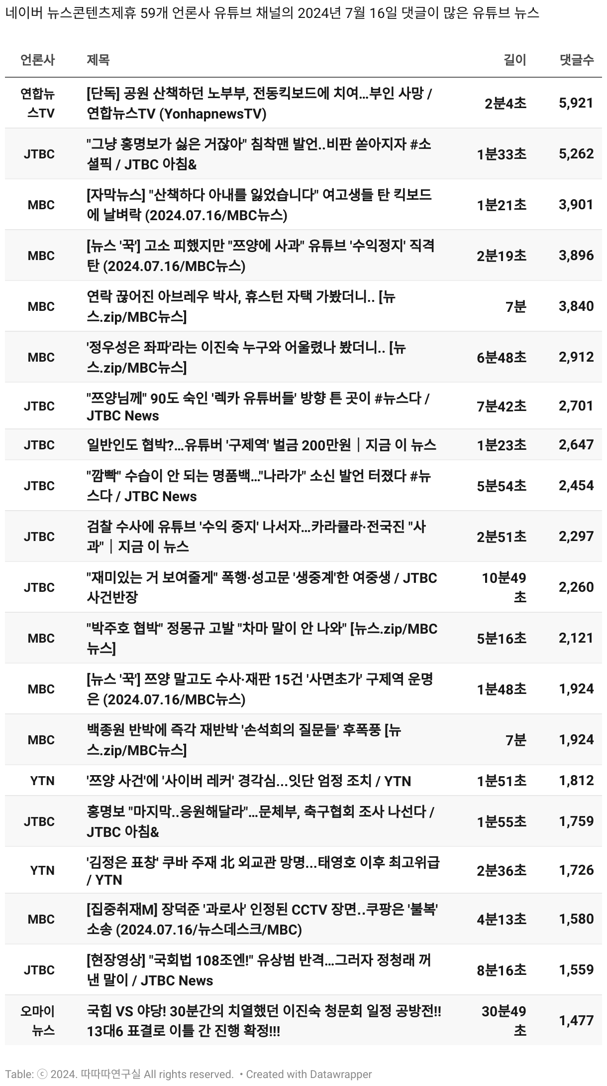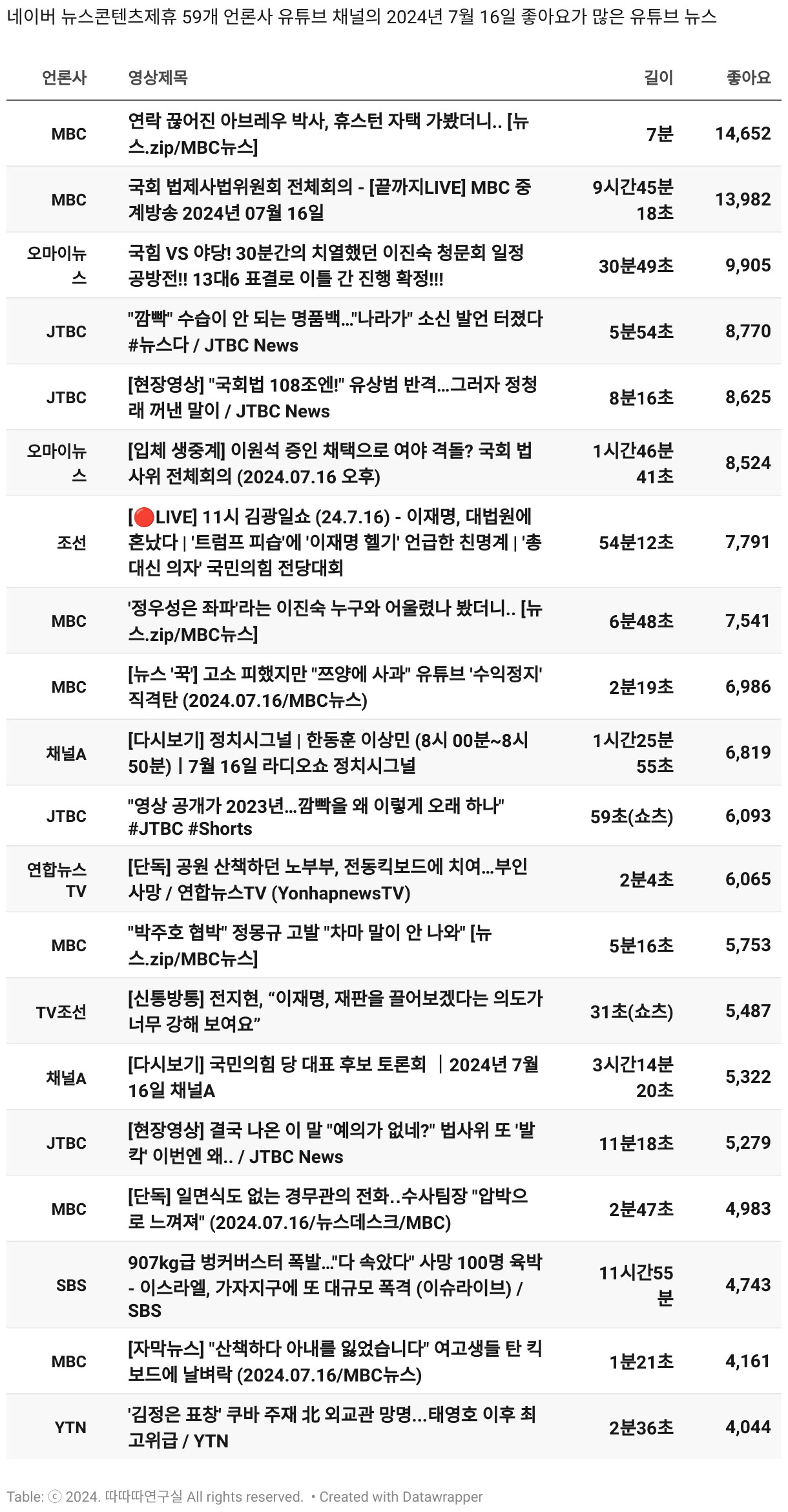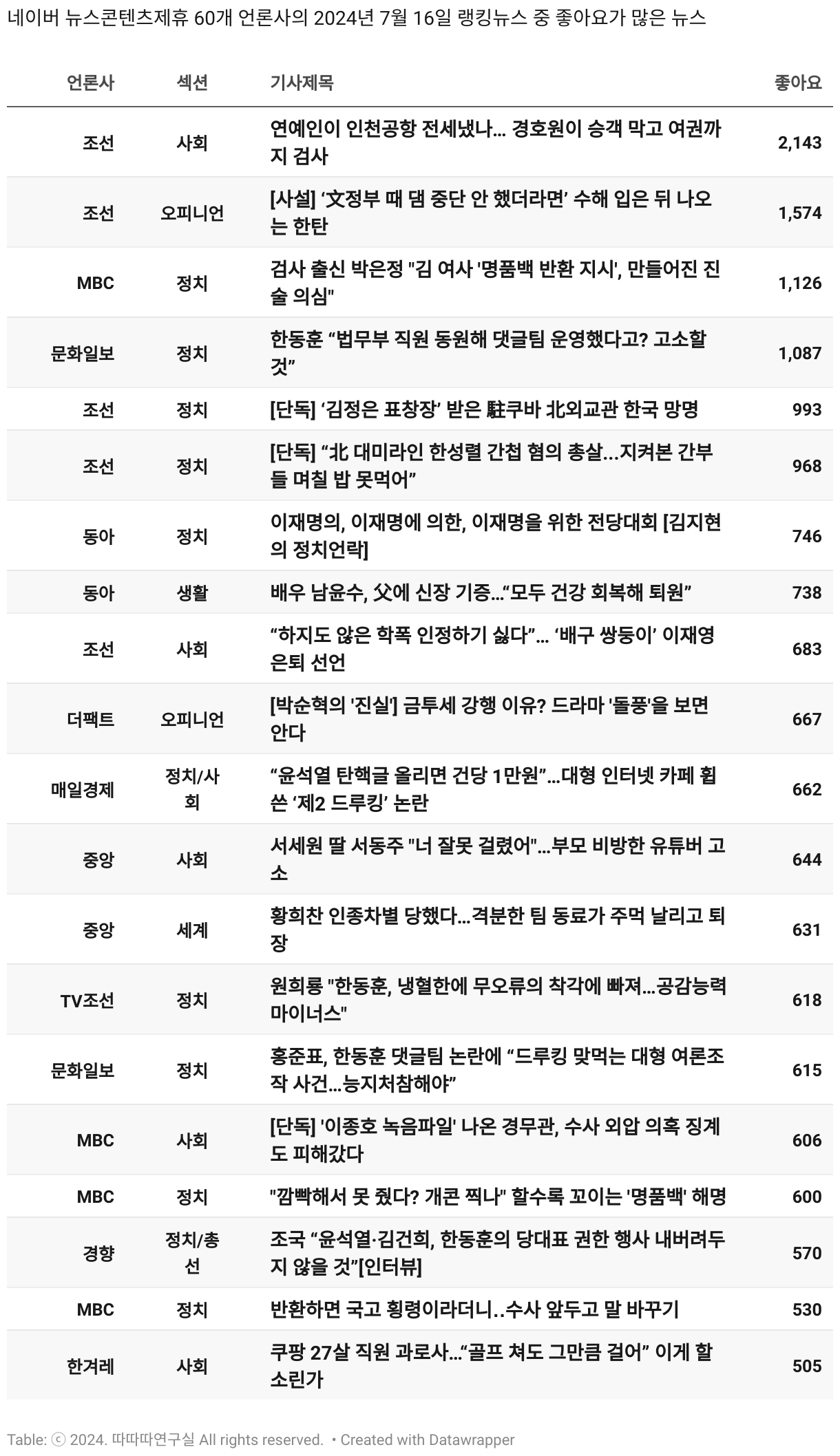 *데이터 수집 기간 : 2024년 6월 10일 *데이터 수집 대상 : 네이버 뉴스콘텐츠제휴 60개 언론사. 종합일간지 10개(경향신문, 국민일보, 동아일보, 문화일보, 서울신문, 세계일보, 조선일보, 중앙일보, 한겨레신문, 한국일보), 방송/통신사 14개(뉴스1, 뉴시스, 연합뉴스, 연합뉴스TV, 채널A, 한국경제TV, JTBC, KBS, MBC, MBN, SBS, SBS BIZ, TV조선, YTN), 경제지 11개(매일경제, 머니투데이, 비즈워치, 서울경제, 아시아경제, 이데일리, 조선비즈, 조세일보, 파이낸셜뉴스, 한국경제(유튜브제외), 헤럴드경제) 인터넷 8개(노컷뉴스, 더팩트, 데일리안, 머니S, 미디어오늘, 아이뉴스24, 오마이뉴스, 프레시안), IT 5개(디지털데일리,디지털타임스, 블로터, 전자신문, 지디넷코리아), 지역 12개(강원도민일보, 강원일보, 경기일보, 국제신문, 대구MBC, 대전일보, 매일신문, 부산일보, 전주MBC, CJB청주방송, JIBS, kbc광주방송)