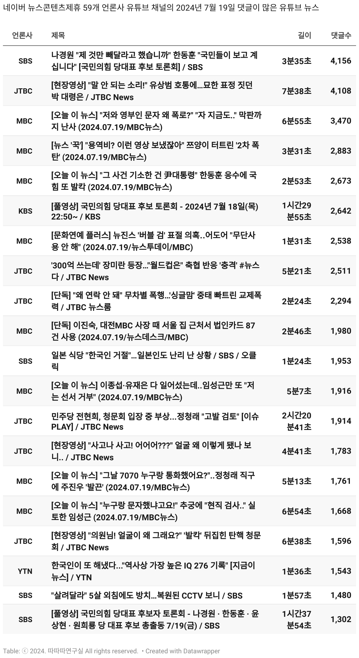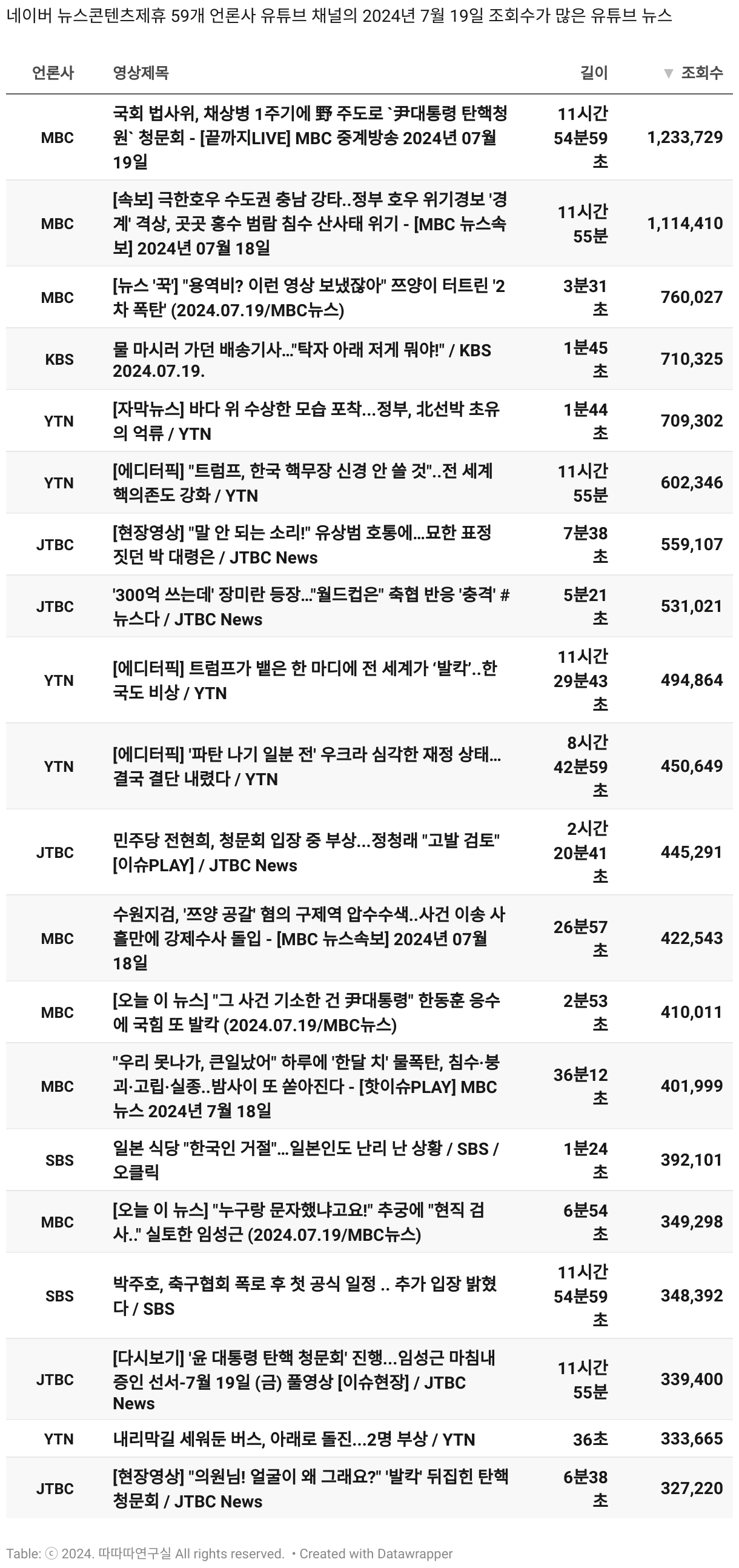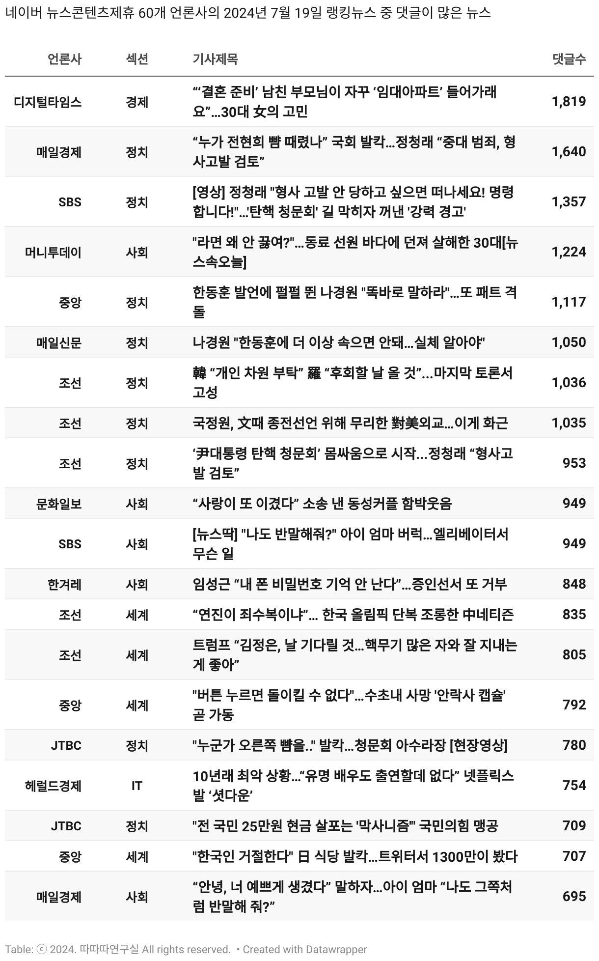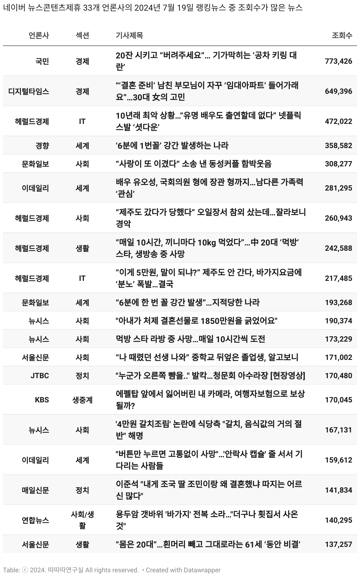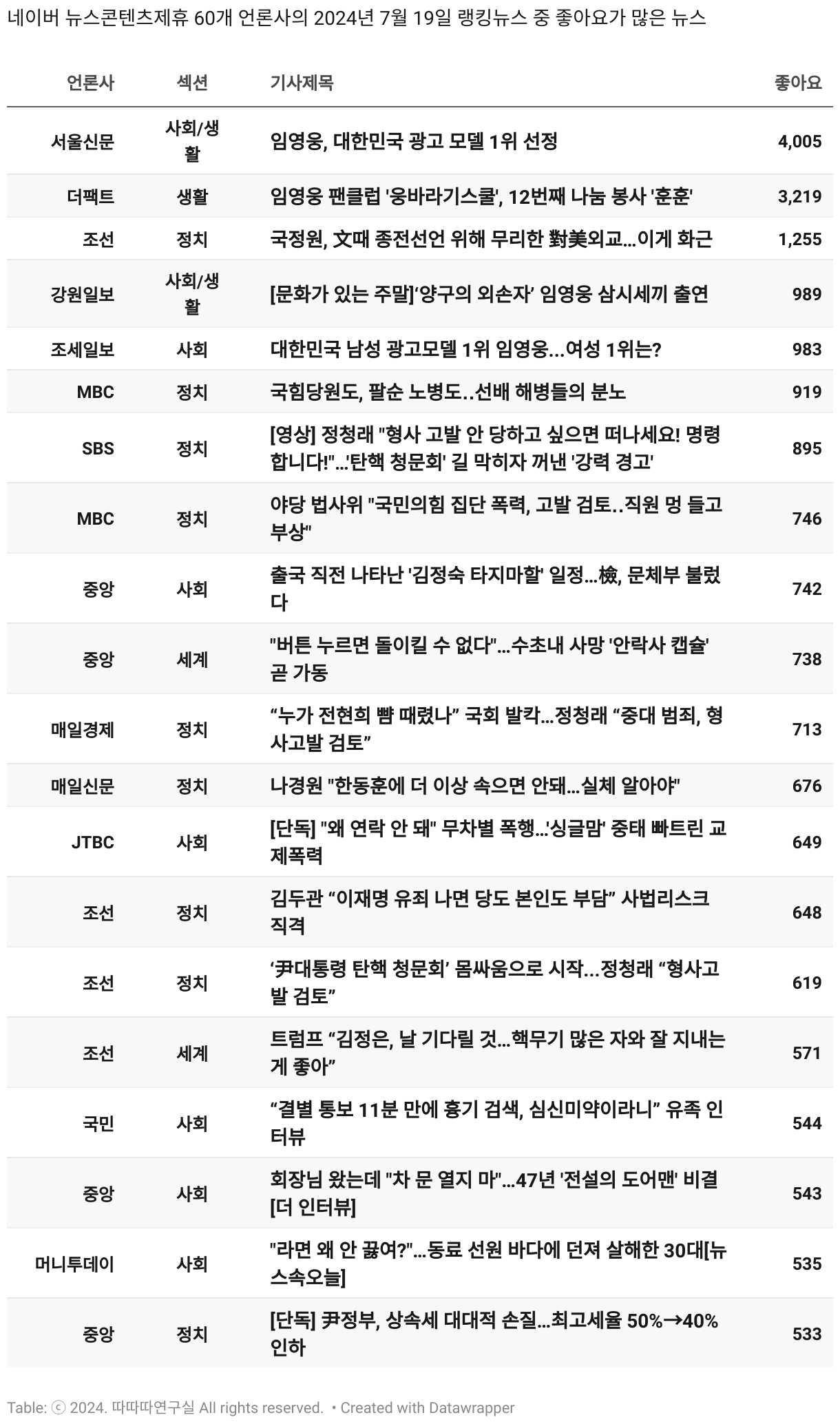 *데이터 수집 기간 : 2024년 6월 10일 *데이터 수집 대상 : 네이버 뉴스콘텐츠제휴 60개 언론사. 종합일간지 10개(경향신문, 국민일보, 동아일보, 문화일보, 서울신문, 세계일보, 조선일보, 중앙일보, 한겨레신문, 한국일보), 방송/통신사 14개(뉴스1, 뉴시스, 연합뉴스, 연합뉴스TV, 채널A, 한국경제TV, JTBC, KBS, MBC, MBN, SBS, SBS BIZ, TV조선, YTN), 경제지 11개(매일경제, 머니투데이, 비즈워치, 서울경제, 아시아경제, 이데일리, 조선비즈, 조세일보, 파이낸셜뉴스, 한국경제(유튜브제외), 헤럴드경제) 인터넷 8개(노컷뉴스, 더팩트, 데일리안, 머니S, 미디어오늘, 아이뉴스24, 오마이뉴스, 프레시안), IT 5개(디지털데일리,디지털타임스, 블로터, 전자신문, 지디넷코리아), 지역 12개(강원도민일보, 강원일보, 경기일보, 국제신문, 대구MBC, 대전일보, 매일신문, 부산일보, 전주MBC, CJB청주방송, JIBS, kbc광주방송)