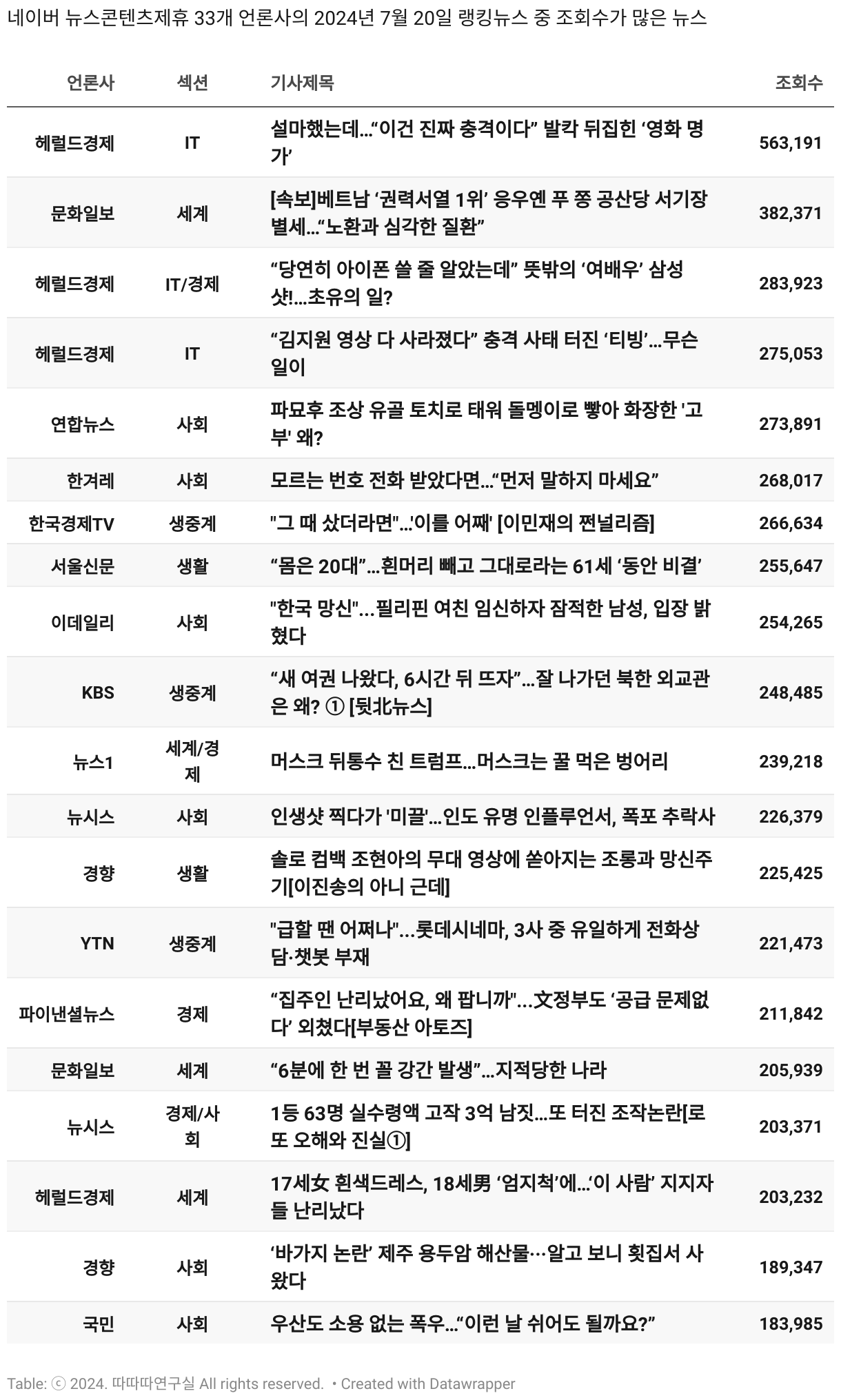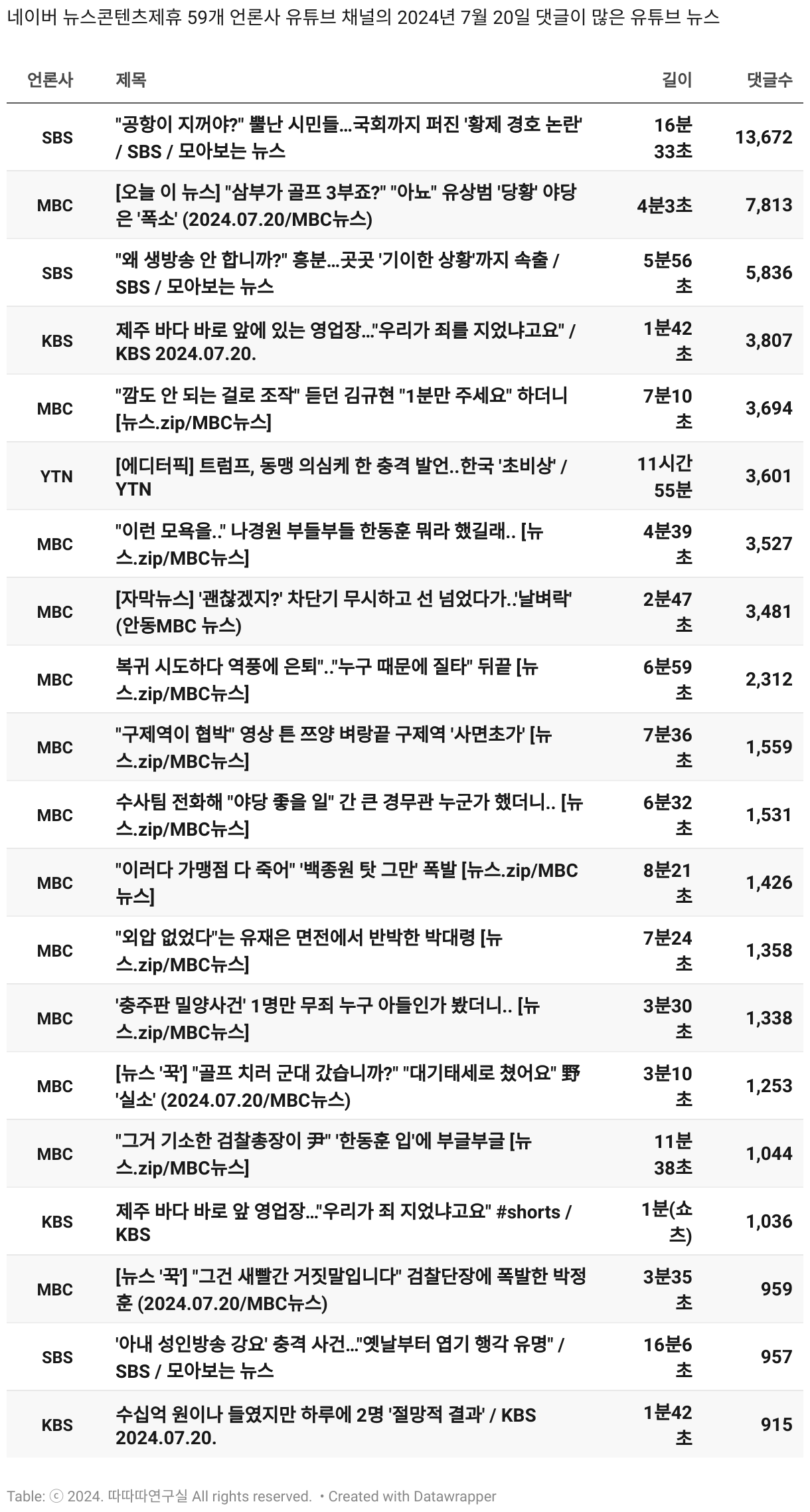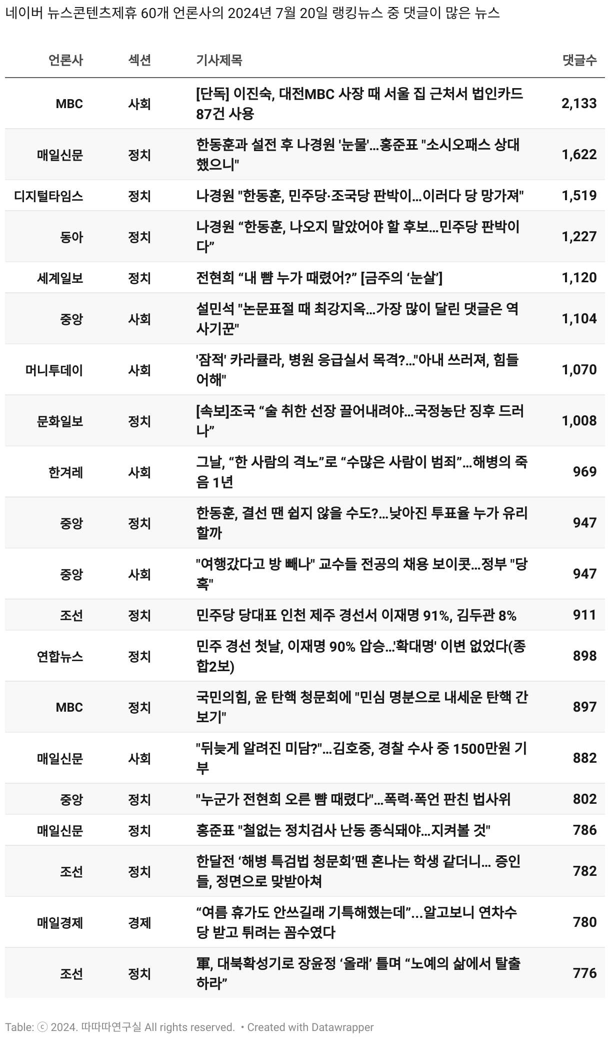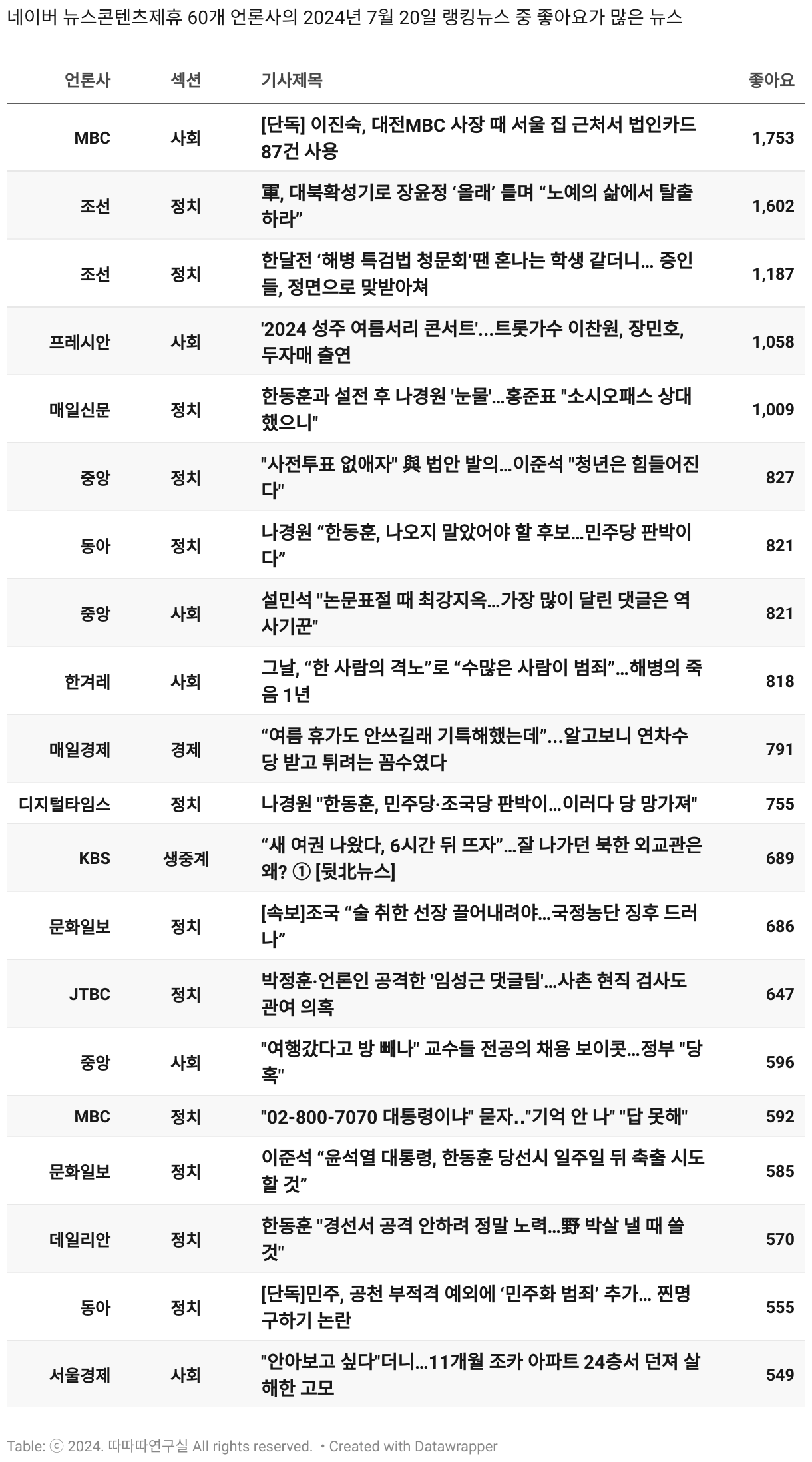 *데이터 수집 기간 : 2024년 6월 10일 *데이터 수집 대상 : 네이버 뉴스콘텐츠제휴 60개 언론사. 종합일간지 10개(경향신문, 국민일보, 동아일보, 문화일보, 서울신문, 세계일보, 조선일보, 중앙일보, 한겨레신문, 한국일보), 방송/통신사 14개(뉴스1, 뉴시스, 연합뉴스, 연합뉴스TV, 채널A, 한국경제TV, JTBC, KBS, MBC, MBN, SBS, SBS BIZ, TV조선, YTN), 경제지 11개(매일경제, 머니투데이, 비즈워치, 서울경제, 아시아경제, 이데일리, 조선비즈, 조세일보, 파이낸셜뉴스, 한국경제(유튜브제외), 헤럴드경제) 인터넷 8개(노컷뉴스, 더팩트, 데일리안, 머니S, 미디어오늘, 아이뉴스24, 오마이뉴스, 프레시안), IT 5개(디지털데일리,디지털타임스, 블로터, 전자신문, 지디넷코리아), 지역 12개(강원도민일보, 강원일보, 경기일보, 국제신문, 대구MBC, 대전일보, 매일신문, 부산일보, 전주MBC, CJB청주방송, JIBS, kbc광주방송)