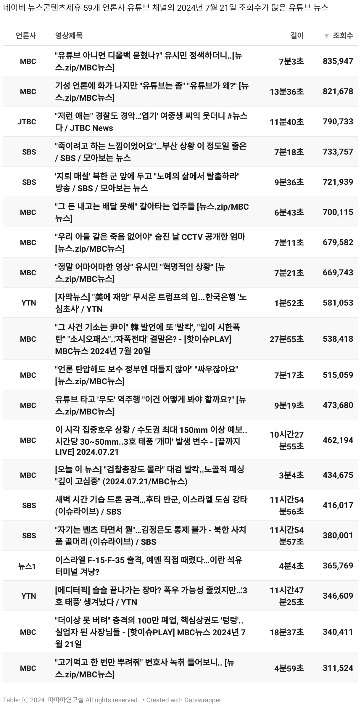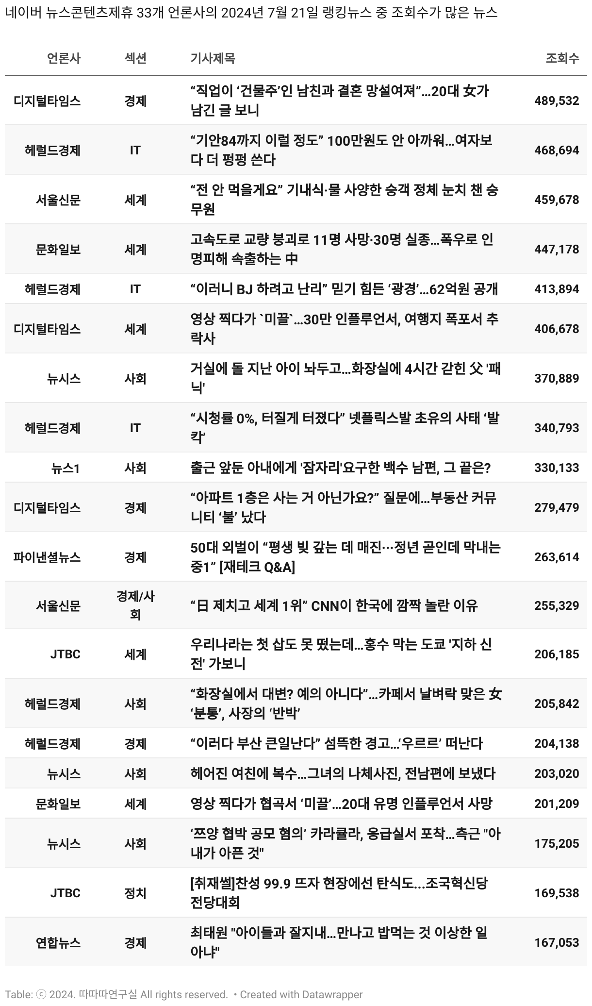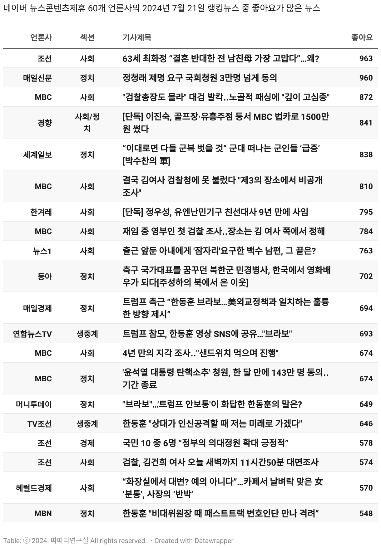 *데이터 수집 기간 : 2024년 6월 10일 *데이터 수집 대상 : 네이버 뉴스콘텐츠제휴 60개 언론사. 종합일간지 10개(경향신문, 국민일보, 동아일보, 문화일보, 서울신문, 세계일보, 조선일보, 중앙일보, 한겨레신문, 한국일보), 방송/통신사 14개(뉴스1, 뉴시스, 연합뉴스, 연합뉴스TV, 채널A, 한국경제TV, JTBC, KBS, MBC, MBN, SBS, SBS BIZ, TV조선, YTN), 경제지 11개(매일경제, 머니투데이, 비즈워치, 서울경제, 아시아경제, 이데일리, 조선비즈, 조세일보, 파이낸셜뉴스, 한국경제(유튜브제외), 헤럴드경제) 인터넷 8개(노컷뉴스, 더팩트, 데일리안, 머니S, 미디어오늘, 아이뉴스24, 오마이뉴스, 프레시안), IT 5개(디지털데일리,디지털타임스, 블로터, 전자신문, 지디넷코리아), 지역 12개(강원도민일보, 강원일보, 경기일보, 국제신문, 대구MBC, 대전일보, 매일신문, 부산일보, 전주MBC, CJB청주방송, JIBS, kbc광주방송)