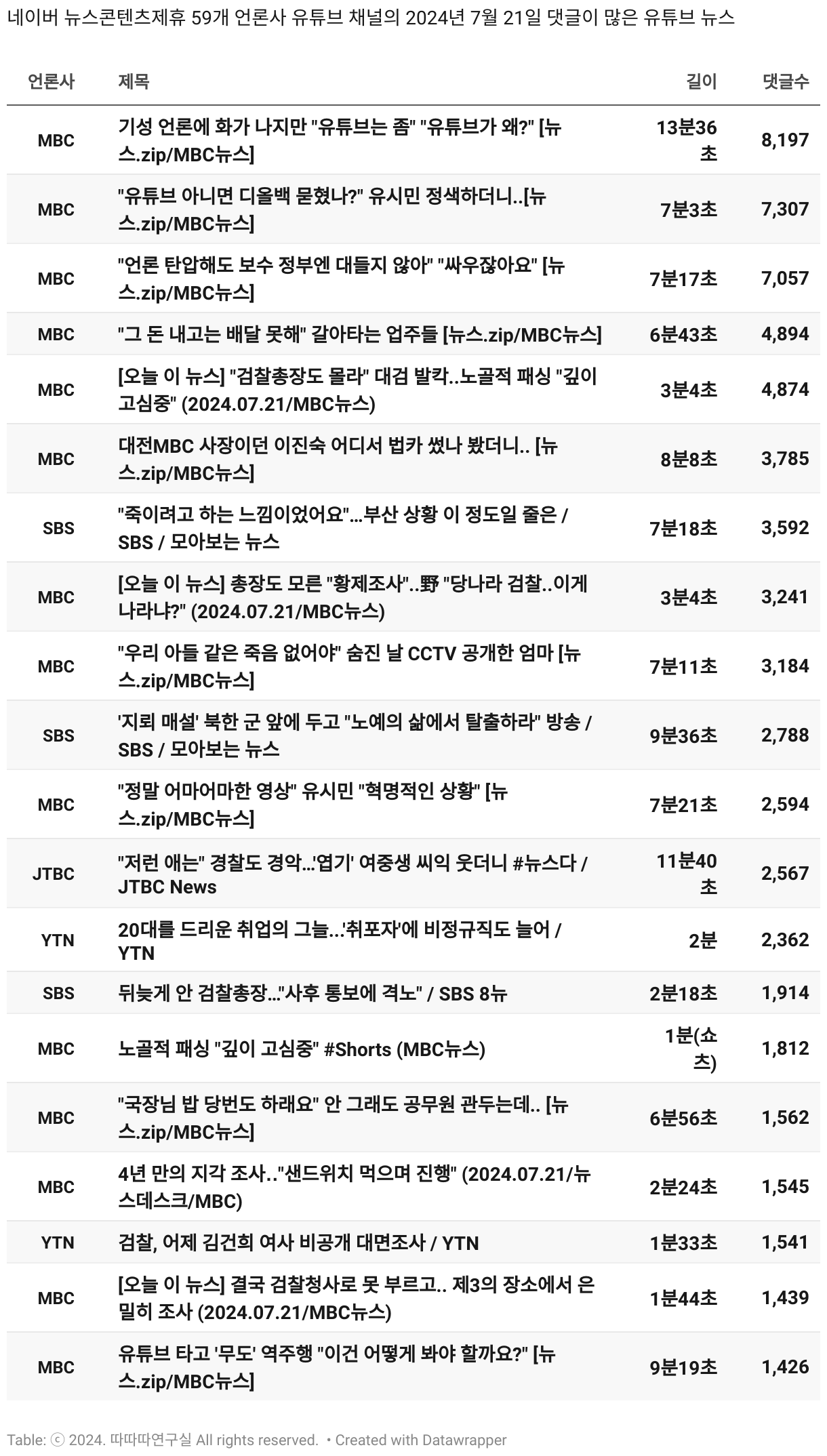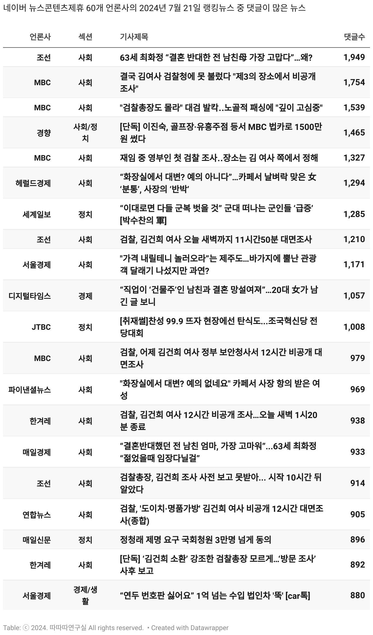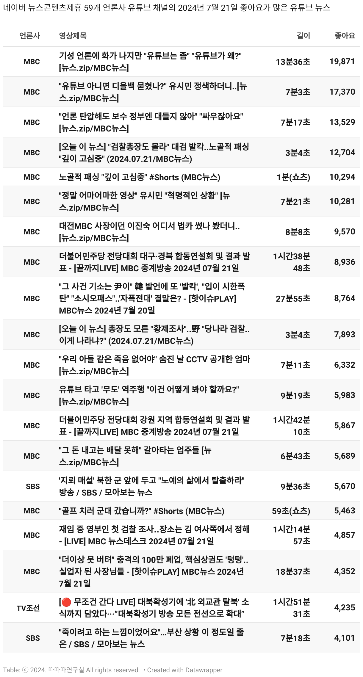 *데이터 수집 기간 : 2024년 6월 10일 *데이터 수집 대상 : 네이버 뉴스콘텐츠제휴 60개 언론사. 종합일간지 10개(경향신문, 국민일보, 동아일보, 문화일보, 서울신문, 세계일보, 조선일보, 중앙일보, 한겨레신문, 한국일보), 방송/통신사 14개(뉴스1, 뉴시스, 연합뉴스, 연합뉴스TV, 채널A, 한국경제TV, JTBC, KBS, MBC, MBN, SBS, SBS BIZ, TV조선, YTN), 경제지 11개(매일경제, 머니투데이, 비즈워치, 서울경제, 아시아경제, 이데일리, 조선비즈, 조세일보, 파이낸셜뉴스, 한국경제(유튜브제외), 헤럴드경제) 인터넷 8개(노컷뉴스, 더팩트, 데일리안, 머니S, 미디어오늘, 아이뉴스24, 오마이뉴스, 프레시안), IT 5개(디지털데일리,디지털타임스, 블로터, 전자신문, 지디넷코리아), 지역 12개(강원도민일보, 강원일보, 경기일보, 국제신문, 대구MBC, 대전일보, 매일신문, 부산일보, 전주MBC, CJB청주방송, JIBS, kbc광주방송)