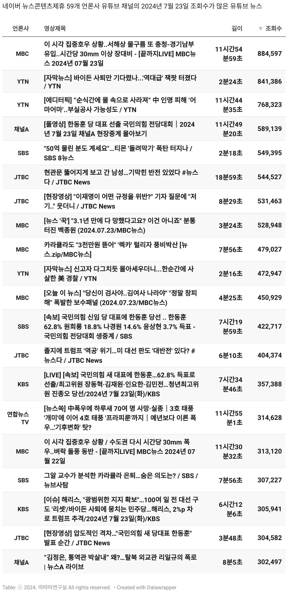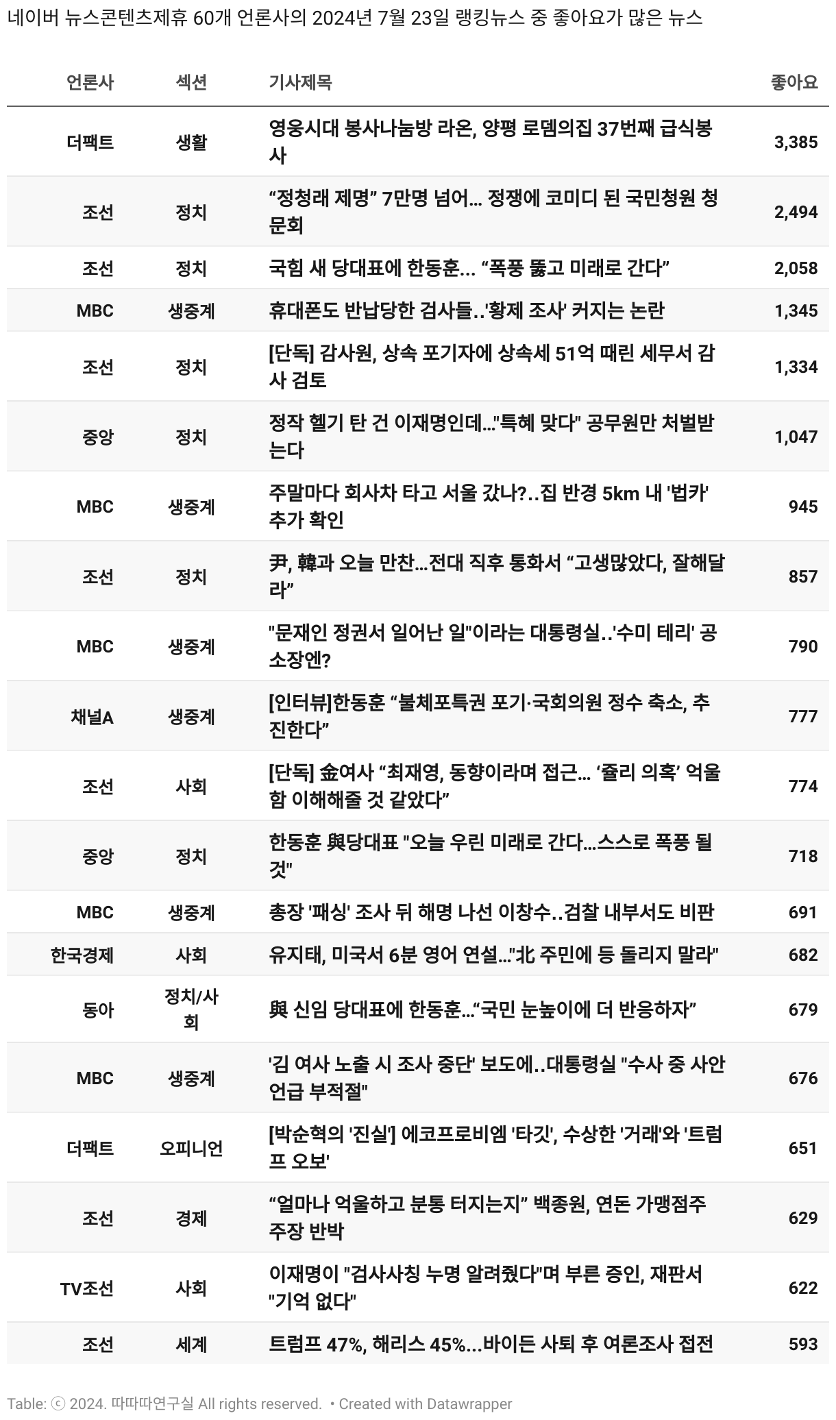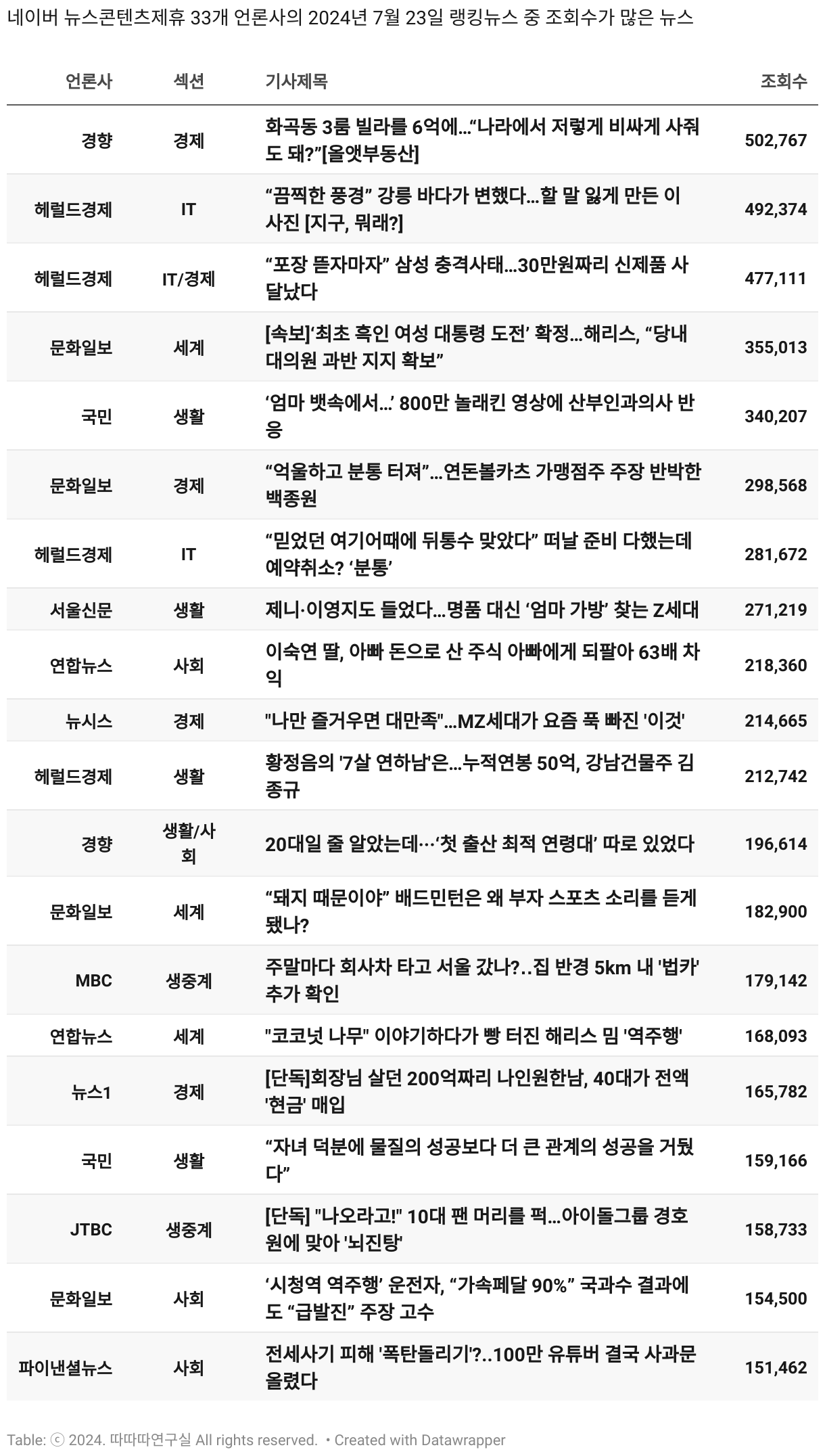 *데이터 수집 기간 : 2024년 6월 10일 *데이터 수집 대상 : 네이버 뉴스콘텐츠제휴 60개 언론사. 종합일간지 10개(경향신문, 국민일보, 동아일보, 문화일보, 서울신문, 세계일보, 조선일보, 중앙일보, 한겨레신문, 한국일보), 방송/통신사 14개(뉴스1, 뉴시스, 연합뉴스, 연합뉴스TV, 채널A, 한국경제TV, JTBC, KBS, MBC, MBN, SBS, SBS BIZ, TV조선, YTN), 경제지 11개(매일경제, 머니투데이, 비즈워치, 서울경제, 아시아경제, 이데일리, 조선비즈, 조세일보, 파이낸셜뉴스, 한국경제(유튜브제외), 헤럴드경제) 인터넷 8개(노컷뉴스, 더팩트, 데일리안, 머니S, 미디어오늘, 아이뉴스24, 오마이뉴스, 프레시안), IT 5개(디지털데일리,디지털타임스, 블로터, 전자신문, 지디넷코리아), 지역 12개(강원도민일보, 강원일보, 경기일보, 국제신문, 대구MBC, 대전일보, 매일신문, 부산일보, 전주MBC, CJB청주방송, JIBS, kbc광주방송)