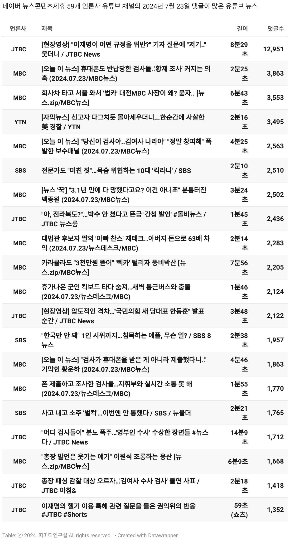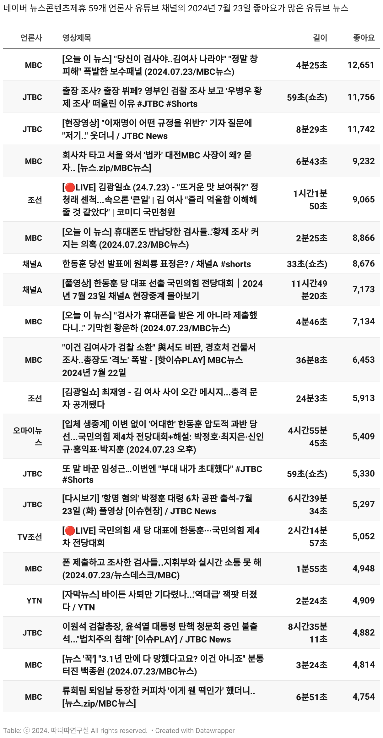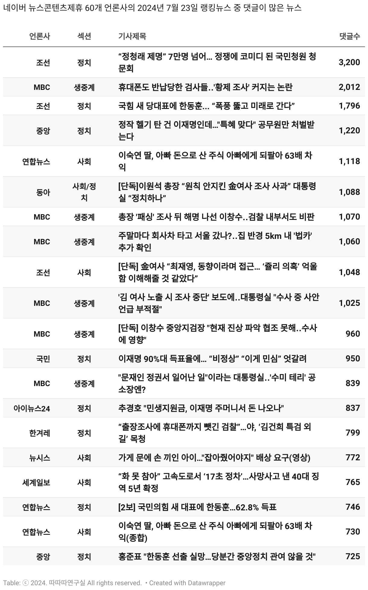 *데이터 수집 기간 : 2024년 6월 10일 *데이터 수집 대상 : 네이버 뉴스콘텐츠제휴 60개 언론사. 종합일간지 10개(경향신문, 국민일보, 동아일보, 문화일보, 서울신문, 세계일보, 조선일보, 중앙일보, 한겨레신문, 한국일보), 방송/통신사 14개(뉴스1, 뉴시스, 연합뉴스, 연합뉴스TV, 채널A, 한국경제TV, JTBC, KBS, MBC, MBN, SBS, SBS BIZ, TV조선, YTN), 경제지 11개(매일경제, 머니투데이, 비즈워치, 서울경제, 아시아경제, 이데일리, 조선비즈, 조세일보, 파이낸셜뉴스, 한국경제(유튜브제외), 헤럴드경제) 인터넷 8개(노컷뉴스, 더팩트, 데일리안, 머니S, 미디어오늘, 아이뉴스24, 오마이뉴스, 프레시안), IT 5개(디지털데일리,디지털타임스, 블로터, 전자신문, 지디넷코리아), 지역 12개(강원도민일보, 강원일보, 경기일보, 국제신문, 대구MBC, 대전일보, 매일신문, 부산일보, 전주MBC, CJB청주방송, JIBS, kbc광주방송)