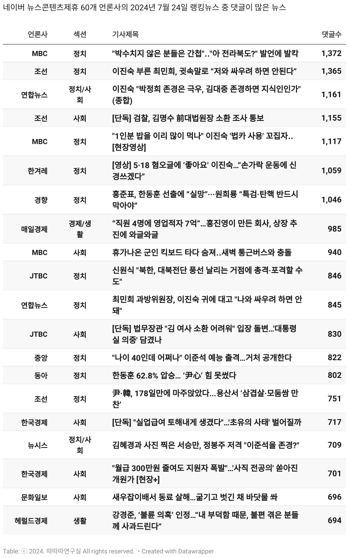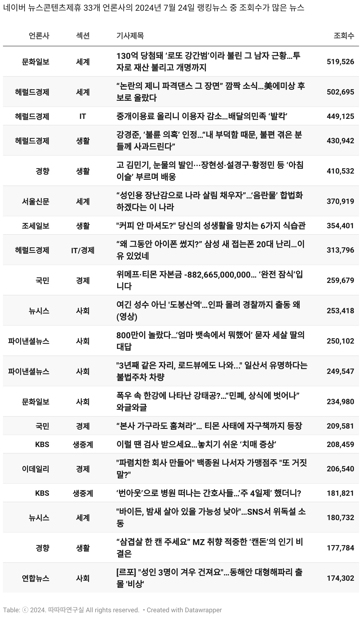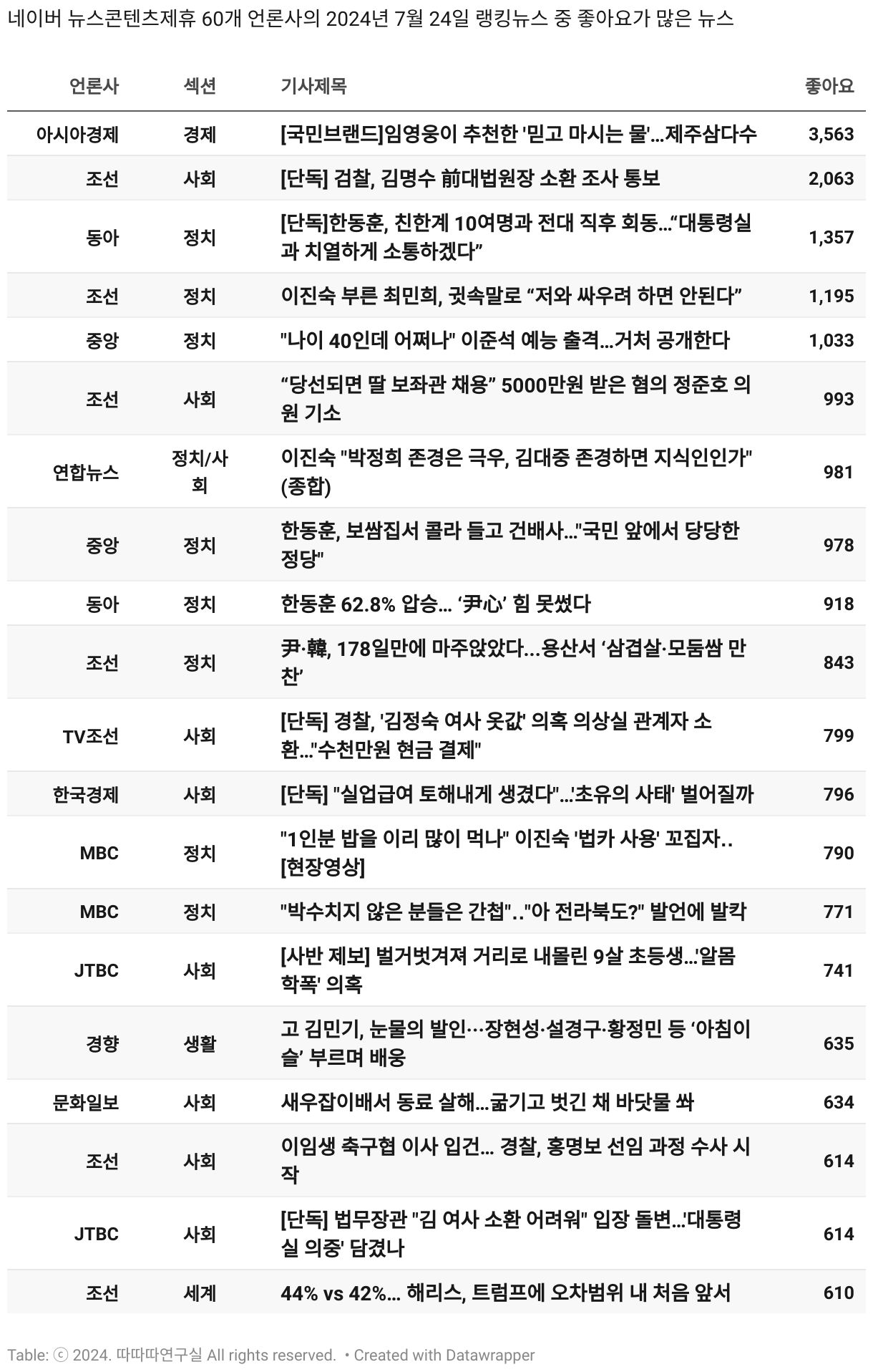 *데이터 수집 기간 : 2024년 6월 10일 *데이터 수집 대상 : 네이버 뉴스콘텐츠제휴 60개 언론사. 종합일간지 10개(경향신문, 국민일보, 동아일보, 문화일보, 서울신문, 세계일보, 조선일보, 중앙일보, 한겨레신문, 한국일보), 방송/통신사 14개(뉴스1, 뉴시스, 연합뉴스, 연합뉴스TV, 채널A, 한국경제TV, JTBC, KBS, MBC, MBN, SBS, SBS BIZ, TV조선, YTN), 경제지 11개(매일경제, 머니투데이, 비즈워치, 서울경제, 아시아경제, 이데일리, 조선비즈, 조세일보, 파이낸셜뉴스, 한국경제(유튜브제외), 헤럴드경제) 인터넷 8개(노컷뉴스, 더팩트, 데일리안, 머니S, 미디어오늘, 아이뉴스24, 오마이뉴스, 프레시안), IT 5개(디지털데일리,디지털타임스, 블로터, 전자신문, 지디넷코리아), 지역 12개(강원도민일보, 강원일보, 경기일보, 국제신문, 대구MBC, 대전일보, 매일신문, 부산일보, 전주MBC, CJB청주방송, JIBS, kbc광주방송)