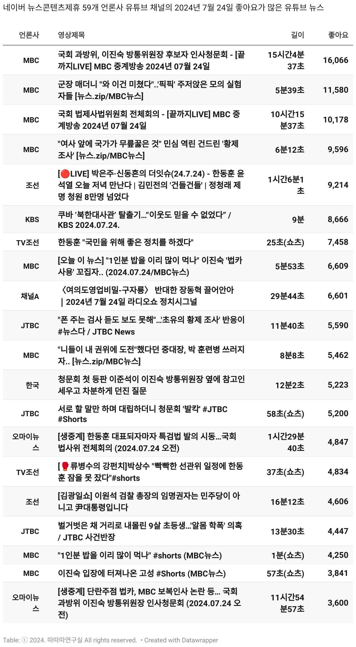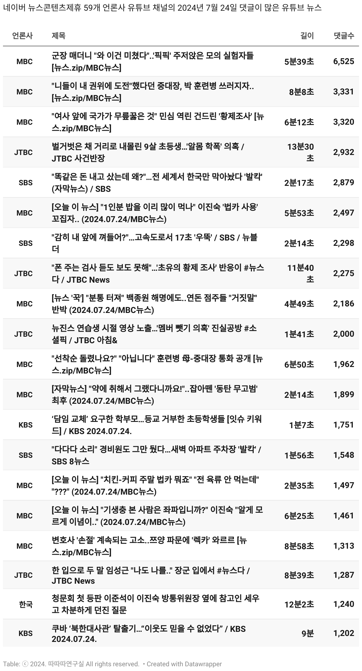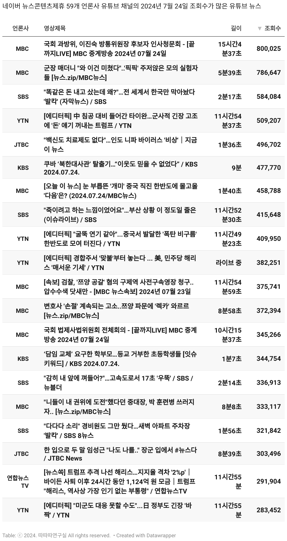 *데이터 수집 기간 : 2024년 6월 10일 *데이터 수집 대상 : 네이버 뉴스콘텐츠제휴 60개 언론사. 종합일간지 10개(경향신문, 국민일보, 동아일보, 문화일보, 서울신문, 세계일보, 조선일보, 중앙일보, 한겨레신문, 한국일보), 방송/통신사 14개(뉴스1, 뉴시스, 연합뉴스, 연합뉴스TV, 채널A, 한국경제TV, JTBC, KBS, MBC, MBN, SBS, SBS BIZ, TV조선, YTN), 경제지 11개(매일경제, 머니투데이, 비즈워치, 서울경제, 아시아경제, 이데일리, 조선비즈, 조세일보, 파이낸셜뉴스, 한국경제(유튜브제외), 헤럴드경제) 인터넷 8개(노컷뉴스, 더팩트, 데일리안, 머니S, 미디어오늘, 아이뉴스24, 오마이뉴스, 프레시안), IT 5개(디지털데일리,디지털타임스, 블로터, 전자신문, 지디넷코리아), 지역 12개(강원도민일보, 강원일보, 경기일보, 국제신문, 대구MBC, 대전일보, 매일신문, 부산일보, 전주MBC, CJB청주방송, JIBS, kbc광주방송)