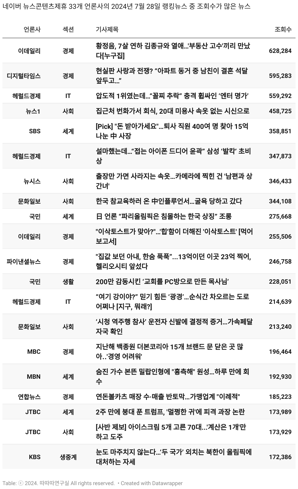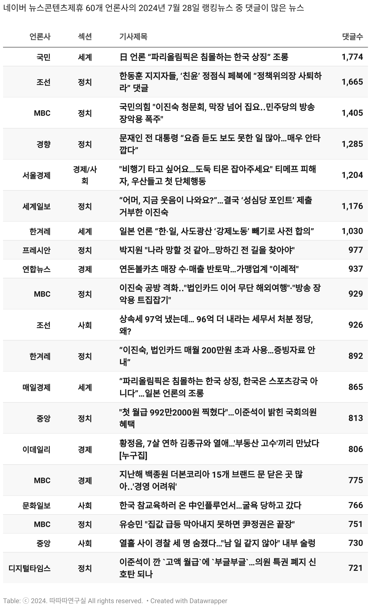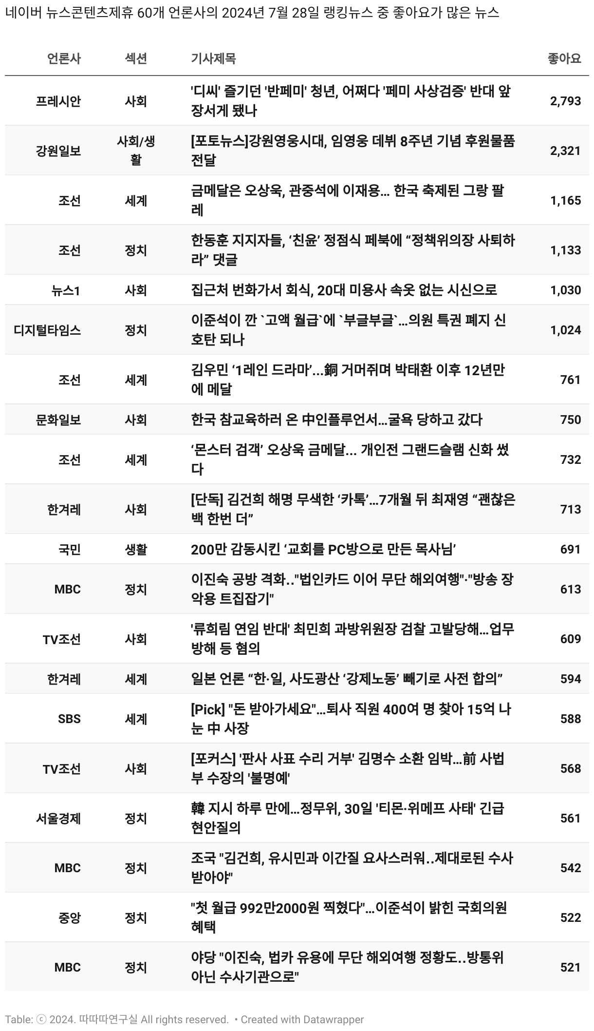 *데이터 수집 기간 : 2024년 6월 10일 *데이터 수집 대상 : 네이버 뉴스콘텐츠제휴 60개 언론사. 종합일간지 10개(경향신문, 국민일보, 동아일보, 문화일보, 서울신문, 세계일보, 조선일보, 중앙일보, 한겨레신문, 한국일보), 방송/통신사 14개(뉴스1, 뉴시스, 연합뉴스, 연합뉴스TV, 채널A, 한국경제TV, JTBC, KBS, MBC, MBN, SBS, SBS BIZ, TV조선, YTN), 경제지 11개(매일경제, 머니투데이, 비즈워치, 서울경제, 아시아경제, 이데일리, 조선비즈, 조세일보, 파이낸셜뉴스, 한국경제(유튜브제외), 헤럴드경제) 인터넷 8개(노컷뉴스, 더팩트, 데일리안, 머니S, 미디어오늘, 아이뉴스24, 오마이뉴스, 프레시안), IT 5개(디지털데일리,디지털타임스, 블로터, 전자신문, 지디넷코리아), 지역 12개(강원도민일보, 강원일보, 경기일보, 국제신문, 대구MBC, 대전일보, 매일신문, 부산일보, 전주MBC, CJB청주방송, JIBS, kbc광주방송)