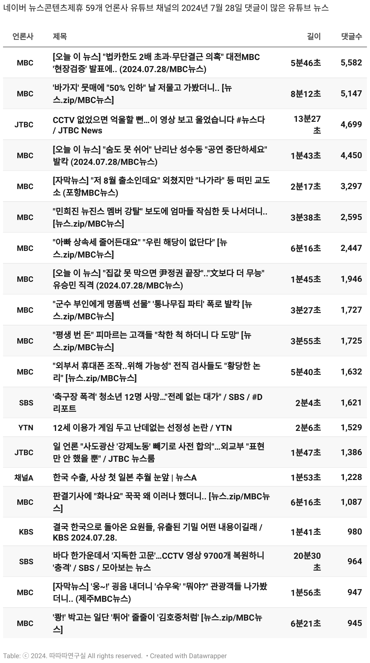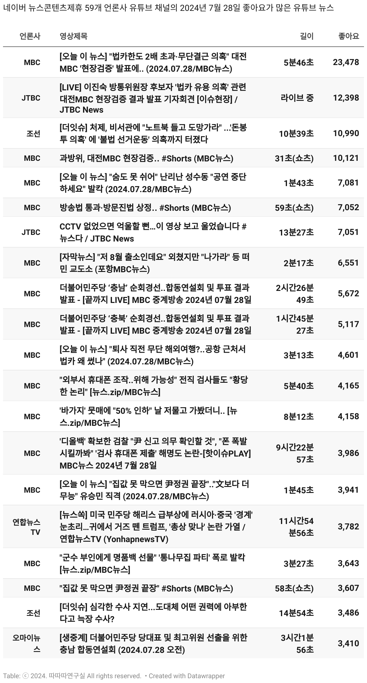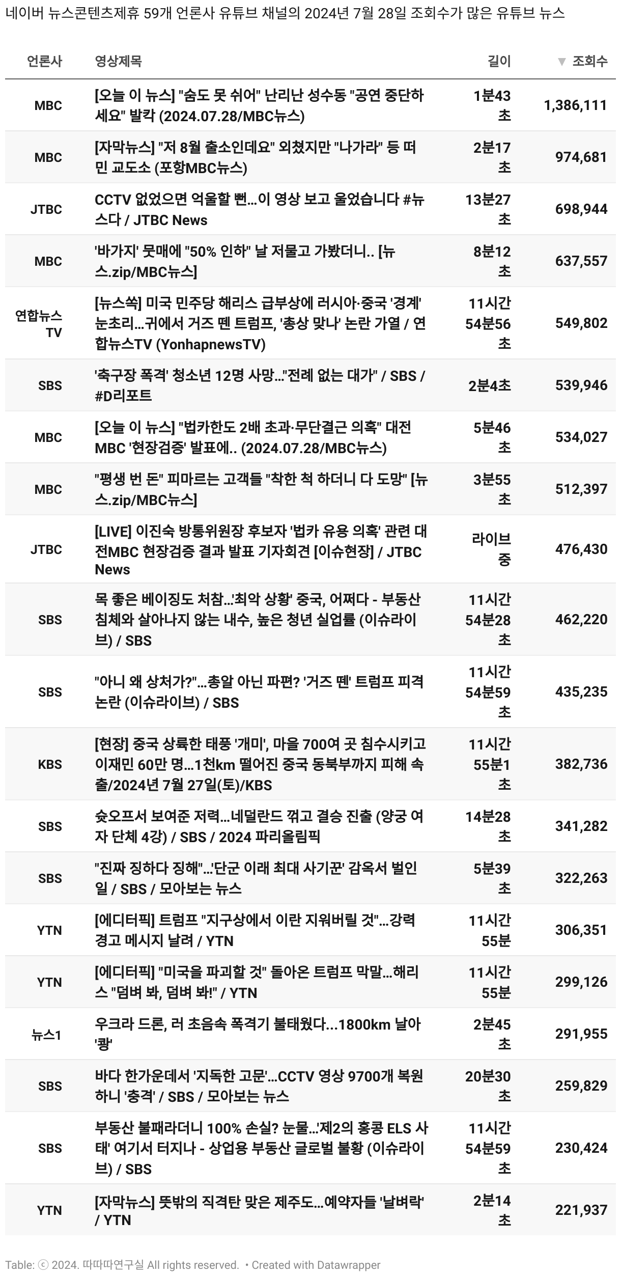 *데이터 수집 기간 : 2024년 6월 10일 *데이터 수집 대상 : 네이버 뉴스콘텐츠제휴 60개 언론사. 종합일간지 10개(경향신문, 국민일보, 동아일보, 문화일보, 서울신문, 세계일보, 조선일보, 중앙일보, 한겨레신문, 한국일보), 방송/통신사 14개(뉴스1, 뉴시스, 연합뉴스, 연합뉴스TV, 채널A, 한국경제TV, JTBC, KBS, MBC, MBN, SBS, SBS BIZ, TV조선, YTN), 경제지 11개(매일경제, 머니투데이, 비즈워치, 서울경제, 아시아경제, 이데일리, 조선비즈, 조세일보, 파이낸셜뉴스, 한국경제(유튜브제외), 헤럴드경제) 인터넷 8개(노컷뉴스, 더팩트, 데일리안, 머니S, 미디어오늘, 아이뉴스24, 오마이뉴스, 프레시안), IT 5개(디지털데일리,디지털타임스, 블로터, 전자신문, 지디넷코리아), 지역 12개(강원도민일보, 강원일보, 경기일보, 국제신문, 대구MBC, 대전일보, 매일신문, 부산일보, 전주MBC, CJB청주방송, JIBS, kbc광주방송)
