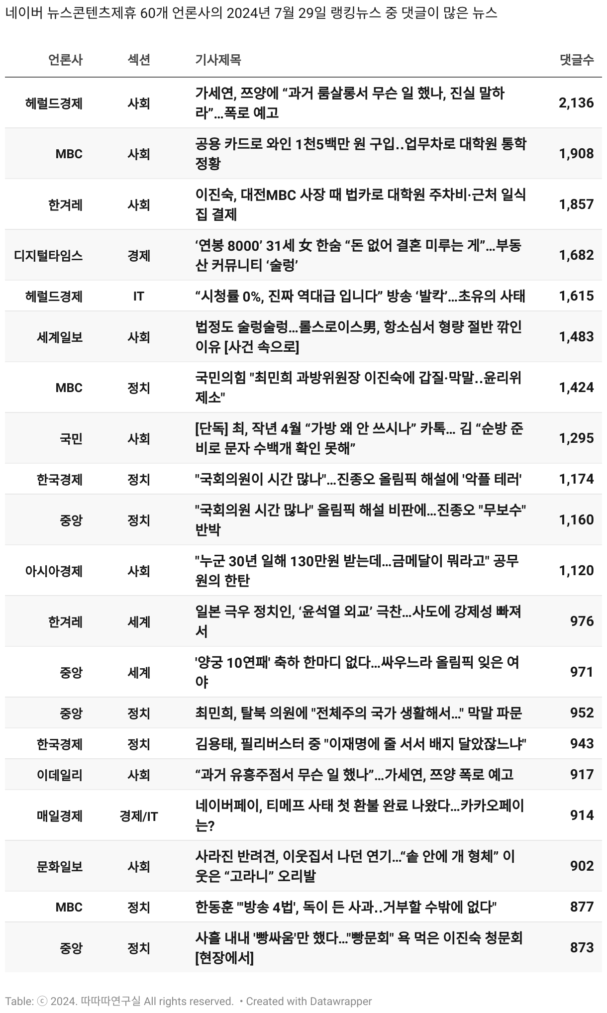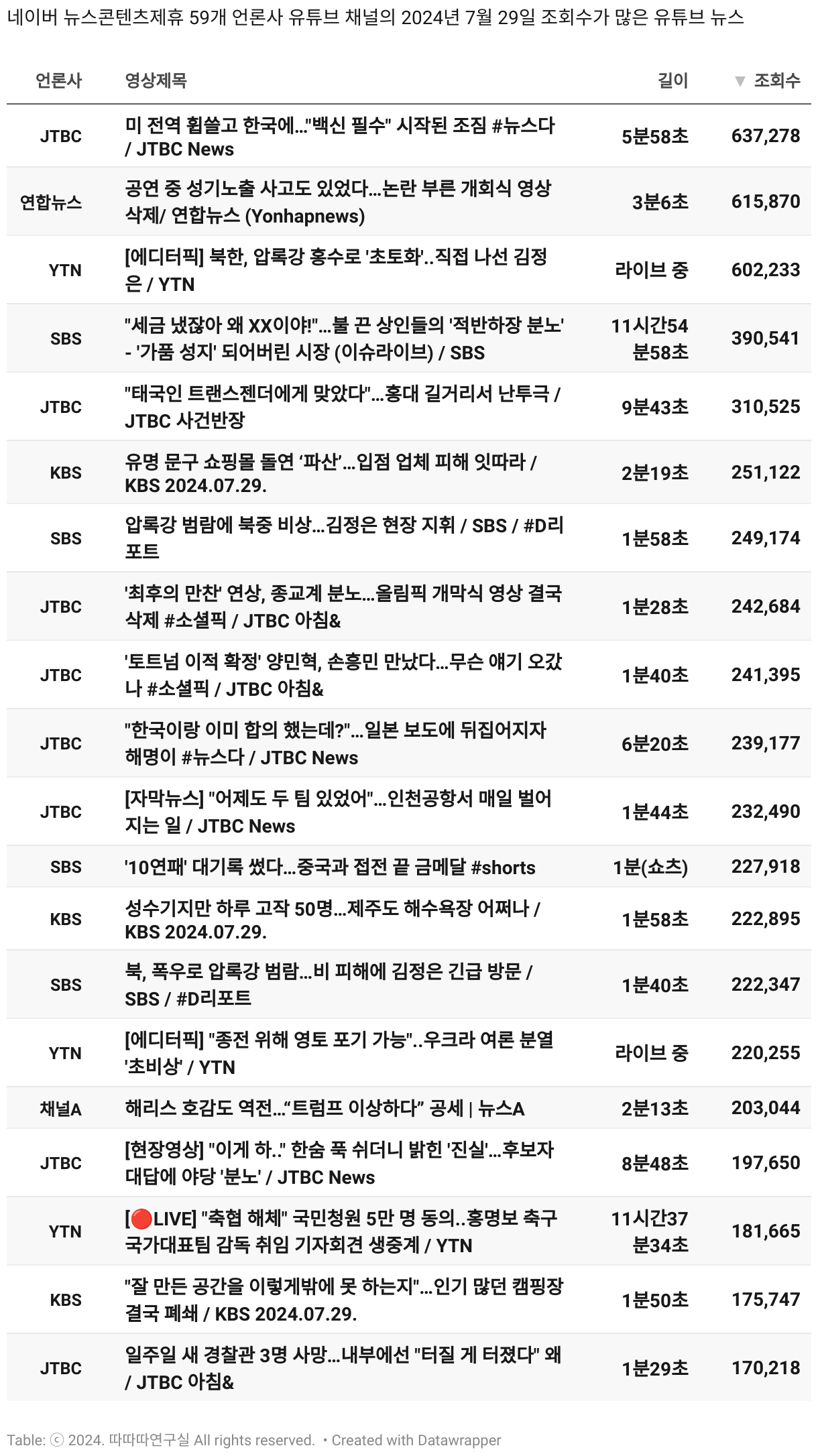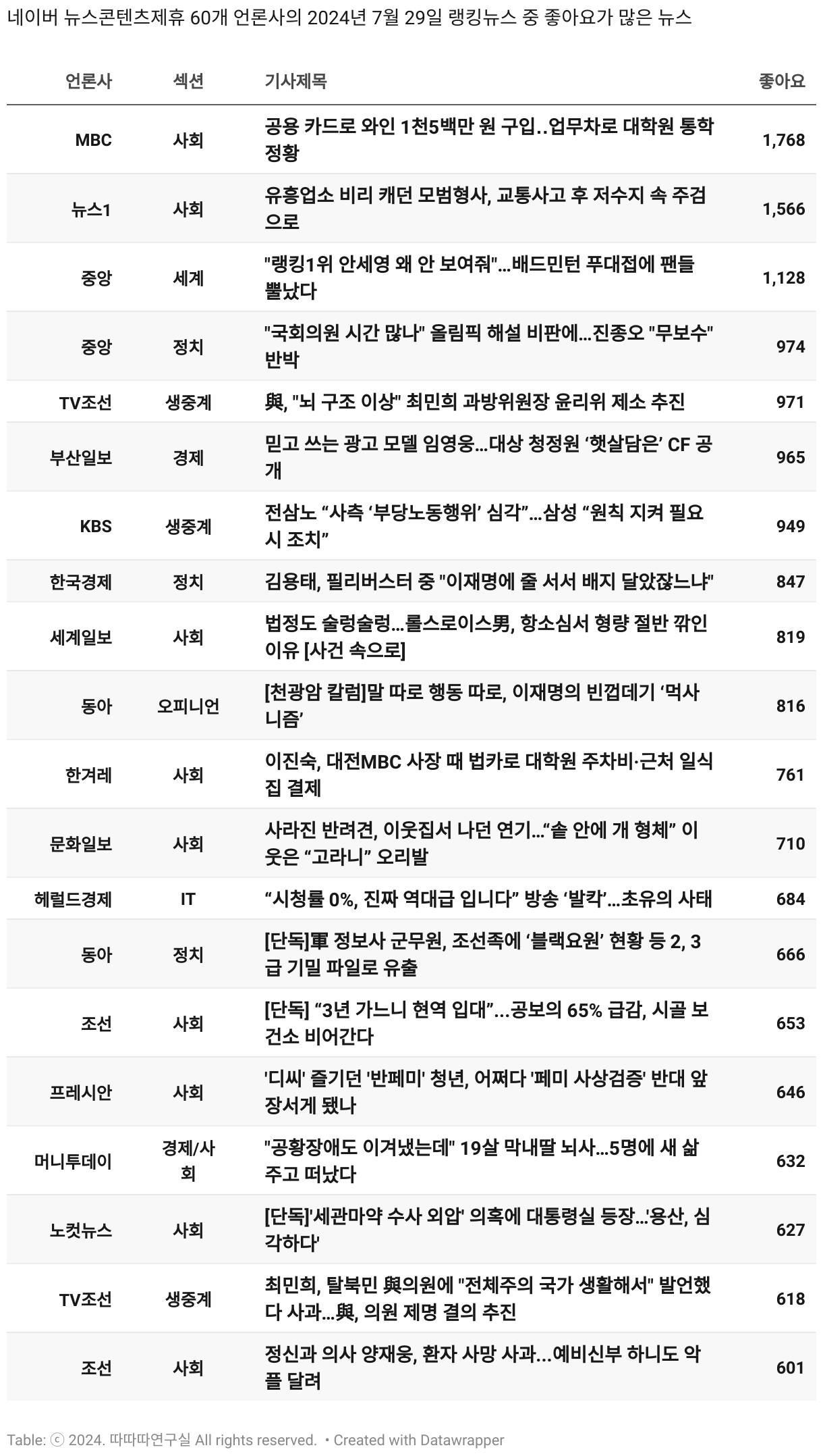 *데이터 수집 기간 : 2024년 6월 10일 *데이터 수집 대상 : 네이버 뉴스콘텐츠제휴 60개 언론사. 종합일간지 10개(경향신문, 국민일보, 동아일보, 문화일보, 서울신문, 세계일보, 조선일보, 중앙일보, 한겨레신문, 한국일보), 방송/통신사 14개(뉴스1, 뉴시스, 연합뉴스, 연합뉴스TV, 채널A, 한국경제TV, JTBC, KBS, MBC, MBN, SBS, SBS BIZ, TV조선, YTN), 경제지 11개(매일경제, 머니투데이, 비즈워치, 서울경제, 아시아경제, 이데일리, 조선비즈, 조세일보, 파이낸셜뉴스, 한국경제(유튜브제외), 헤럴드경제) 인터넷 8개(노컷뉴스, 더팩트, 데일리안, 머니S, 미디어오늘, 아이뉴스24, 오마이뉴스, 프레시안), IT 5개(디지털데일리,디지털타임스, 블로터, 전자신문, 지디넷코리아), 지역 12개(강원도민일보, 강원일보, 경기일보, 국제신문, 대구MBC, 대전일보, 매일신문, 부산일보, 전주MBC, CJB청주방송, JIBS, kbc광주방송)