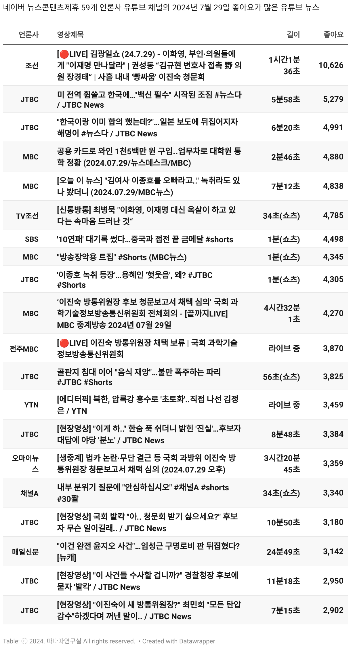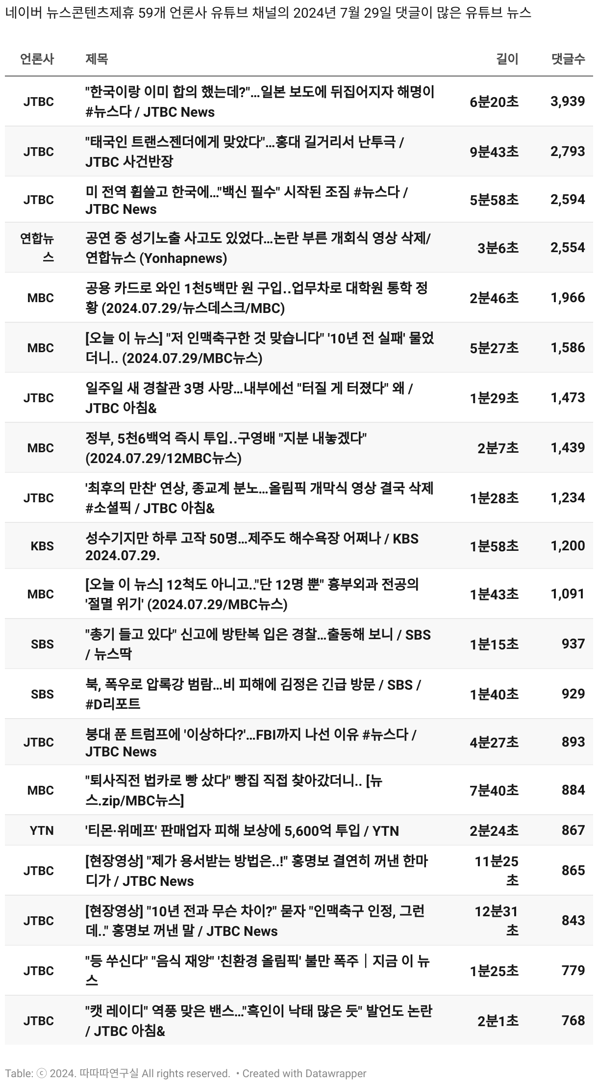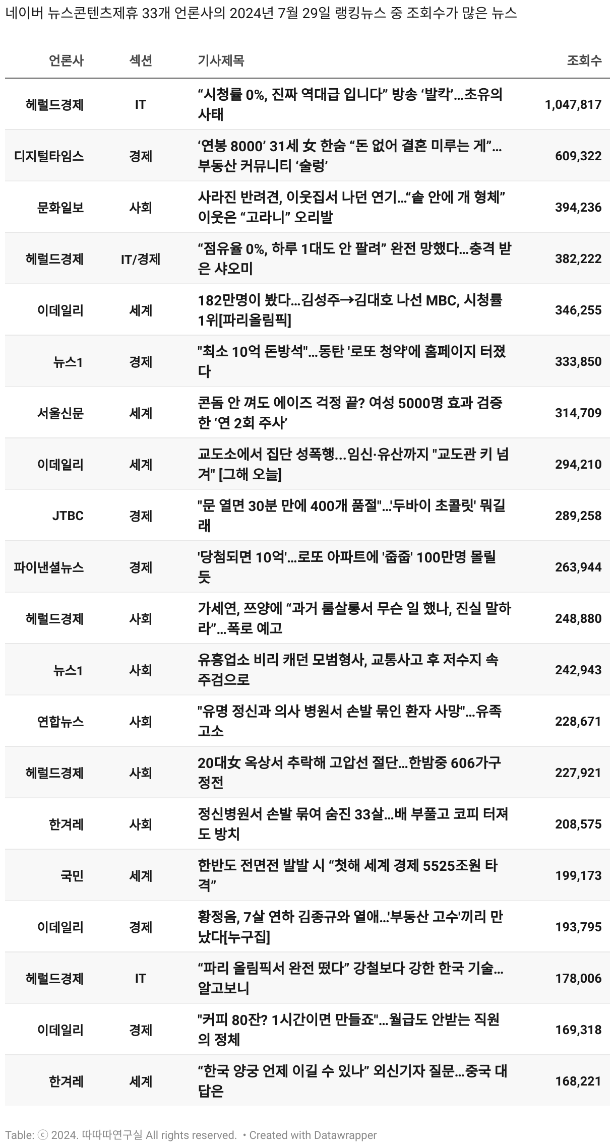 *데이터 수집 기간 : 2024년 6월 10일 *데이터 수집 대상 : 네이버 뉴스콘텐츠제휴 60개 언론사. 종합일간지 10개(경향신문, 국민일보, 동아일보, 문화일보, 서울신문, 세계일보, 조선일보, 중앙일보, 한겨레신문, 한국일보), 방송/통신사 14개(뉴스1, 뉴시스, 연합뉴스, 연합뉴스TV, 채널A, 한국경제TV, JTBC, KBS, MBC, MBN, SBS, SBS BIZ, TV조선, YTN), 경제지 11개(매일경제, 머니투데이, 비즈워치, 서울경제, 아시아경제, 이데일리, 조선비즈, 조세일보, 파이낸셜뉴스, 한국경제(유튜브제외), 헤럴드경제) 인터넷 8개(노컷뉴스, 더팩트, 데일리안, 머니S, 미디어오늘, 아이뉴스24, 오마이뉴스, 프레시안), IT 5개(디지털데일리,디지털타임스, 블로터, 전자신문, 지디넷코리아), 지역 12개(강원도민일보, 강원일보, 경기일보, 국제신문, 대구MBC, 대전일보, 매일신문, 부산일보, 전주MBC, CJB청주방송, JIBS, kbc광주방송)