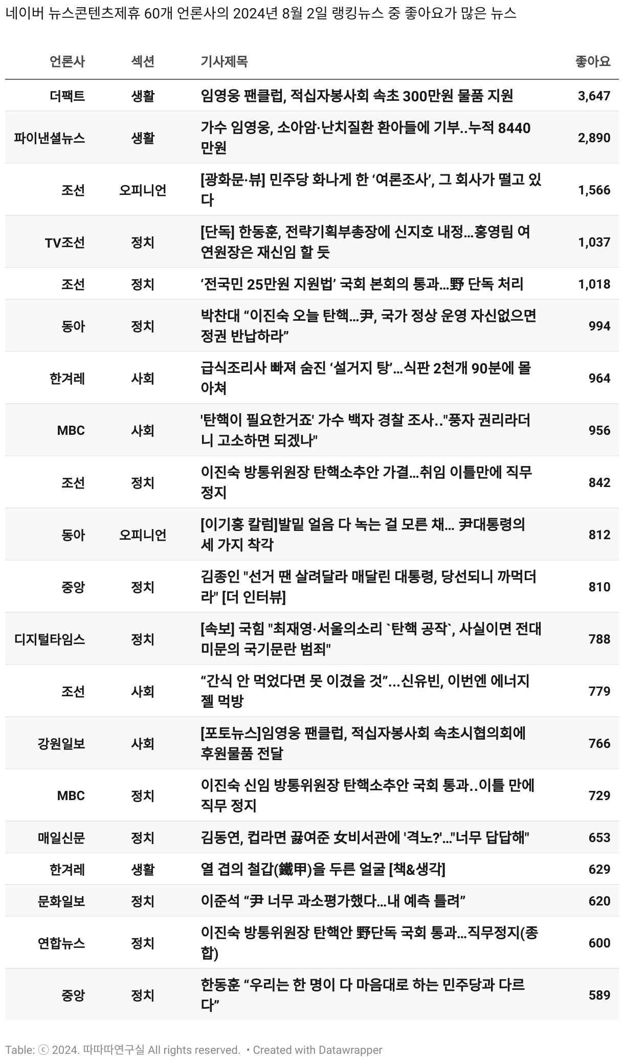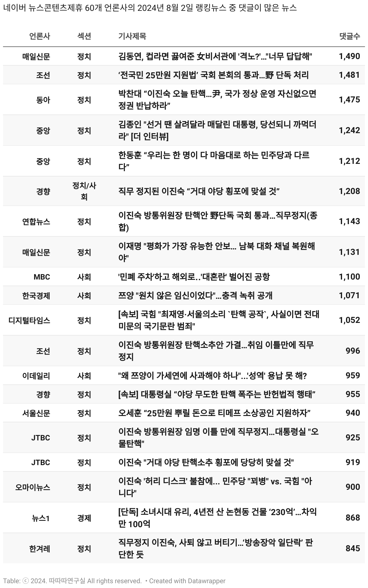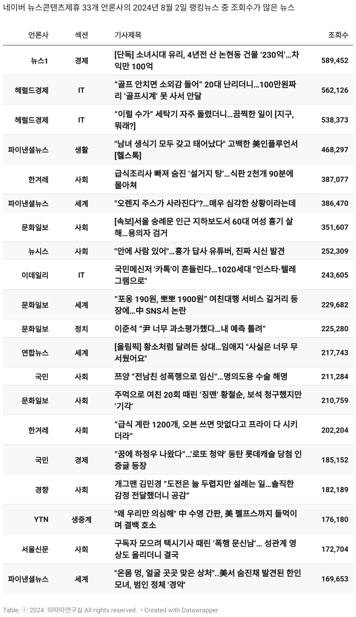 *데이터 수집 기간 : 2024년 6월 10일 *데이터 수집 대상 : 네이버 뉴스콘텐츠제휴 60개 언론사. 종합일간지 10개(경향신문, 국민일보, 동아일보, 문화일보, 서울신문, 세계일보, 조선일보, 중앙일보, 한겨레신문, 한국일보), 방송/통신사 14개(뉴스1, 뉴시스, 연합뉴스, 연합뉴스TV, 채널A, 한국경제TV, JTBC, KBS, MBC, MBN, SBS, SBS BIZ, TV조선, YTN), 경제지 11개(매일경제, 머니투데이, 비즈워치, 서울경제, 아시아경제, 이데일리, 조선비즈, 조세일보, 파이낸셜뉴스, 한국경제(유튜브제외), 헤럴드경제) 인터넷 8개(노컷뉴스, 더팩트, 데일리안, 머니S, 미디어오늘, 아이뉴스24, 오마이뉴스, 프레시안), IT 5개(디지털데일리,디지털타임스, 블로터, 전자신문, 지디넷코리아), 지역 12개(강원도민일보, 강원일보, 경기일보, 국제신문, 대구MBC, 대전일보, 매일신문, 부산일보, 전주MBC, CJB청주방송, JIBS, kbc광주방송)