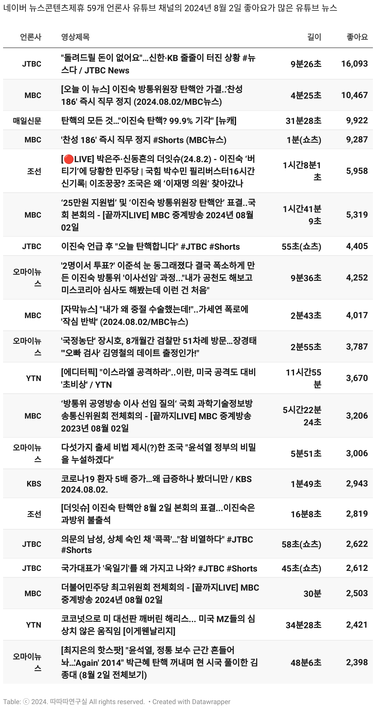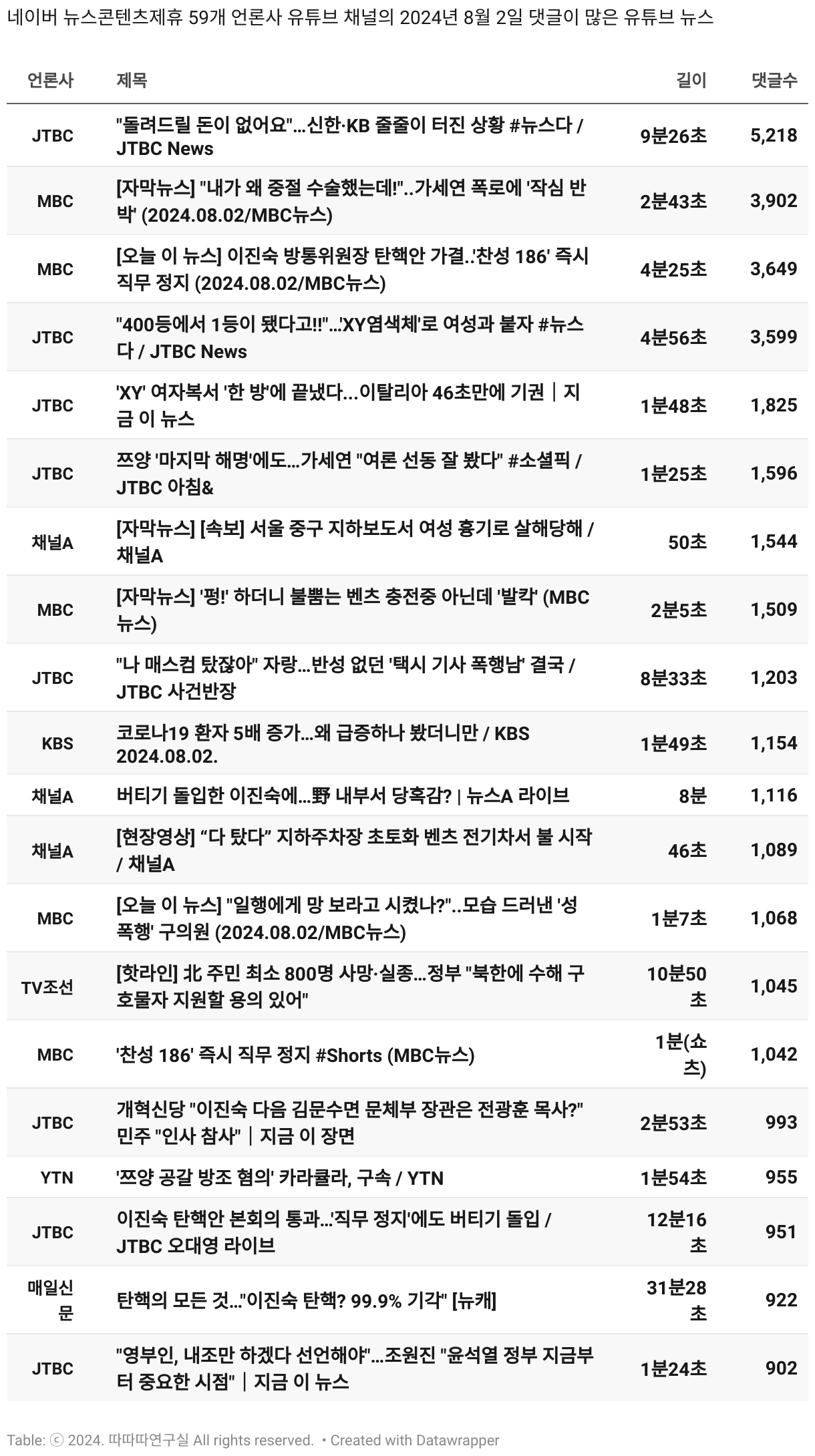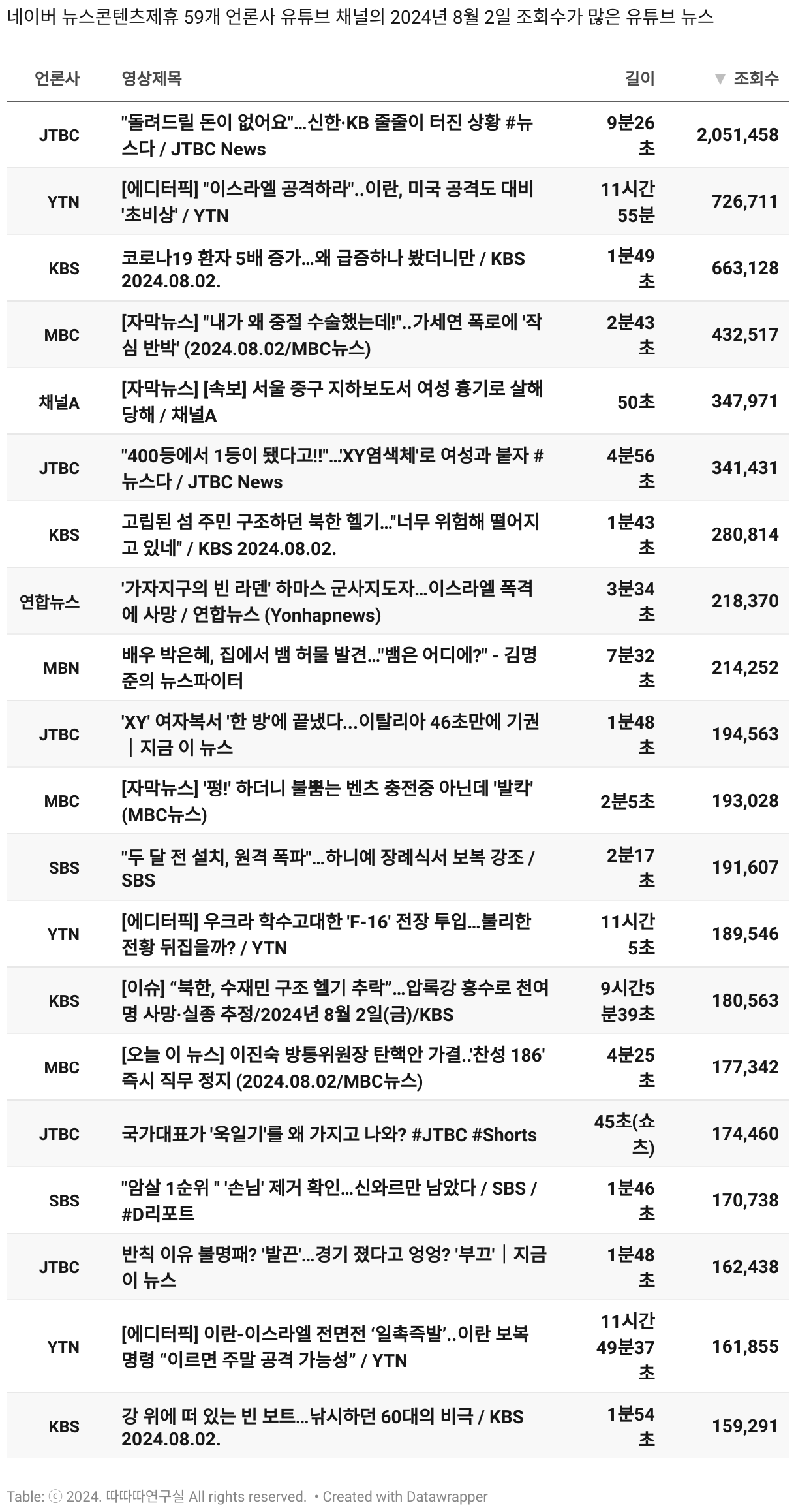 *데이터 수집 기간 : 2024년 6월 10일 *데이터 수집 대상 : 네이버 뉴스콘텐츠제휴 60개 언론사. 종합일간지 10개(경향신문, 국민일보, 동아일보, 문화일보, 서울신문, 세계일보, 조선일보, 중앙일보, 한겨레신문, 한국일보), 방송/통신사 14개(뉴스1, 뉴시스, 연합뉴스, 연합뉴스TV, 채널A, 한국경제TV, JTBC, KBS, MBC, MBN, SBS, SBS BIZ, TV조선, YTN), 경제지 11개(매일경제, 머니투데이, 비즈워치, 서울경제, 아시아경제, 이데일리, 조선비즈, 조세일보, 파이낸셜뉴스, 한국경제(유튜브제외), 헤럴드경제) 인터넷 8개(노컷뉴스, 더팩트, 데일리안, 머니S, 미디어오늘, 아이뉴스24, 오마이뉴스, 프레시안), IT 5개(디지털데일리,디지털타임스, 블로터, 전자신문, 지디넷코리아), 지역 12개(강원도민일보, 강원일보, 경기일보, 국제신문, 대구MBC, 대전일보, 매일신문, 부산일보, 전주MBC, CJB청주방송, JIBS, kbc광주방송)