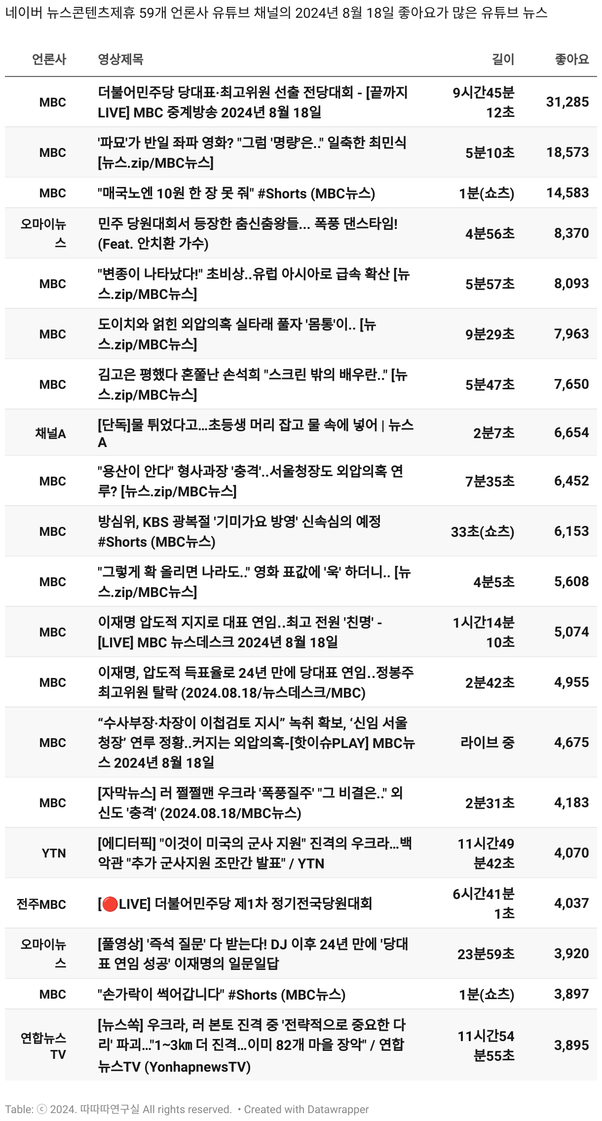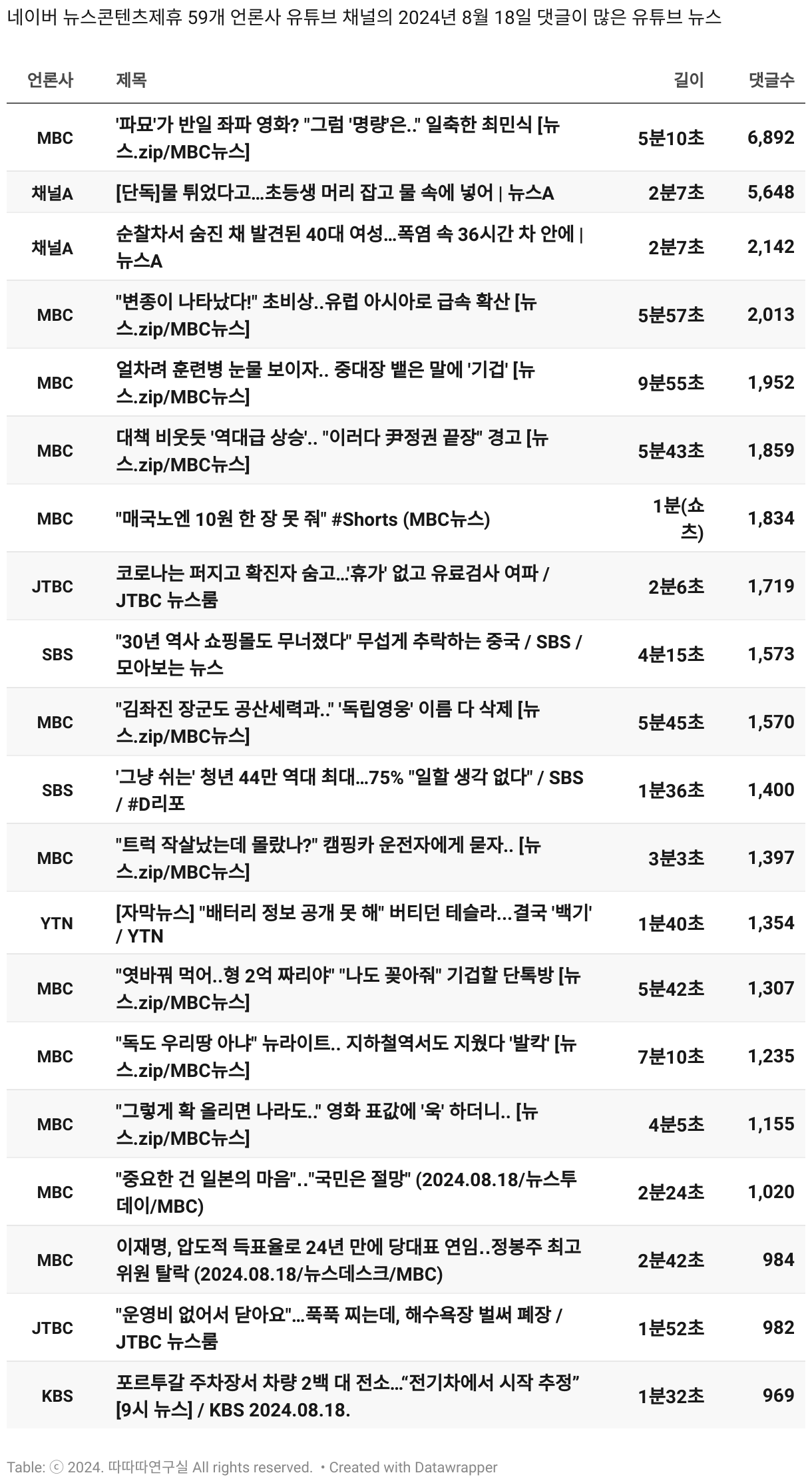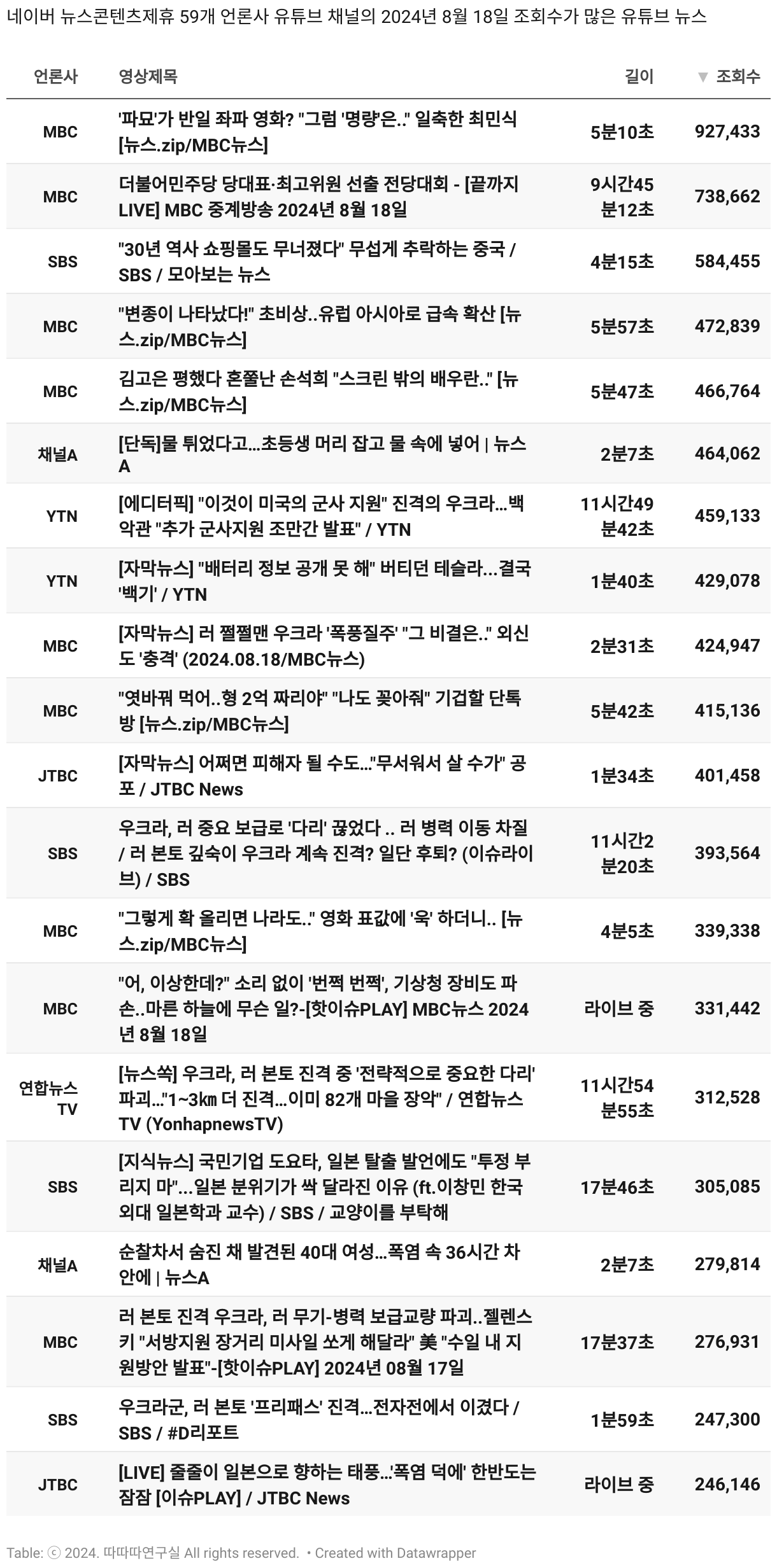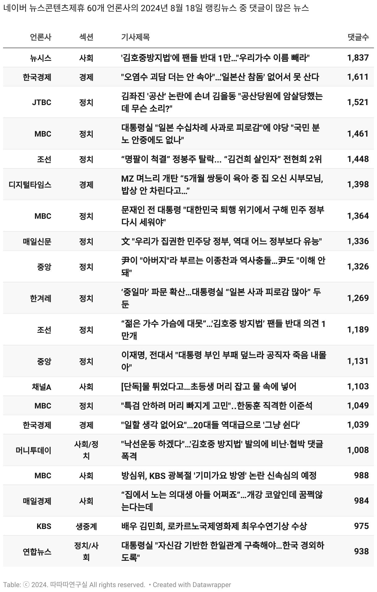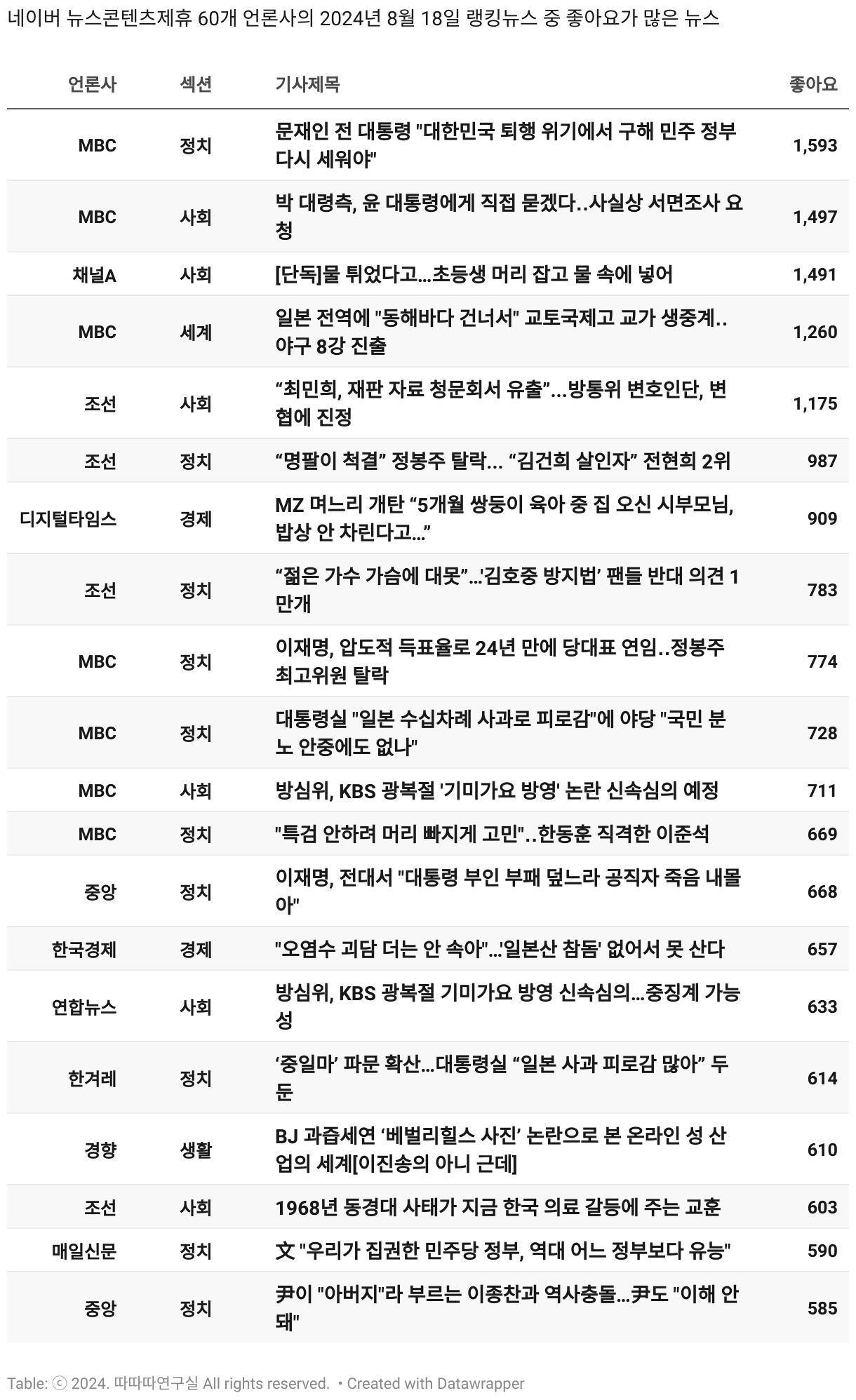 *데이터 수집 기간 : 2024년 6월 10일 *데이터 수집 대상 : 네이버 뉴스콘텐츠제휴 60개 언론사. 종합일간지 10개(경향신문, 국민일보, 동아일보, 문화일보, 서울신문, 세계일보, 조선일보, 중앙일보, 한겨레신문, 한국일보), 방송/통신사 14개(뉴스1, 뉴시스, 연합뉴스, 연합뉴스TV, 채널A, 한국경제TV, JTBC, KBS, MBC, MBN, SBS, SBS BIZ, TV조선, YTN), 경제지 11개(매일경제, 머니투데이, 비즈워치, 서울경제, 아시아경제, 이데일리, 조선비즈, 조세일보, 파이낸셜뉴스, 한국경제(유튜브제외), 헤럴드경제) 인터넷 8개(노컷뉴스, 더팩트, 데일리안, 머니S, 미디어오늘, 아이뉴스24, 오마이뉴스, 프레시안), IT 5개(디지털데일리,디지털타임스, 블로터, 전자신문, 지디넷코리아), 지역 12개(강원도민일보, 강원일보, 경기일보, 국제신문, 대구MBC, 대전일보, 매일신문, 부산일보, 전주MBC, CJB청주방송, JIBS, kbc광주방송)