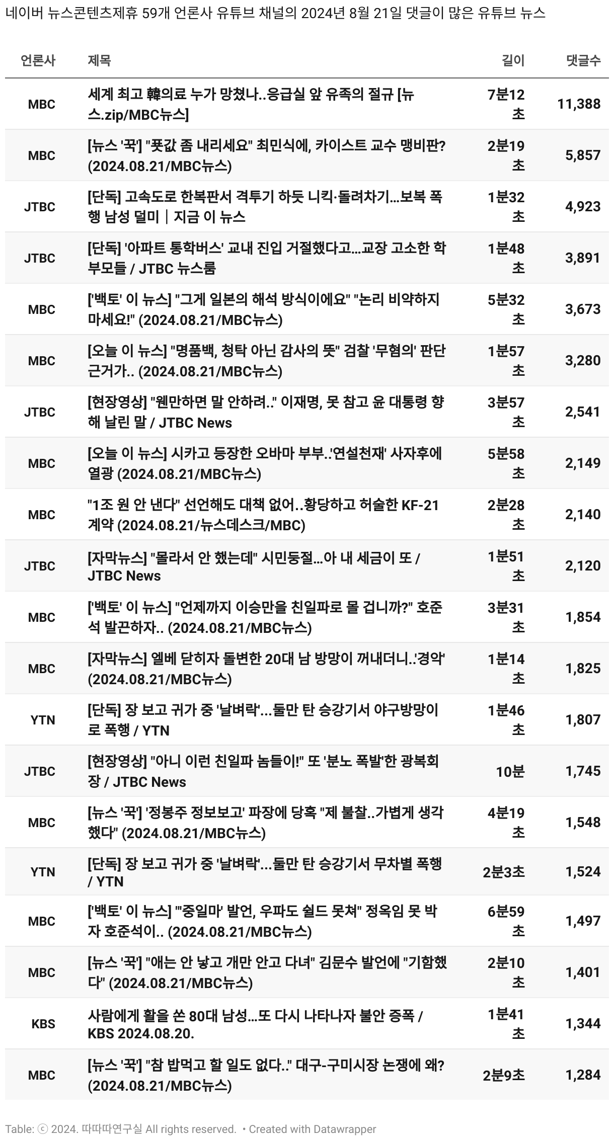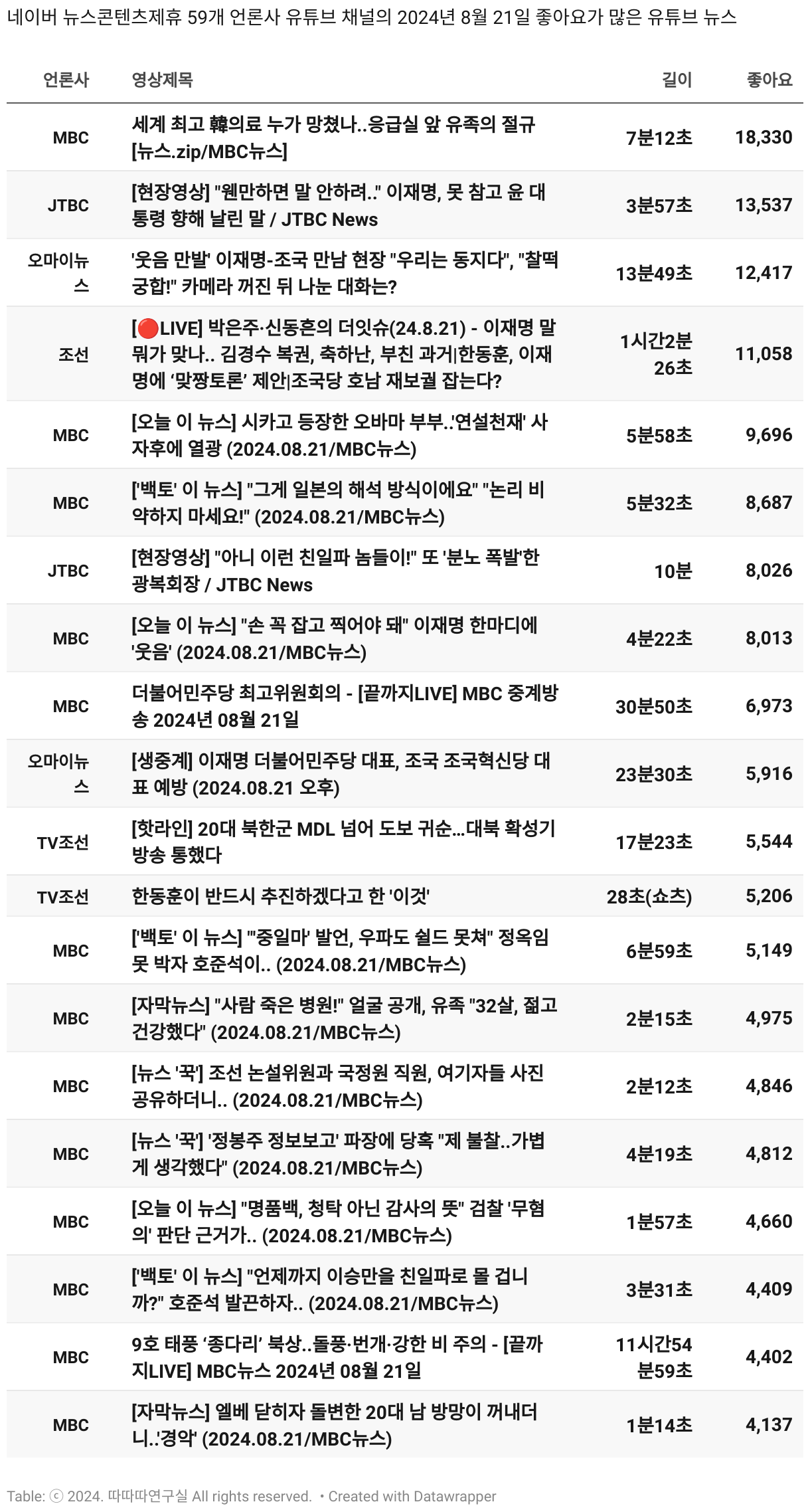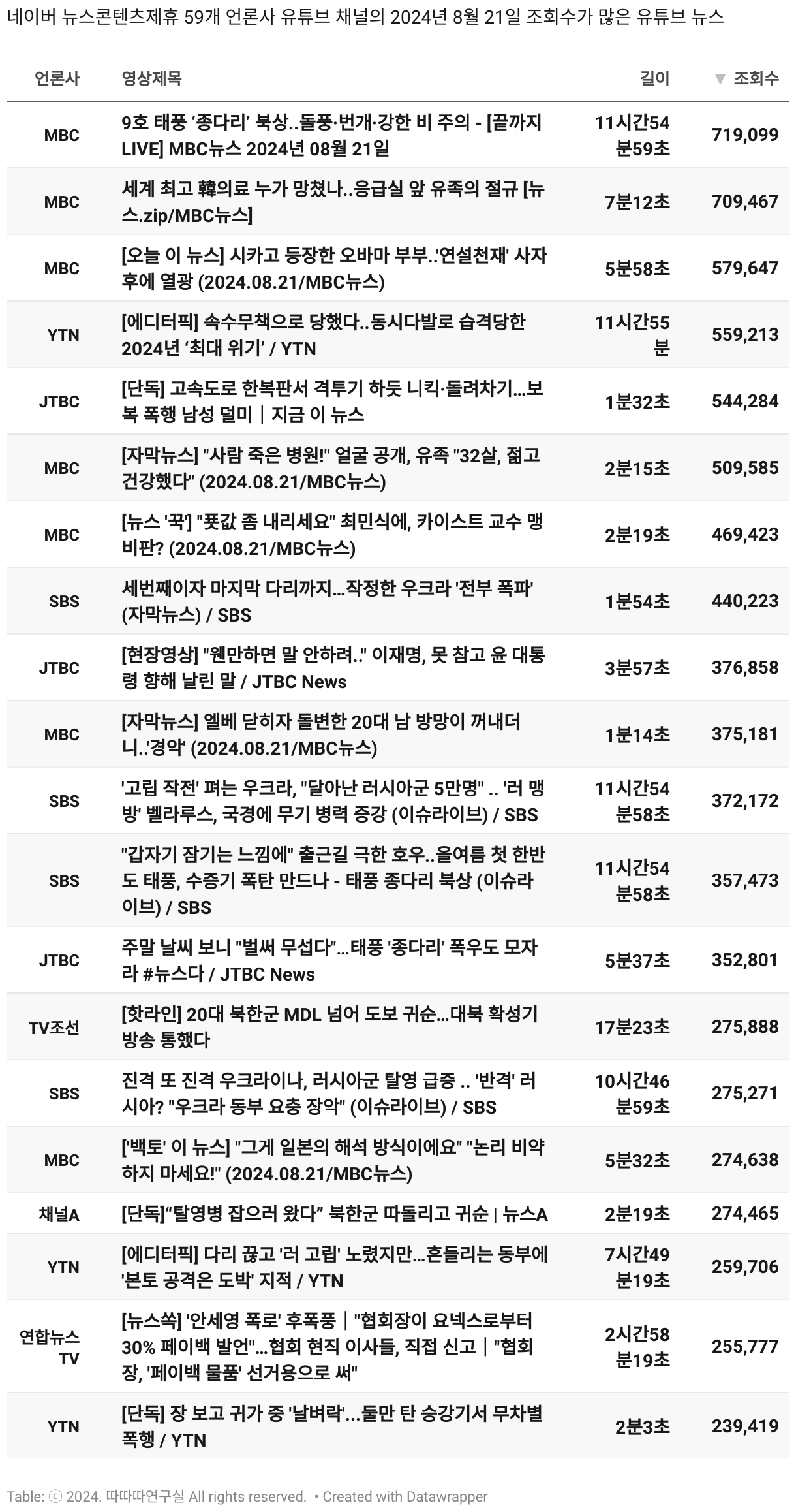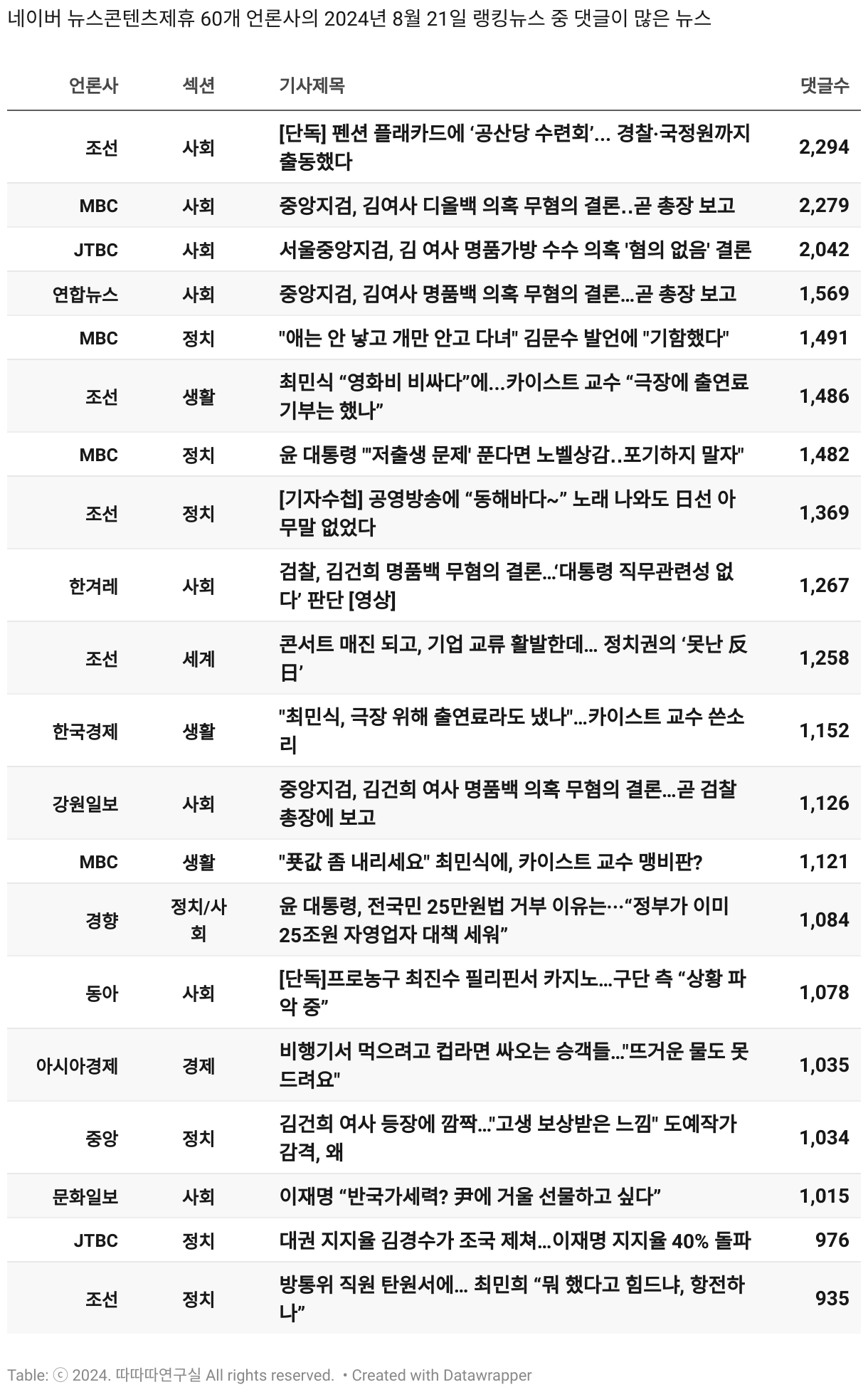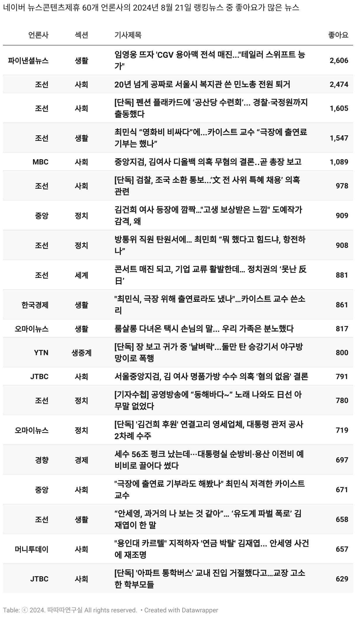 *데이터 수집 기간 : 2024년 6월 10일 *데이터 수집 대상 : 네이버 뉴스콘텐츠제휴 60개 언론사. 종합일간지 10개(경향신문, 국민일보, 동아일보, 문화일보, 서울신문, 세계일보, 조선일보, 중앙일보, 한겨레신문, 한국일보), 방송/통신사 14개(뉴스1, 뉴시스, 연합뉴스, 연합뉴스TV, 채널A, 한국경제TV, JTBC, KBS, MBC, MBN, SBS, SBS BIZ, TV조선, YTN), 경제지 11개(매일경제, 머니투데이, 비즈워치, 서울경제, 아시아경제, 이데일리, 조선비즈, 조세일보, 파이낸셜뉴스, 한국경제(유튜브제외), 헤럴드경제) 인터넷 8개(노컷뉴스, 더팩트, 데일리안, 머니S, 미디어오늘, 아이뉴스24, 오마이뉴스, 프레시안), IT 5개(디지털데일리,디지털타임스, 블로터, 전자신문, 지디넷코리아), 지역 12개(강원도민일보, 강원일보, 경기일보, 국제신문, 대구MBC, 대전일보, 매일신문, 부산일보, 전주MBC, CJB청주방송, JIBS, kbc광주방송)