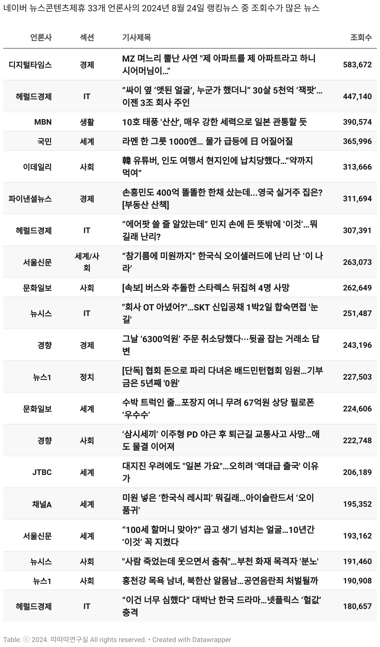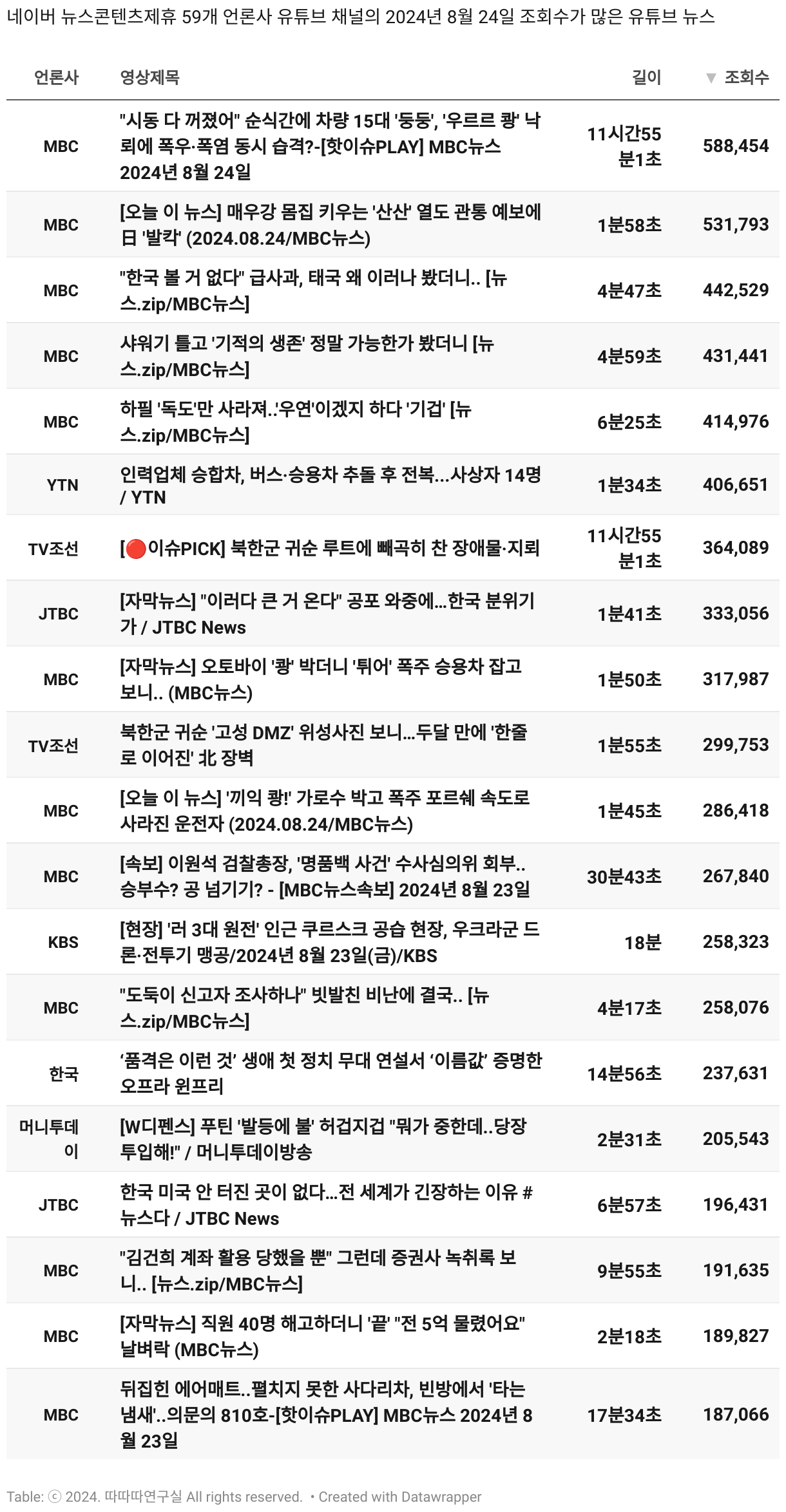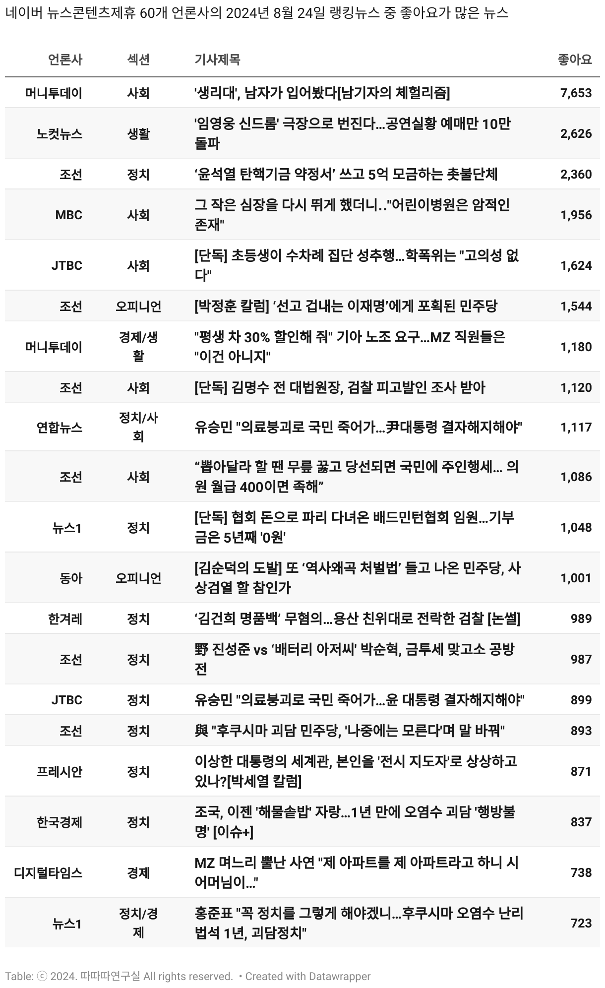 *데이터 수집 기간 : 2024년 6월 10일 *데이터 수집 대상 : 네이버 뉴스콘텐츠제휴 60개 언론사. 종합일간지 10개(경향신문, 국민일보, 동아일보, 문화일보, 서울신문, 세계일보, 조선일보, 중앙일보, 한겨레신문, 한국일보), 방송/통신사 14개(뉴스1, 뉴시스, 연합뉴스, 연합뉴스TV, 채널A, 한국경제TV, JTBC, KBS, MBC, MBN, SBS, SBS BIZ, TV조선, YTN), 경제지 11개(매일경제, 머니투데이, 비즈워치, 서울경제, 아시아경제, 이데일리, 조선비즈, 조세일보, 파이낸셜뉴스, 한국경제(유튜브제외), 헤럴드경제) 인터넷 8개(노컷뉴스, 더팩트, 데일리안, 머니S, 미디어오늘, 아이뉴스24, 오마이뉴스, 프레시안), IT 5개(디지털데일리,디지털타임스, 블로터, 전자신문, 지디넷코리아), 지역 12개(강원도민일보, 강원일보, 경기일보, 국제신문, 대구MBC, 대전일보, 매일신문, 부산일보, 전주MBC, CJB청주방송, JIBS, kbc광주방송)