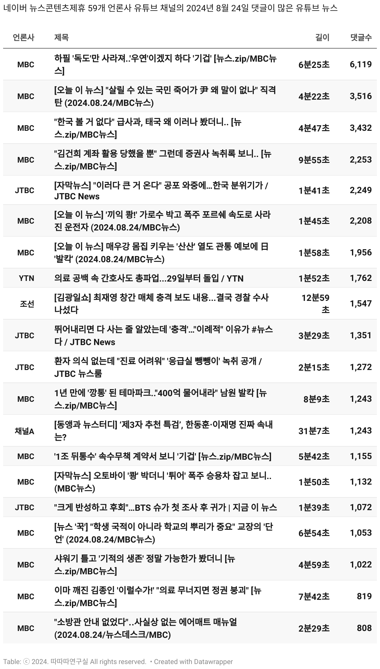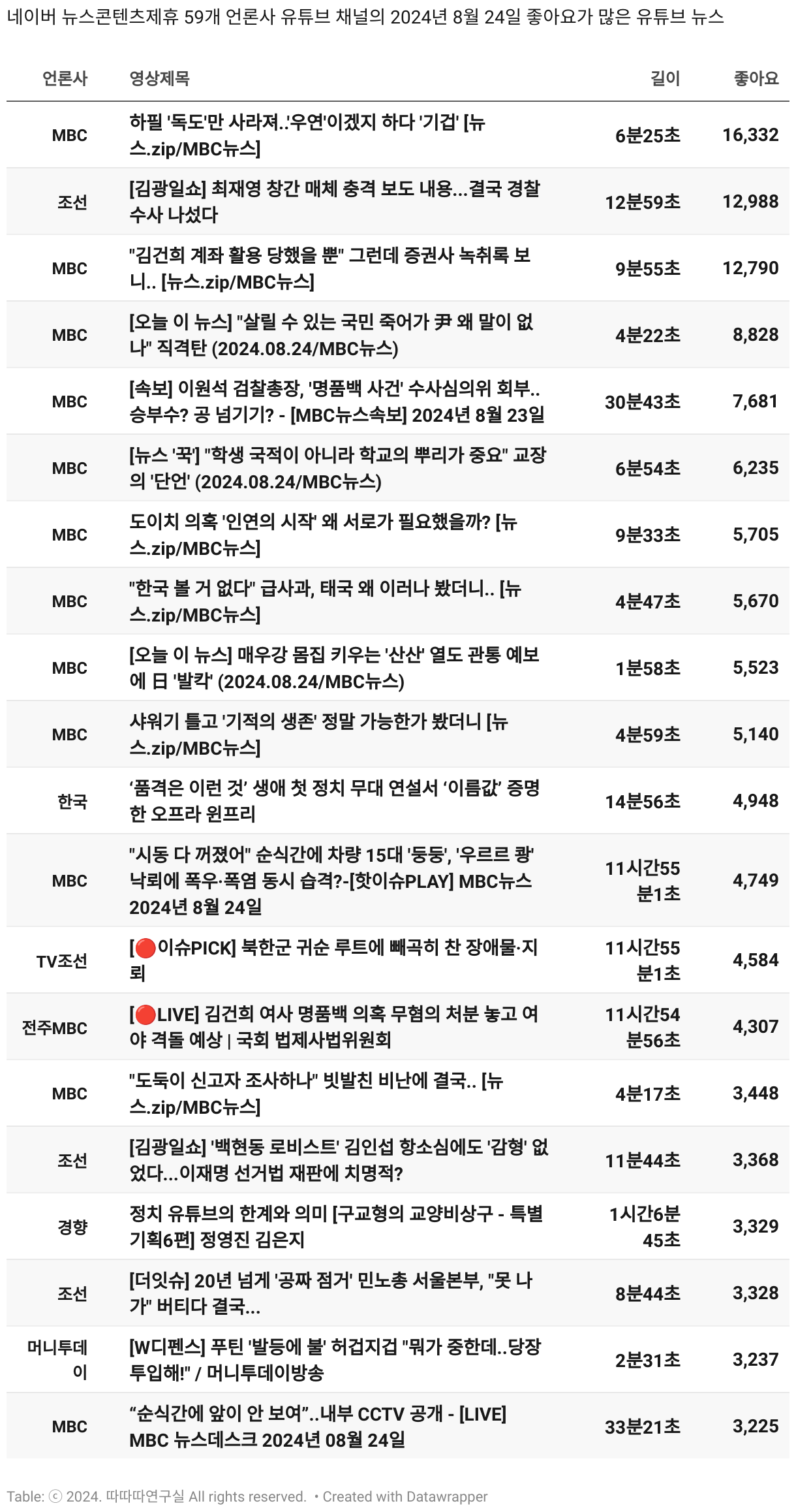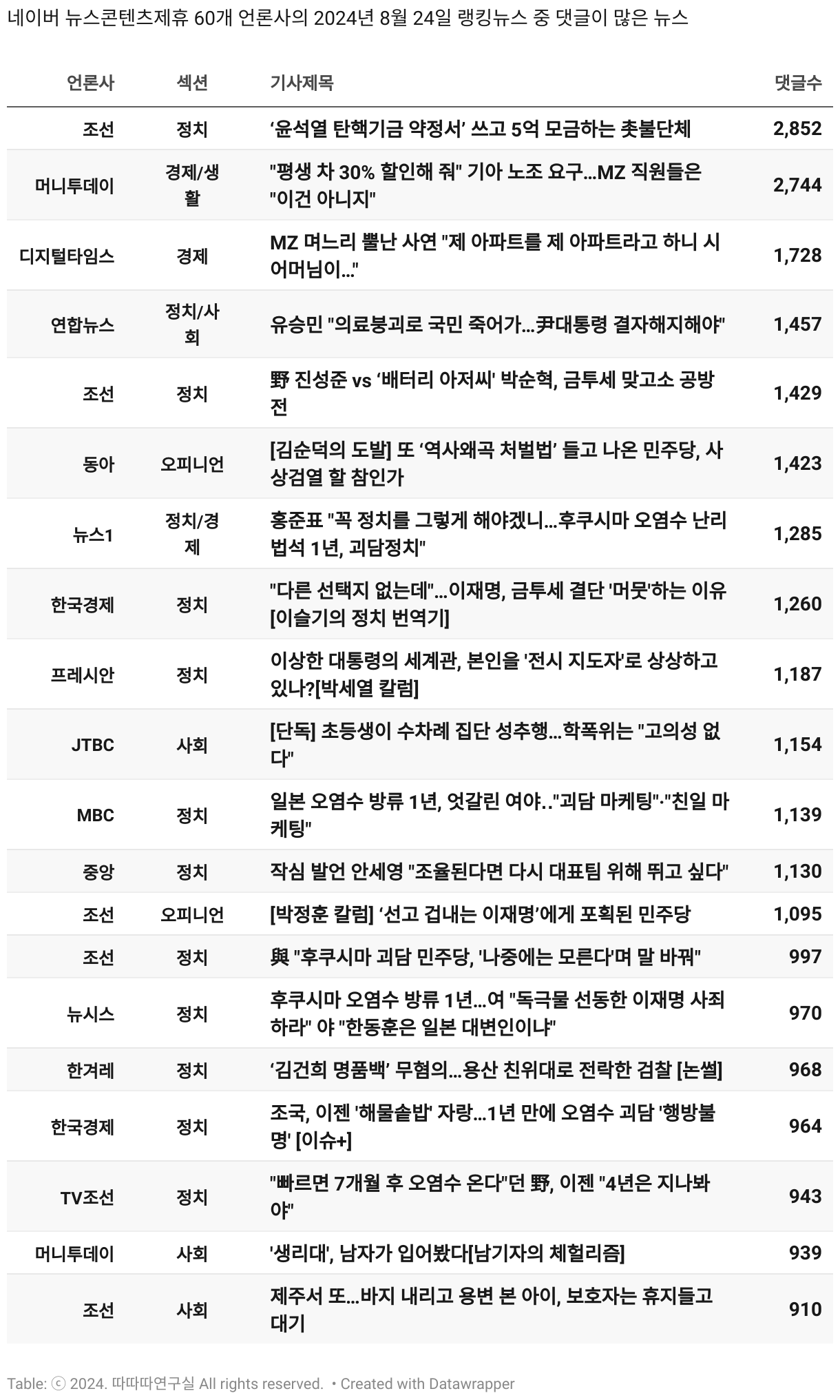 *데이터 수집 기간 : 2024년 6월 10일 *데이터 수집 대상 : 네이버 뉴스콘텐츠제휴 60개 언론사. 종합일간지 10개(경향신문, 국민일보, 동아일보, 문화일보, 서울신문, 세계일보, 조선일보, 중앙일보, 한겨레신문, 한국일보), 방송/통신사 14개(뉴스1, 뉴시스, 연합뉴스, 연합뉴스TV, 채널A, 한국경제TV, JTBC, KBS, MBC, MBN, SBS, SBS BIZ, TV조선, YTN), 경제지 11개(매일경제, 머니투데이, 비즈워치, 서울경제, 아시아경제, 이데일리, 조선비즈, 조세일보, 파이낸셜뉴스, 한국경제(유튜브제외), 헤럴드경제) 인터넷 8개(노컷뉴스, 더팩트, 데일리안, 머니S, 미디어오늘, 아이뉴스24, 오마이뉴스, 프레시안), IT 5개(디지털데일리,디지털타임스, 블로터, 전자신문, 지디넷코리아), 지역 12개(강원도민일보, 강원일보, 경기일보, 국제신문, 대구MBC, 대전일보, 매일신문, 부산일보, 전주MBC, CJB청주방송, JIBS, kbc광주방송)