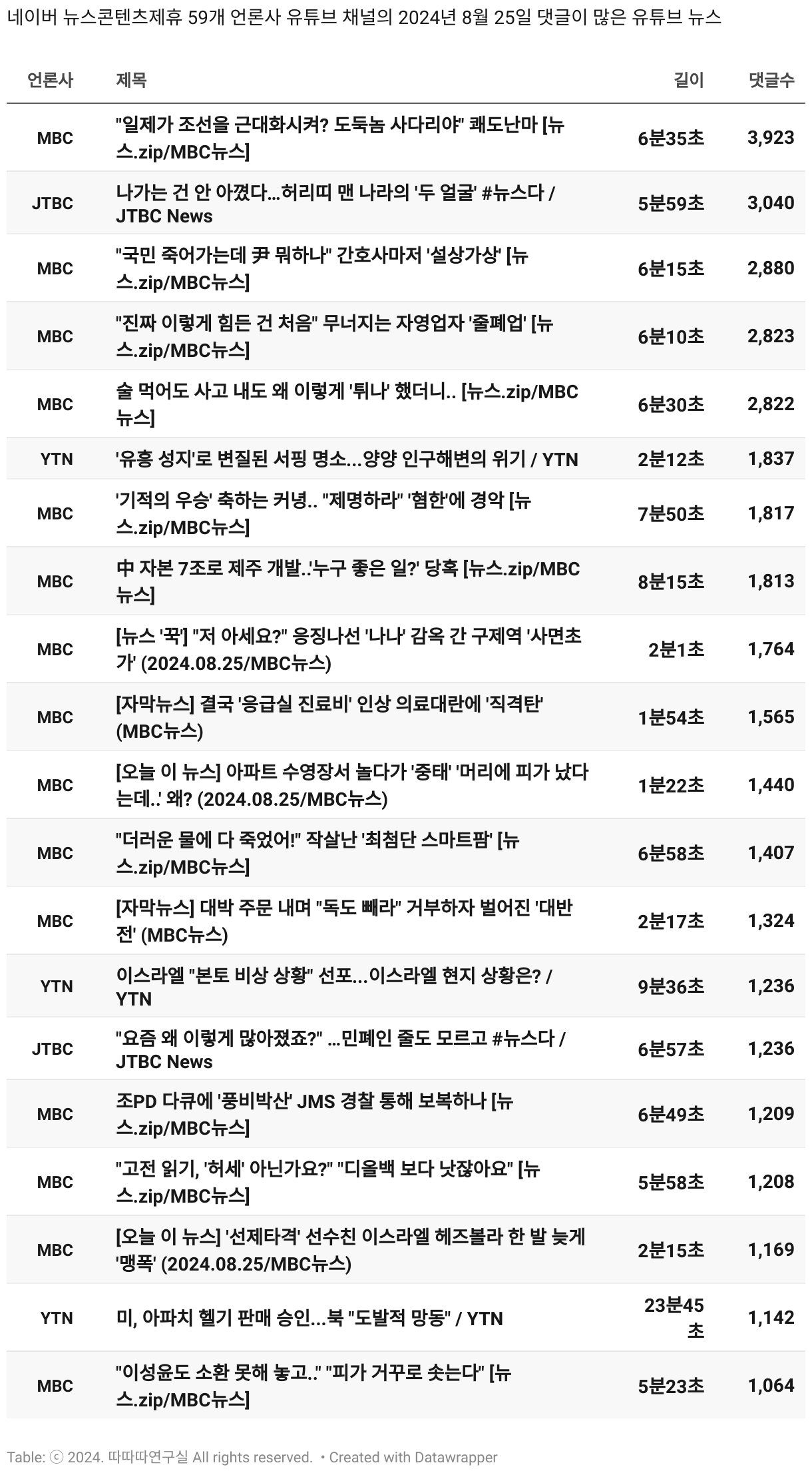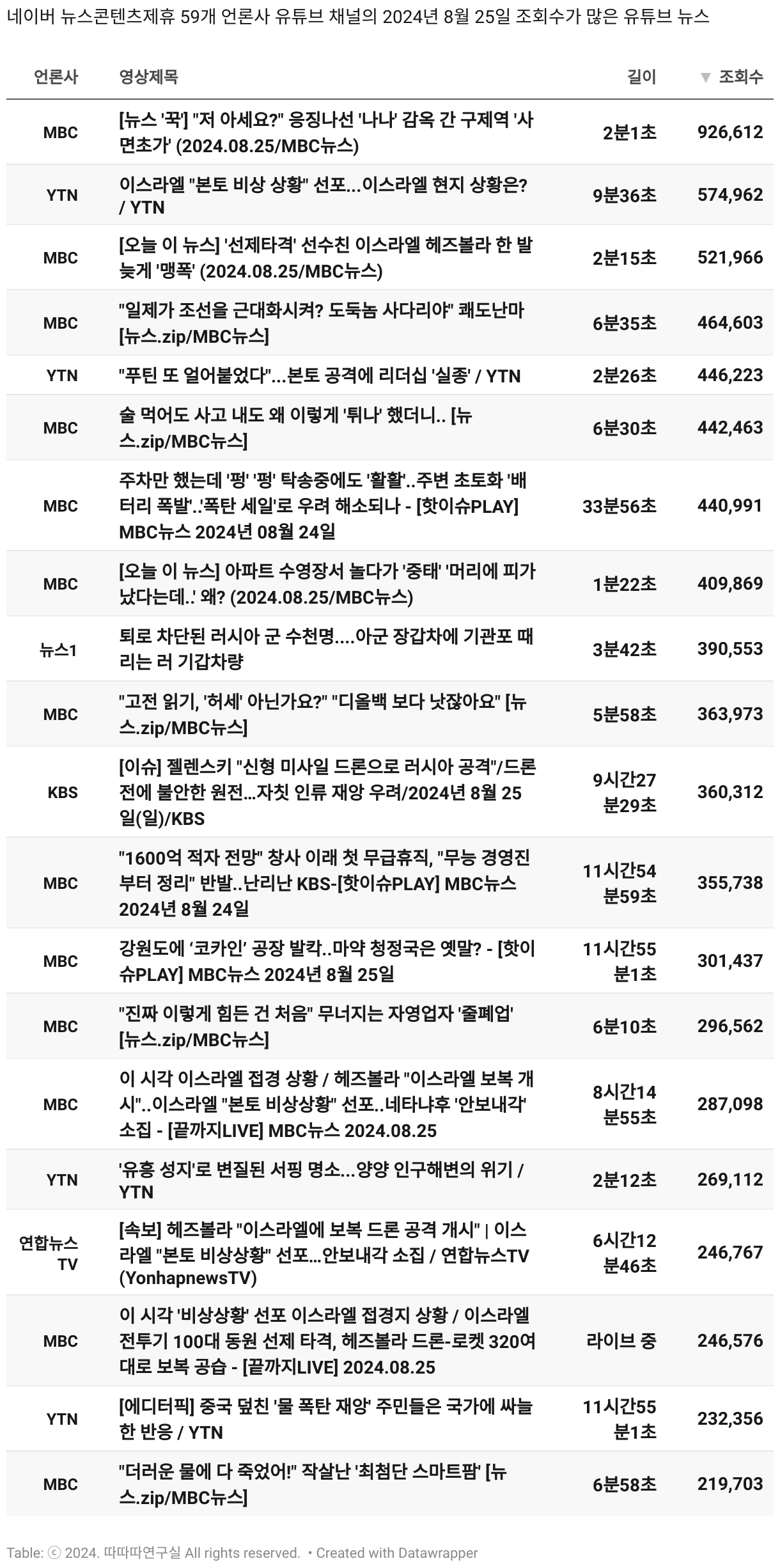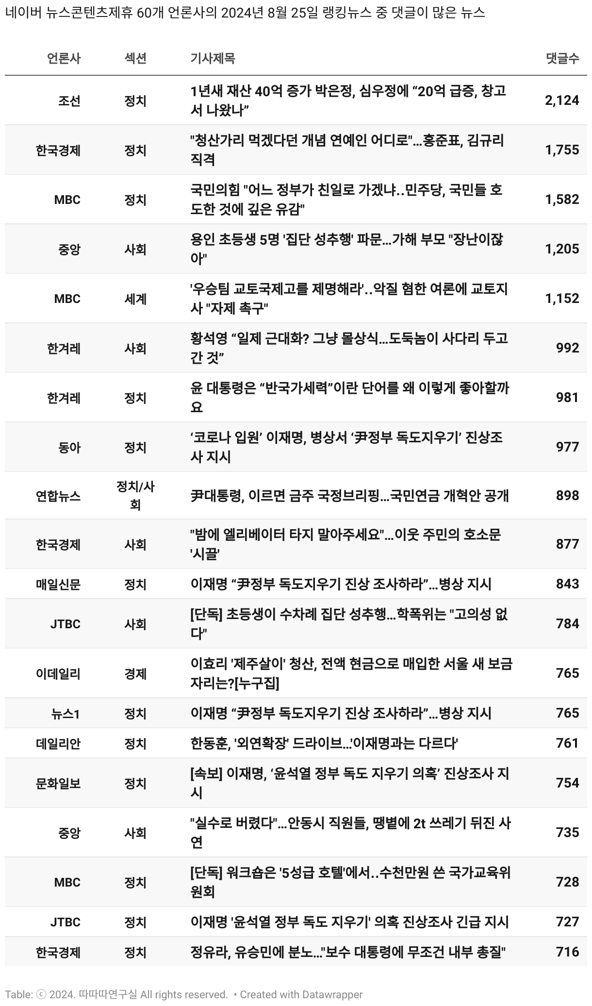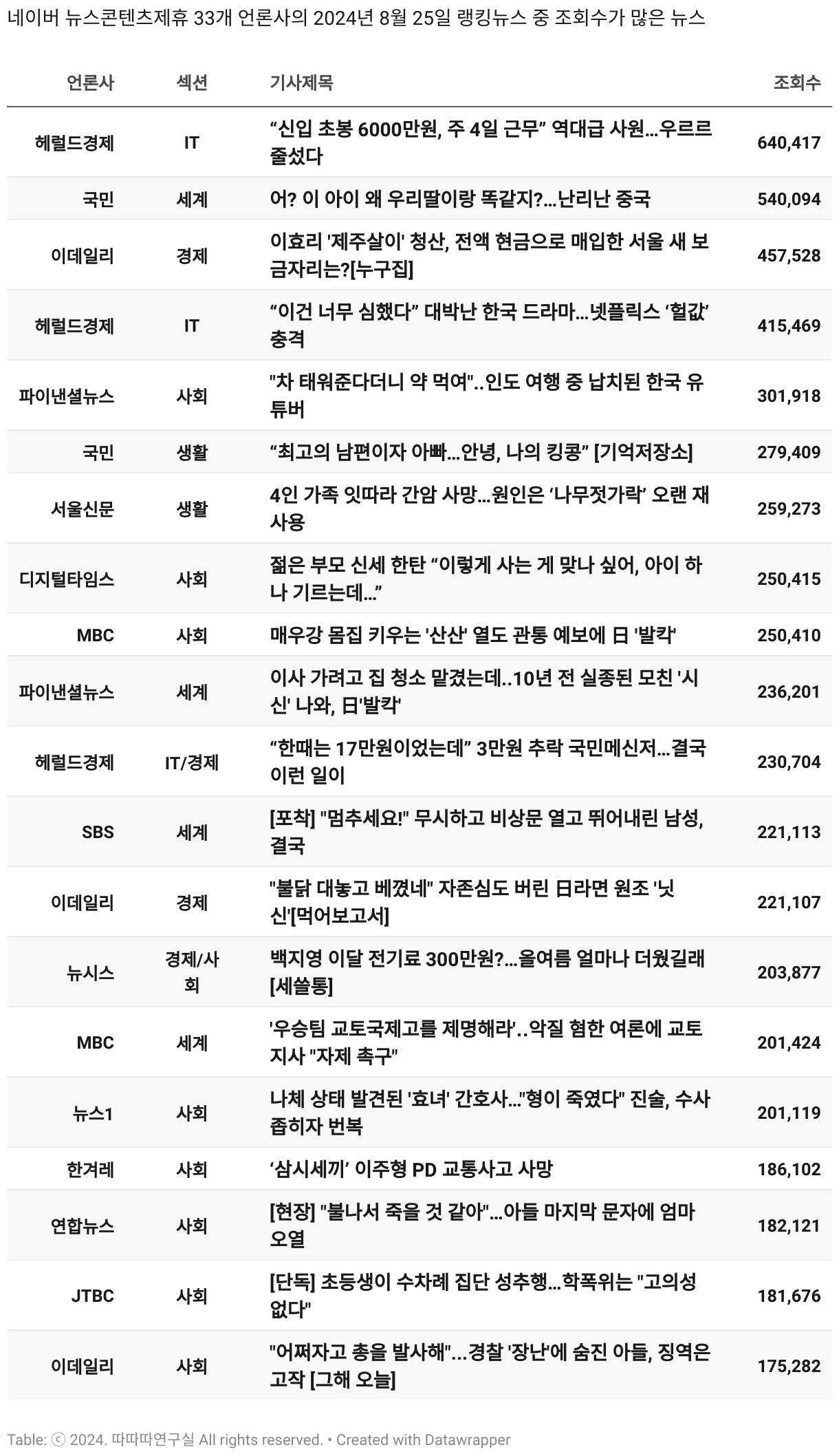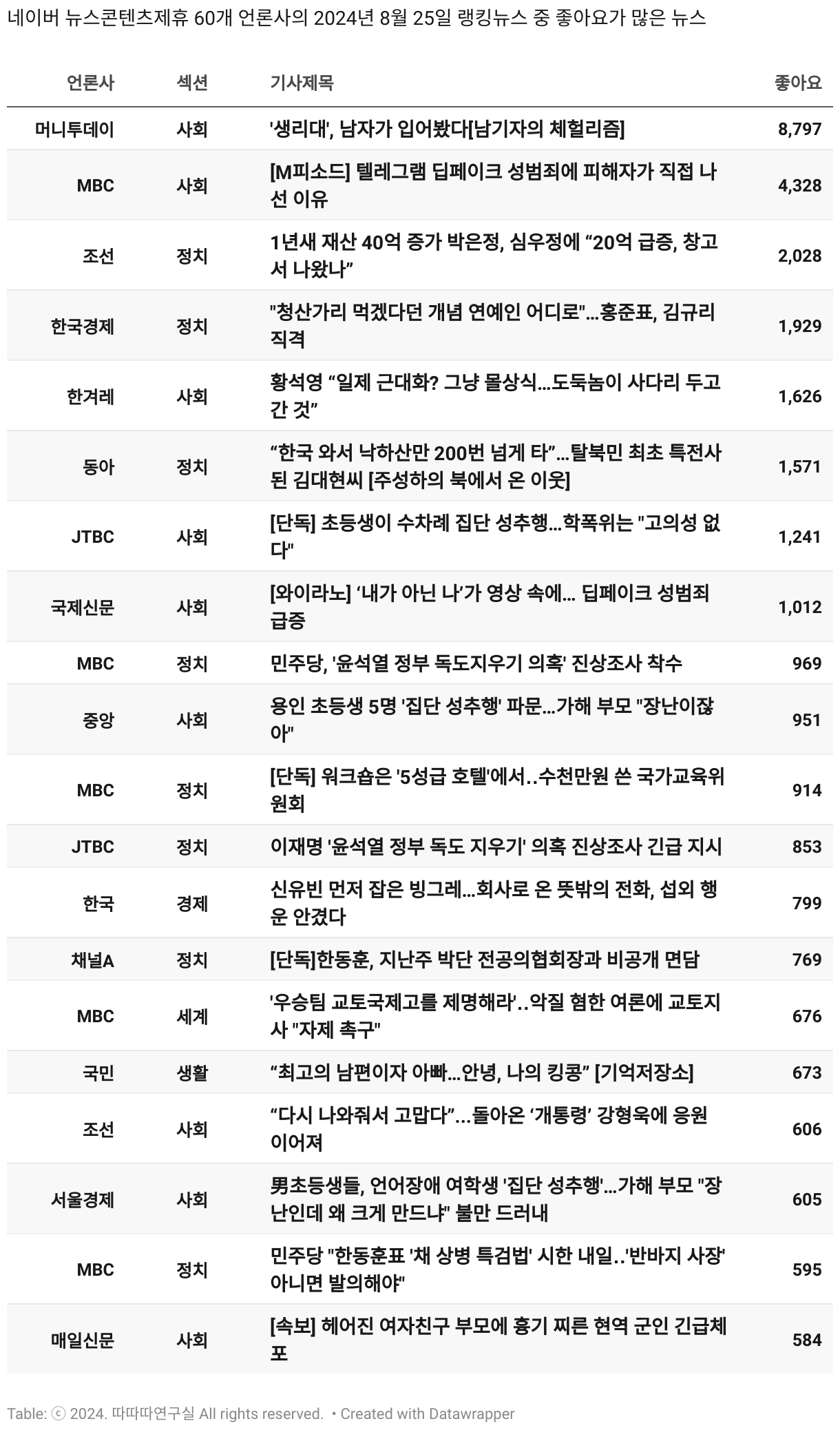 *데이터 수집 기간 : 2024년 6월 10일 *데이터 수집 대상 : 네이버 뉴스콘텐츠제휴 60개 언론사. 종합일간지 10개(경향신문, 국민일보, 동아일보, 문화일보, 서울신문, 세계일보, 조선일보, 중앙일보, 한겨레신문, 한국일보), 방송/통신사 14개(뉴스1, 뉴시스, 연합뉴스, 연합뉴스TV, 채널A, 한국경제TV, JTBC, KBS, MBC, MBN, SBS, SBS BIZ, TV조선, YTN), 경제지 11개(매일경제, 머니투데이, 비즈워치, 서울경제, 아시아경제, 이데일리, 조선비즈, 조세일보, 파이낸셜뉴스, 한국경제(유튜브제외), 헤럴드경제) 인터넷 8개(노컷뉴스, 더팩트, 데일리안, 머니S, 미디어오늘, 아이뉴스24, 오마이뉴스, 프레시안), IT 5개(디지털데일리,디지털타임스, 블로터, 전자신문, 지디넷코리아), 지역 12개(강원도민일보, 강원일보, 경기일보, 국제신문, 대구MBC, 대전일보, 매일신문, 부산일보, 전주MBC, CJB청주방송, JIBS, kbc광주방송)