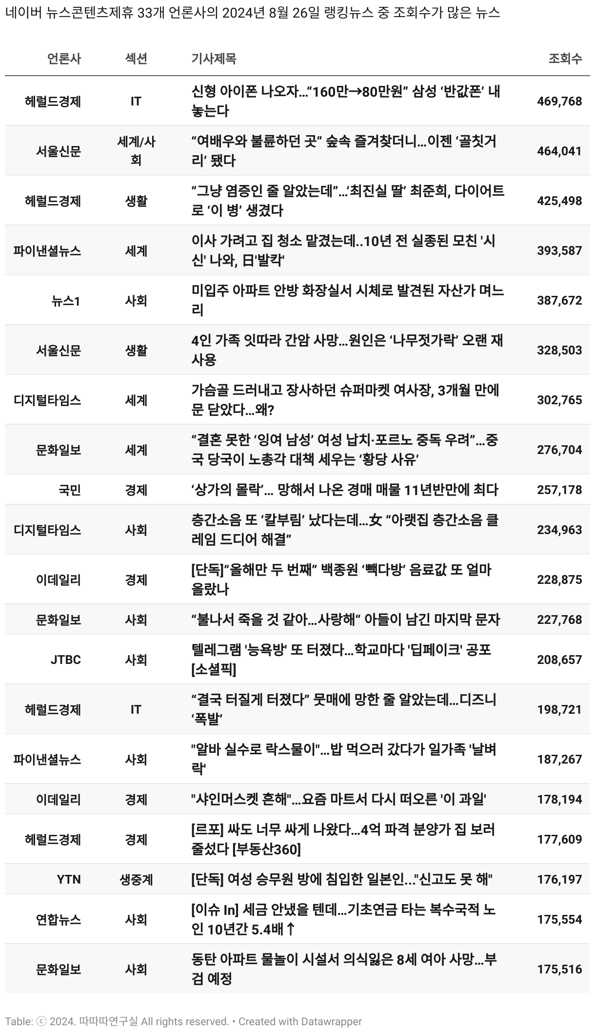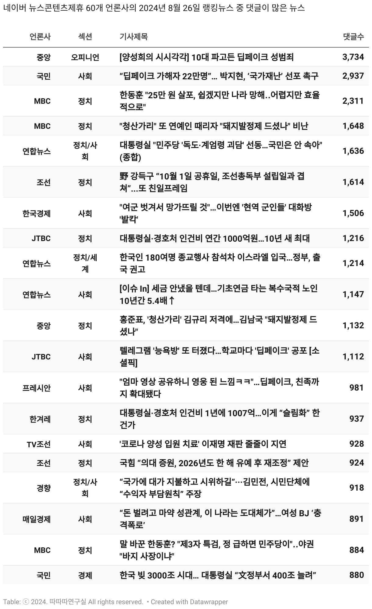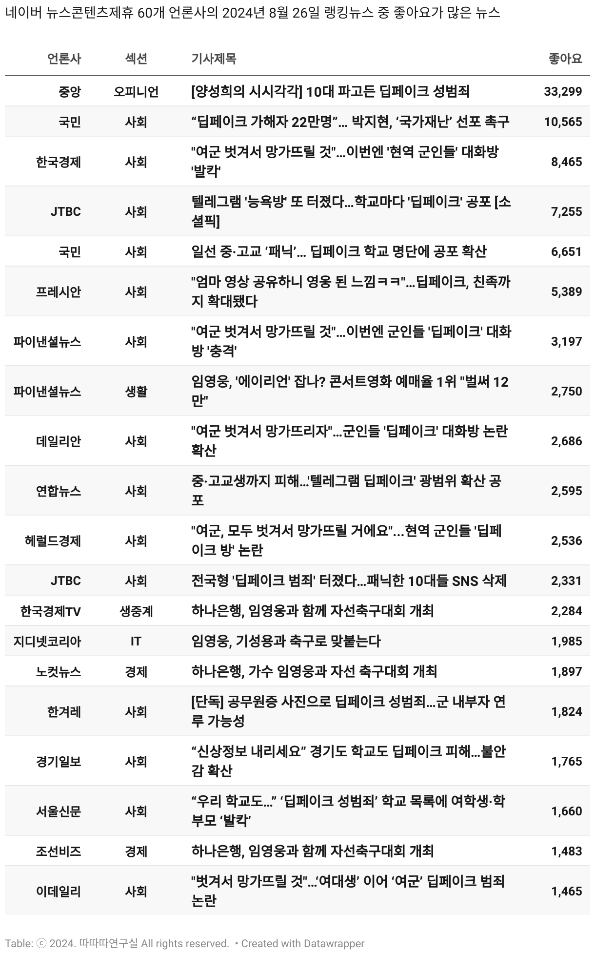 *데이터 수집 기간 : 2024년 6월 10일 *데이터 수집 대상 : 네이버 뉴스콘텐츠제휴 60개 언론사. 종합일간지 10개(경향신문, 국민일보, 동아일보, 문화일보, 서울신문, 세계일보, 조선일보, 중앙일보, 한겨레신문, 한국일보), 방송/통신사 14개(뉴스1, 뉴시스, 연합뉴스, 연합뉴스TV, 채널A, 한국경제TV, JTBC, KBS, MBC, MBN, SBS, SBS BIZ, TV조선, YTN), 경제지 11개(매일경제, 머니투데이, 비즈워치, 서울경제, 아시아경제, 이데일리, 조선비즈, 조세일보, 파이낸셜뉴스, 한국경제(유튜브제외), 헤럴드경제) 인터넷 8개(노컷뉴스, 더팩트, 데일리안, 머니S, 미디어오늘, 아이뉴스24, 오마이뉴스, 프레시안), IT 5개(디지털데일리,디지털타임스, 블로터, 전자신문, 지디넷코리아), 지역 12개(강원도민일보, 강원일보, 경기일보, 국제신문, 대구MBC, 대전일보, 매일신문, 부산일보, 전주MBC, CJB청주방송, JIBS, kbc광주방송)