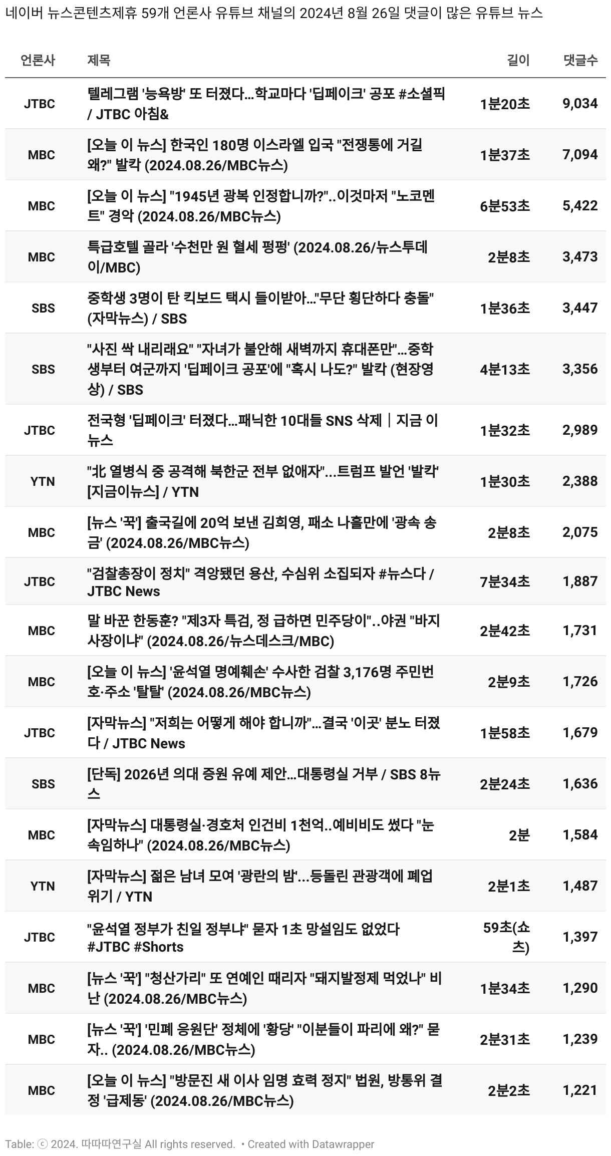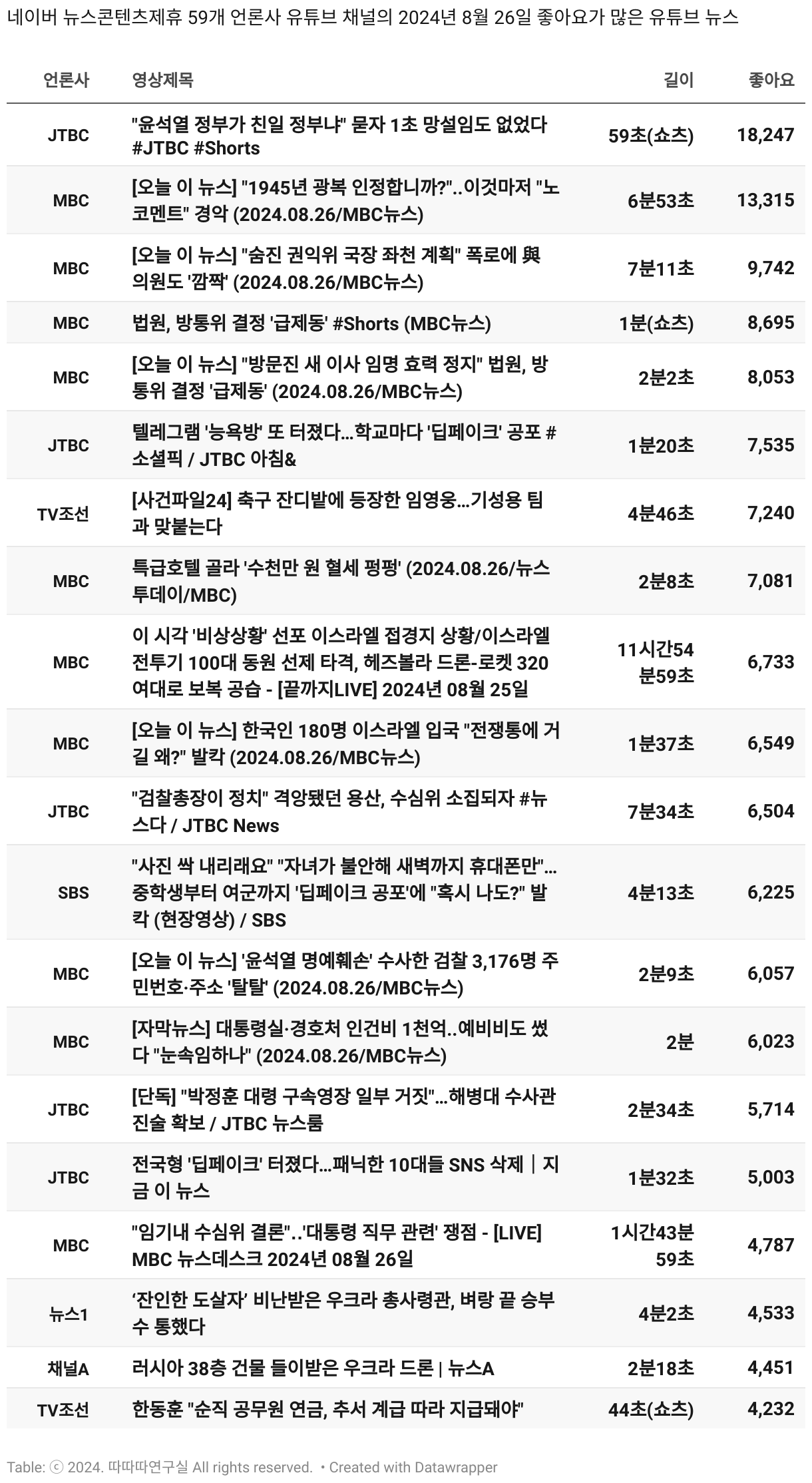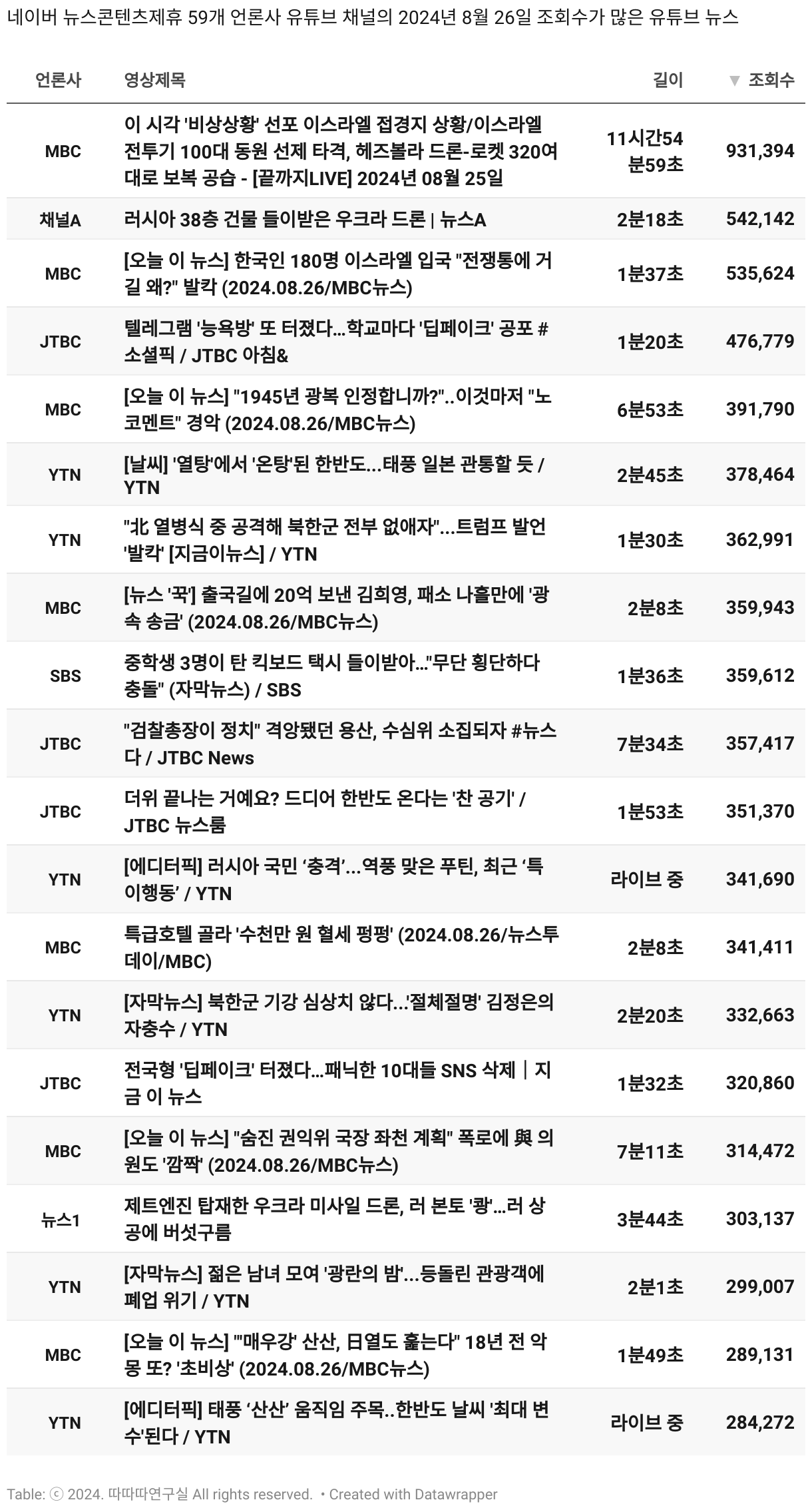 *데이터 수집 기간 : 2024년 6월 10일 *데이터 수집 대상 : 네이버 뉴스콘텐츠제휴 60개 언론사. 종합일간지 10개(경향신문, 국민일보, 동아일보, 문화일보, 서울신문, 세계일보, 조선일보, 중앙일보, 한겨레신문, 한국일보), 방송/통신사 14개(뉴스1, 뉴시스, 연합뉴스, 연합뉴스TV, 채널A, 한국경제TV, JTBC, KBS, MBC, MBN, SBS, SBS BIZ, TV조선, YTN), 경제지 11개(매일경제, 머니투데이, 비즈워치, 서울경제, 아시아경제, 이데일리, 조선비즈, 조세일보, 파이낸셜뉴스, 한국경제(유튜브제외), 헤럴드경제) 인터넷 8개(노컷뉴스, 더팩트, 데일리안, 머니S, 미디어오늘, 아이뉴스24, 오마이뉴스, 프레시안), IT 5개(디지털데일리,디지털타임스, 블로터, 전자신문, 지디넷코리아), 지역 12개(강원도민일보, 강원일보, 경기일보, 국제신문, 대구MBC, 대전일보, 매일신문, 부산일보, 전주MBC, CJB청주방송, JIBS, kbc광주방송)
