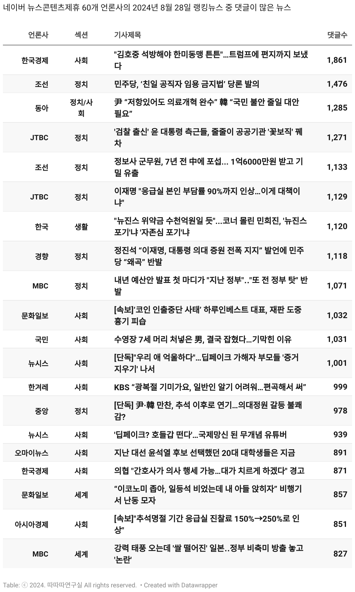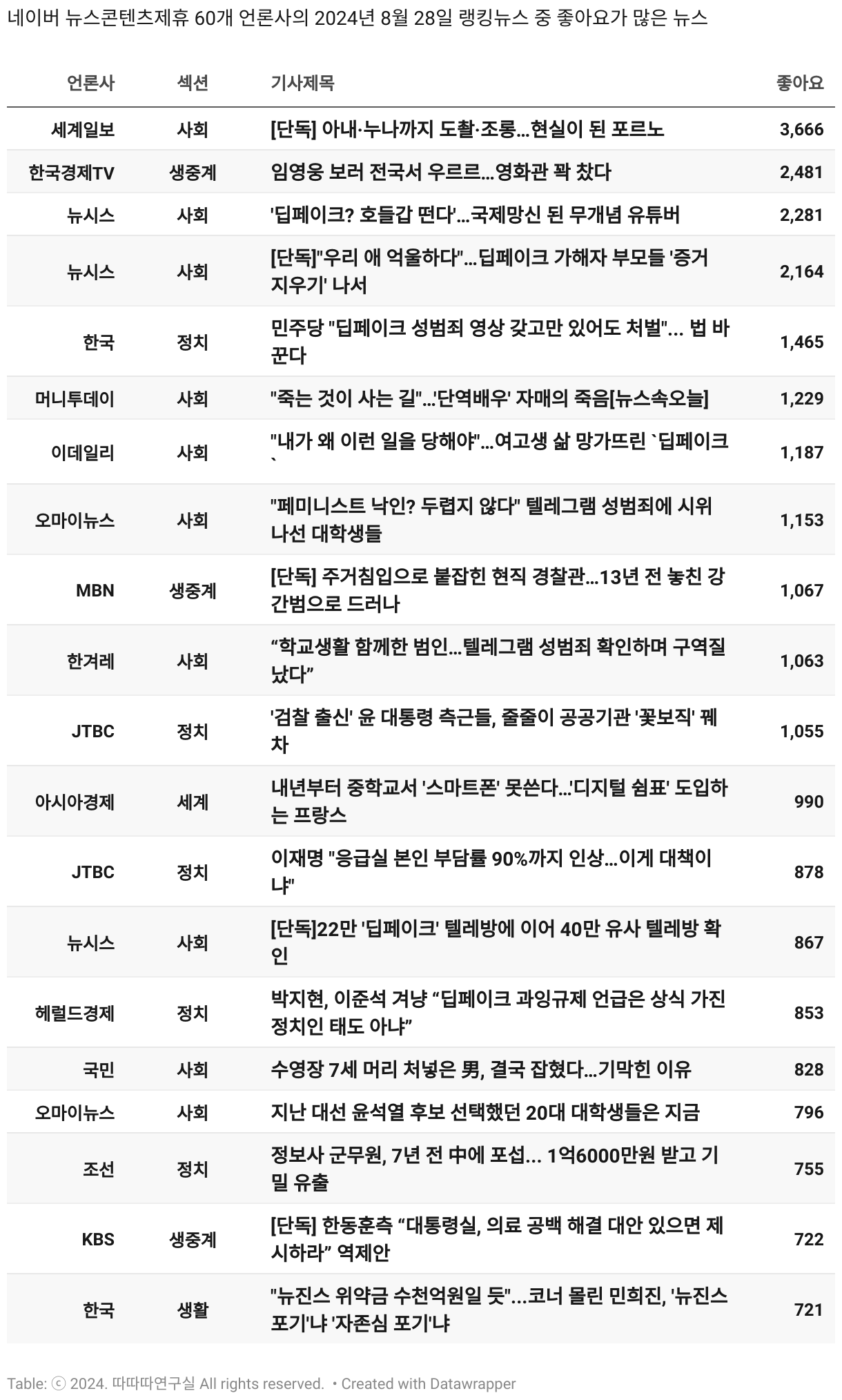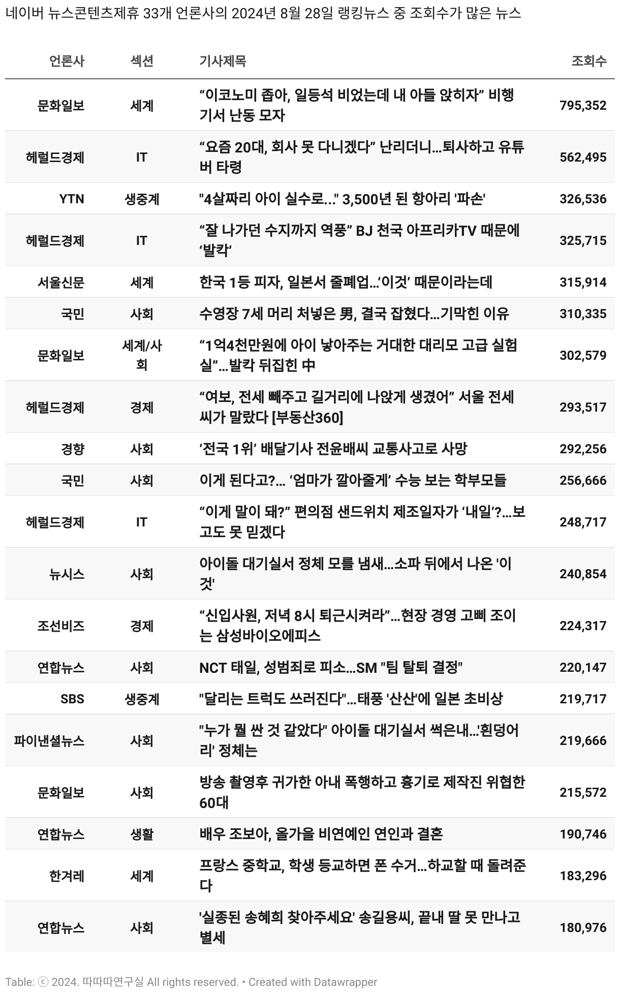 *데이터 수집 기간 : 2024년 6월 10일 *데이터 수집 대상 : 네이버 뉴스콘텐츠제휴 60개 언론사. 종합일간지 10개(경향신문, 국민일보, 동아일보, 문화일보, 서울신문, 세계일보, 조선일보, 중앙일보, 한겨레신문, 한국일보), 방송/통신사 14개(뉴스1, 뉴시스, 연합뉴스, 연합뉴스TV, 채널A, 한국경제TV, JTBC, KBS, MBC, MBN, SBS, SBS BIZ, TV조선, YTN), 경제지 11개(매일경제, 머니투데이, 비즈워치, 서울경제, 아시아경제, 이데일리, 조선비즈, 조세일보, 파이낸셜뉴스, 한국경제(유튜브제외), 헤럴드경제) 인터넷 8개(노컷뉴스, 더팩트, 데일리안, 머니S, 미디어오늘, 아이뉴스24, 오마이뉴스, 프레시안), IT 5개(디지털데일리,디지털타임스, 블로터, 전자신문, 지디넷코리아), 지역 12개(강원도민일보, 강원일보, 경기일보, 국제신문, 대구MBC, 대전일보, 매일신문, 부산일보, 전주MBC, CJB청주방송, JIBS, kbc광주방송)