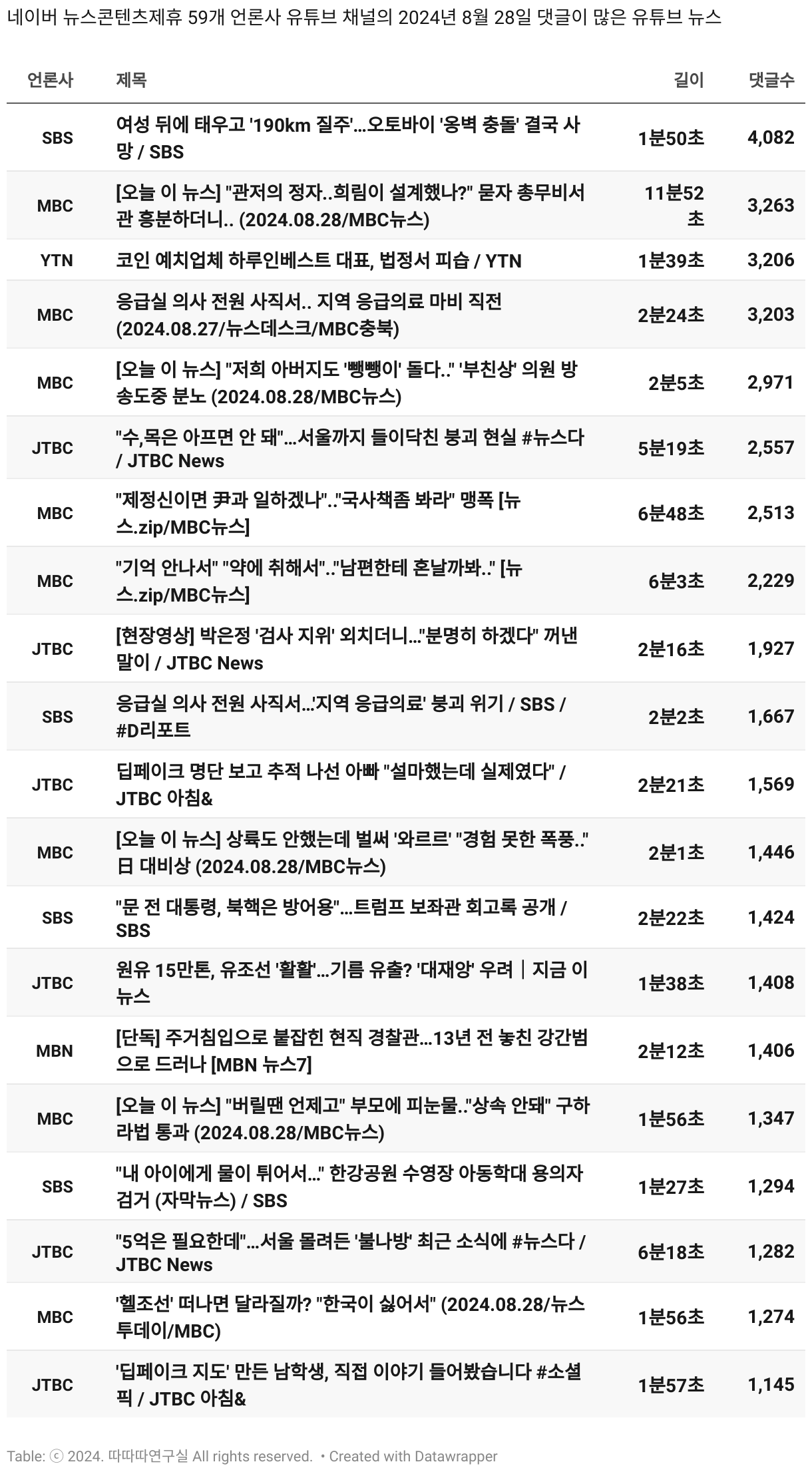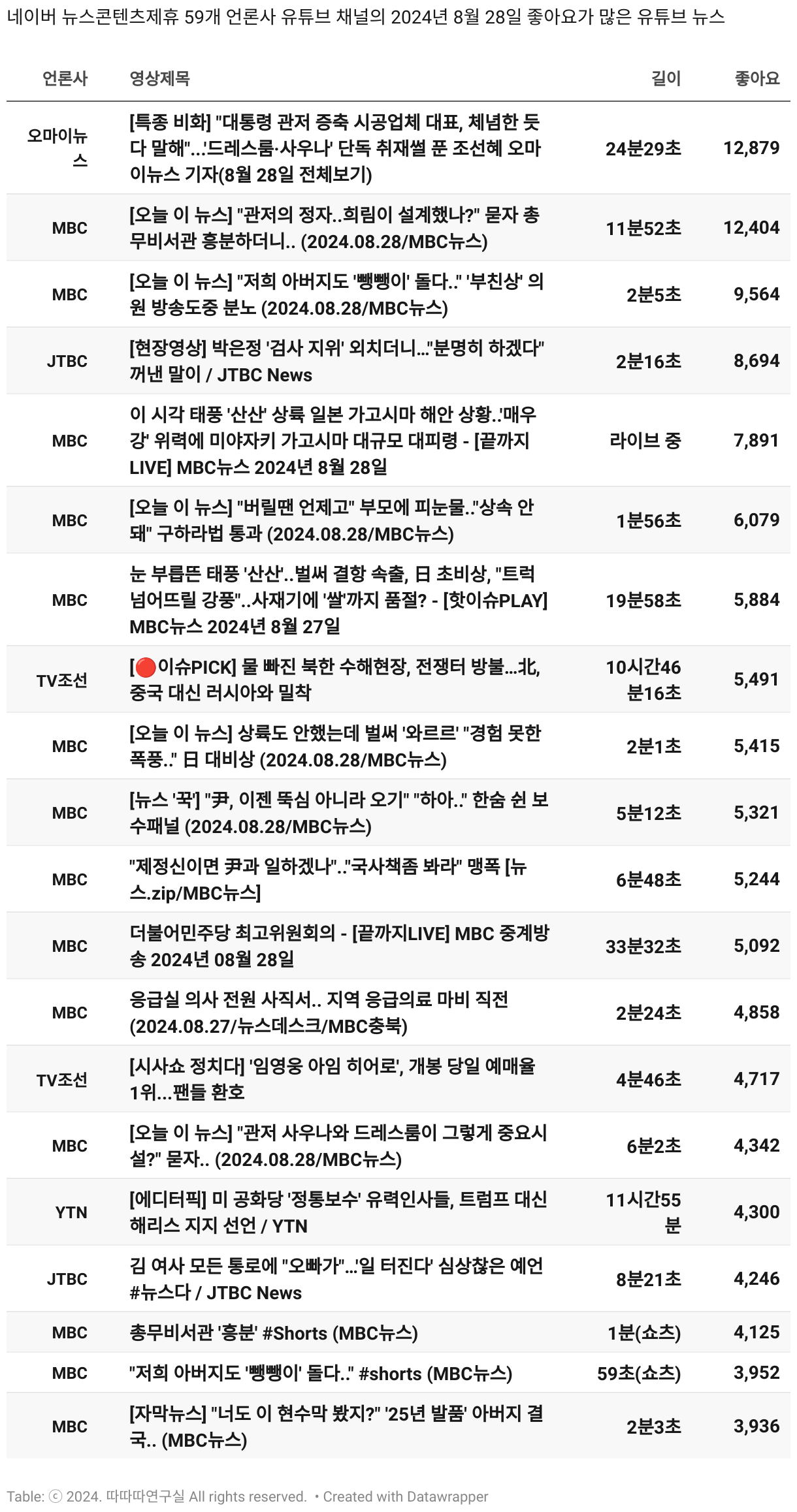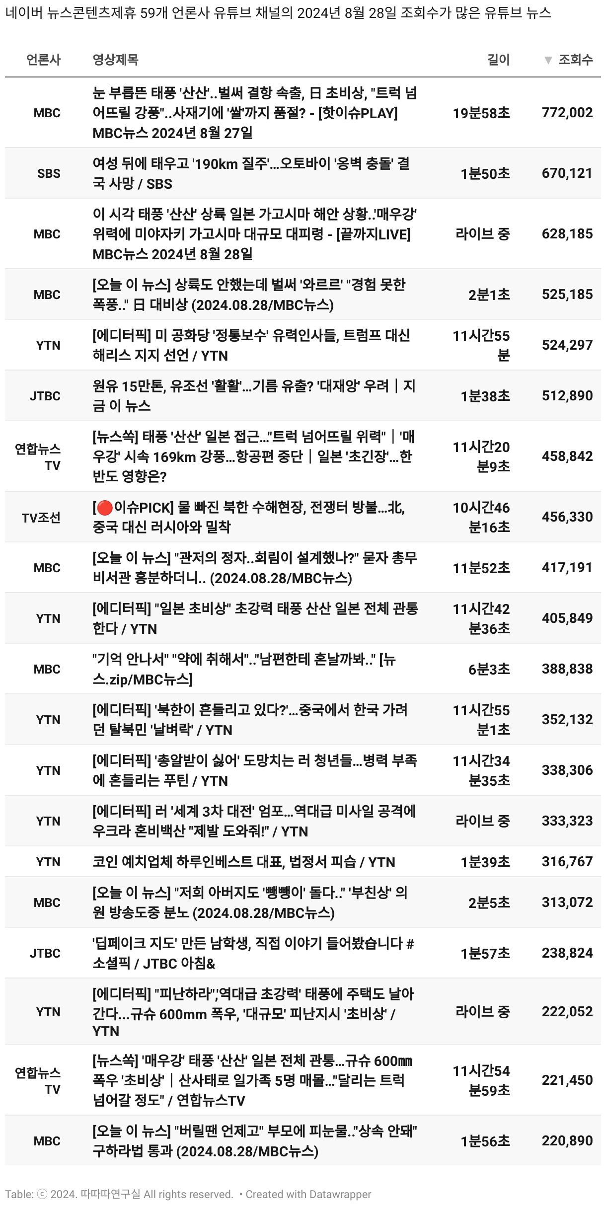 *데이터 수집 기간 : 2024년 6월 10일 *데이터 수집 대상 : 네이버 뉴스콘텐츠제휴 60개 언론사. 종합일간지 10개(경향신문, 국민일보, 동아일보, 문화일보, 서울신문, 세계일보, 조선일보, 중앙일보, 한겨레신문, 한국일보), 방송/통신사 14개(뉴스1, 뉴시스, 연합뉴스, 연합뉴스TV, 채널A, 한국경제TV, JTBC, KBS, MBC, MBN, SBS, SBS BIZ, TV조선, YTN), 경제지 11개(매일경제, 머니투데이, 비즈워치, 서울경제, 아시아경제, 이데일리, 조선비즈, 조세일보, 파이낸셜뉴스, 한국경제(유튜브제외), 헤럴드경제) 인터넷 8개(노컷뉴스, 더팩트, 데일리안, 머니S, 미디어오늘, 아이뉴스24, 오마이뉴스, 프레시안), IT 5개(디지털데일리,디지털타임스, 블로터, 전자신문, 지디넷코리아), 지역 12개(강원도민일보, 강원일보, 경기일보, 국제신문, 대구MBC, 대전일보, 매일신문, 부산일보, 전주MBC, CJB청주방송, JIBS, kbc광주방송)