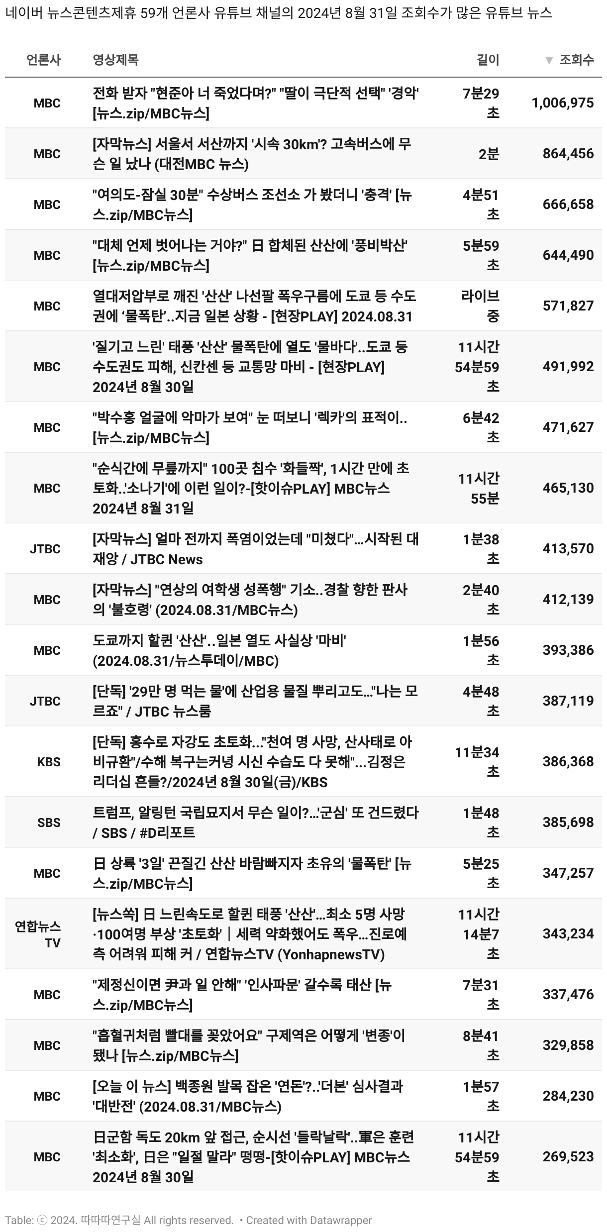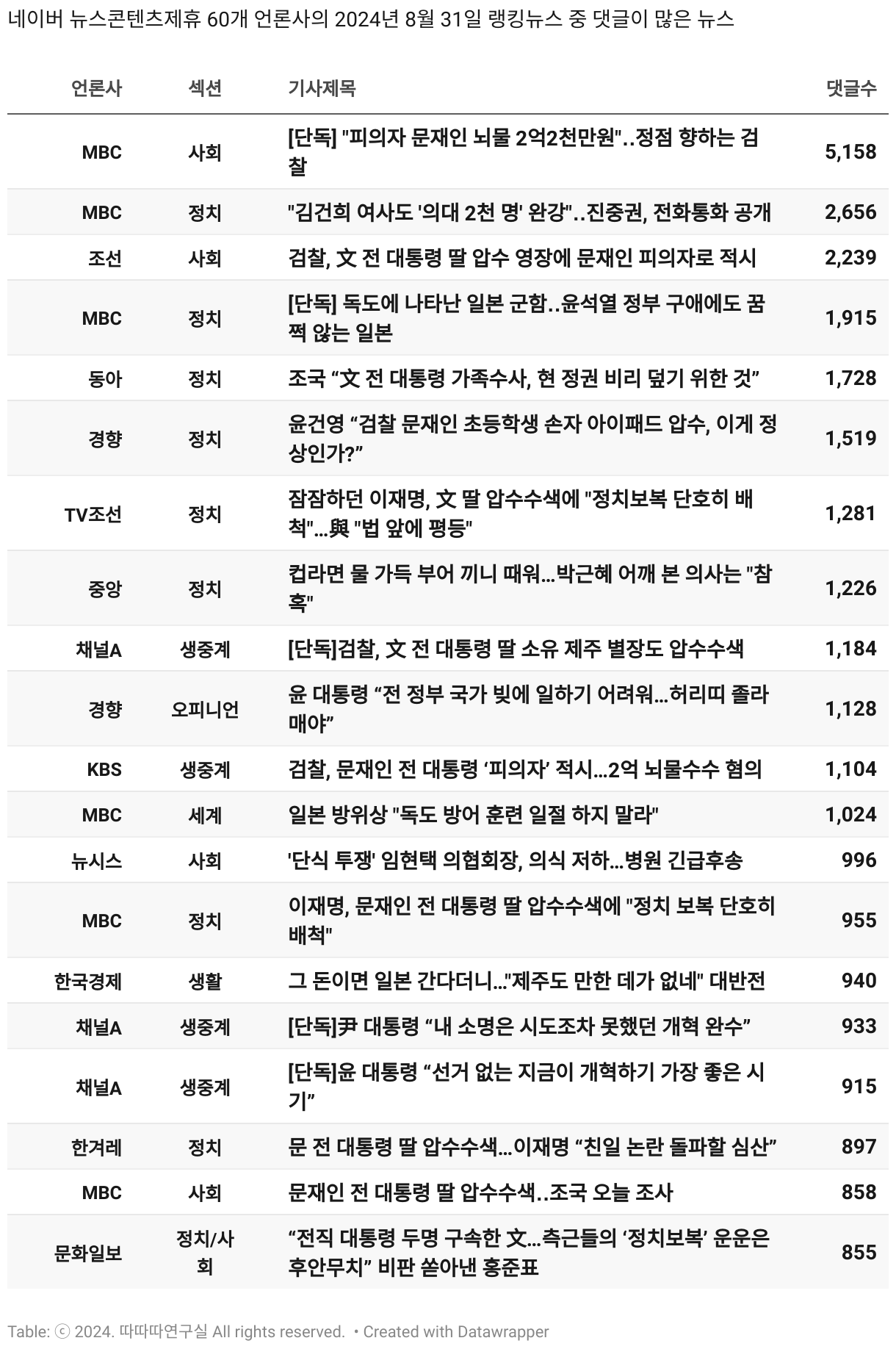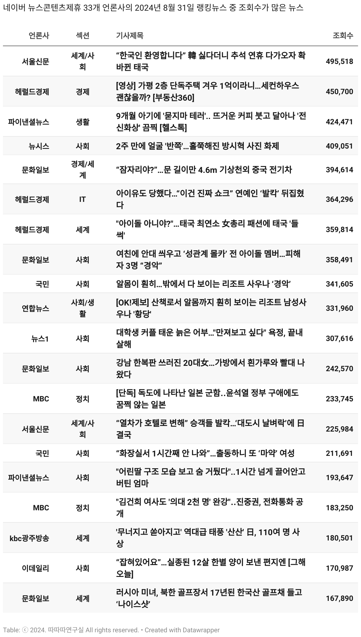 *데이터 수집 기간 : 2024년 6월 10일 *데이터 수집 대상 : 네이버 뉴스콘텐츠제휴 60개 언론사. 종합일간지 10개(경향신문, 국민일보, 동아일보, 문화일보, 서울신문, 세계일보, 조선일보, 중앙일보, 한겨레신문, 한국일보), 방송/통신사 14개(뉴스1, 뉴시스, 연합뉴스, 연합뉴스TV, 채널A, 한국경제TV, JTBC, KBS, MBC, MBN, SBS, SBS BIZ, TV조선, YTN), 경제지 11개(매일경제, 머니투데이, 비즈워치, 서울경제, 아시아경제, 이데일리, 조선비즈, 조세일보, 파이낸셜뉴스, 한국경제(유튜브제외), 헤럴드경제) 인터넷 8개(노컷뉴스, 더팩트, 데일리안, 머니S, 미디어오늘, 아이뉴스24, 오마이뉴스, 프레시안), IT 5개(디지털데일리,디지털타임스, 블로터, 전자신문, 지디넷코리아), 지역 12개(강원도민일보, 강원일보, 경기일보, 국제신문, 대구MBC, 대전일보, 매일신문, 부산일보, 전주MBC, CJB청주방송, JIBS, kbc광주방송)