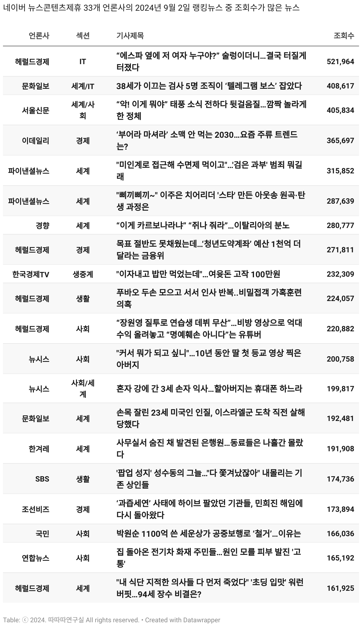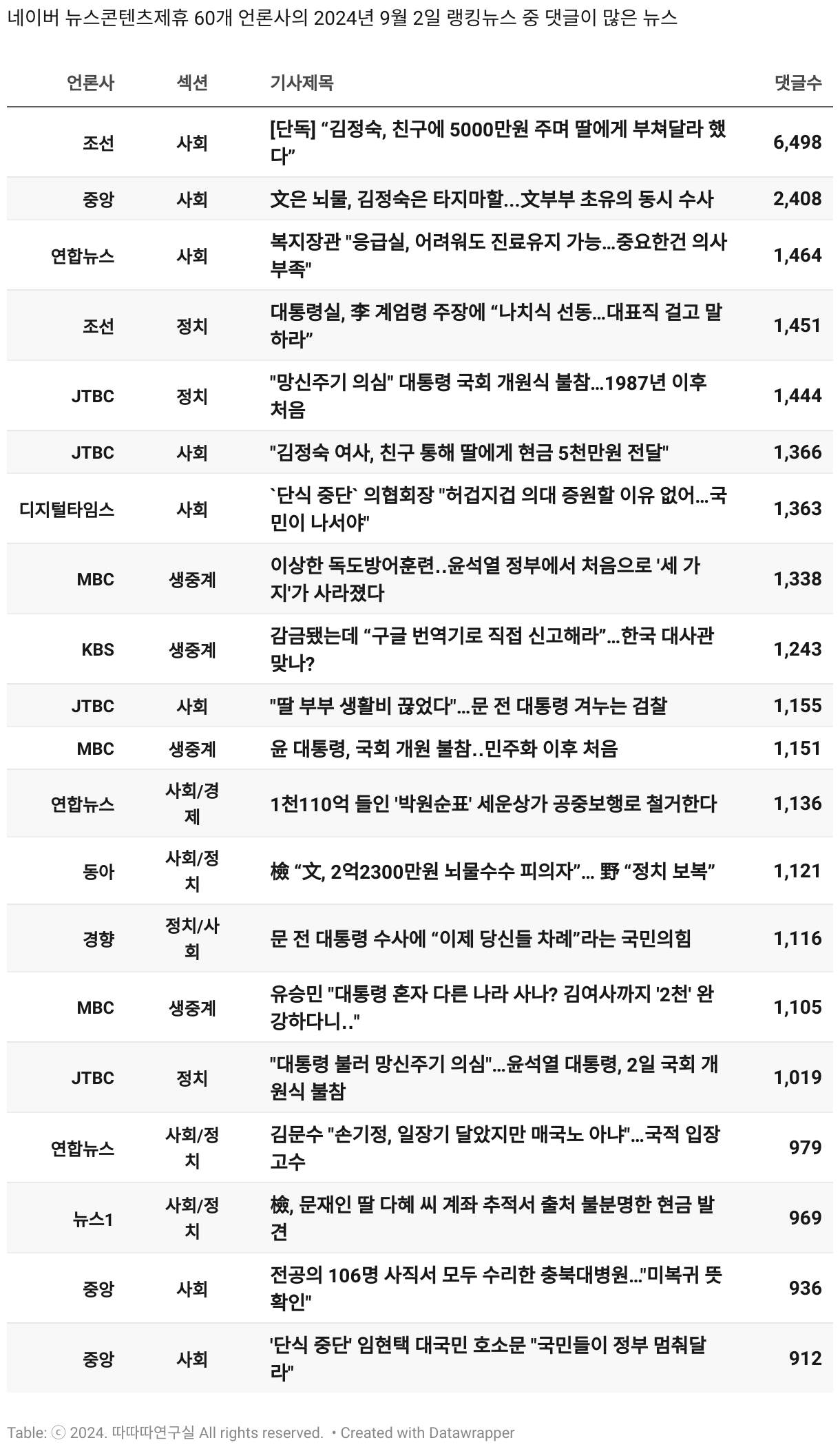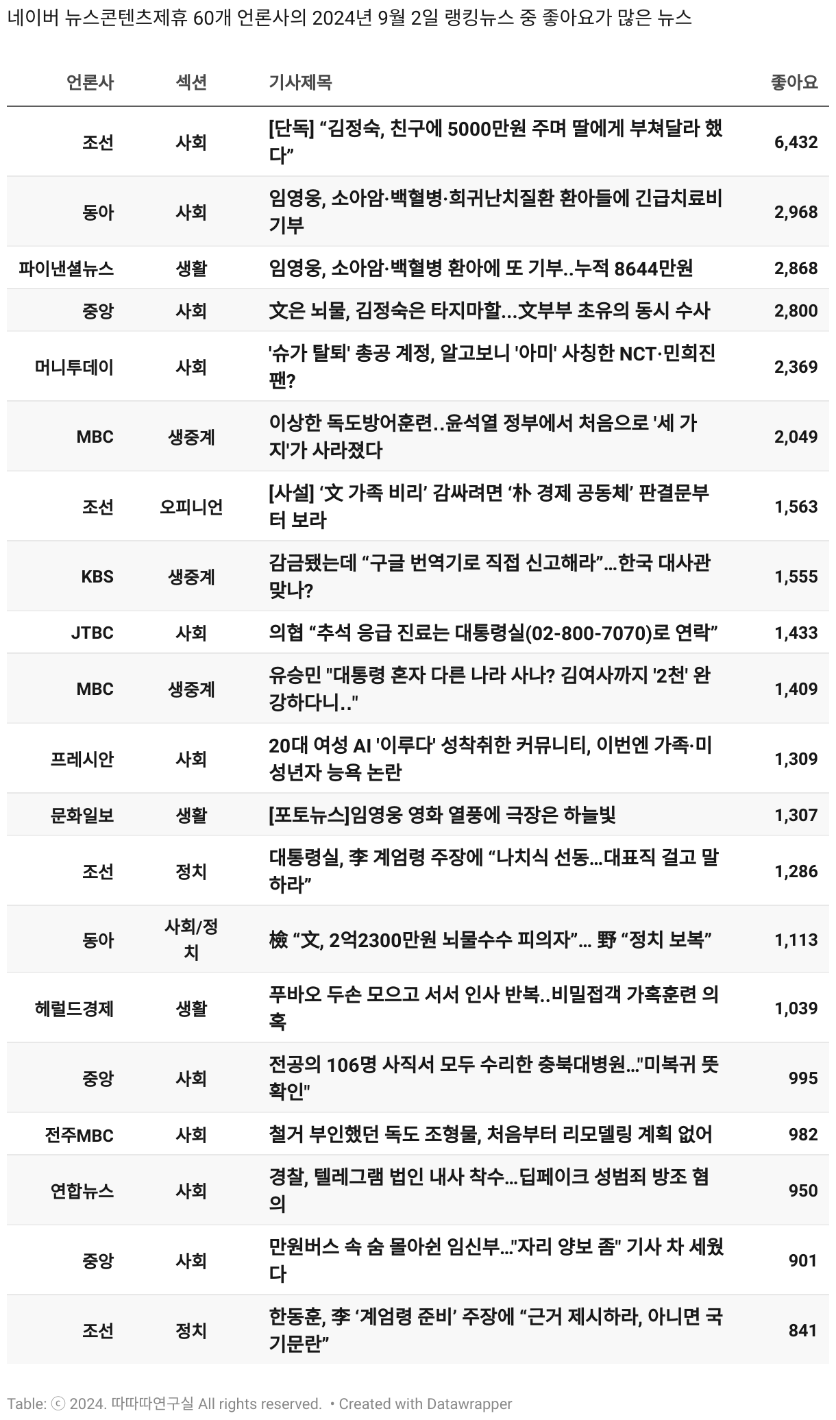 *데이터 수집 기간 : 2024년 6월 10일 *데이터 수집 대상 : 네이버 뉴스콘텐츠제휴 60개 언론사. 종합일간지 10개(경향신문, 국민일보, 동아일보, 문화일보, 서울신문, 세계일보, 조선일보, 중앙일보, 한겨레신문, 한국일보), 방송/통신사 14개(뉴스1, 뉴시스, 연합뉴스, 연합뉴스TV, 채널A, 한국경제TV, JTBC, KBS, MBC, MBN, SBS, SBS BIZ, TV조선, YTN), 경제지 11개(매일경제, 머니투데이, 비즈워치, 서울경제, 아시아경제, 이데일리, 조선비즈, 조세일보, 파이낸셜뉴스, 한국경제(유튜브제외), 헤럴드경제) 인터넷 8개(노컷뉴스, 더팩트, 데일리안, 머니S, 미디어오늘, 아이뉴스24, 오마이뉴스, 프레시안), IT 5개(디지털데일리,디지털타임스, 블로터, 전자신문, 지디넷코리아), 지역 12개(강원도민일보, 강원일보, 경기일보, 국제신문, 대구MBC, 대전일보, 매일신문, 부산일보, 전주MBC, CJB청주방송, JIBS, kbc광주방송)