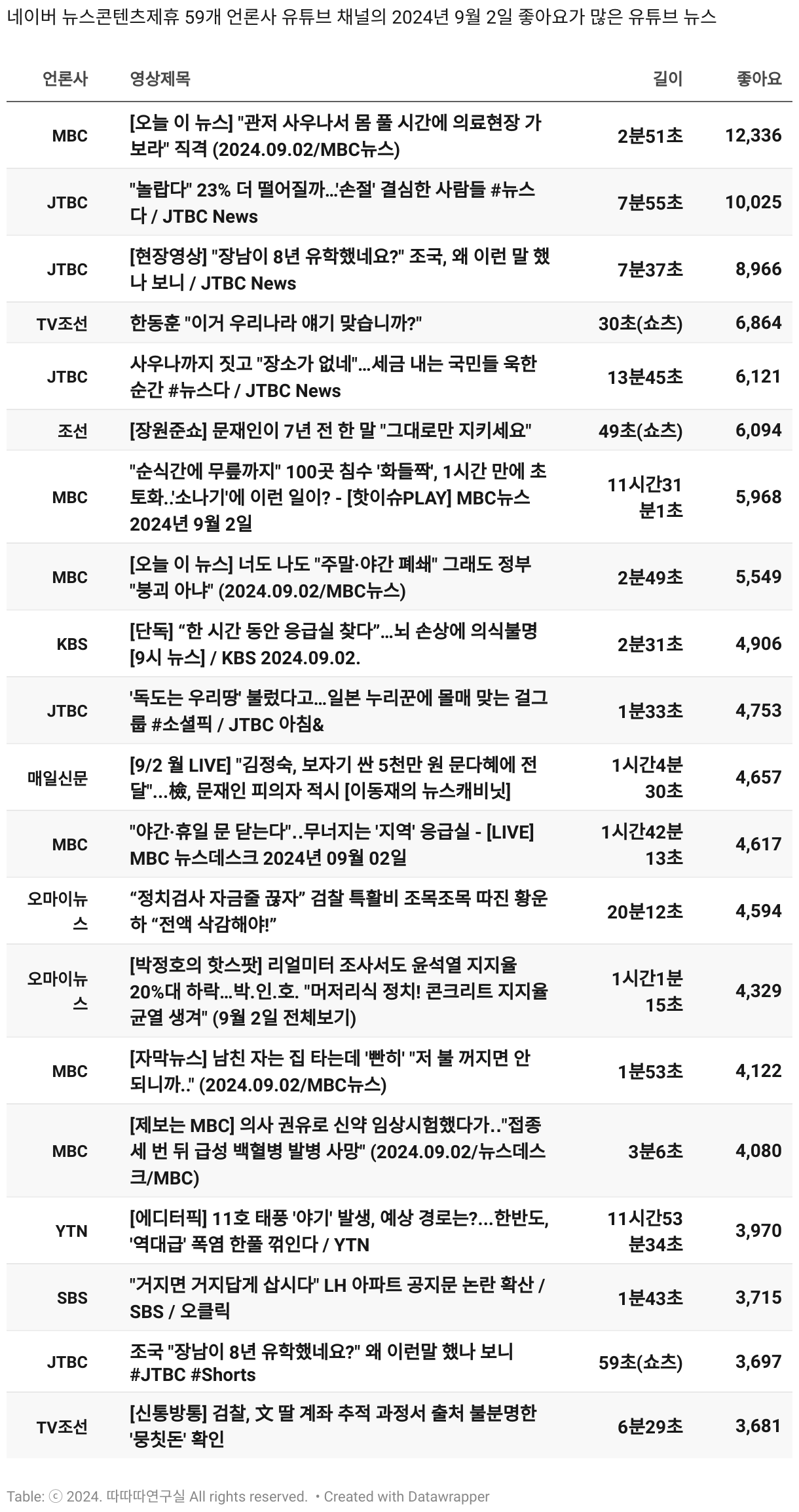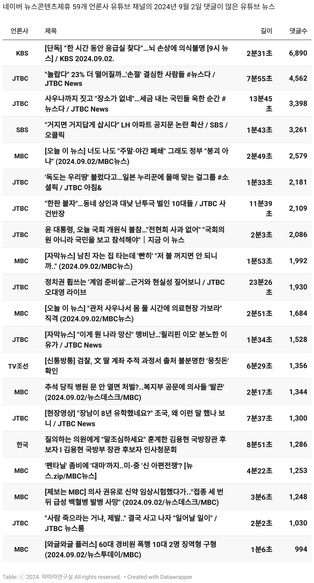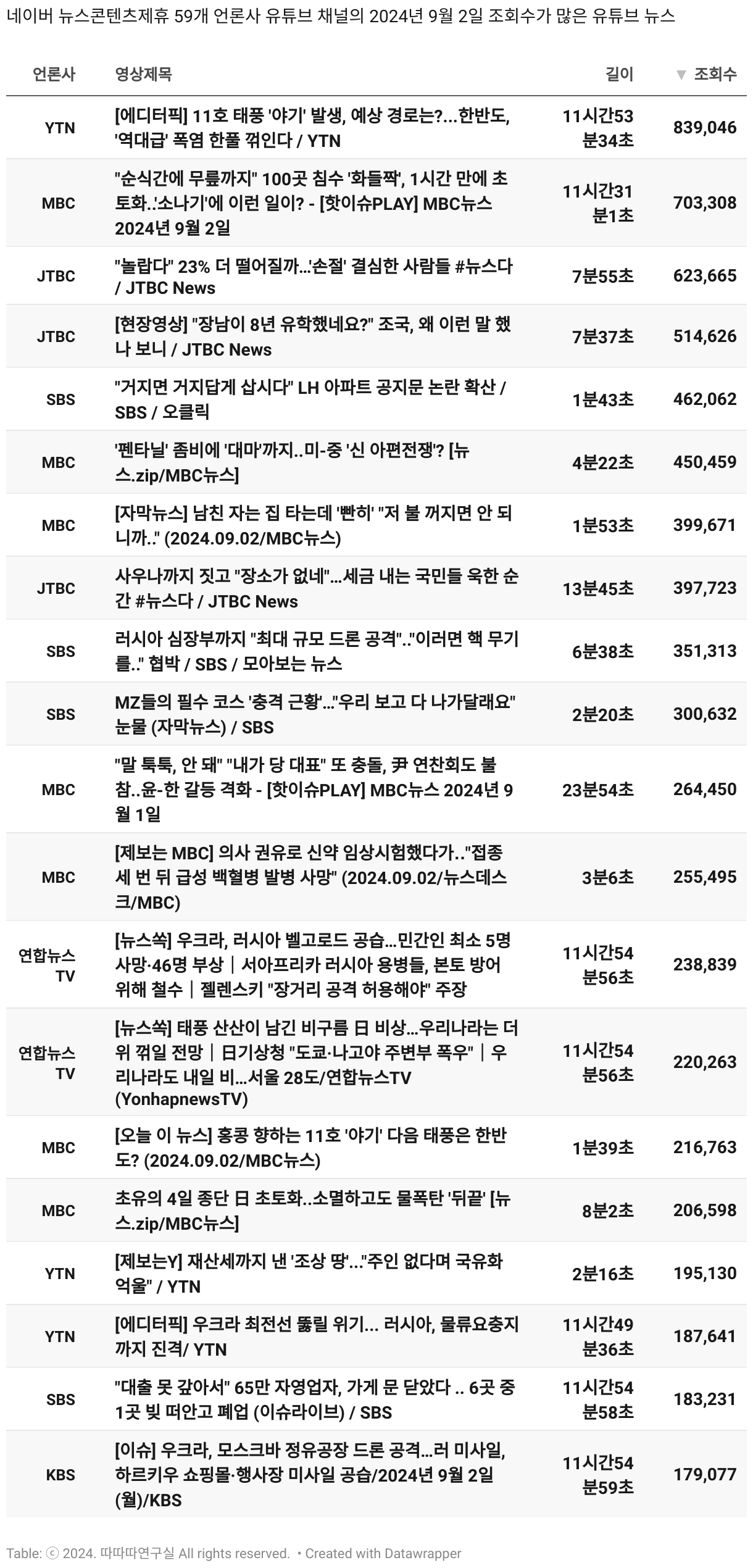 *데이터 수집 기간 : 2024년 6월 10일 *데이터 수집 대상 : 네이버 뉴스콘텐츠제휴 60개 언론사. 종합일간지 10개(경향신문, 국민일보, 동아일보, 문화일보, 서울신문, 세계일보, 조선일보, 중앙일보, 한겨레신문, 한국일보), 방송/통신사 14개(뉴스1, 뉴시스, 연합뉴스, 연합뉴스TV, 채널A, 한국경제TV, JTBC, KBS, MBC, MBN, SBS, SBS BIZ, TV조선, YTN), 경제지 11개(매일경제, 머니투데이, 비즈워치, 서울경제, 아시아경제, 이데일리, 조선비즈, 조세일보, 파이낸셜뉴스, 한국경제(유튜브제외), 헤럴드경제) 인터넷 8개(노컷뉴스, 더팩트, 데일리안, 머니S, 미디어오늘, 아이뉴스24, 오마이뉴스, 프레시안), IT 5개(디지털데일리,디지털타임스, 블로터, 전자신문, 지디넷코리아), 지역 12개(강원도민일보, 강원일보, 경기일보, 국제신문, 대구MBC, 대전일보, 매일신문, 부산일보, 전주MBC, CJB청주방송, JIBS, kbc광주방송)