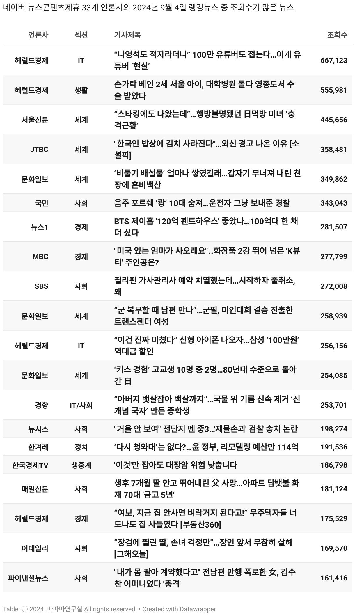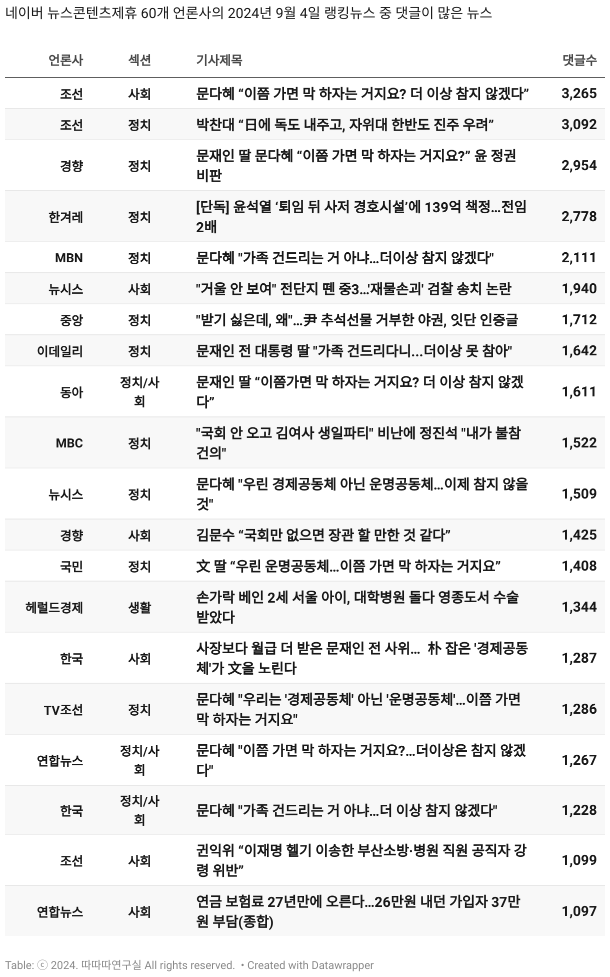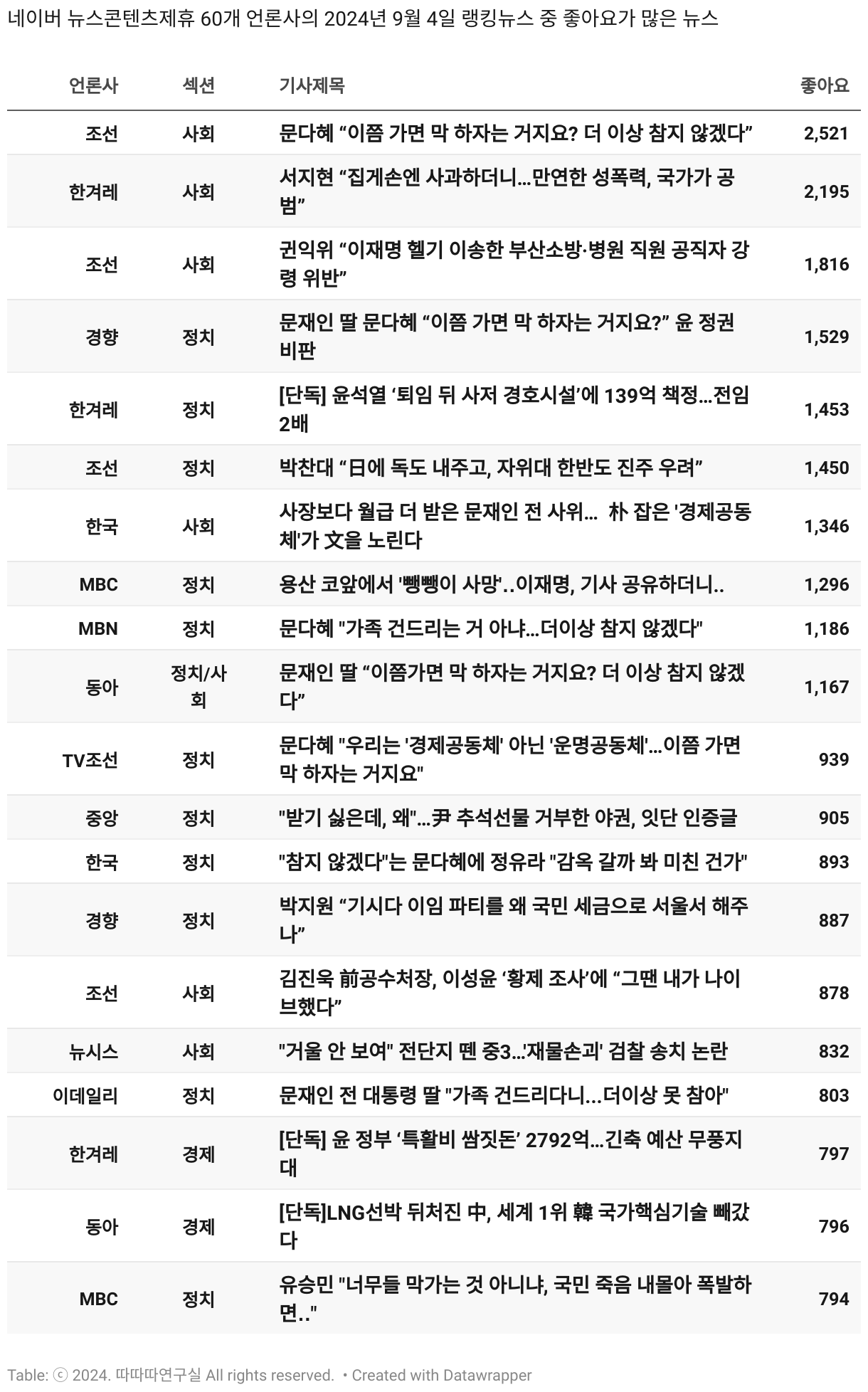 *데이터 수집 기간 : 2024년 6월 10일 *데이터 수집 대상 : 네이버 뉴스콘텐츠제휴 60개 언론사. 종합일간지 10개(경향신문, 국민일보, 동아일보, 문화일보, 서울신문, 세계일보, 조선일보, 중앙일보, 한겨레신문, 한국일보), 방송/통신사 14개(뉴스1, 뉴시스, 연합뉴스, 연합뉴스TV, 채널A, 한국경제TV, JTBC, KBS, MBC, MBN, SBS, SBS BIZ, TV조선, YTN), 경제지 11개(매일경제, 머니투데이, 비즈워치, 서울경제, 아시아경제, 이데일리, 조선비즈, 조세일보, 파이낸셜뉴스, 한국경제(유튜브제외), 헤럴드경제) 인터넷 8개(노컷뉴스, 더팩트, 데일리안, 머니S, 미디어오늘, 아이뉴스24, 오마이뉴스, 프레시안), IT 5개(디지털데일리,디지털타임스, 블로터, 전자신문, 지디넷코리아), 지역 12개(강원도민일보, 강원일보, 경기일보, 국제신문, 대구MBC, 대전일보, 매일신문, 부산일보, 전주MBC, CJB청주방송, JIBS, kbc광주방송)