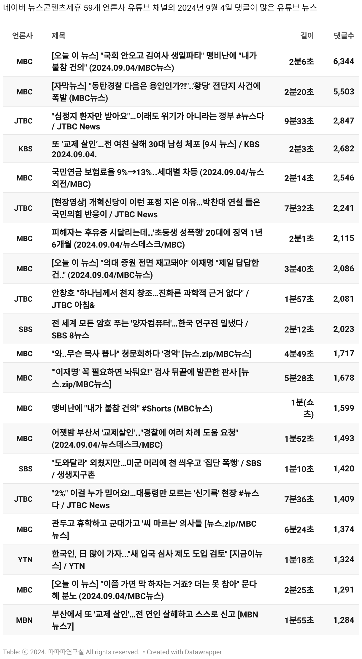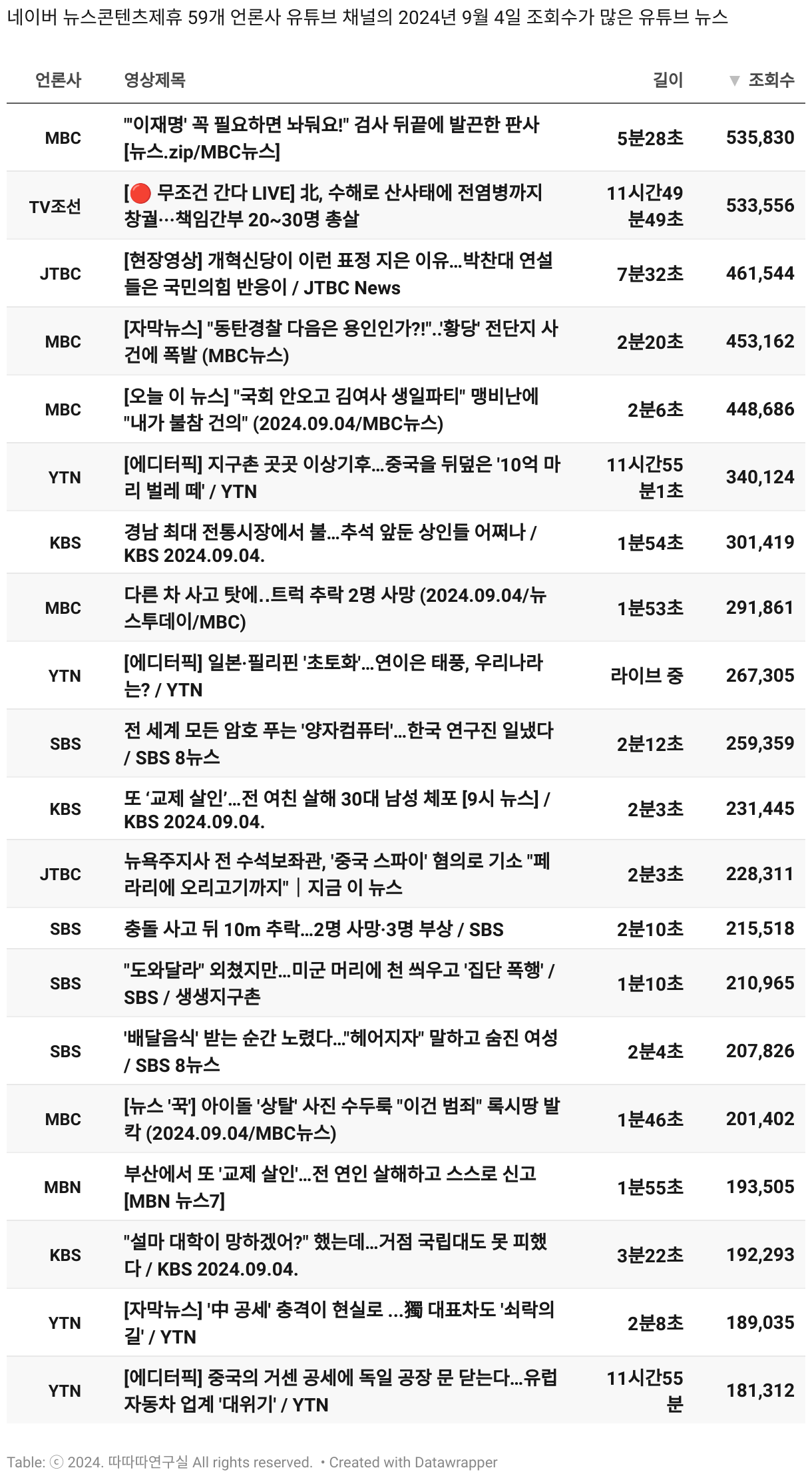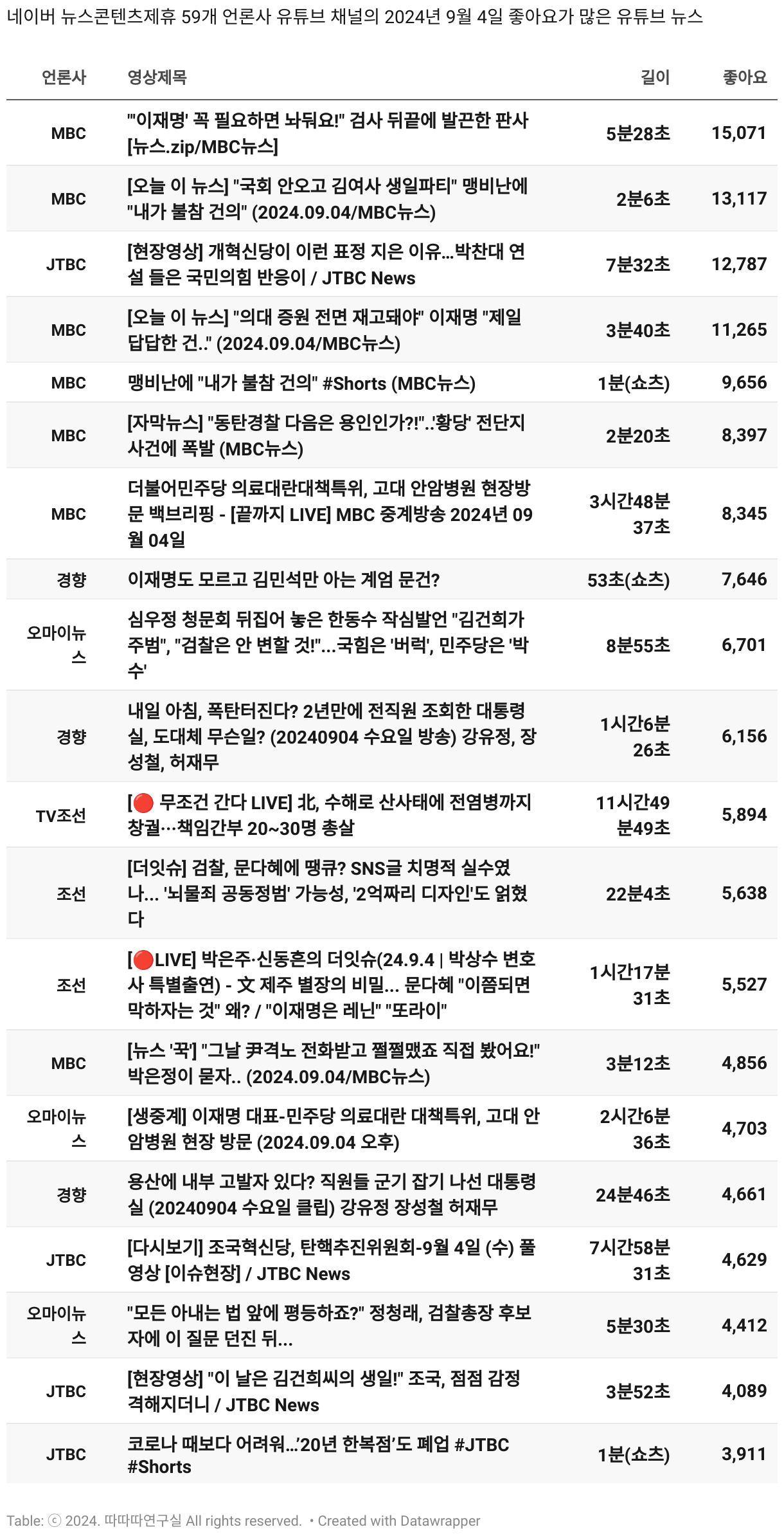 *데이터 수집 기간 : 2024년 6월 10일 *데이터 수집 대상 : 네이버 뉴스콘텐츠제휴 60개 언론사. 종합일간지 10개(경향신문, 국민일보, 동아일보, 문화일보, 서울신문, 세계일보, 조선일보, 중앙일보, 한겨레신문, 한국일보), 방송/통신사 14개(뉴스1, 뉴시스, 연합뉴스, 연합뉴스TV, 채널A, 한국경제TV, JTBC, KBS, MBC, MBN, SBS, SBS BIZ, TV조선, YTN), 경제지 11개(매일경제, 머니투데이, 비즈워치, 서울경제, 아시아경제, 이데일리, 조선비즈, 조세일보, 파이낸셜뉴스, 한국경제(유튜브제외), 헤럴드경제) 인터넷 8개(노컷뉴스, 더팩트, 데일리안, 머니S, 미디어오늘, 아이뉴스24, 오마이뉴스, 프레시안), IT 5개(디지털데일리,디지털타임스, 블로터, 전자신문, 지디넷코리아), 지역 12개(강원도민일보, 강원일보, 경기일보, 국제신문, 대구MBC, 대전일보, 매일신문, 부산일보, 전주MBC, CJB청주방송, JIBS, kbc광주방송)