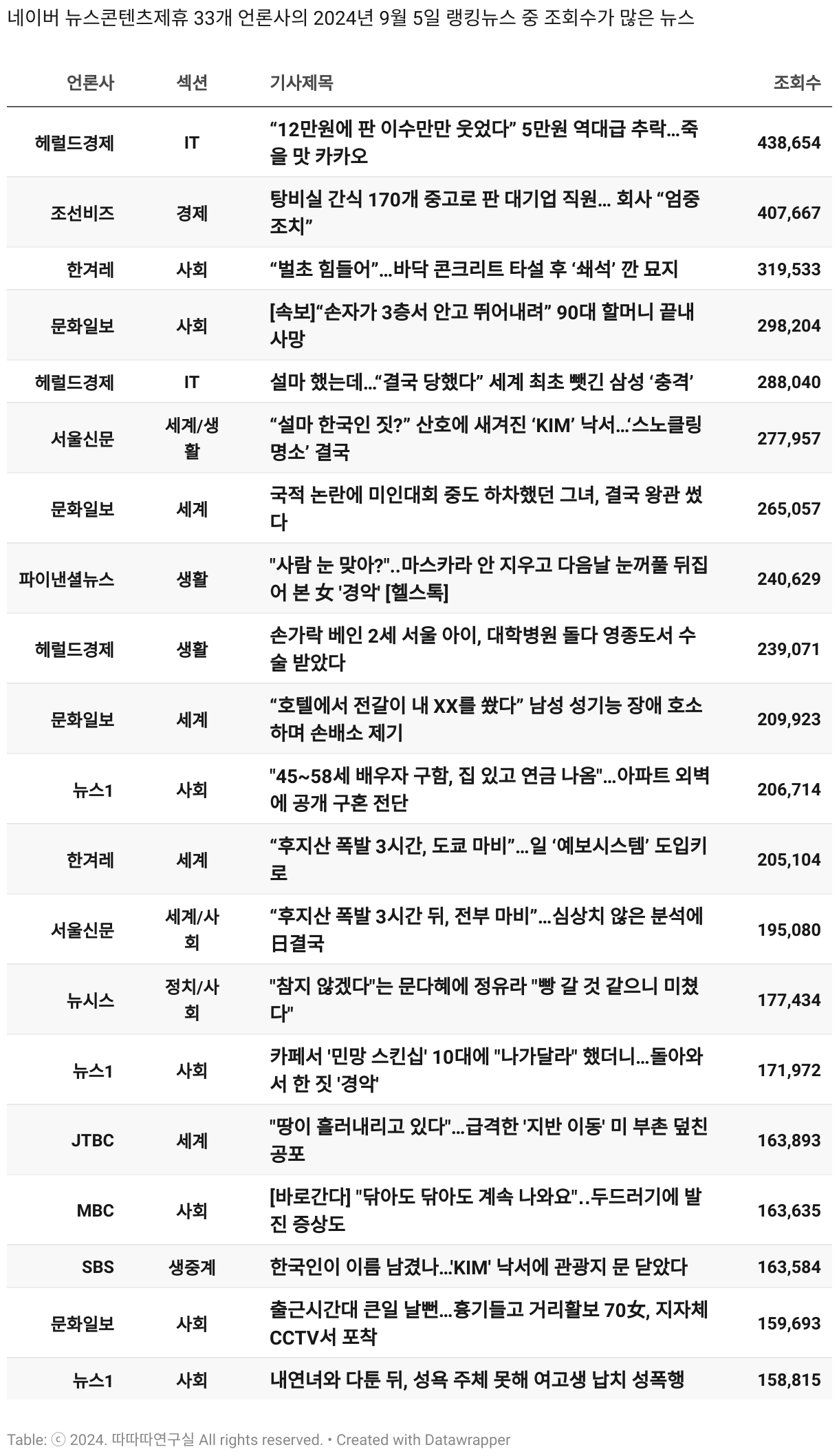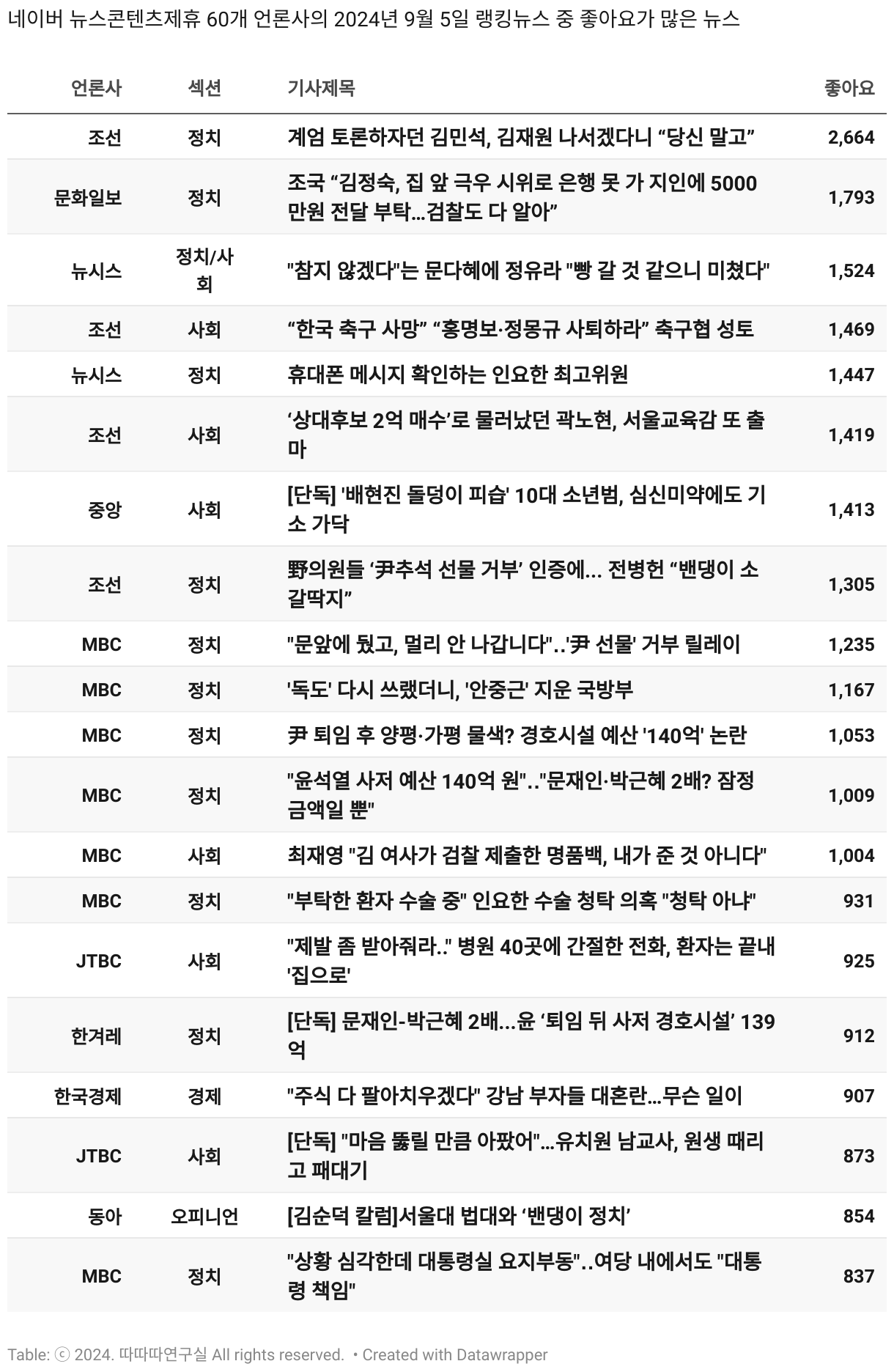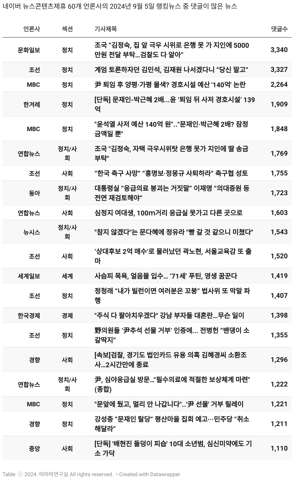 *데이터 수집 기간 : 2024년 6월 10일 *데이터 수집 대상 : 네이버 뉴스콘텐츠제휴 60개 언론사. 종합일간지 10개(경향신문, 국민일보, 동아일보, 문화일보, 서울신문, 세계일보, 조선일보, 중앙일보, 한겨레신문, 한국일보), 방송/통신사 14개(뉴스1, 뉴시스, 연합뉴스, 연합뉴스TV, 채널A, 한국경제TV, JTBC, KBS, MBC, MBN, SBS, SBS BIZ, TV조선, YTN), 경제지 11개(매일경제, 머니투데이, 비즈워치, 서울경제, 아시아경제, 이데일리, 조선비즈, 조세일보, 파이낸셜뉴스, 한국경제(유튜브제외), 헤럴드경제) 인터넷 8개(노컷뉴스, 더팩트, 데일리안, 머니S, 미디어오늘, 아이뉴스24, 오마이뉴스, 프레시안), IT 5개(디지털데일리,디지털타임스, 블로터, 전자신문, 지디넷코리아), 지역 12개(강원도민일보, 강원일보, 경기일보, 국제신문, 대구MBC, 대전일보, 매일신문, 부산일보, 전주MBC, CJB청주방송, JIBS, kbc광주방송)
