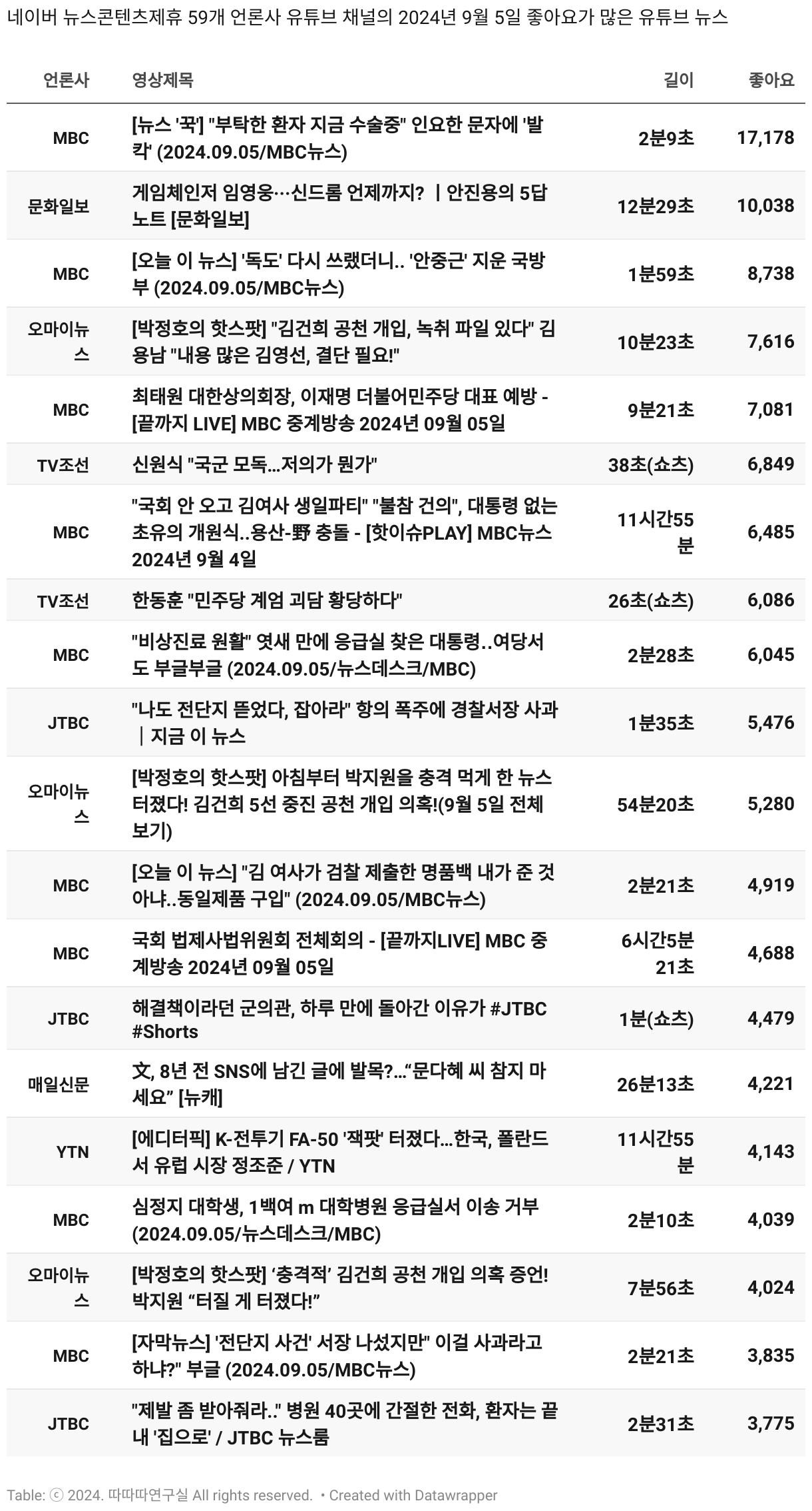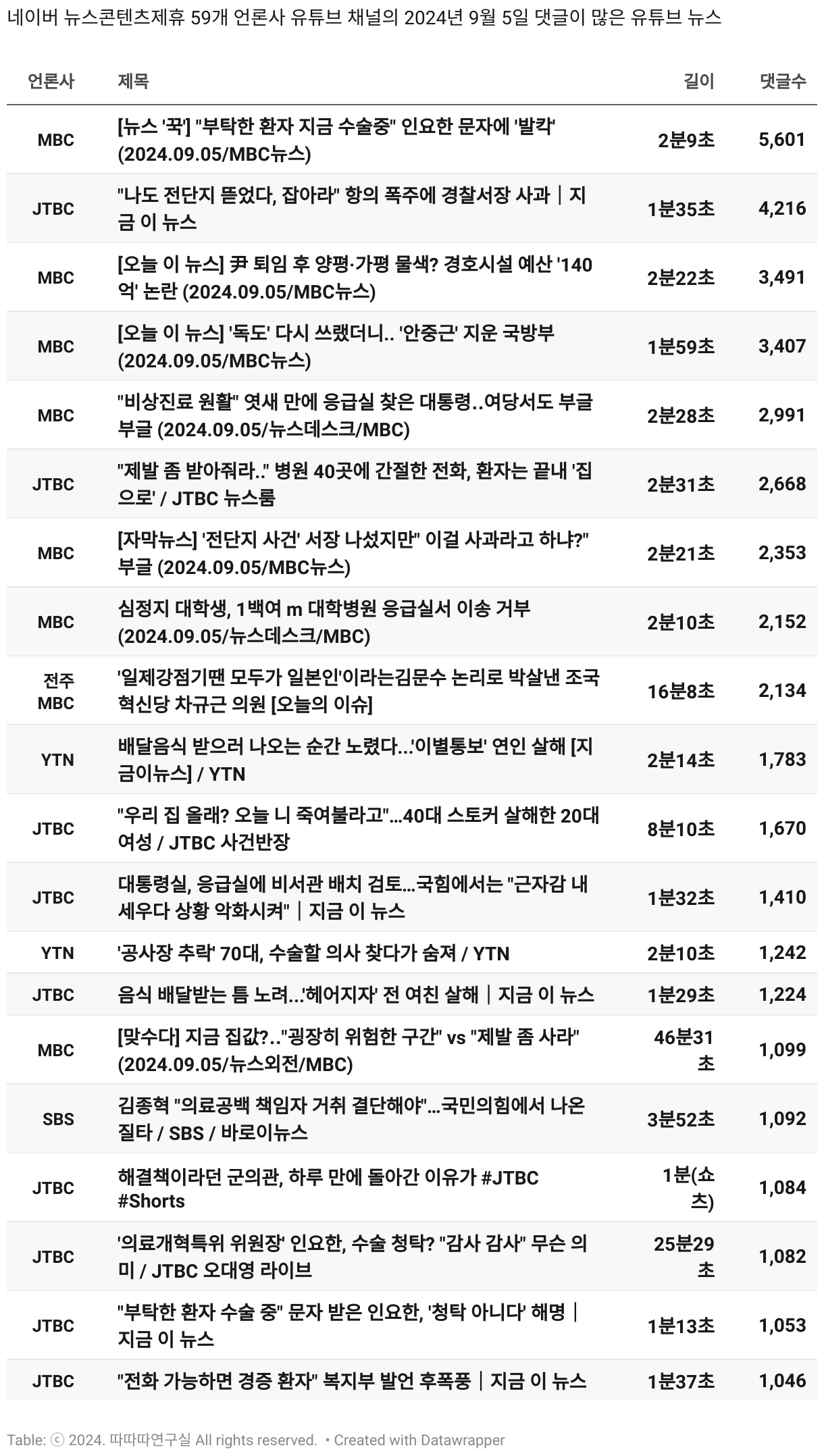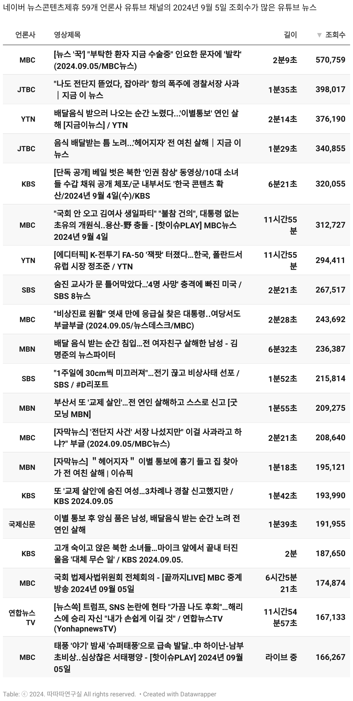 *데이터 수집 기간 : 2024년 6월 10일 *데이터 수집 대상 : 네이버 뉴스콘텐츠제휴 60개 언론사. 종합일간지 10개(경향신문, 국민일보, 동아일보, 문화일보, 서울신문, 세계일보, 조선일보, 중앙일보, 한겨레신문, 한국일보), 방송/통신사 14개(뉴스1, 뉴시스, 연합뉴스, 연합뉴스TV, 채널A, 한국경제TV, JTBC, KBS, MBC, MBN, SBS, SBS BIZ, TV조선, YTN), 경제지 11개(매일경제, 머니투데이, 비즈워치, 서울경제, 아시아경제, 이데일리, 조선비즈, 조세일보, 파이낸셜뉴스, 한국경제(유튜브제외), 헤럴드경제) 인터넷 8개(노컷뉴스, 더팩트, 데일리안, 머니S, 미디어오늘, 아이뉴스24, 오마이뉴스, 프레시안), IT 5개(디지털데일리,디지털타임스, 블로터, 전자신문, 지디넷코리아), 지역 12개(강원도민일보, 강원일보, 경기일보, 국제신문, 대구MBC, 대전일보, 매일신문, 부산일보, 전주MBC, CJB청주방송, JIBS, kbc광주방송)