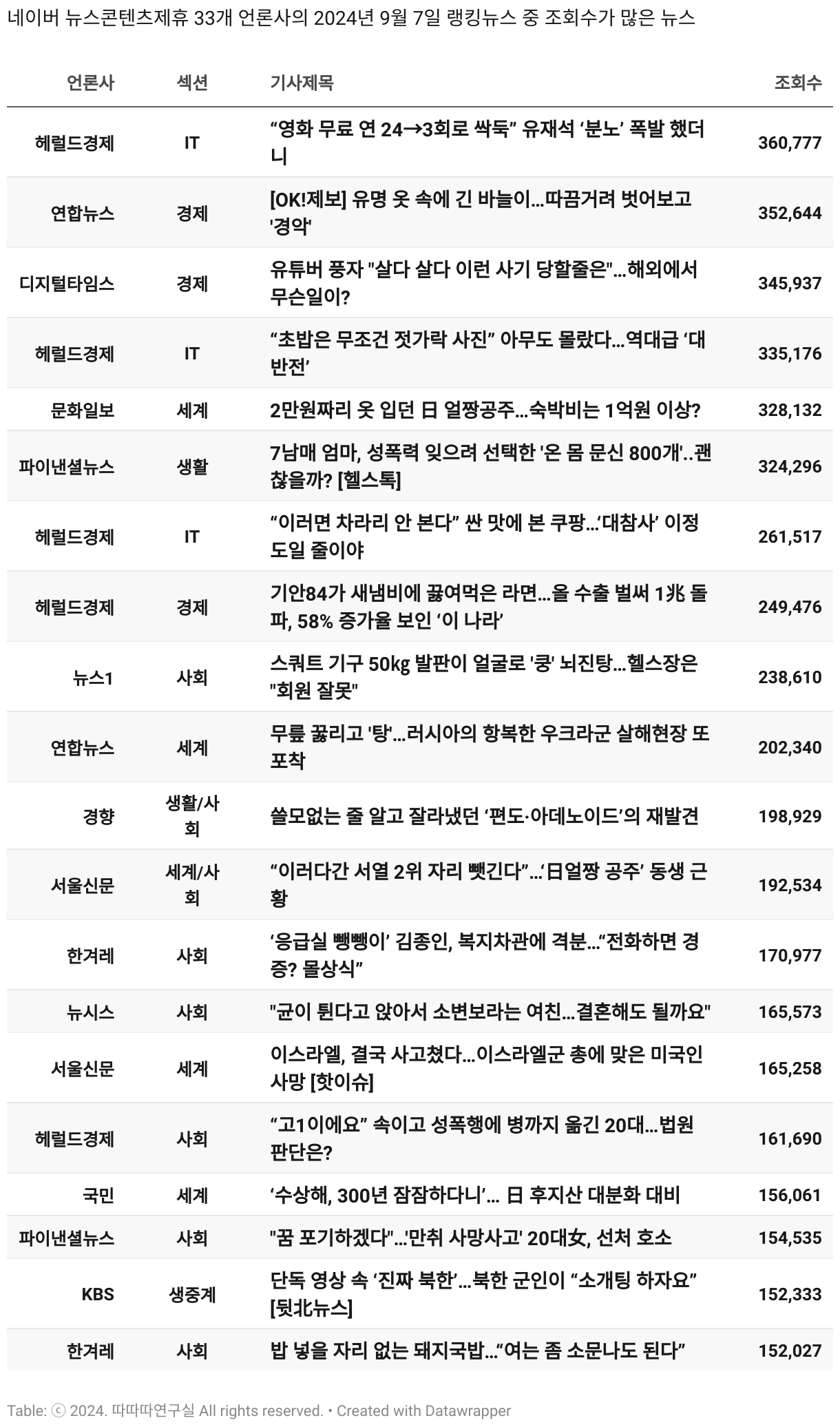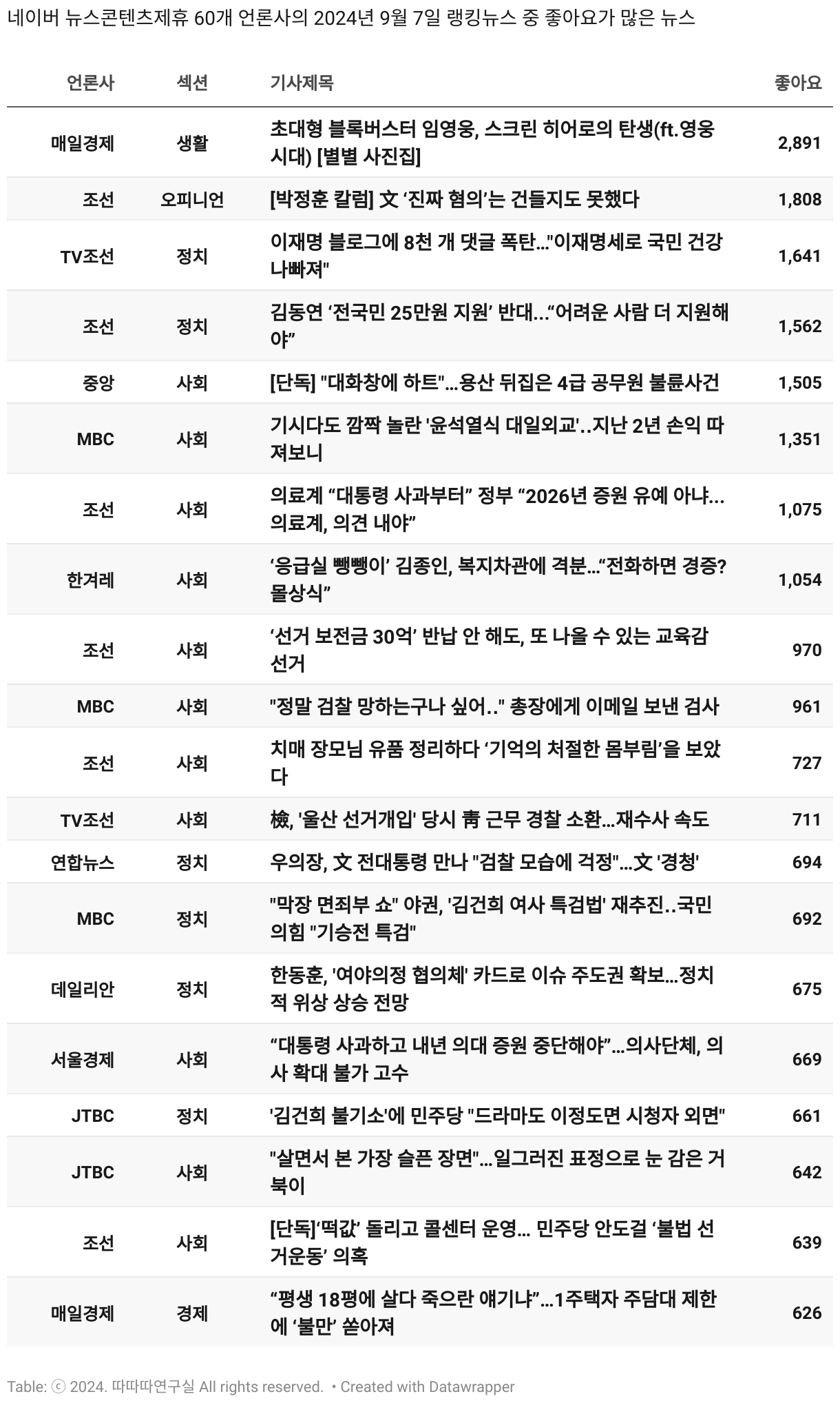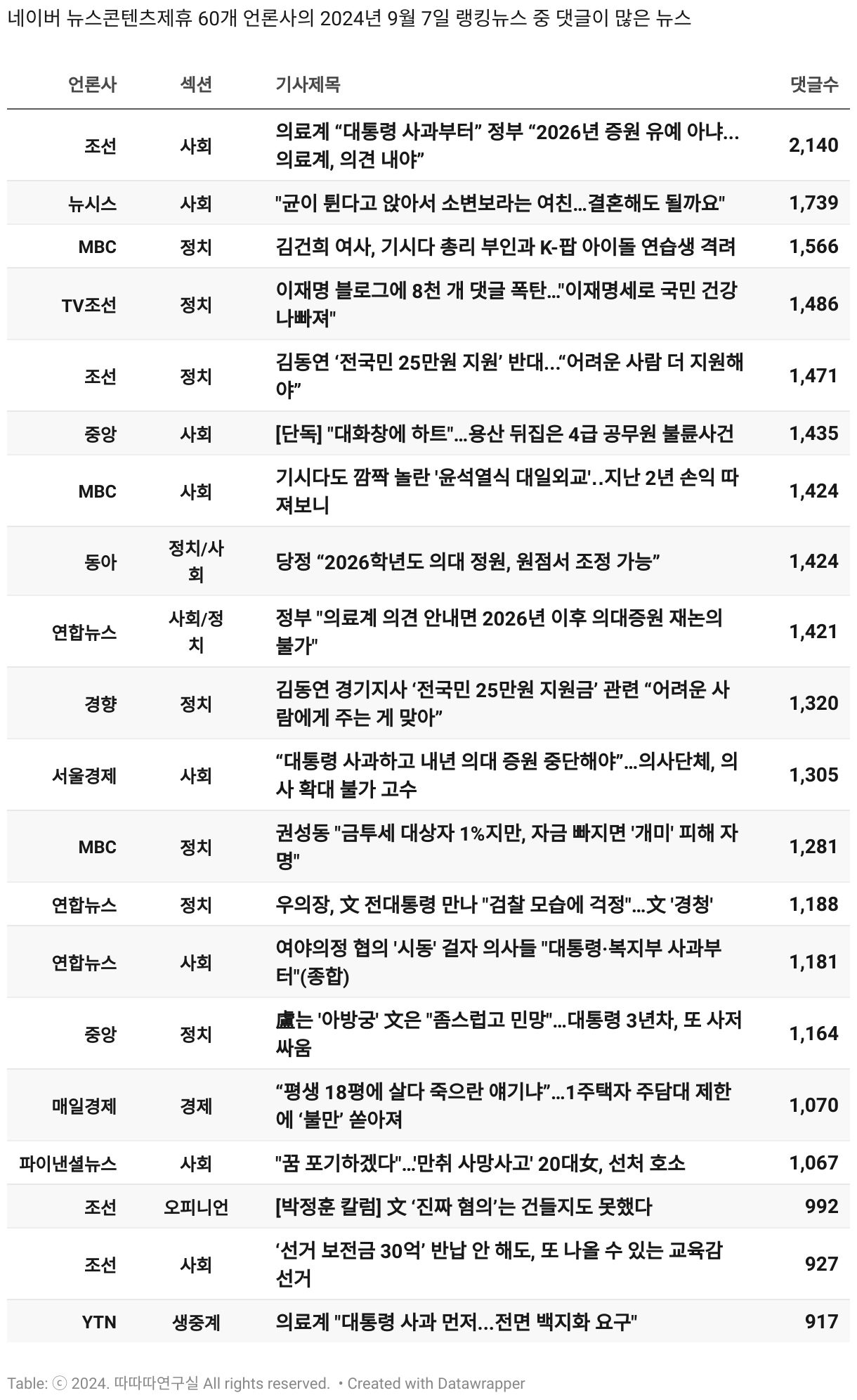 *데이터 수집 기간 : 2024년 6월 10일 *데이터 수집 대상 : 네이버 뉴스콘텐츠제휴 60개 언론사. 종합일간지 10개(경향신문, 국민일보, 동아일보, 문화일보, 서울신문, 세계일보, 조선일보, 중앙일보, 한겨레신문, 한국일보), 방송/통신사 14개(뉴스1, 뉴시스, 연합뉴스, 연합뉴스TV, 채널A, 한국경제TV, JTBC, KBS, MBC, MBN, SBS, SBS BIZ, TV조선, YTN), 경제지 11개(매일경제, 머니투데이, 비즈워치, 서울경제, 아시아경제, 이데일리, 조선비즈, 조세일보, 파이낸셜뉴스, 한국경제(유튜브제외), 헤럴드경제) 인터넷 8개(노컷뉴스, 더팩트, 데일리안, 머니S, 미디어오늘, 아이뉴스24, 오마이뉴스, 프레시안), IT 5개(디지털데일리,디지털타임스, 블로터, 전자신문, 지디넷코리아), 지역 12개(강원도민일보, 강원일보, 경기일보, 국제신문, 대구MBC, 대전일보, 매일신문, 부산일보, 전주MBC, CJB청주방송, JIBS, kbc광주방송)