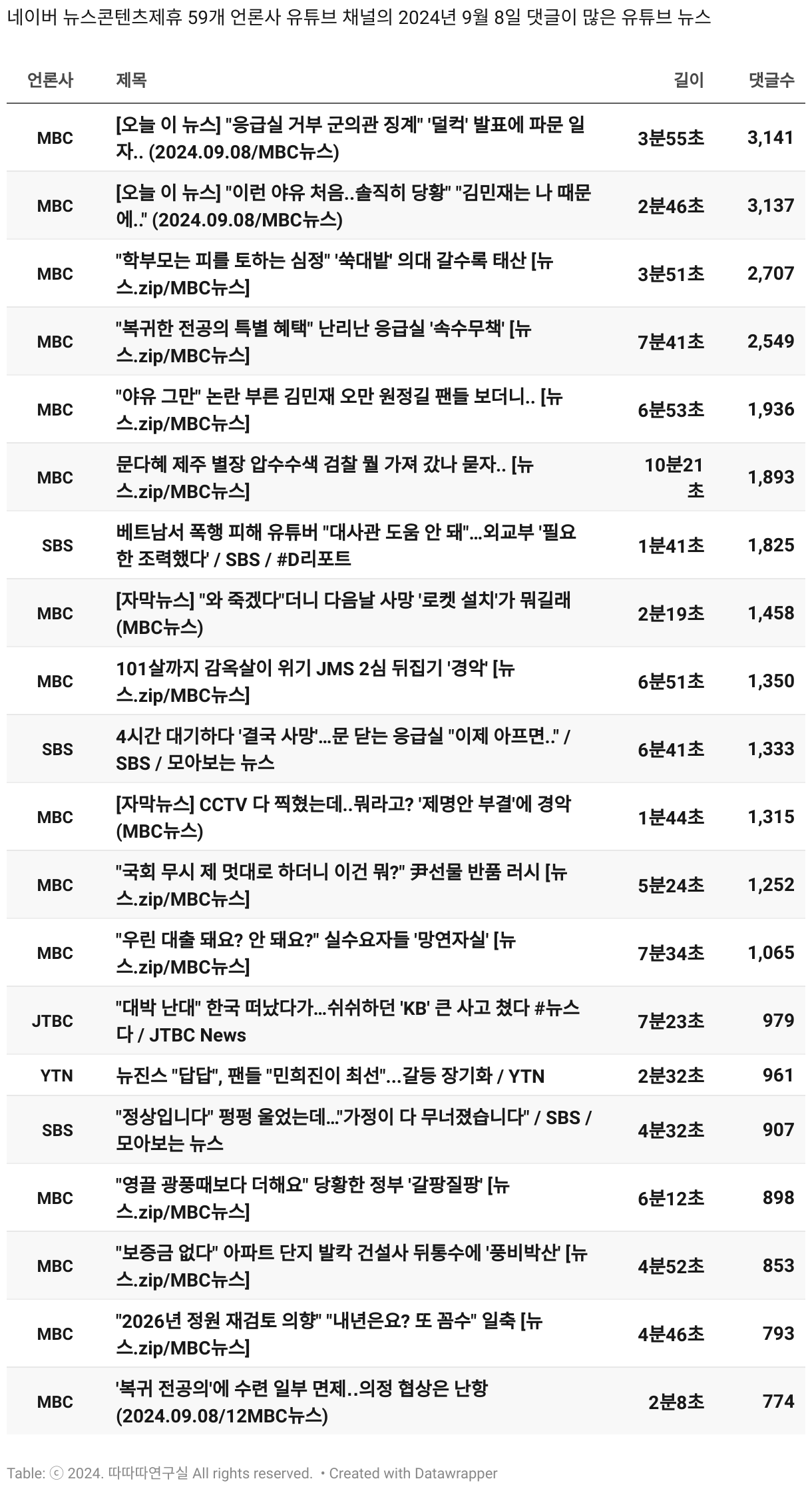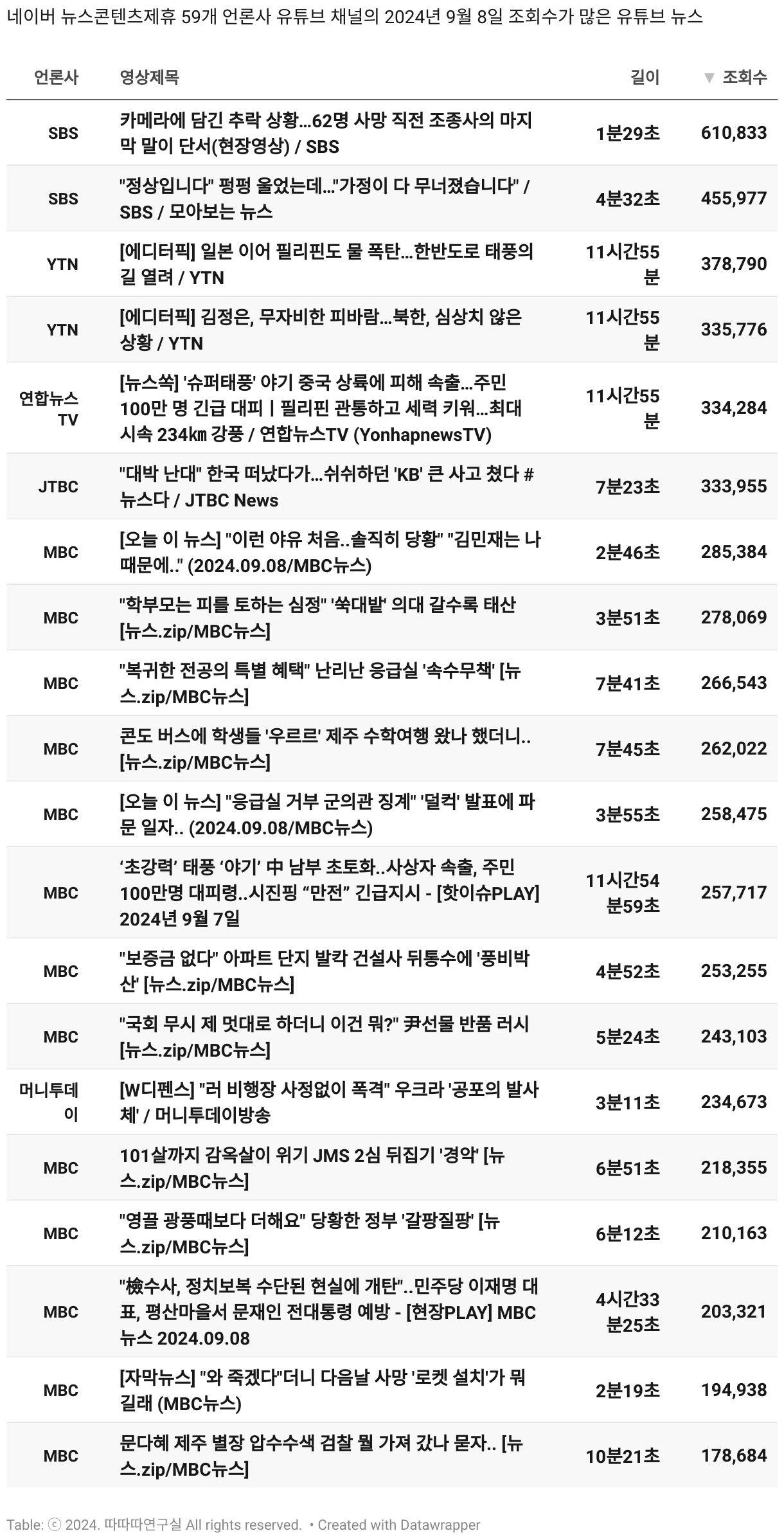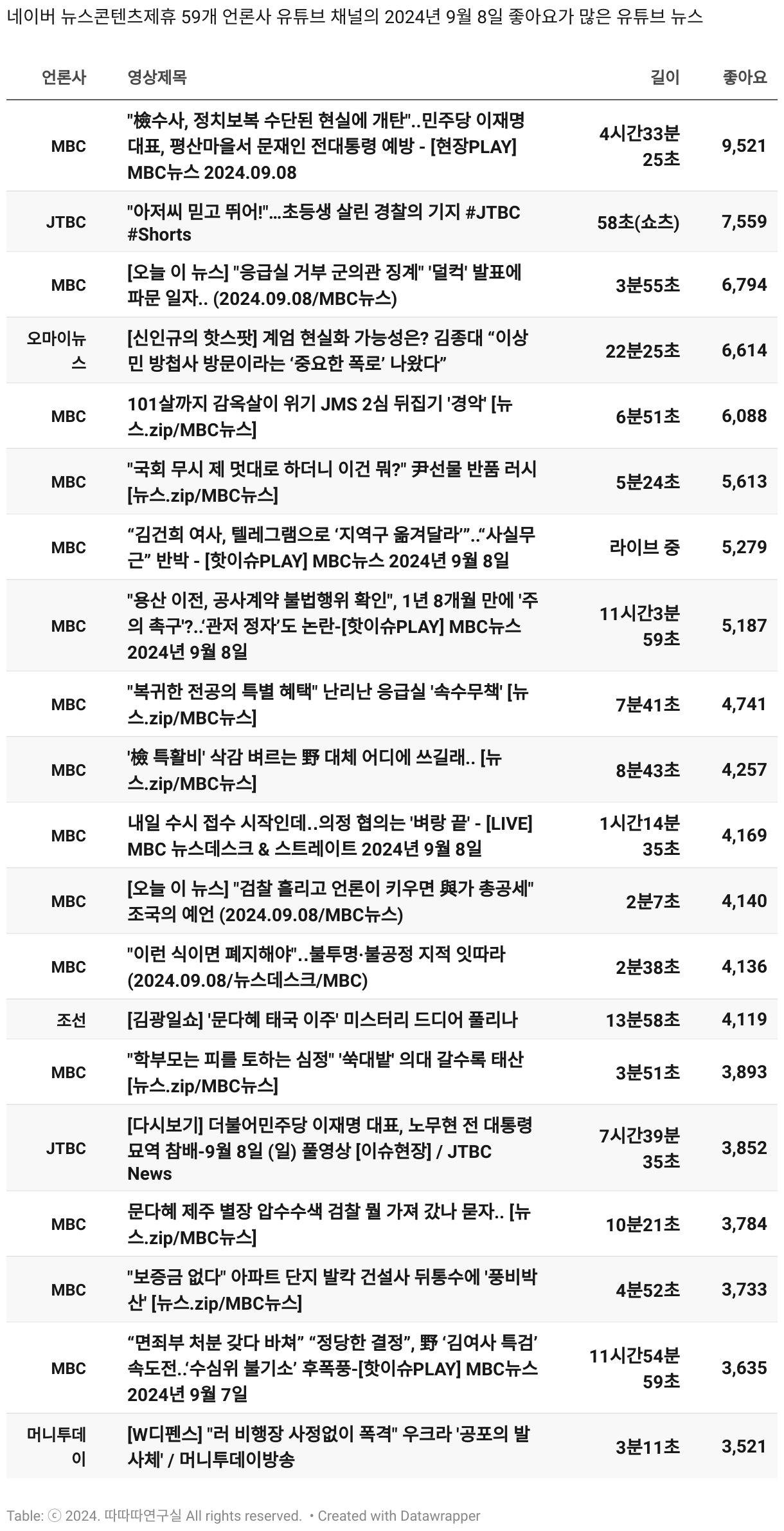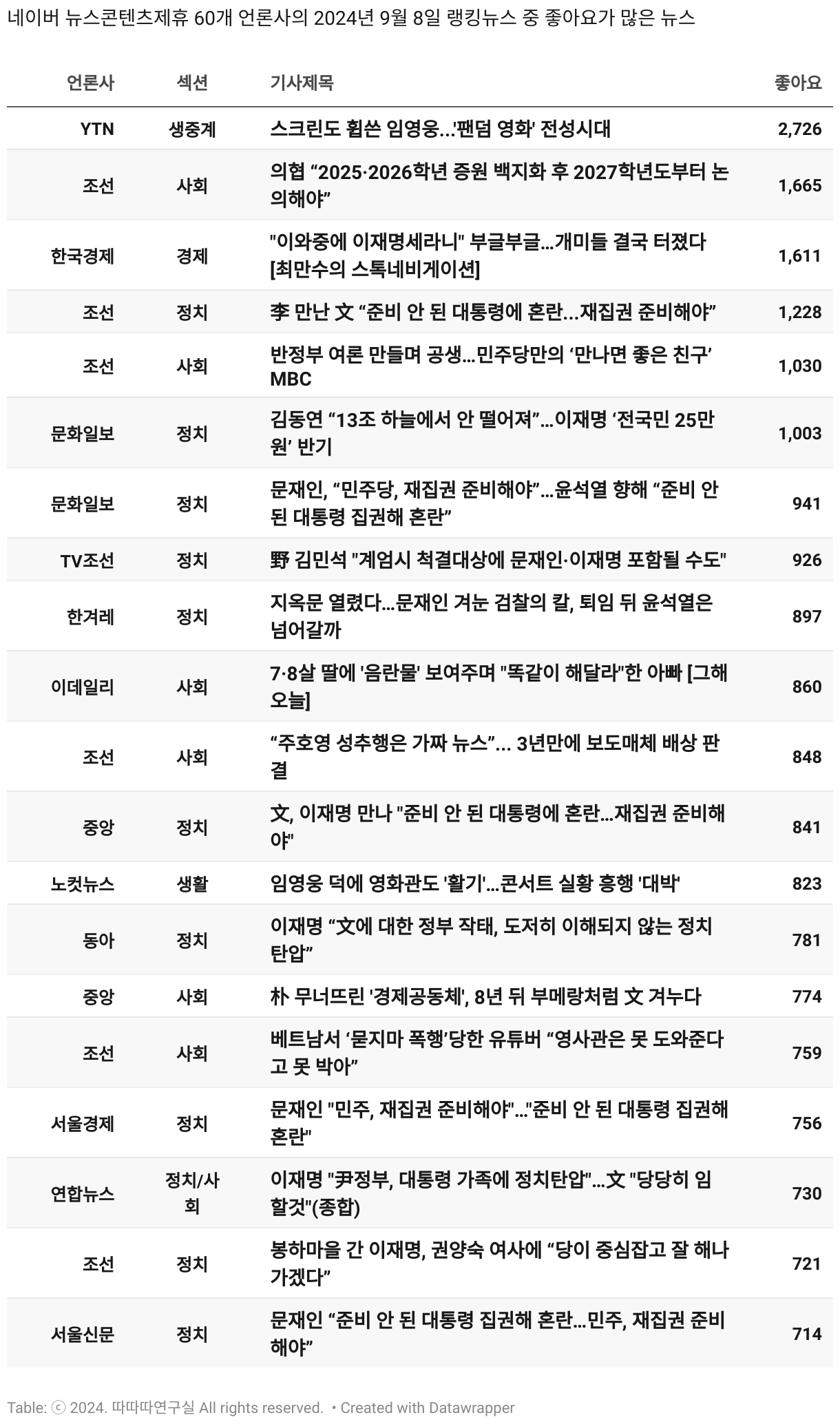 *데이터 수집 기간 : 2024년 6월 10일 *데이터 수집 대상 : 네이버 뉴스콘텐츠제휴 60개 언론사. 종합일간지 10개(경향신문, 국민일보, 동아일보, 문화일보, 서울신문, 세계일보, 조선일보, 중앙일보, 한겨레신문, 한국일보), 방송/통신사 14개(뉴스1, 뉴시스, 연합뉴스, 연합뉴스TV, 채널A, 한국경제TV, JTBC, KBS, MBC, MBN, SBS, SBS BIZ, TV조선, YTN), 경제지 11개(매일경제, 머니투데이, 비즈워치, 서울경제, 아시아경제, 이데일리, 조선비즈, 조세일보, 파이낸셜뉴스, 한국경제(유튜브제외), 헤럴드경제) 인터넷 8개(노컷뉴스, 더팩트, 데일리안, 머니S, 미디어오늘, 아이뉴스24, 오마이뉴스, 프레시안), IT 5개(디지털데일리,디지털타임스, 블로터, 전자신문, 지디넷코리아), 지역 12개(강원도민일보, 강원일보, 경기일보, 국제신문, 대구MBC, 대전일보, 매일신문, 부산일보, 전주MBC, CJB청주방송, JIBS, kbc광주방송)