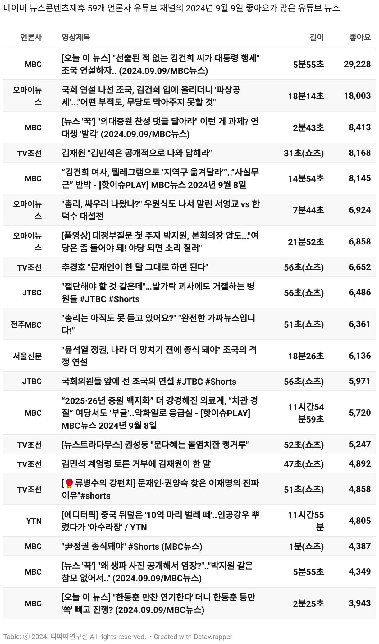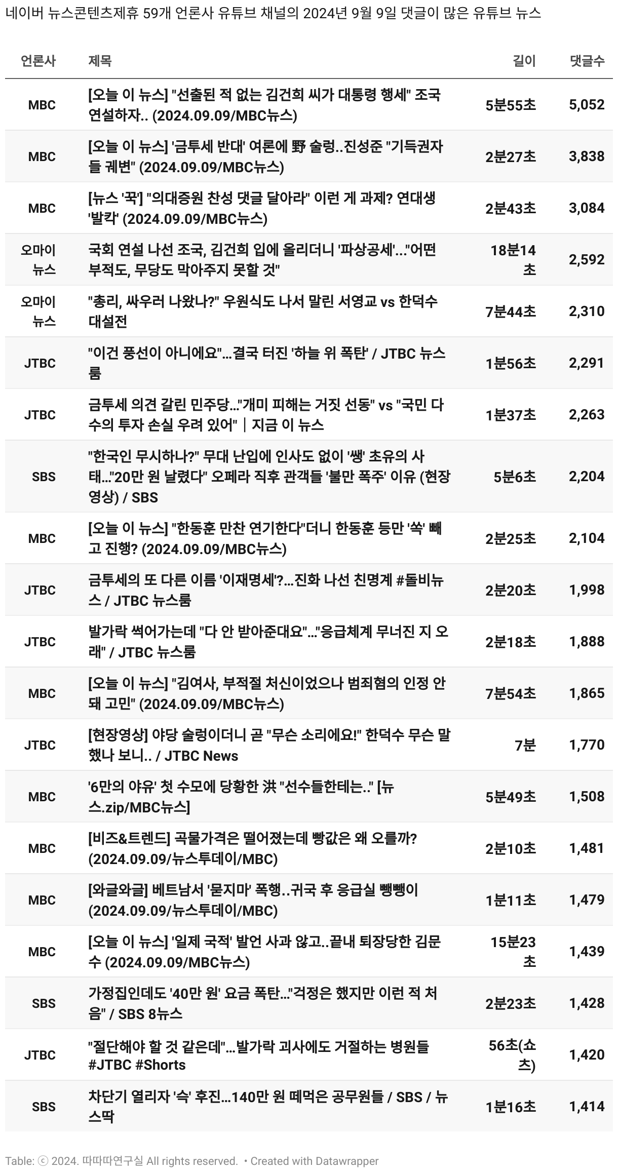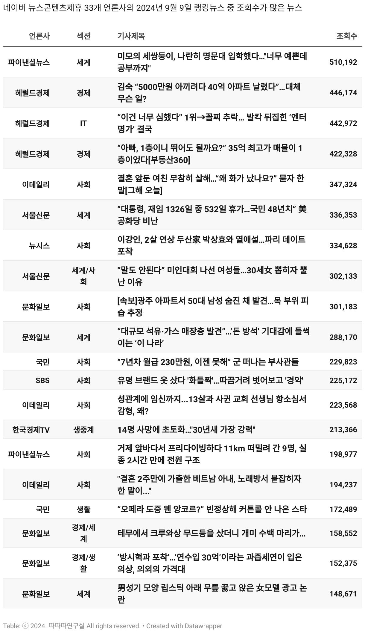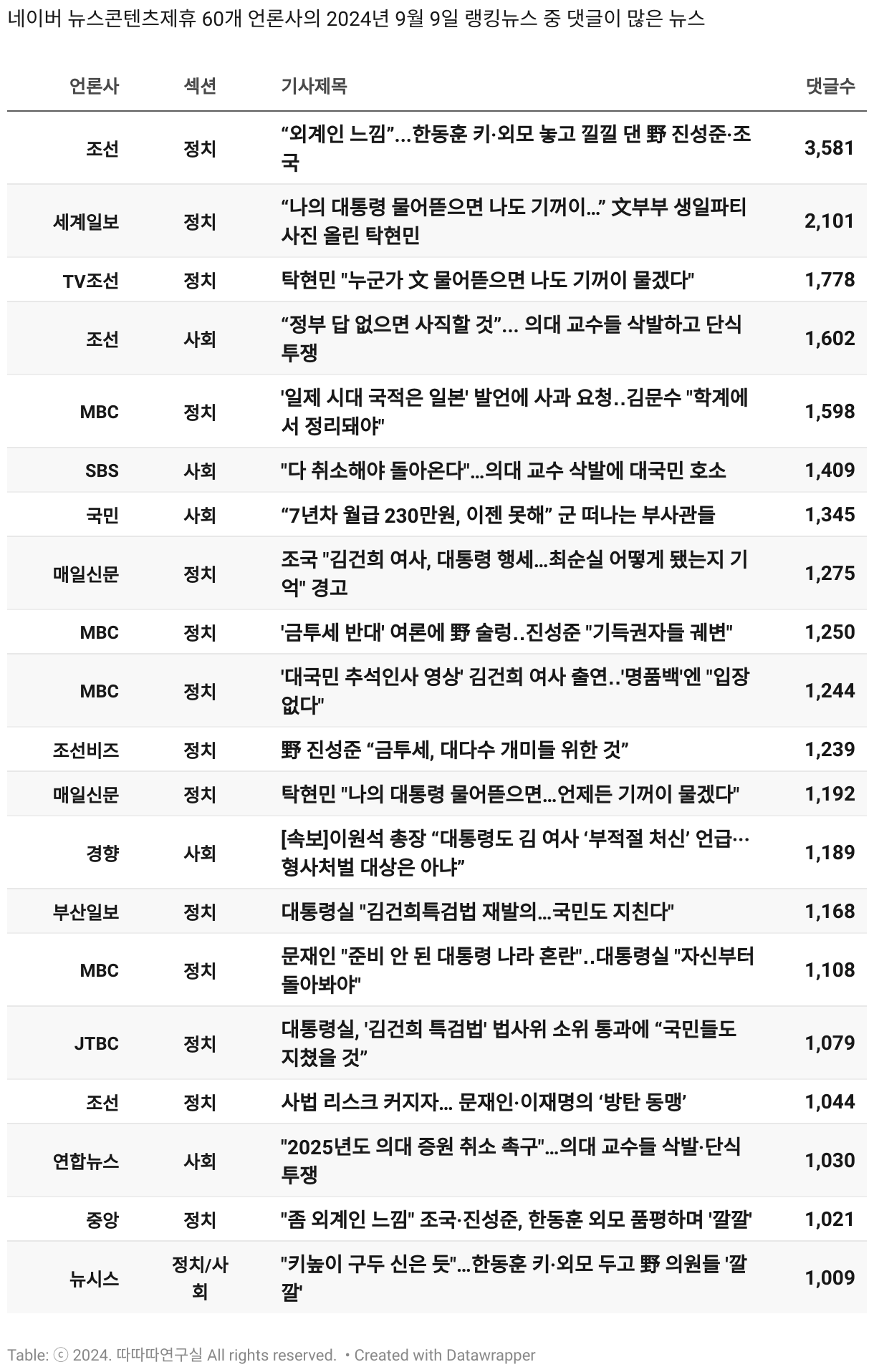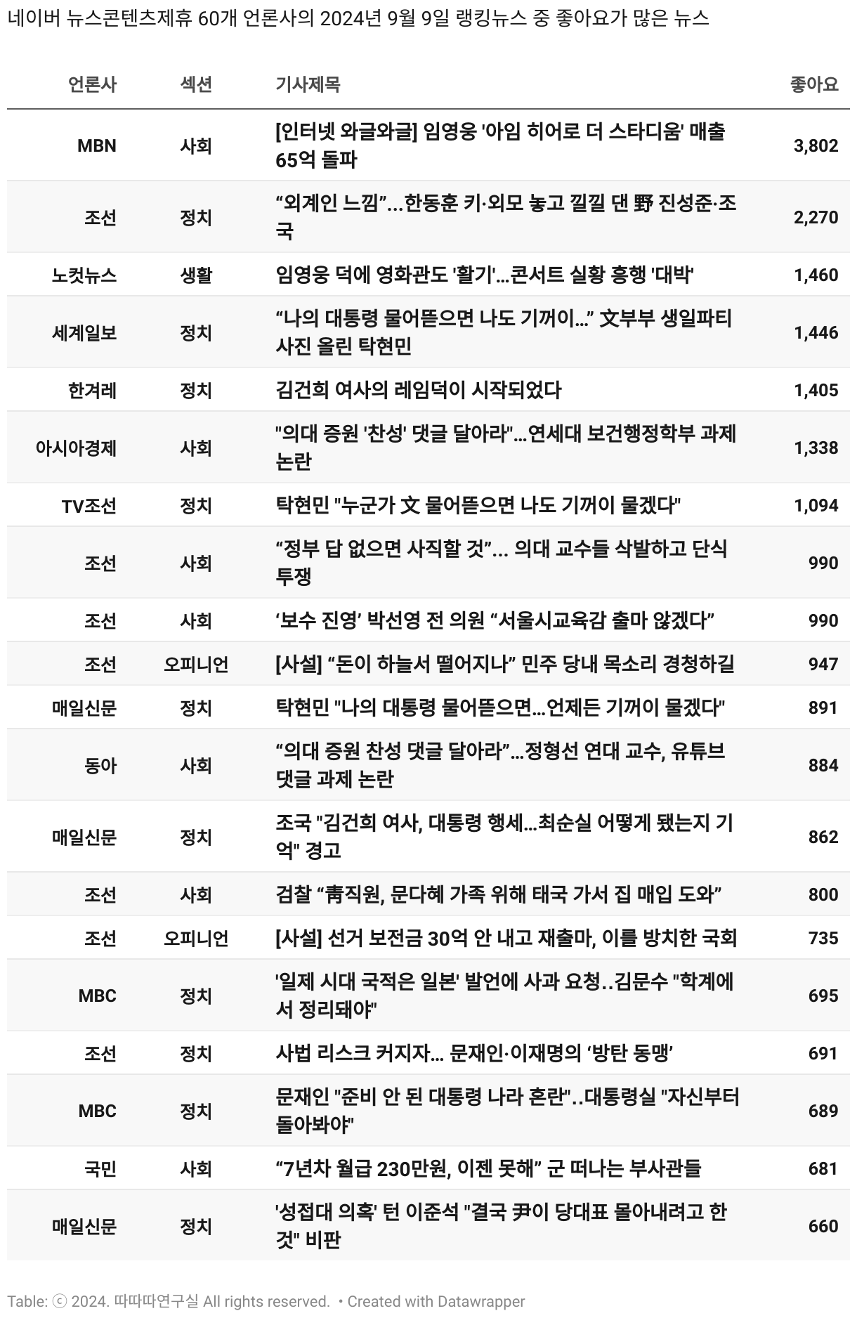 *데이터 수집 기간 : 2024년 6월 10일 *데이터 수집 대상 : 네이버 뉴스콘텐츠제휴 60개 언론사. 종합일간지 10개(경향신문, 국민일보, 동아일보, 문화일보, 서울신문, 세계일보, 조선일보, 중앙일보, 한겨레신문, 한국일보), 방송/통신사 14개(뉴스1, 뉴시스, 연합뉴스, 연합뉴스TV, 채널A, 한국경제TV, JTBC, KBS, MBC, MBN, SBS, SBS BIZ, TV조선, YTN), 경제지 11개(매일경제, 머니투데이, 비즈워치, 서울경제, 아시아경제, 이데일리, 조선비즈, 조세일보, 파이낸셜뉴스, 한국경제(유튜브제외), 헤럴드경제) 인터넷 8개(노컷뉴스, 더팩트, 데일리안, 머니S, 미디어오늘, 아이뉴스24, 오마이뉴스, 프레시안), IT 5개(디지털데일리,디지털타임스, 블로터, 전자신문, 지디넷코리아), 지역 12개(강원도민일보, 강원일보, 경기일보, 국제신문, 대구MBC, 대전일보, 매일신문, 부산일보, 전주MBC, CJB청주방송, JIBS, kbc광주방송)