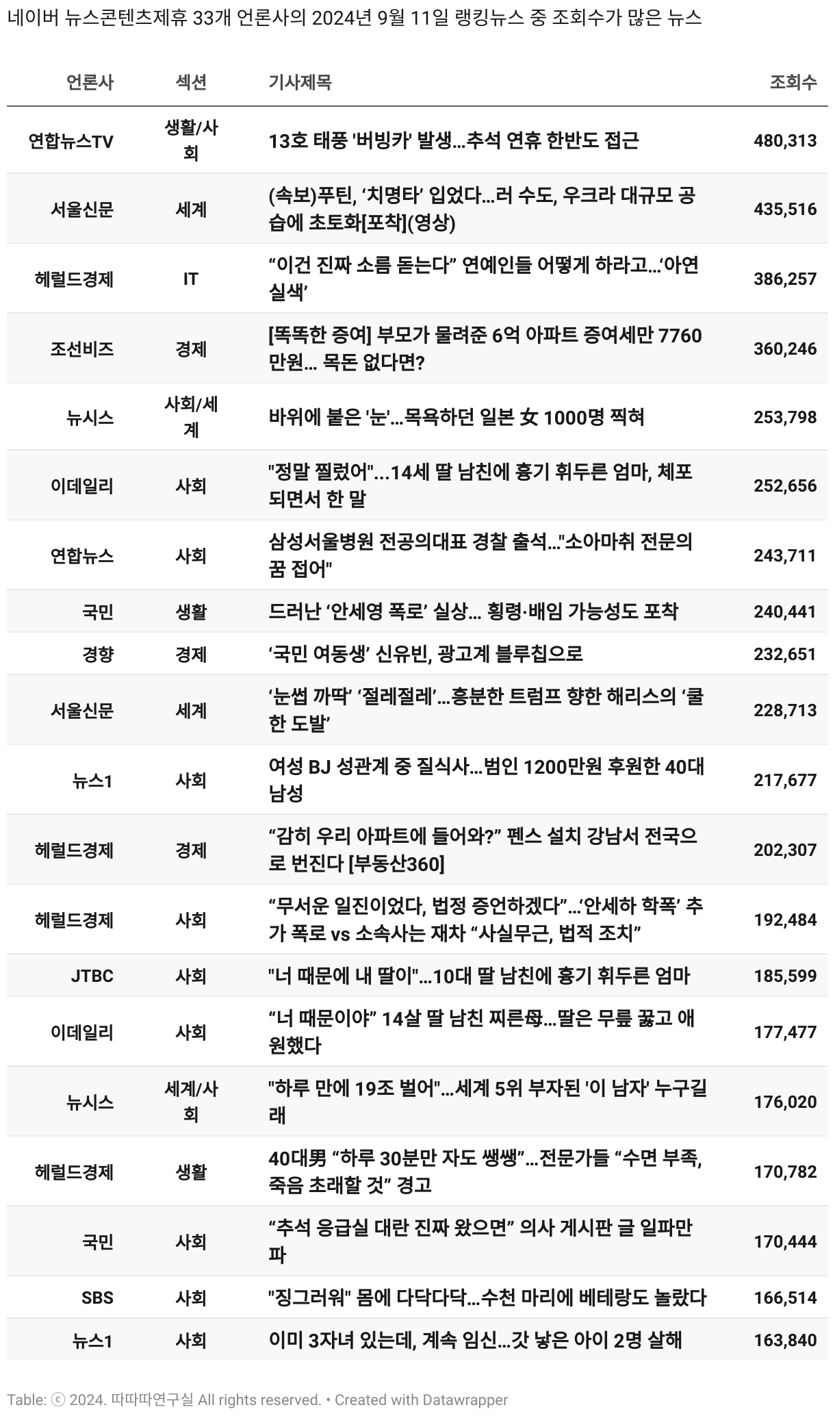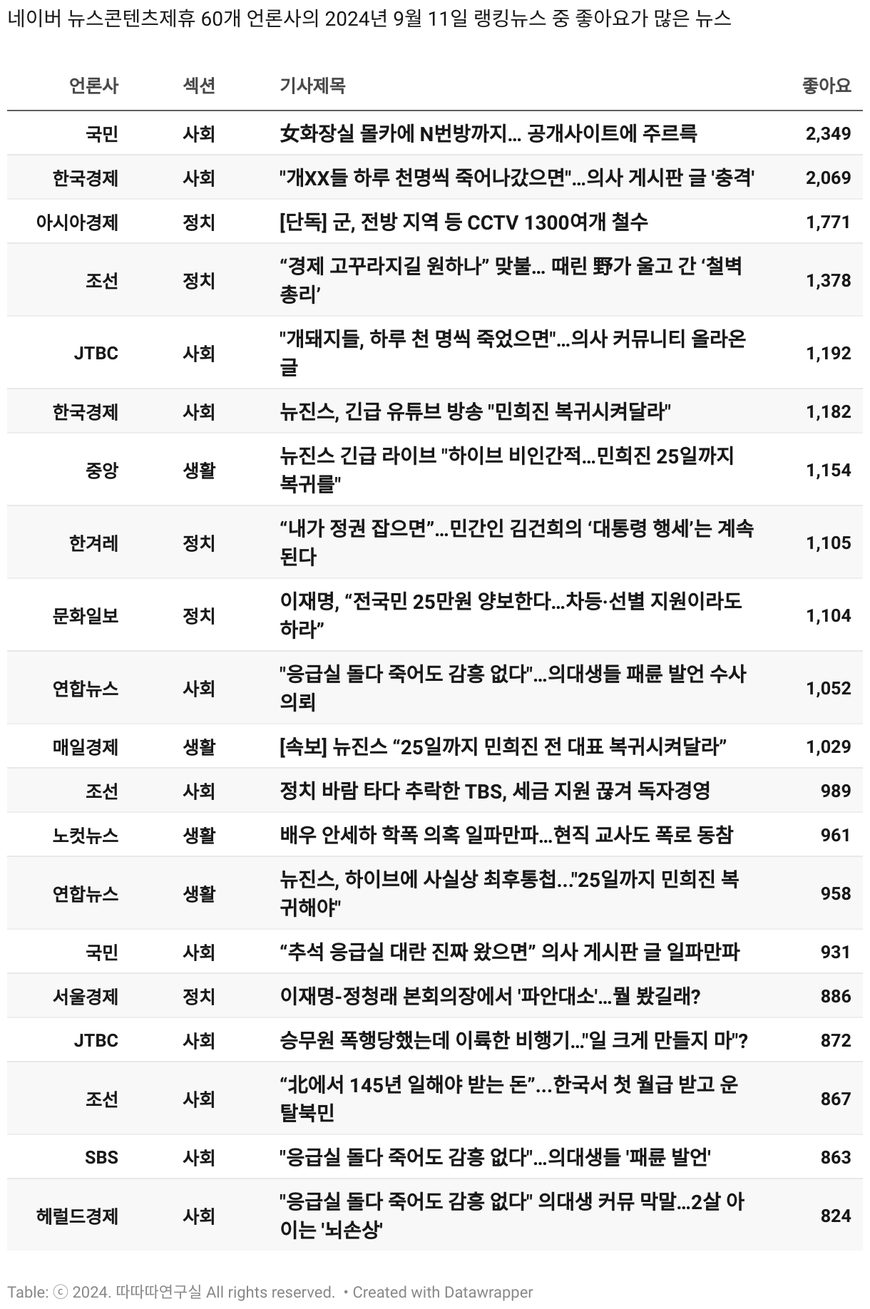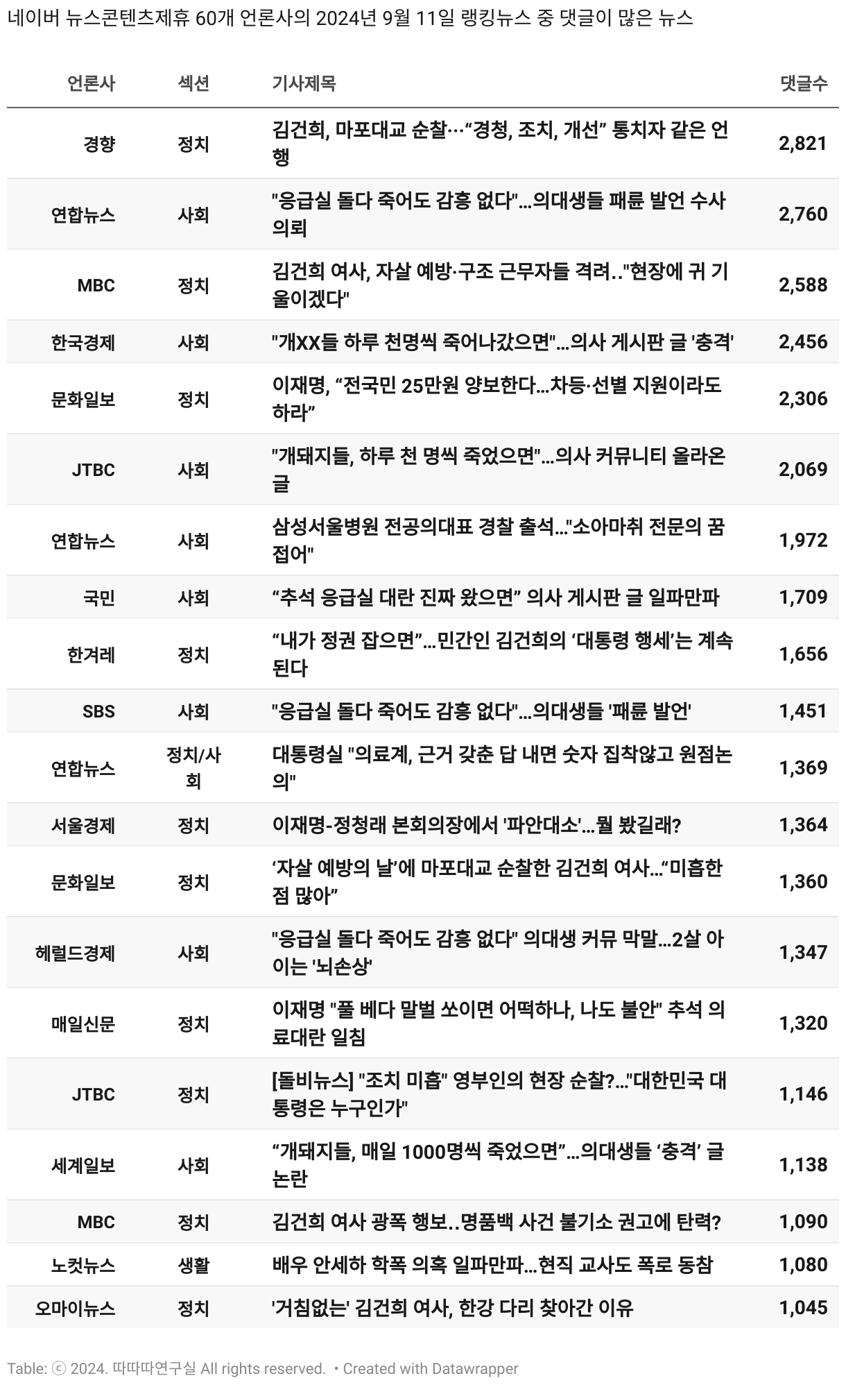 *데이터 수집 기간 : 2024년 6월 10일 *데이터 수집 대상 : 네이버 뉴스콘텐츠제휴 60개 언론사. 종합일간지 10개(경향신문, 국민일보, 동아일보, 문화일보, 서울신문, 세계일보, 조선일보, 중앙일보, 한겨레신문, 한국일보), 방송/통신사 14개(뉴스1, 뉴시스, 연합뉴스, 연합뉴스TV, 채널A, 한국경제TV, JTBC, KBS, MBC, MBN, SBS, SBS BIZ, TV조선, YTN), 경제지 11개(매일경제, 머니투데이, 비즈워치, 서울경제, 아시아경제, 이데일리, 조선비즈, 조세일보, 파이낸셜뉴스, 한국경제(유튜브제외), 헤럴드경제) 인터넷 8개(노컷뉴스, 더팩트, 데일리안, 머니S, 미디어오늘, 아이뉴스24, 오마이뉴스, 프레시안), IT 5개(디지털데일리,디지털타임스, 블로터, 전자신문, 지디넷코리아), 지역 12개(강원도민일보, 강원일보, 경기일보, 국제신문, 대구MBC, 대전일보, 매일신문, 부산일보, 전주MBC, CJB청주방송, JIBS, kbc광주방송)
