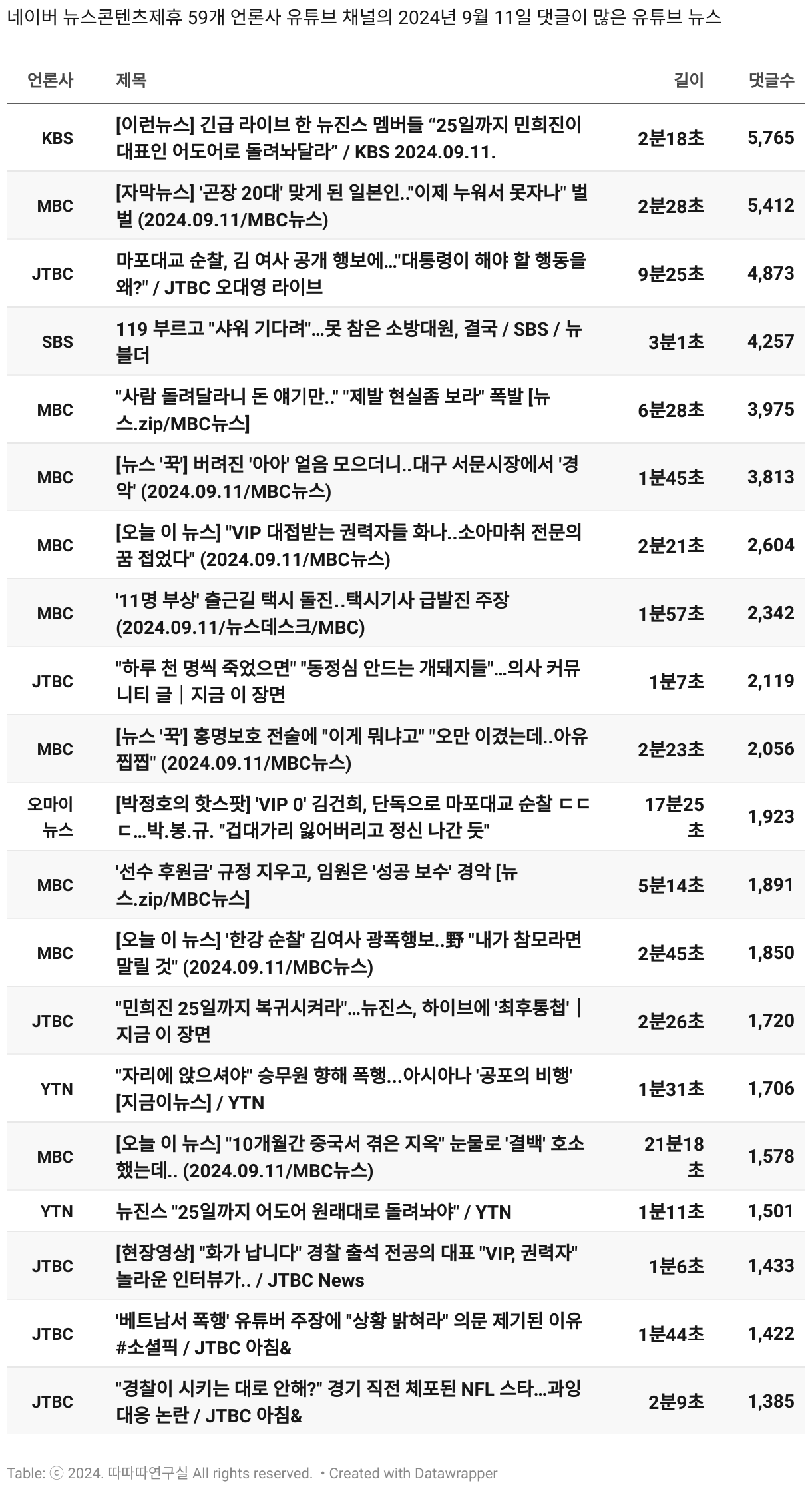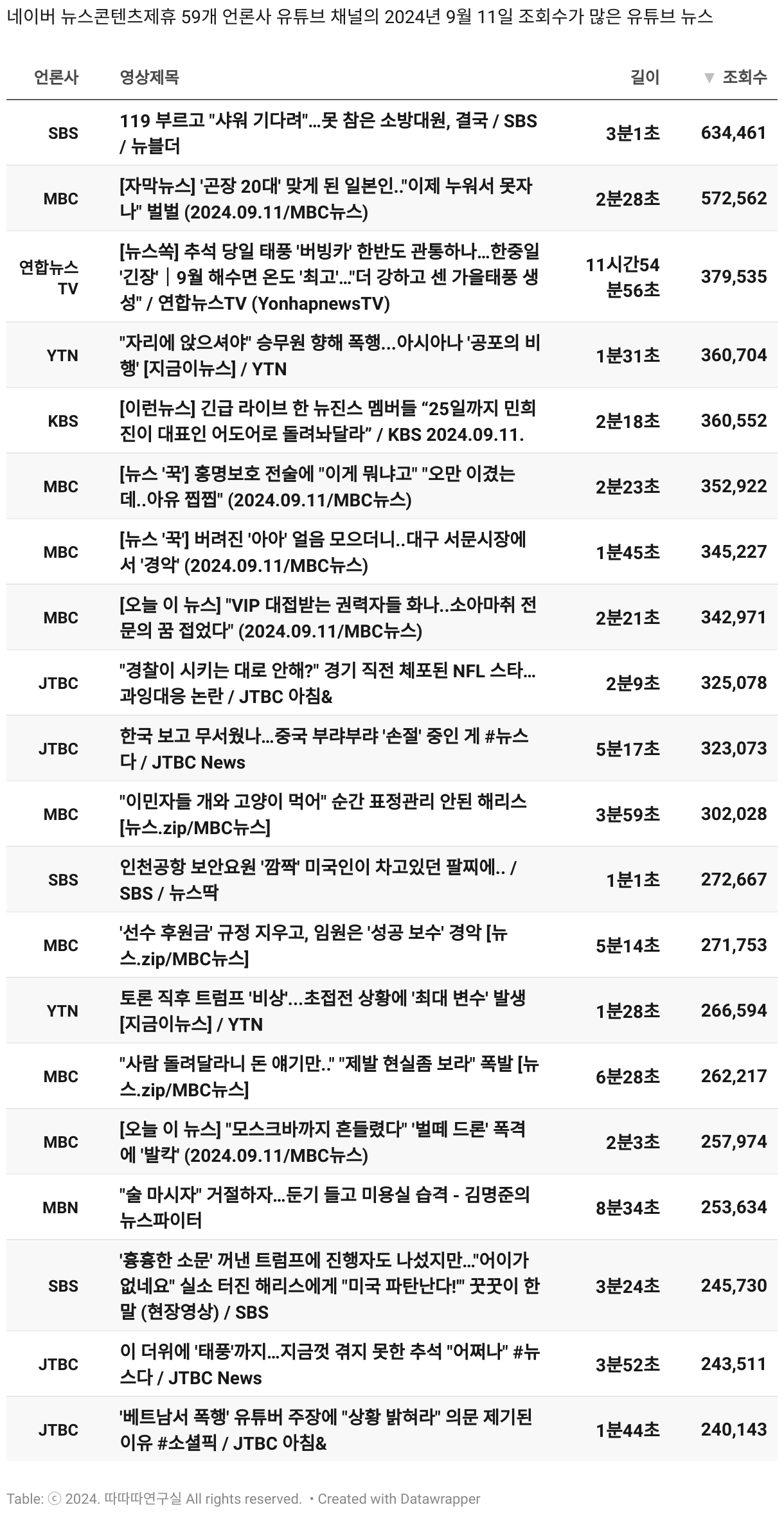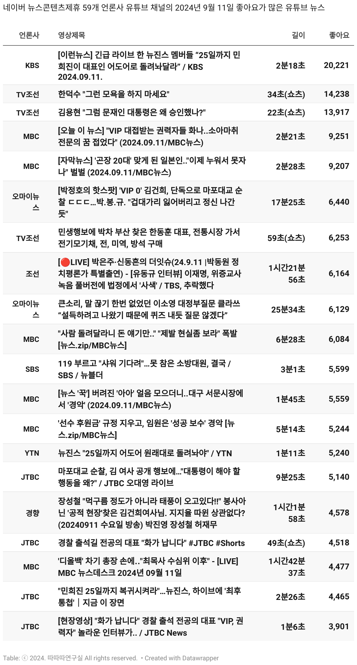 *데이터 수집 기간 : 2024년 6월 10일 *데이터 수집 대상 : 네이버 뉴스콘텐츠제휴 60개 언론사. 종합일간지 10개(경향신문, 국민일보, 동아일보, 문화일보, 서울신문, 세계일보, 조선일보, 중앙일보, 한겨레신문, 한국일보), 방송/통신사 14개(뉴스1, 뉴시스, 연합뉴스, 연합뉴스TV, 채널A, 한국경제TV, JTBC, KBS, MBC, MBN, SBS, SBS BIZ, TV조선, YTN), 경제지 11개(매일경제, 머니투데이, 비즈워치, 서울경제, 아시아경제, 이데일리, 조선비즈, 조세일보, 파이낸셜뉴스, 한국경제(유튜브제외), 헤럴드경제) 인터넷 8개(노컷뉴스, 더팩트, 데일리안, 머니S, 미디어오늘, 아이뉴스24, 오마이뉴스, 프레시안), IT 5개(디지털데일리,디지털타임스, 블로터, 전자신문, 지디넷코리아), 지역 12개(강원도민일보, 강원일보, 경기일보, 국제신문, 대구MBC, 대전일보, 매일신문, 부산일보, 전주MBC, CJB청주방송, JIBS, kbc광주방송)