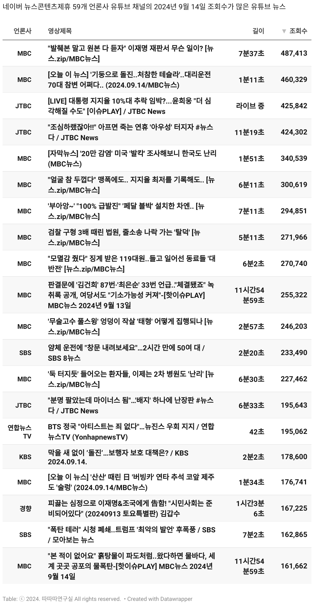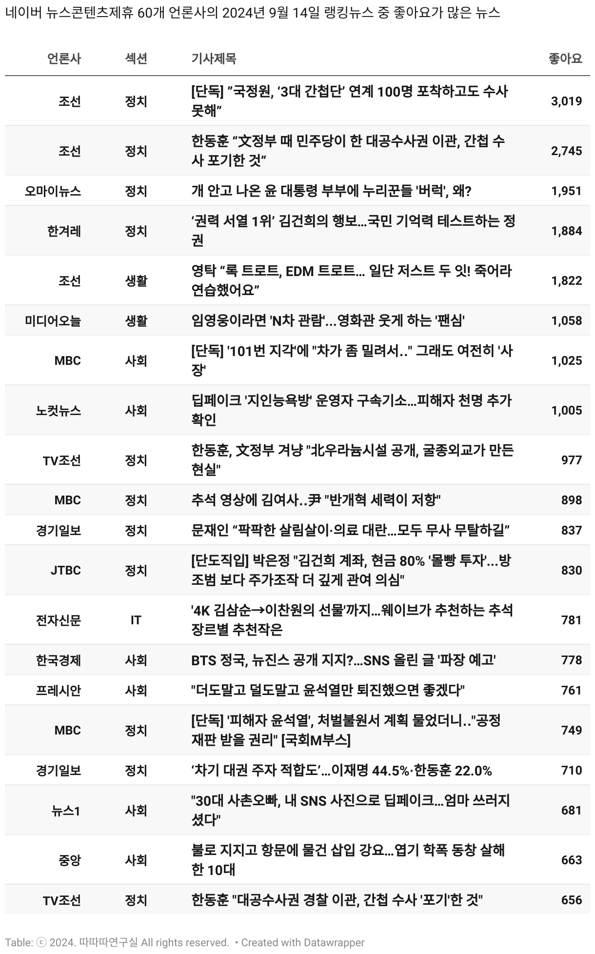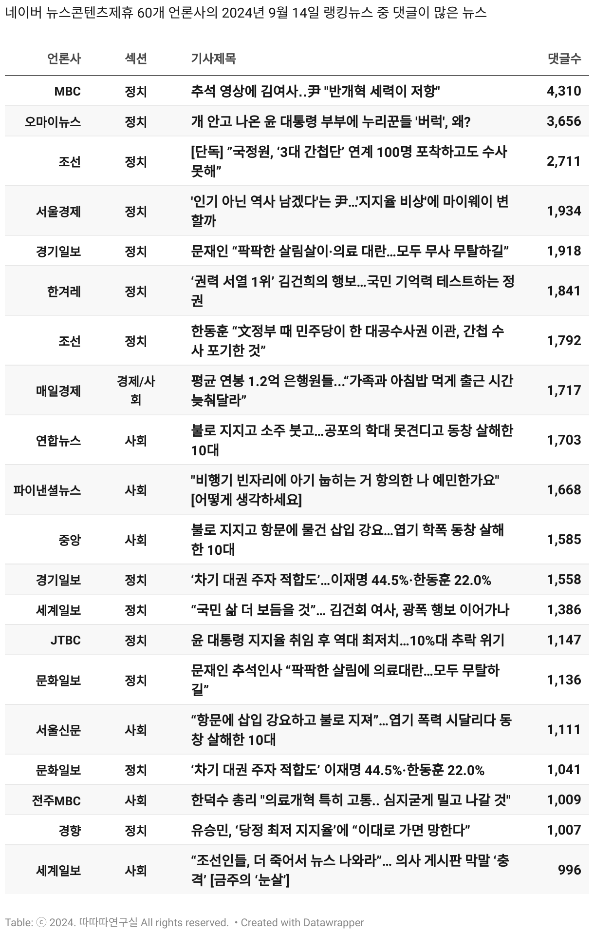 *데이터 수집 기간 : 2024년 6월 10일 *데이터 수집 대상 : 네이버 뉴스콘텐츠제휴 60개 언론사. 종합일간지 10개(경향신문, 국민일보, 동아일보, 문화일보, 서울신문, 세계일보, 조선일보, 중앙일보, 한겨레신문, 한국일보), 방송/통신사 14개(뉴스1, 뉴시스, 연합뉴스, 연합뉴스TV, 채널A, 한국경제TV, JTBC, KBS, MBC, MBN, SBS, SBS BIZ, TV조선, YTN), 경제지 11개(매일경제, 머니투데이, 비즈워치, 서울경제, 아시아경제, 이데일리, 조선비즈, 조세일보, 파이낸셜뉴스, 한국경제(유튜브제외), 헤럴드경제) 인터넷 8개(노컷뉴스, 더팩트, 데일리안, 머니S, 미디어오늘, 아이뉴스24, 오마이뉴스, 프레시안), IT 5개(디지털데일리,디지털타임스, 블로터, 전자신문, 지디넷코리아), 지역 12개(강원도민일보, 강원일보, 경기일보, 국제신문, 대구MBC, 대전일보, 매일신문, 부산일보, 전주MBC, CJB청주방송, JIBS, kbc광주방송)