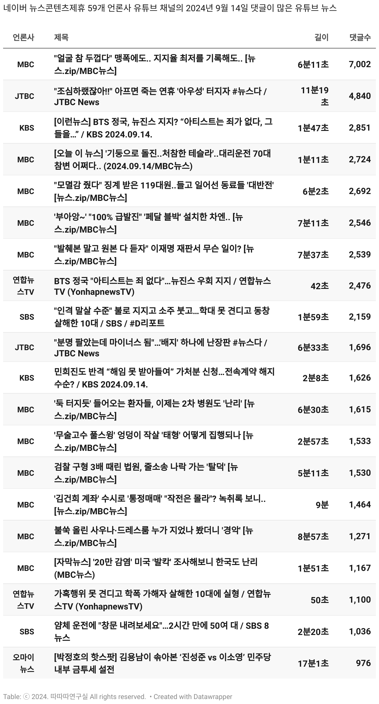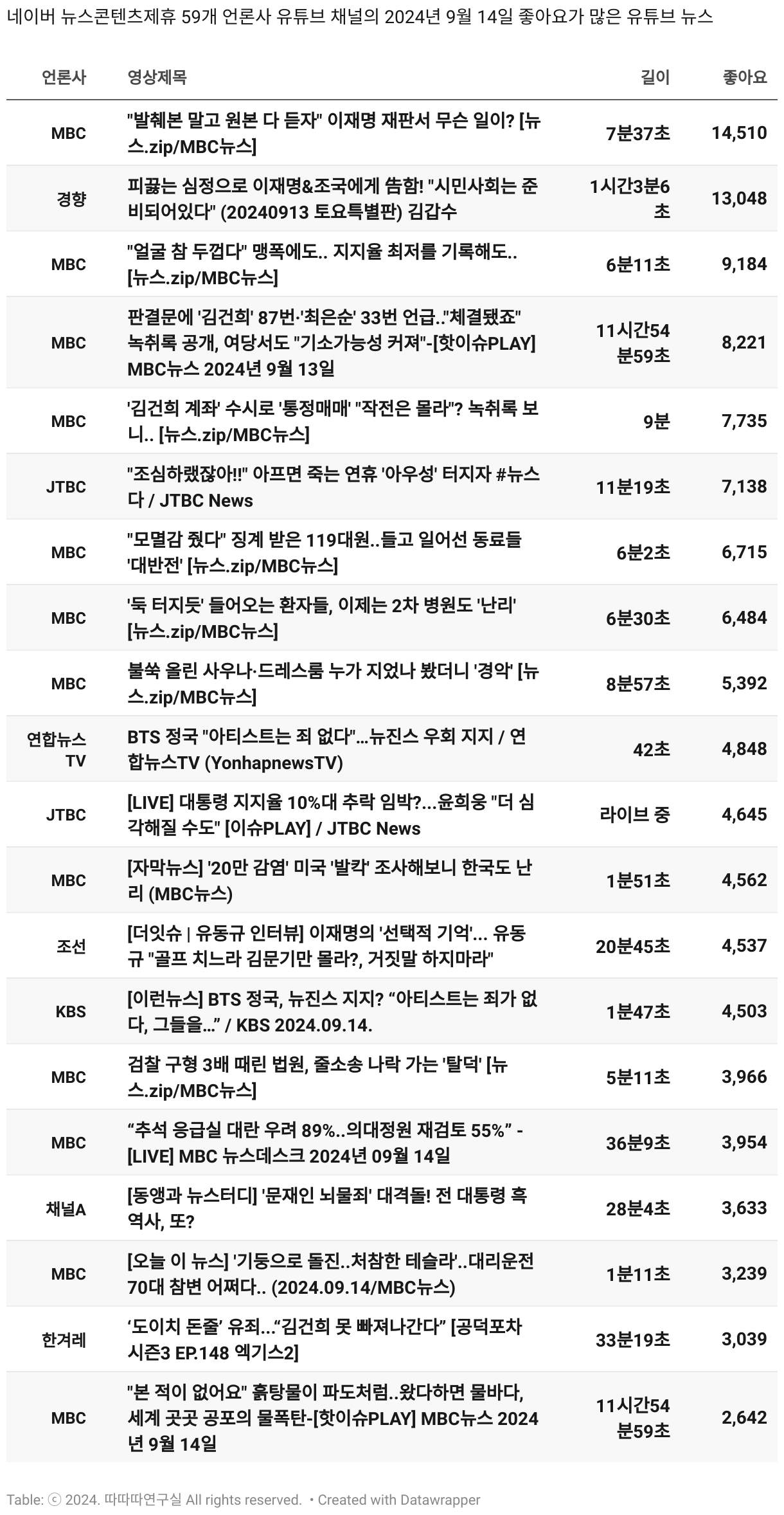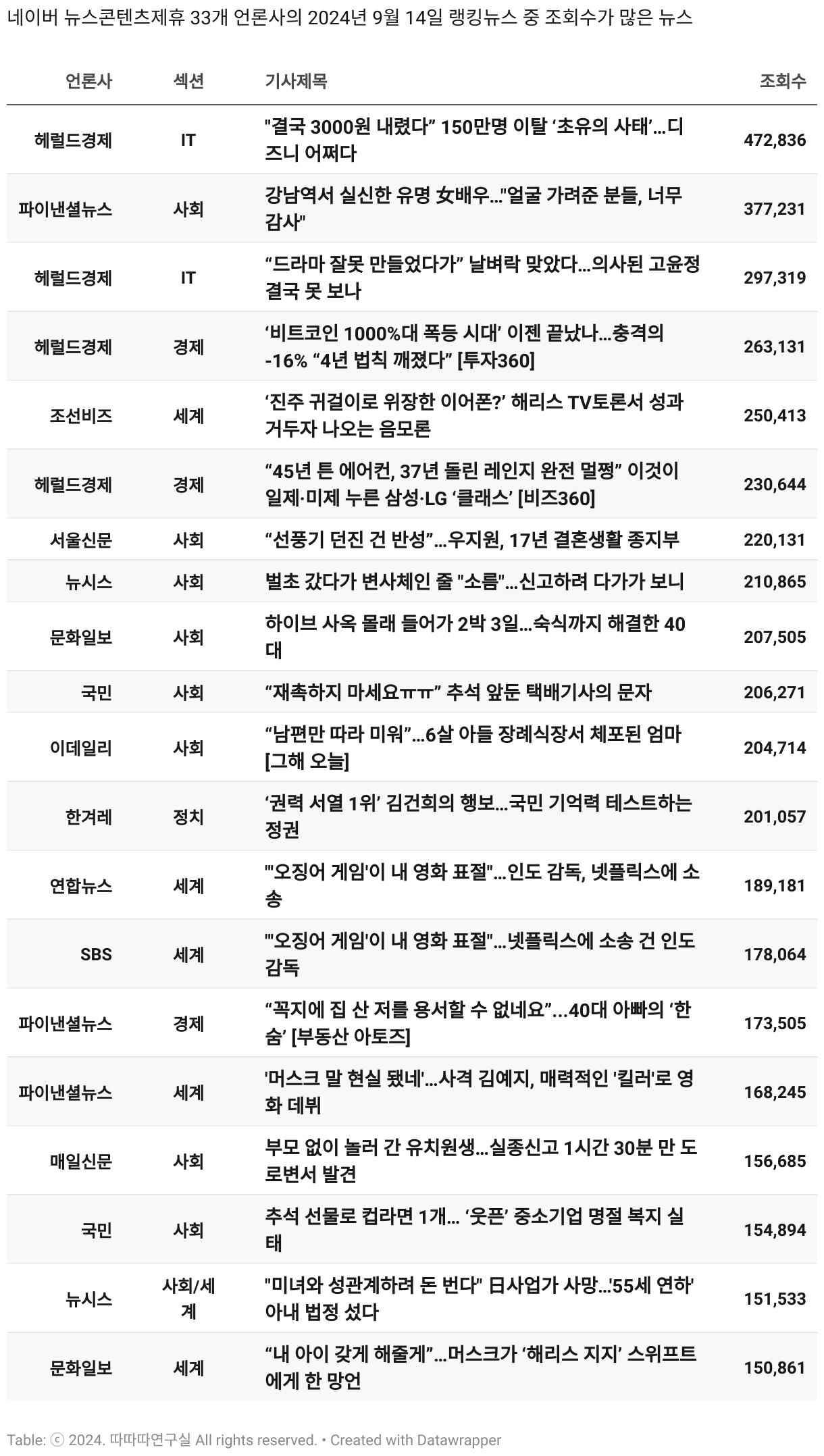 *데이터 수집 기간 : 2024년 6월 10일 *데이터 수집 대상 : 네이버 뉴스콘텐츠제휴 60개 언론사. 종합일간지 10개(경향신문, 국민일보, 동아일보, 문화일보, 서울신문, 세계일보, 조선일보, 중앙일보, 한겨레신문, 한국일보), 방송/통신사 14개(뉴스1, 뉴시스, 연합뉴스, 연합뉴스TV, 채널A, 한국경제TV, JTBC, KBS, MBC, MBN, SBS, SBS BIZ, TV조선, YTN), 경제지 11개(매일경제, 머니투데이, 비즈워치, 서울경제, 아시아경제, 이데일리, 조선비즈, 조세일보, 파이낸셜뉴스, 한국경제(유튜브제외), 헤럴드경제) 인터넷 8개(노컷뉴스, 더팩트, 데일리안, 머니S, 미디어오늘, 아이뉴스24, 오마이뉴스, 프레시안), IT 5개(디지털데일리,디지털타임스, 블로터, 전자신문, 지디넷코리아), 지역 12개(강원도민일보, 강원일보, 경기일보, 국제신문, 대구MBC, 대전일보, 매일신문, 부산일보, 전주MBC, CJB청주방송, JIBS, kbc광주방송)