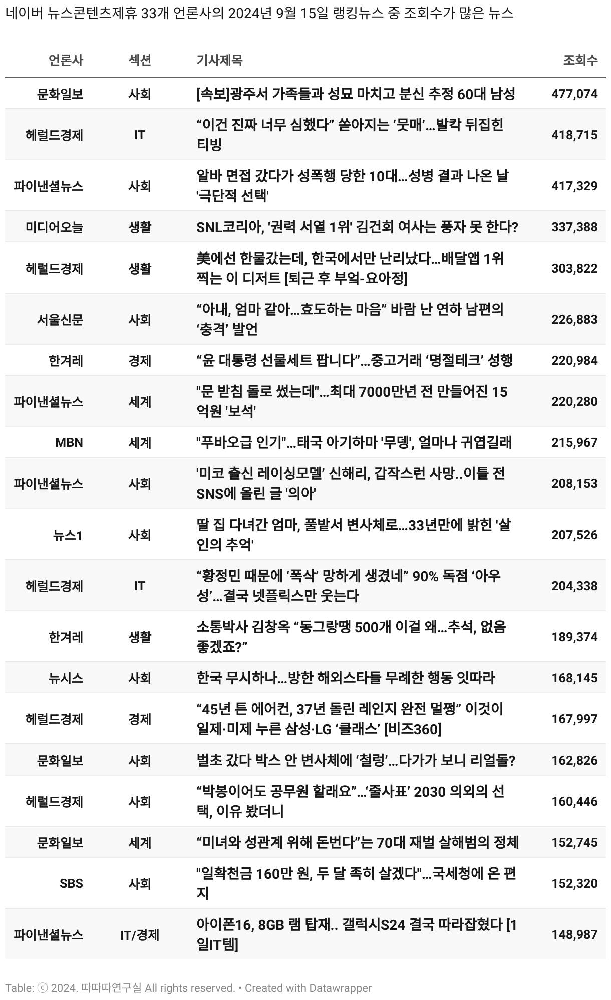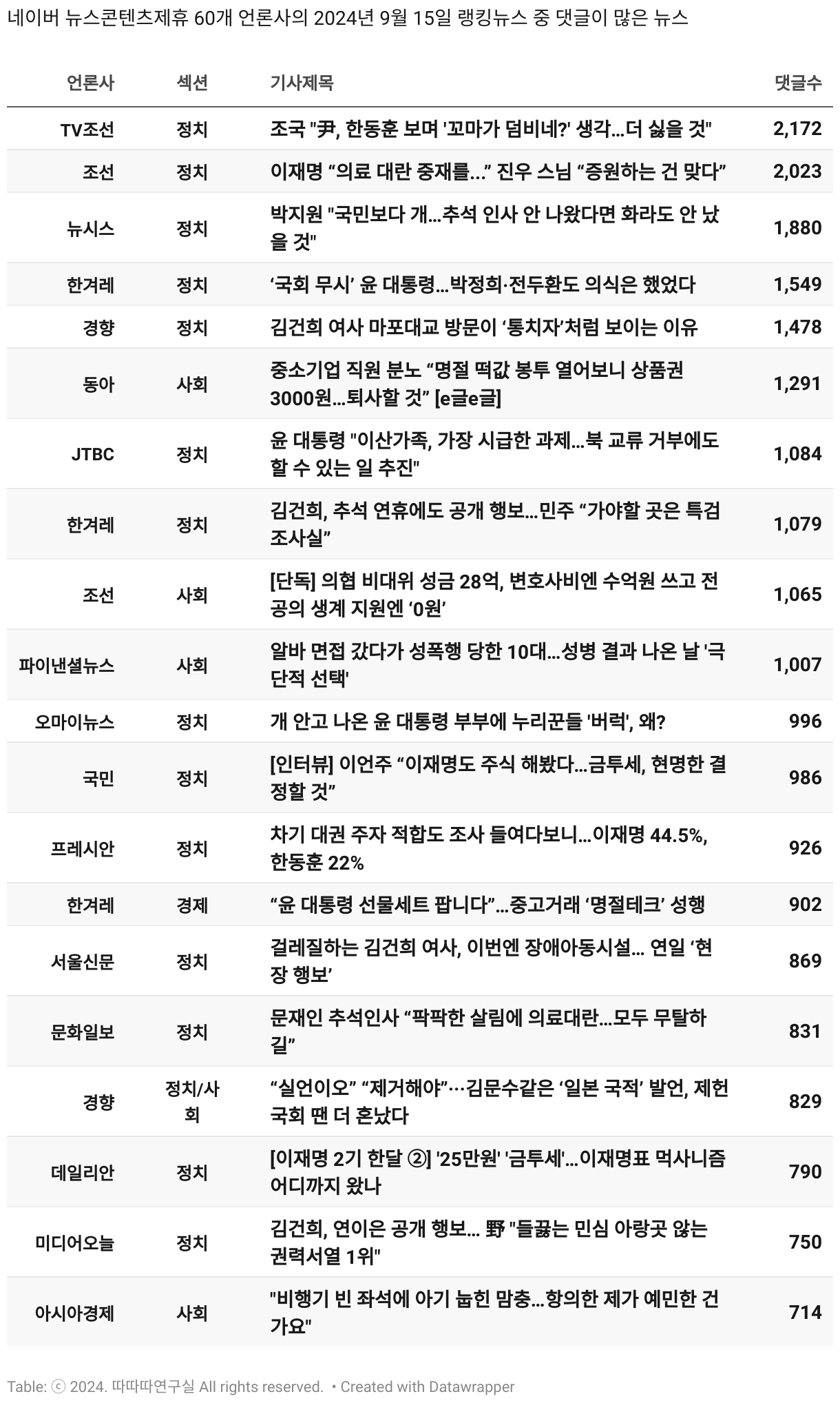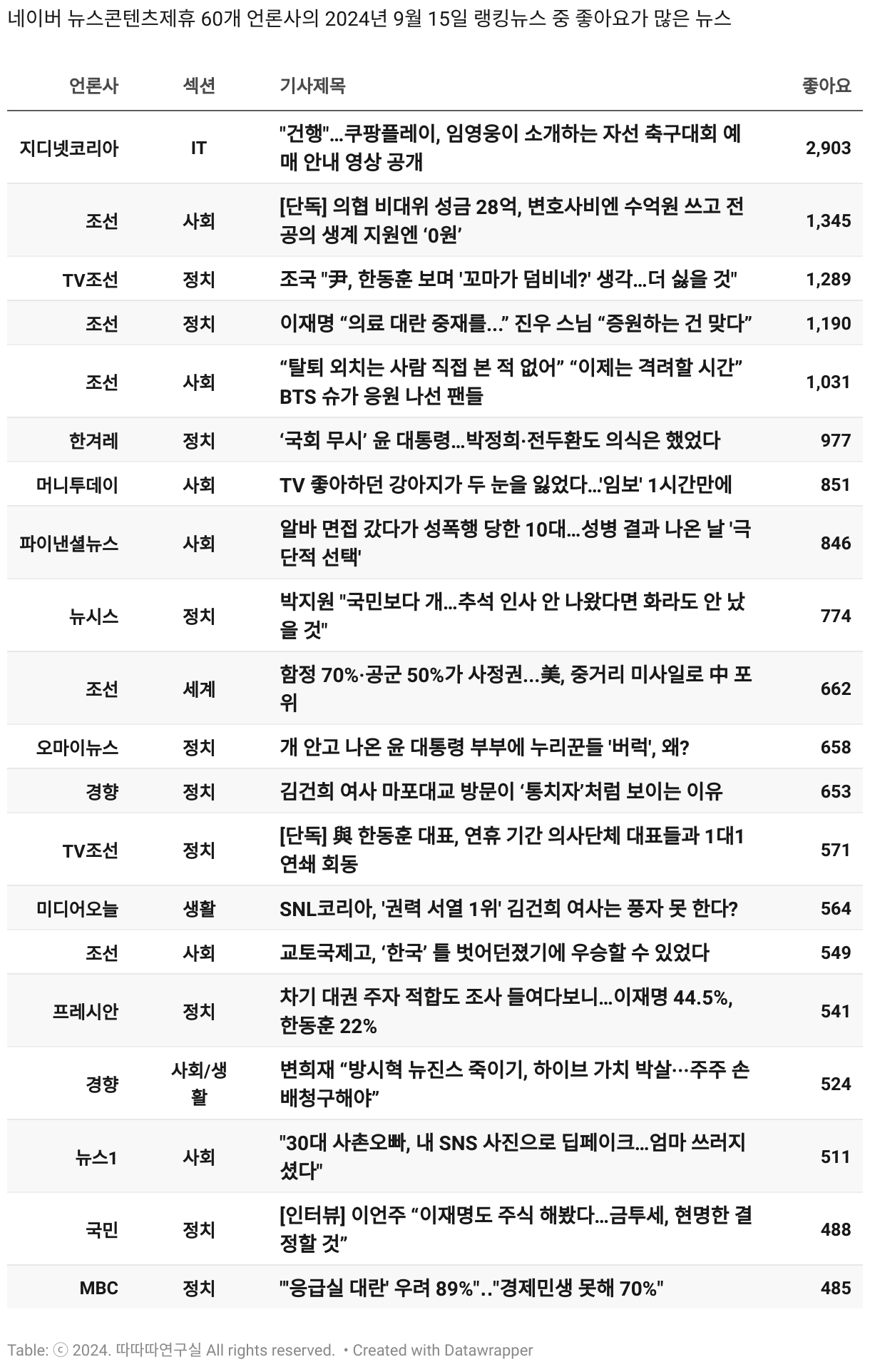 *데이터 수집 기간 : 2024년 6월 10일 *데이터 수집 대상 : 네이버 뉴스콘텐츠제휴 60개 언론사. 종합일간지 10개(경향신문, 국민일보, 동아일보, 문화일보, 서울신문, 세계일보, 조선일보, 중앙일보, 한겨레신문, 한국일보), 방송/통신사 14개(뉴스1, 뉴시스, 연합뉴스, 연합뉴스TV, 채널A, 한국경제TV, JTBC, KBS, MBC, MBN, SBS, SBS BIZ, TV조선, YTN), 경제지 11개(매일경제, 머니투데이, 비즈워치, 서울경제, 아시아경제, 이데일리, 조선비즈, 조세일보, 파이낸셜뉴스, 한국경제(유튜브제외), 헤럴드경제) 인터넷 8개(노컷뉴스, 더팩트, 데일리안, 머니S, 미디어오늘, 아이뉴스24, 오마이뉴스, 프레시안), IT 5개(디지털데일리,디지털타임스, 블로터, 전자신문, 지디넷코리아), 지역 12개(강원도민일보, 강원일보, 경기일보, 국제신문, 대구MBC, 대전일보, 매일신문, 부산일보, 전주MBC, CJB청주방송, JIBS, kbc광주방송)
