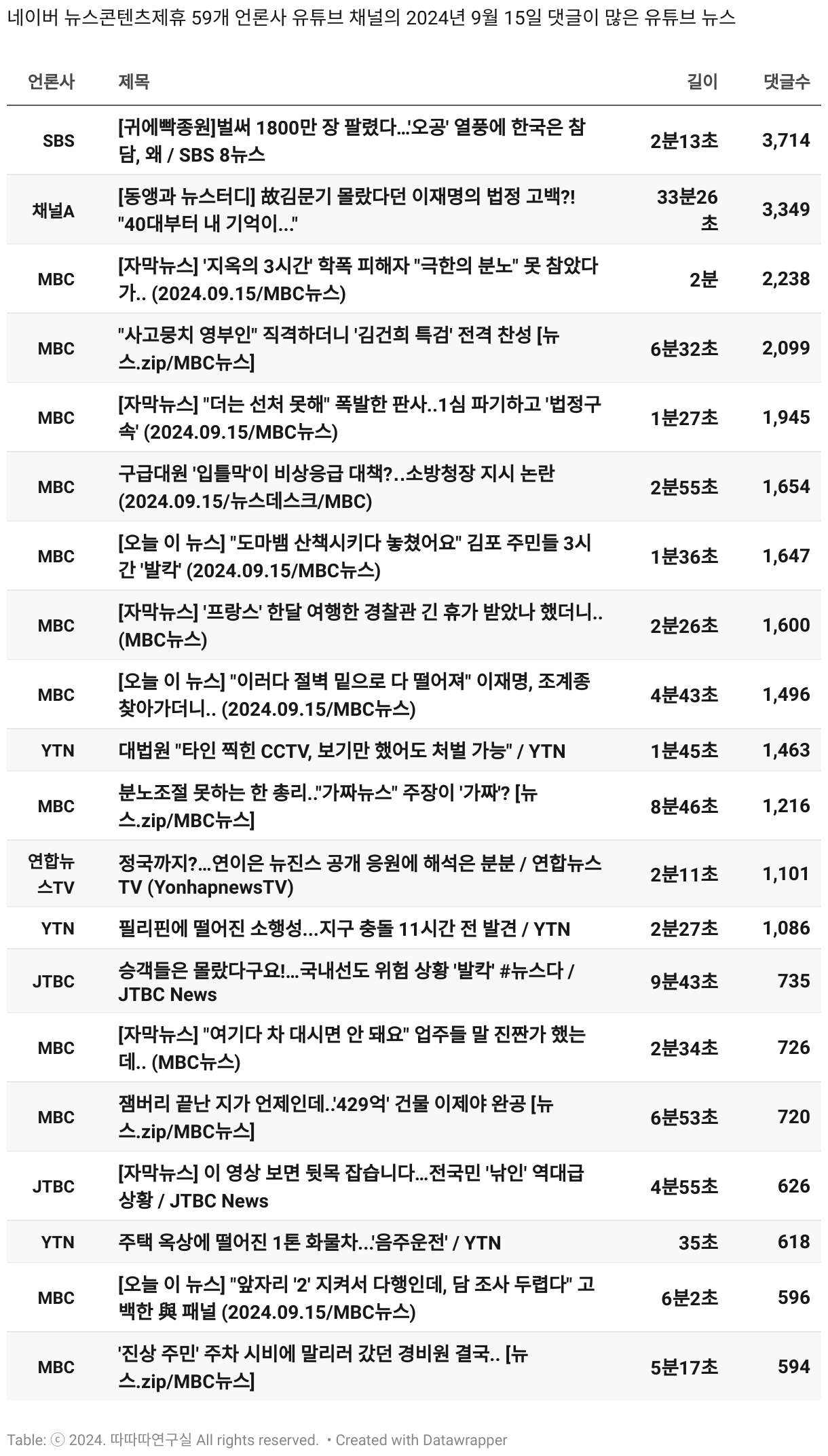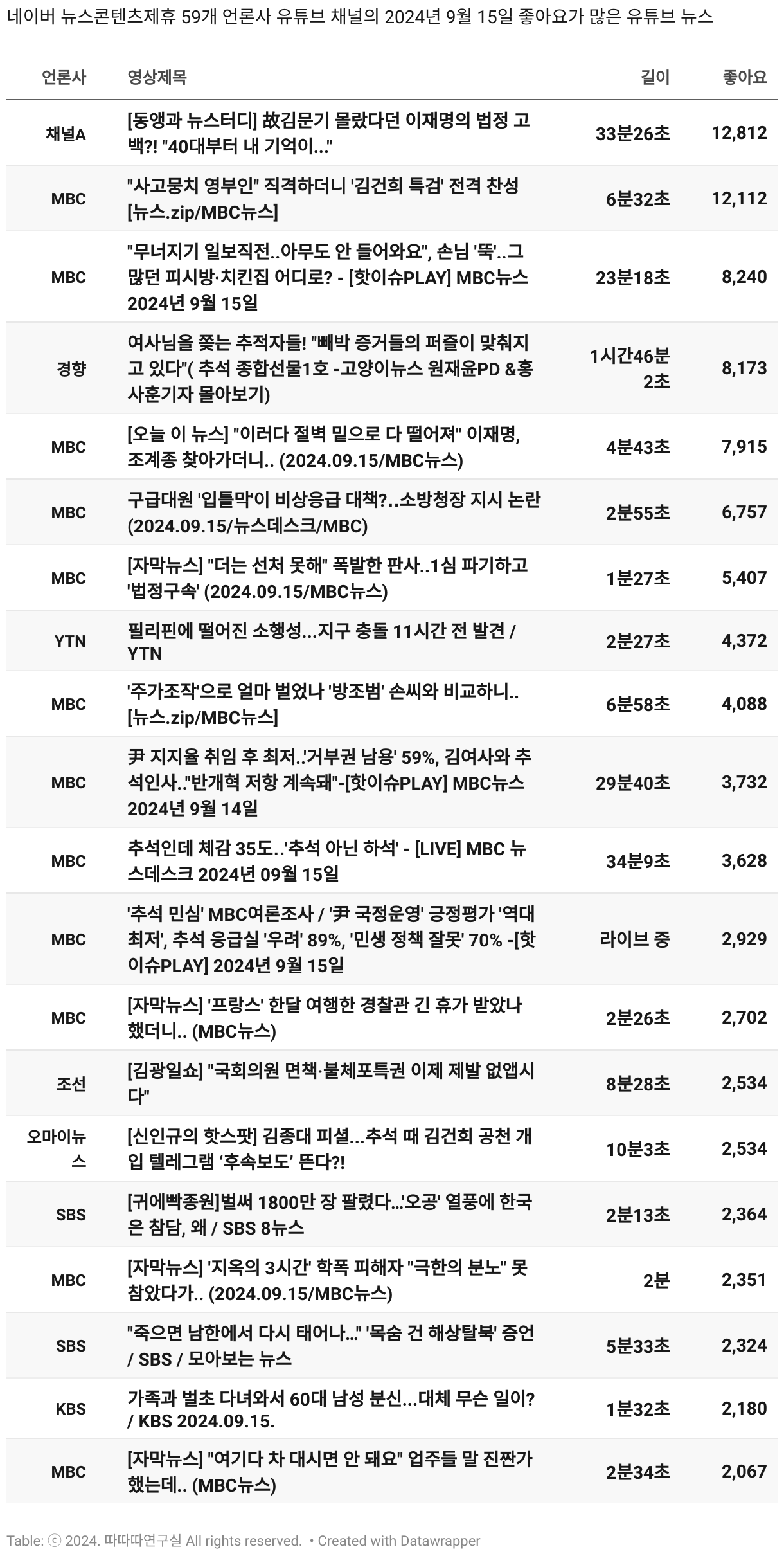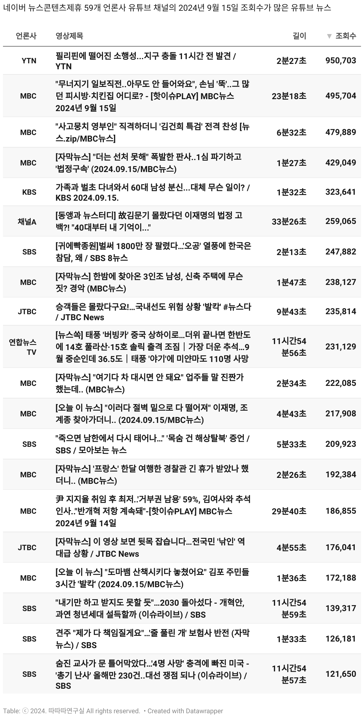*데이터 수집 기간 : 2024년 6월 10일 *데이터 수집 대상 : 네이버 뉴스콘텐츠제휴 60개 언론사. 종합일간지 10개(경향신문, 국민일보, 동아일보, 문화일보, 서울신문, 세계일보, 조선일보, 중앙일보, 한겨레신문, 한국일보), 방송/통신사 14개(뉴스1, 뉴시스, 연합뉴스, 연합뉴스TV, 채널A, 한국경제TV, JTBC, KBS, MBC, MBN, SBS, SBS BIZ, TV조선, YTN), 경제지 11개(매일경제, 머니투데이, 비즈워치, 서울경제, 아시아경제, 이데일리, 조선비즈, 조세일보, 파이낸셜뉴스, 한국경제(유튜브제외), 헤럴드경제) 인터넷 8개(노컷뉴스, 더팩트, 데일리안, 머니S, 미디어오늘, 아이뉴스24, 오마이뉴스, 프레시안), IT 5개(디지털데일리,디지털타임스, 블로터, 전자신문, 지디넷코리아), 지역 12개(강원도민일보, 강원일보, 경기일보, 국제신문, 대구MBC, 대전일보, 매일신문, 부산일보, 전주MBC, CJB청주방송, JIBS, kbc광주방송)