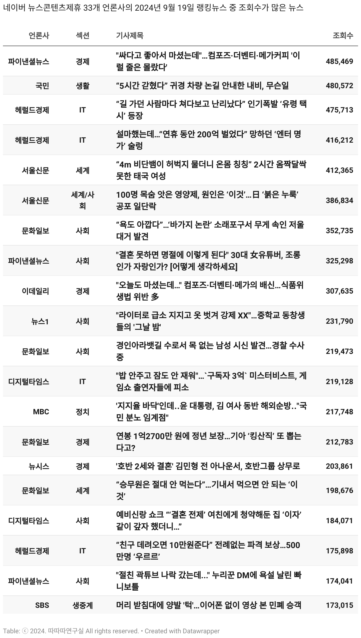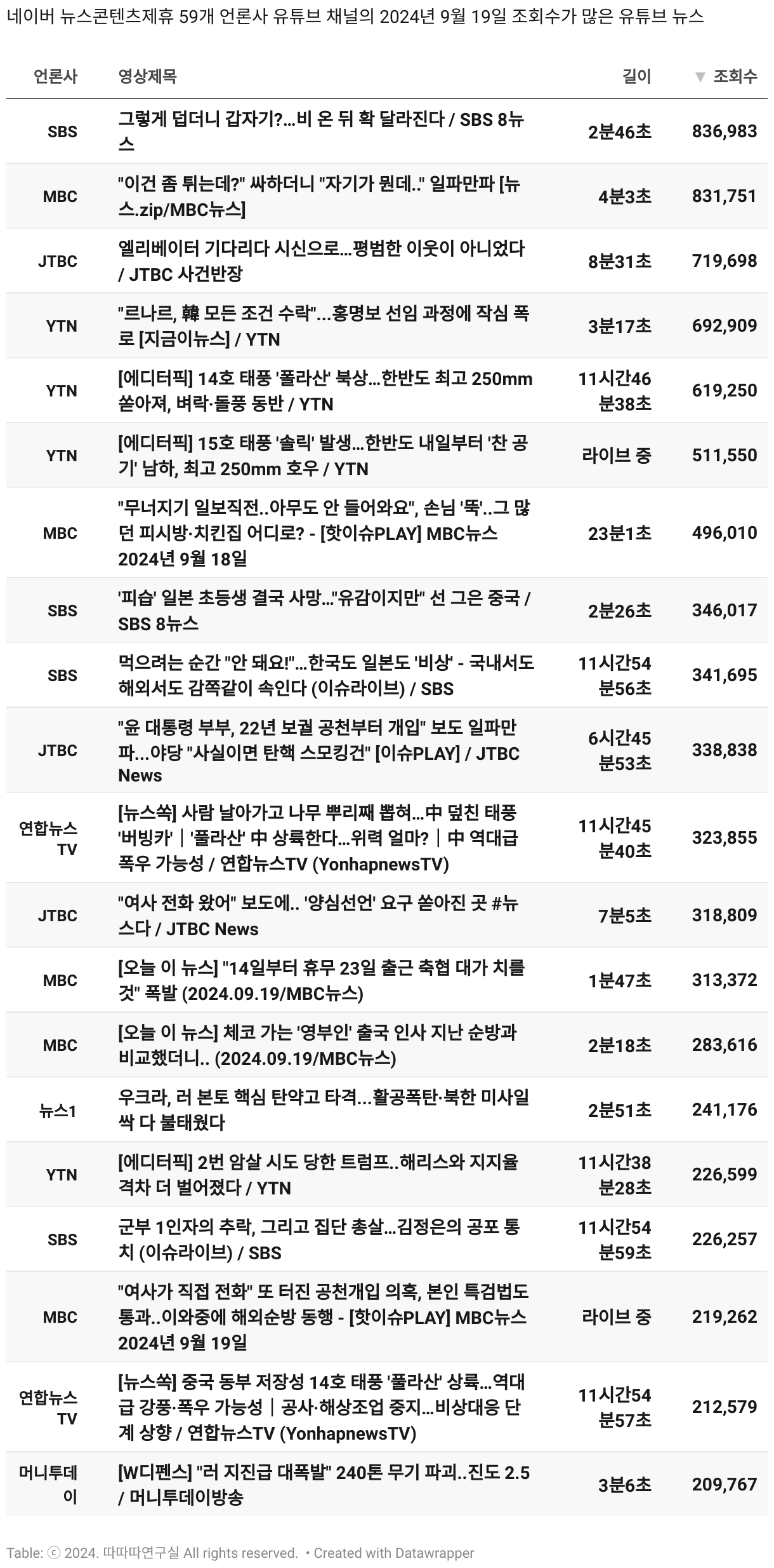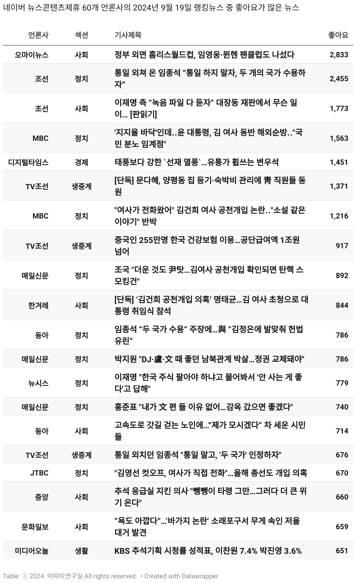 *데이터 수집 기간 : 2024년 6월 10일 *데이터 수집 대상 : 네이버 뉴스콘텐츠제휴 60개 언론사. 종합일간지 10개(경향신문, 국민일보, 동아일보, 문화일보, 서울신문, 세계일보, 조선일보, 중앙일보, 한겨레신문, 한국일보), 방송/통신사 14개(뉴스1, 뉴시스, 연합뉴스, 연합뉴스TV, 채널A, 한국경제TV, JTBC, KBS, MBC, MBN, SBS, SBS BIZ, TV조선, YTN), 경제지 11개(매일경제, 머니투데이, 비즈워치, 서울경제, 아시아경제, 이데일리, 조선비즈, 조세일보, 파이낸셜뉴스, 한국경제(유튜브제외), 헤럴드경제) 인터넷 8개(노컷뉴스, 더팩트, 데일리안, 머니S, 미디어오늘, 아이뉴스24, 오마이뉴스, 프레시안), IT 5개(디지털데일리,디지털타임스, 블로터, 전자신문, 지디넷코리아), 지역 12개(강원도민일보, 강원일보, 경기일보, 국제신문, 대구MBC, 대전일보, 매일신문, 부산일보, 전주MBC, CJB청주방송, JIBS, kbc광주방송)