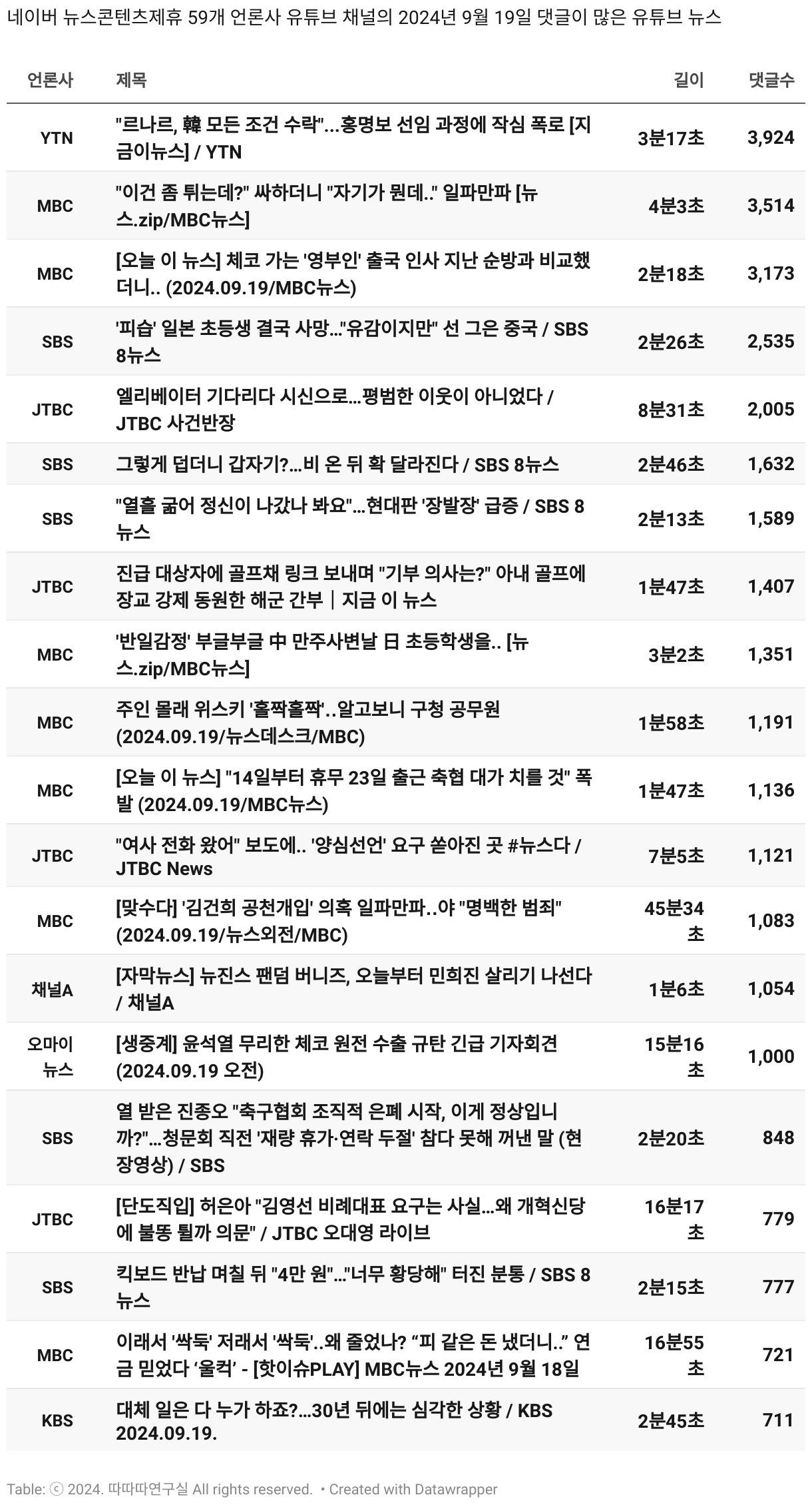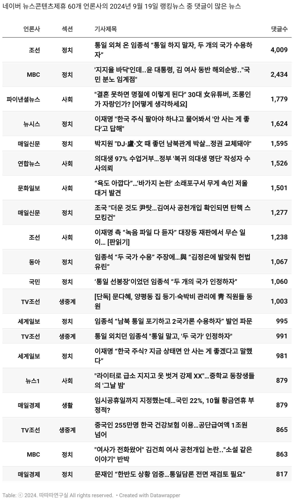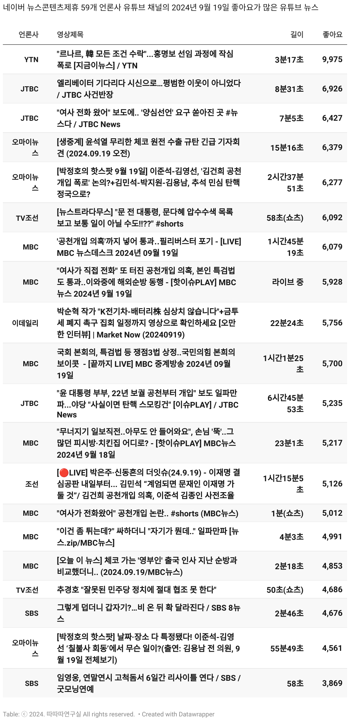 *데이터 수집 기간 : 2024년 6월 10일 *데이터 수집 대상 : 네이버 뉴스콘텐츠제휴 60개 언론사. 종합일간지 10개(경향신문, 국민일보, 동아일보, 문화일보, 서울신문, 세계일보, 조선일보, 중앙일보, 한겨레신문, 한국일보), 방송/통신사 14개(뉴스1, 뉴시스, 연합뉴스, 연합뉴스TV, 채널A, 한국경제TV, JTBC, KBS, MBC, MBN, SBS, SBS BIZ, TV조선, YTN), 경제지 11개(매일경제, 머니투데이, 비즈워치, 서울경제, 아시아경제, 이데일리, 조선비즈, 조세일보, 파이낸셜뉴스, 한국경제(유튜브제외), 헤럴드경제) 인터넷 8개(노컷뉴스, 더팩트, 데일리안, 머니S, 미디어오늘, 아이뉴스24, 오마이뉴스, 프레시안), IT 5개(디지털데일리,디지털타임스, 블로터, 전자신문, 지디넷코리아), 지역 12개(강원도민일보, 강원일보, 경기일보, 국제신문, 대구MBC, 대전일보, 매일신문, 부산일보, 전주MBC, CJB청주방송, JIBS, kbc광주방송)