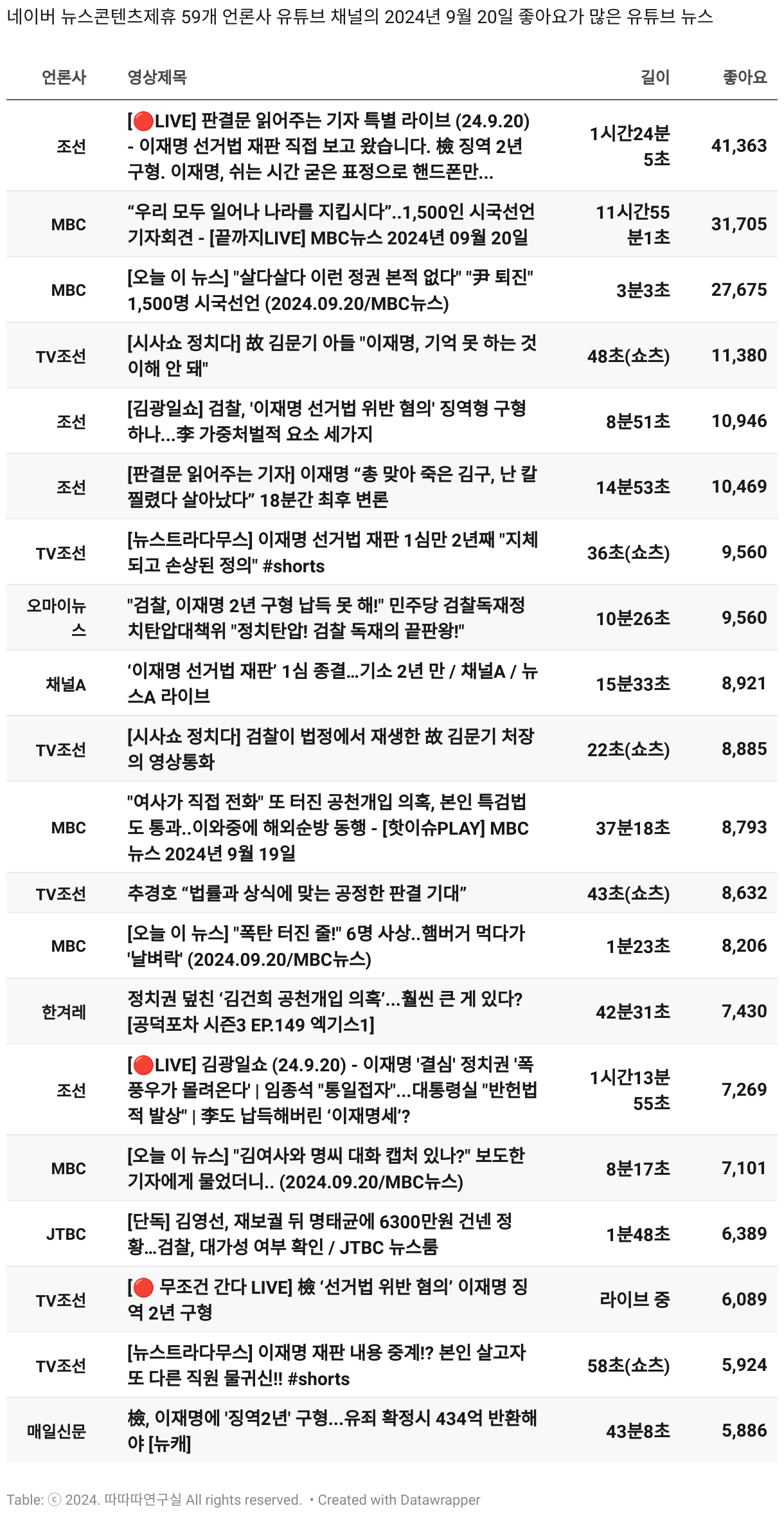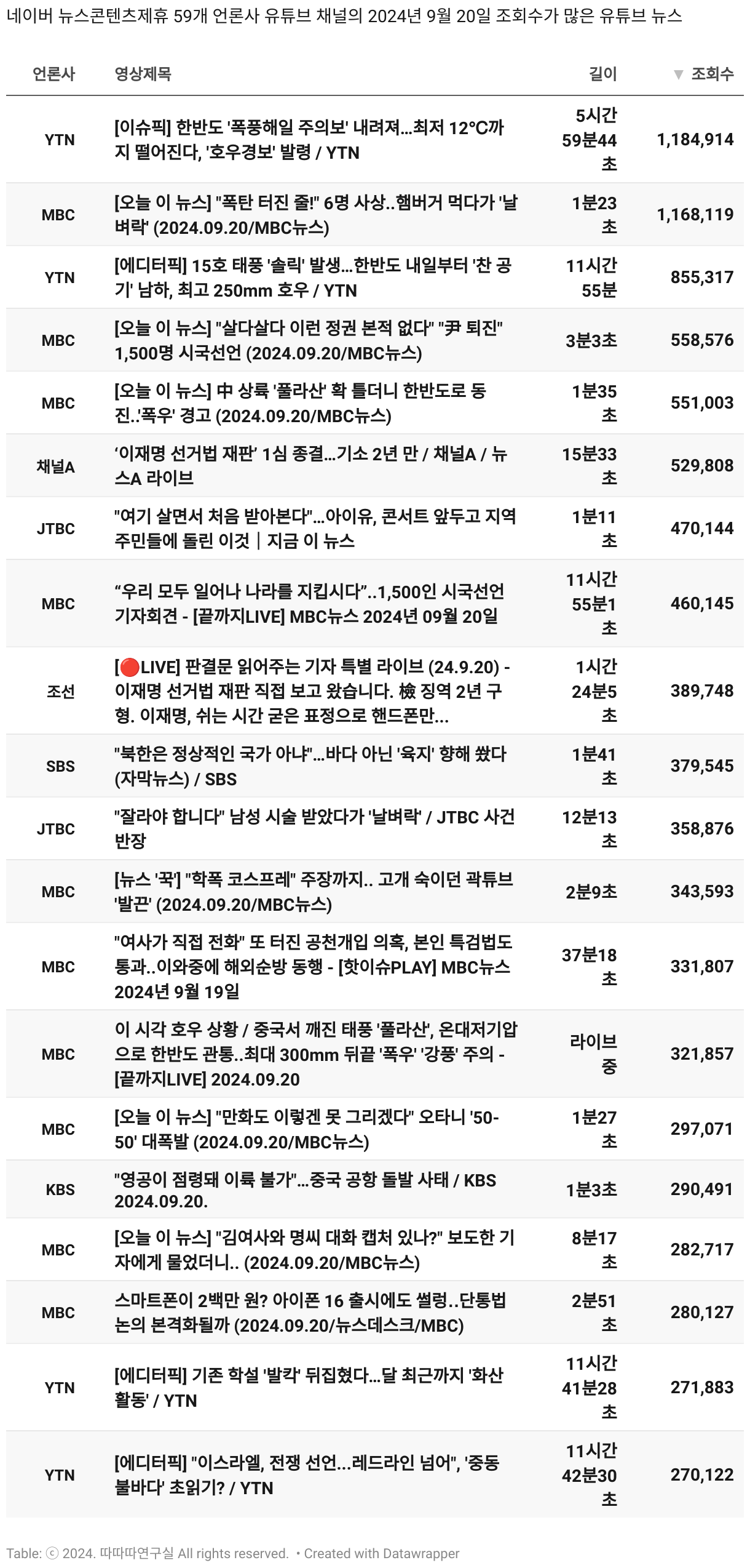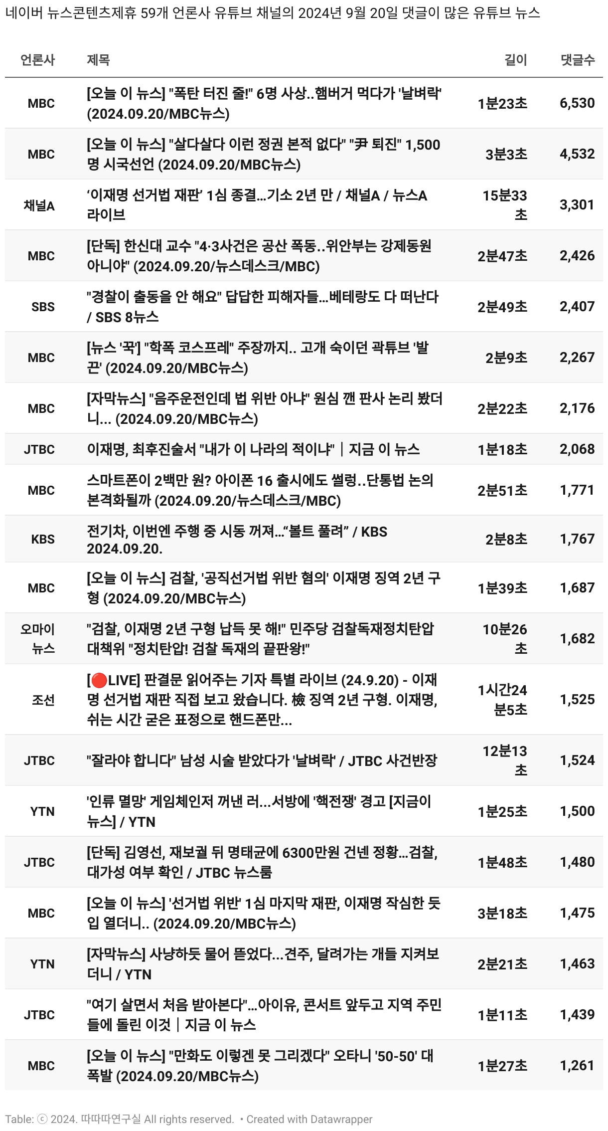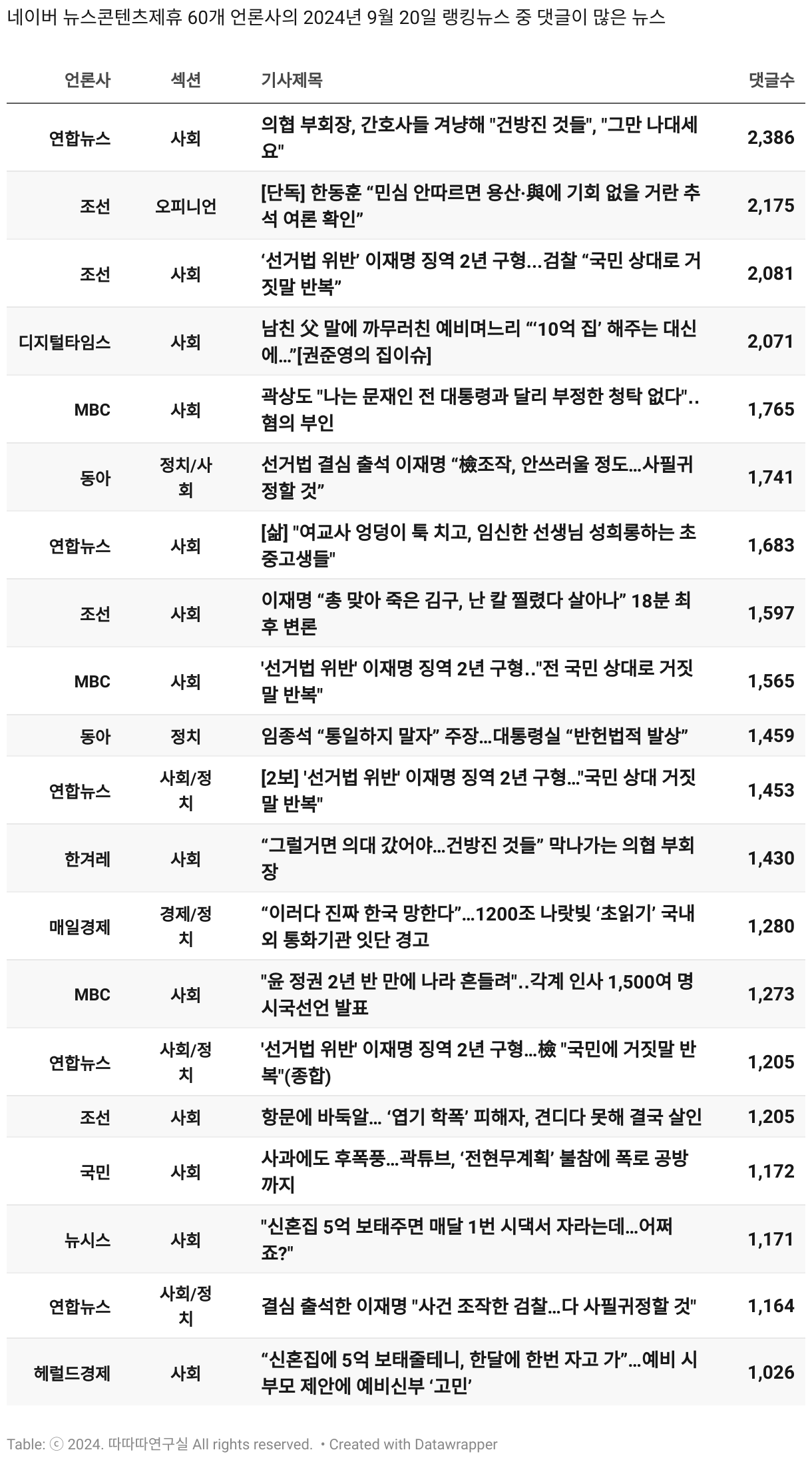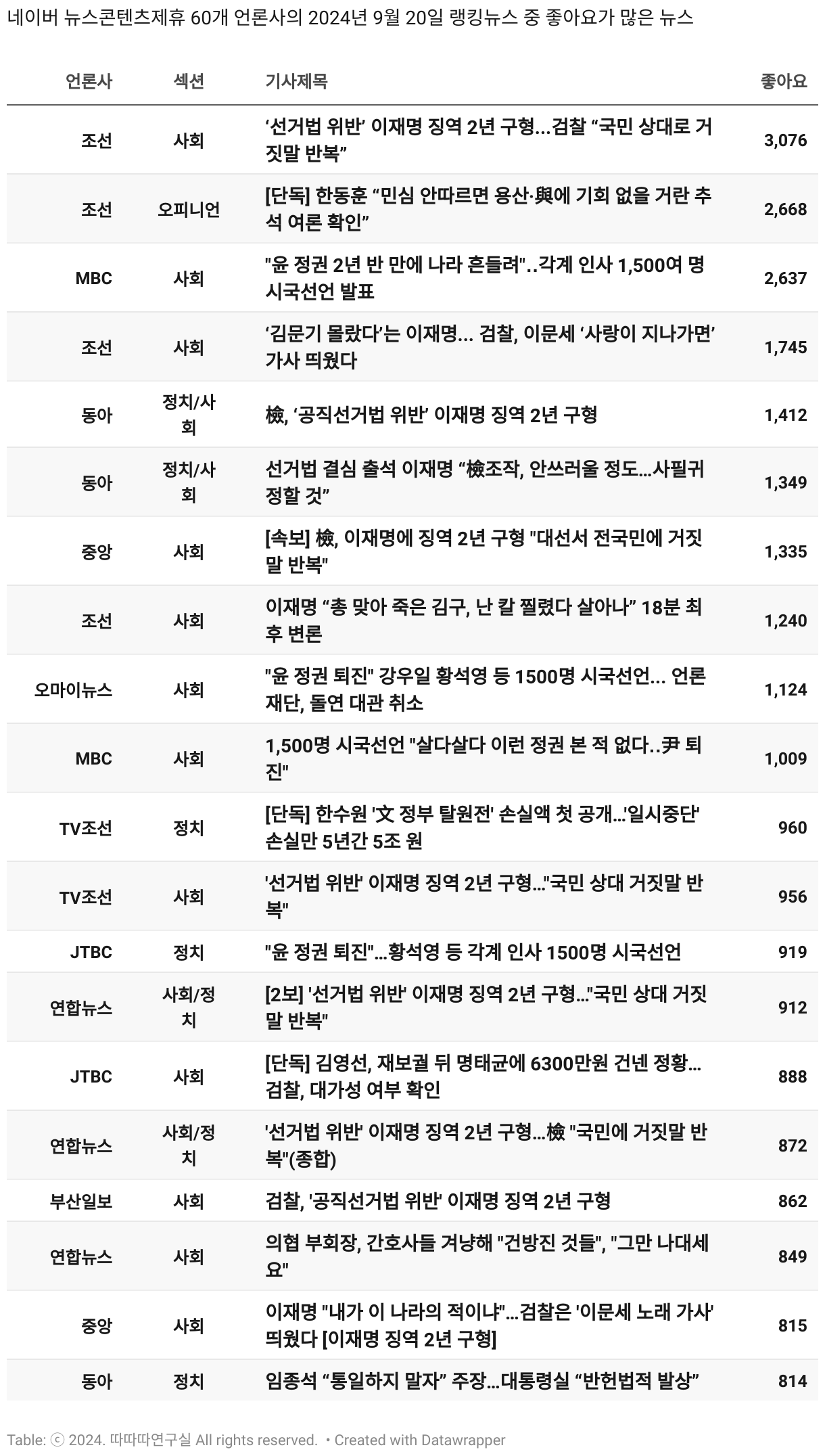*데이터 수집 기간 : 2024년 6월 10일 *데이터 수집 대상 : 네이버 뉴스콘텐츠제휴 60개 언론사. 종합일간지 10개(경향신문, 국민일보, 동아일보, 문화일보, 서울신문, 세계일보, 조선일보, 중앙일보, 한겨레신문, 한국일보), 방송/통신사 14개(뉴스1, 뉴시스, 연합뉴스, 연합뉴스TV, 채널A, 한국경제TV, JTBC, KBS, MBC, MBN, SBS, SBS BIZ, TV조선, YTN), 경제지 11개(매일경제, 머니투데이, 비즈워치, 서울경제, 아시아경제, 이데일리, 조선비즈, 조세일보, 파이낸셜뉴스, 한국경제(유튜브제외), 헤럴드경제) 인터넷 8개(노컷뉴스, 더팩트, 데일리안, 머니S, 미디어오늘, 아이뉴스24, 오마이뉴스, 프레시안), IT 5개(디지털데일리,디지털타임스, 블로터, 전자신문, 지디넷코리아), 지역 12개(강원도민일보, 강원일보, 경기일보, 국제신문, 대구MBC, 대전일보, 매일신문, 부산일보, 전주MBC, CJB청주방송, JIBS, kbc광주방송)