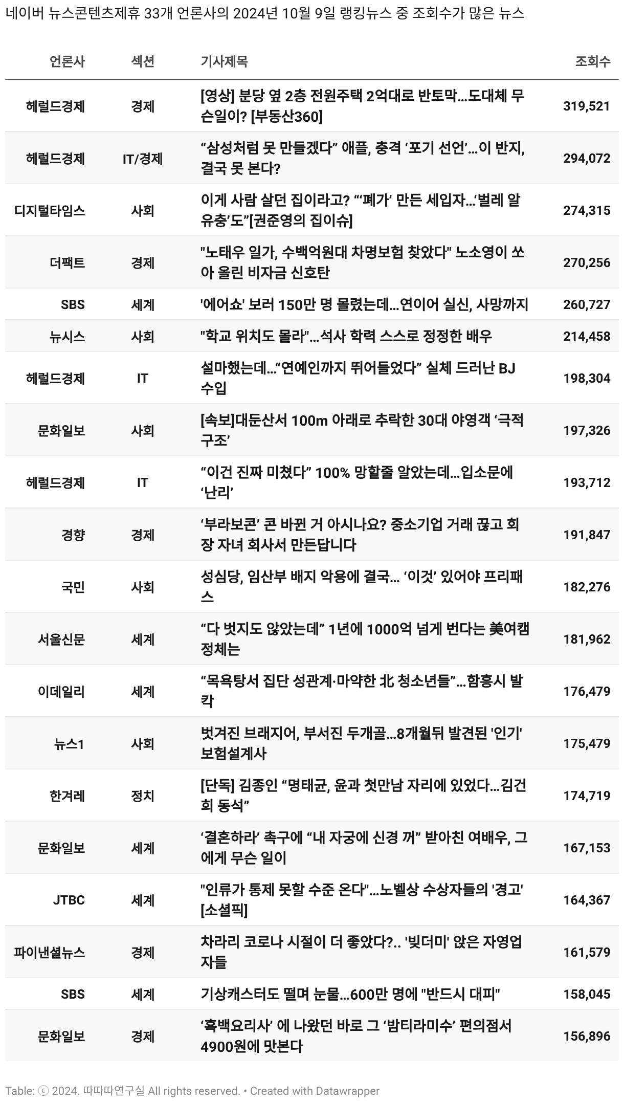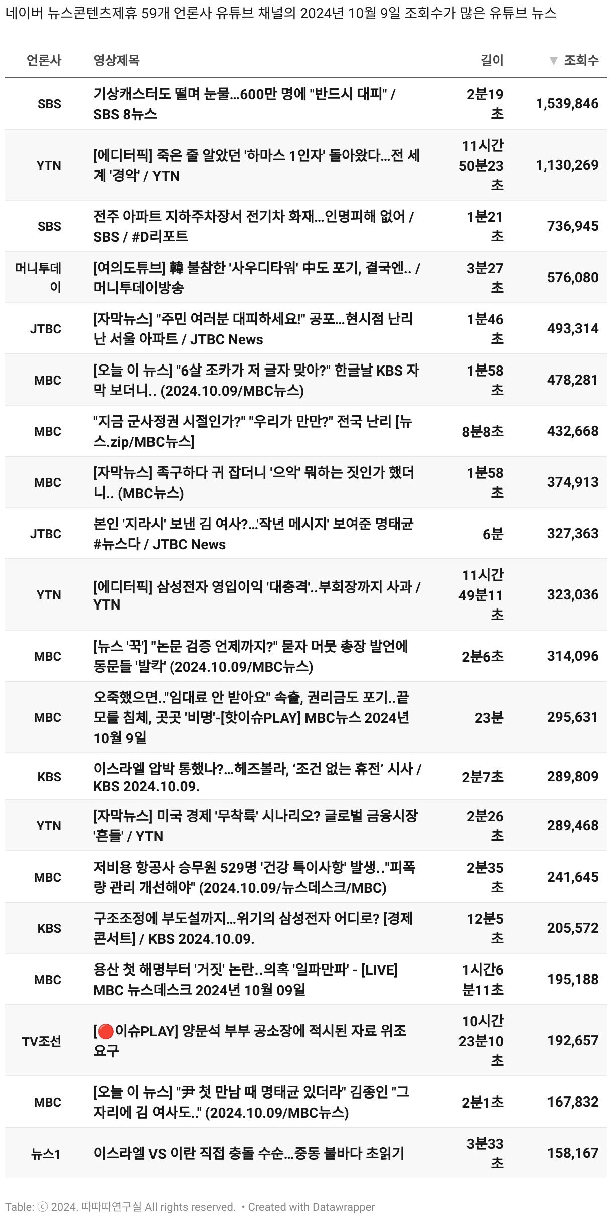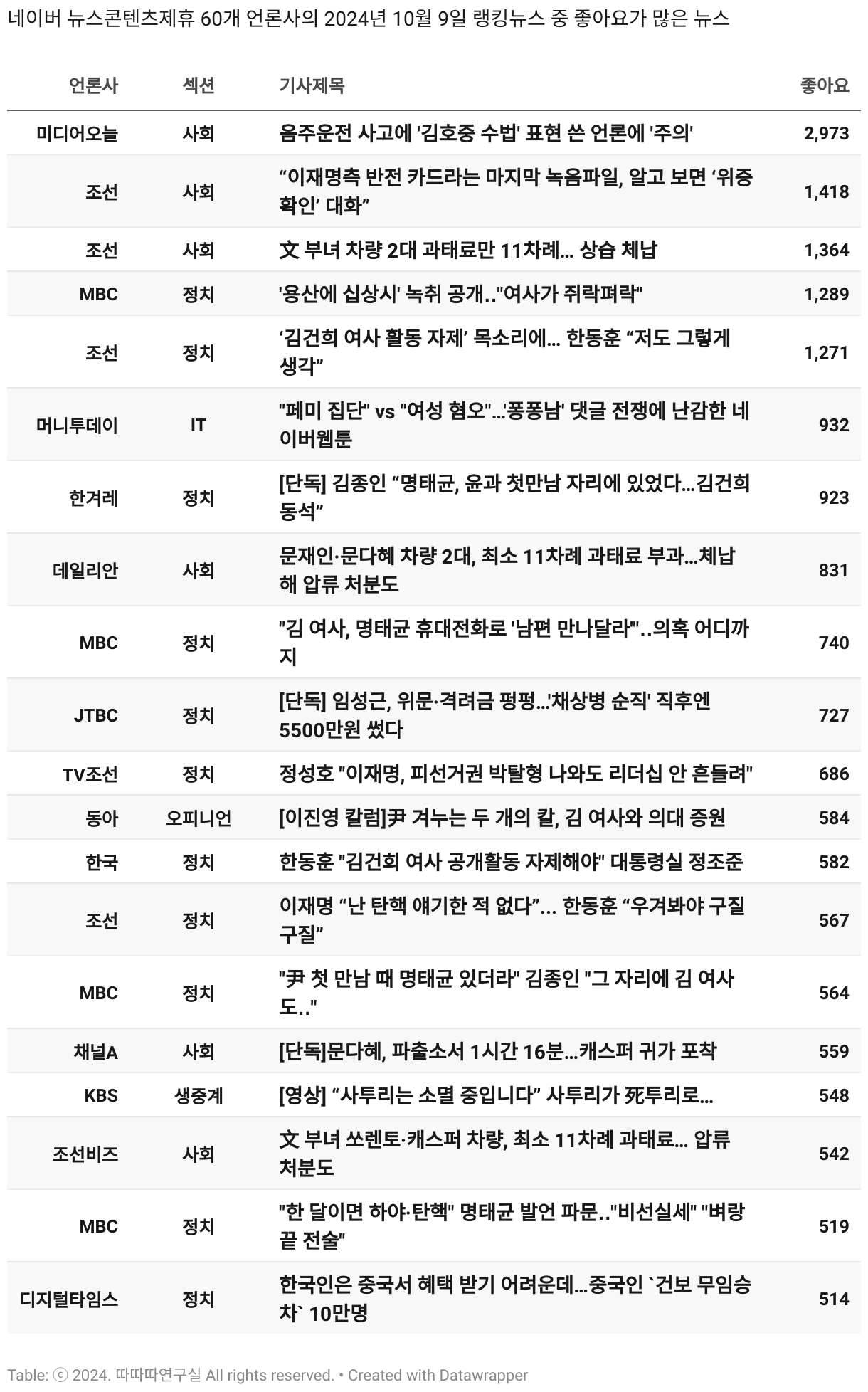 *데이터 수집 기간 : 2024년 6월 10일 *데이터 수집 대상 : 네이버 뉴스콘텐츠제휴 60개 언론사. 종합일간지 10개(경향신문, 국민일보, 동아일보, 문화일보, 서울신문, 세계일보, 조선일보, 중앙일보, 한겨레신문, 한국일보), 방송/통신사 14개(뉴스1, 뉴시스, 연합뉴스, 연합뉴스TV, 채널A, 한국경제TV, JTBC, KBS, MBC, MBN, SBS, SBS BIZ, TV조선, YTN), 경제지 11개(매일경제, 머니투데이, 비즈워치, 서울경제, 아시아경제, 이데일리, 조선비즈, 조세일보, 파이낸셜뉴스, 한국경제(유튜브제외), 헤럴드경제) 인터넷 8개(노컷뉴스, 더팩트, 데일리안, 머니S, 미디어오늘, 아이뉴스24, 오마이뉴스, 프레시안), IT 5개(디지털데일리,디지털타임스, 블로터, 전자신문, 지디넷코리아), 지역 12개(강원도민일보, 강원일보, 경기일보, 국제신문, 대구MBC, 대전일보, 매일신문, 부산일보, 전주MBC, CJB청주방송, JIBS, kbc광주방송)