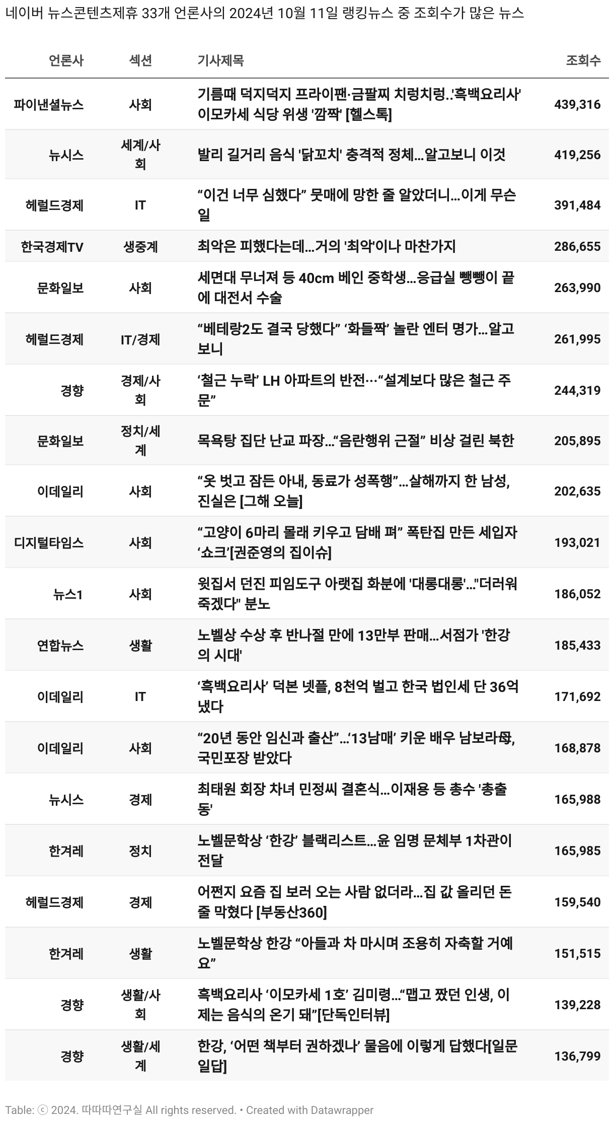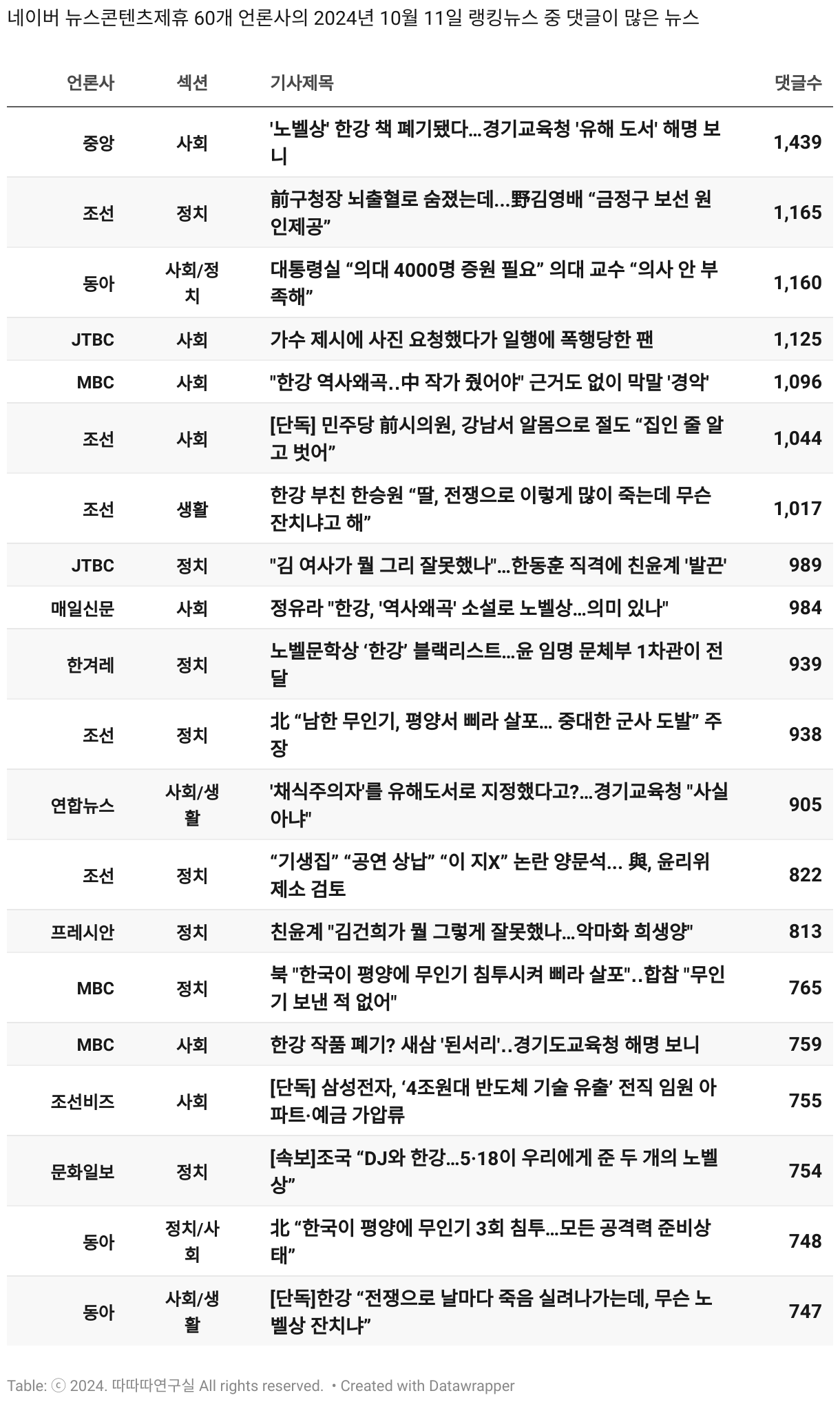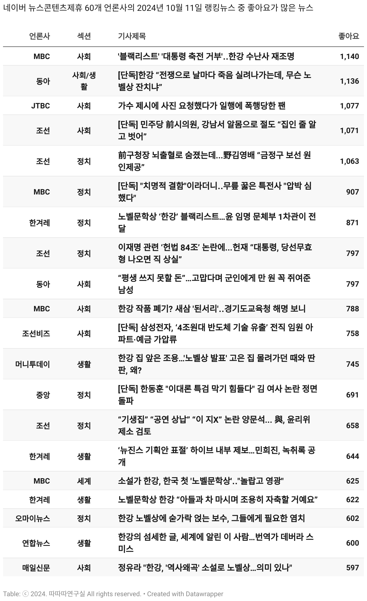 *데이터 수집 기간 : 2024년 6월 10일 *데이터 수집 대상 : 네이버 뉴스콘텐츠제휴 60개 언론사. 종합일간지 10개(경향신문, 국민일보, 동아일보, 문화일보, 서울신문, 세계일보, 조선일보, 중앙일보, 한겨레신문, 한국일보), 방송/통신사 14개(뉴스1, 뉴시스, 연합뉴스, 연합뉴스TV, 채널A, 한국경제TV, JTBC, KBS, MBC, MBN, SBS, SBS BIZ, TV조선, YTN), 경제지 11개(매일경제, 머니투데이, 비즈워치, 서울경제, 아시아경제, 이데일리, 조선비즈, 조세일보, 파이낸셜뉴스, 한국경제(유튜브제외), 헤럴드경제) 인터넷 8개(노컷뉴스, 더팩트, 데일리안, 머니S, 미디어오늘, 아이뉴스24, 오마이뉴스, 프레시안), IT 5개(디지털데일리,디지털타임스, 블로터, 전자신문, 지디넷코리아), 지역 12개(강원도민일보, 강원일보, 경기일보, 국제신문, 대구MBC, 대전일보, 매일신문, 부산일보, 전주MBC, CJB청주방송, JIBS, kbc광주방송)