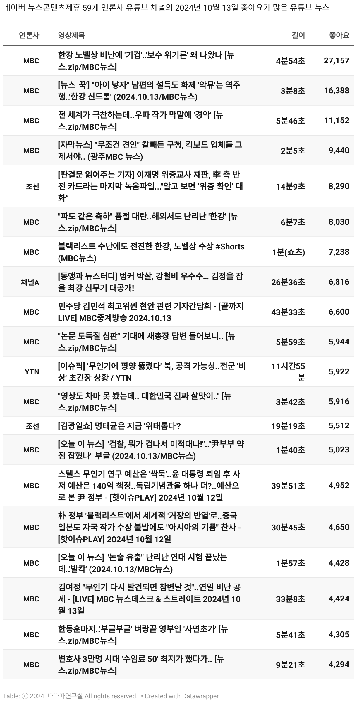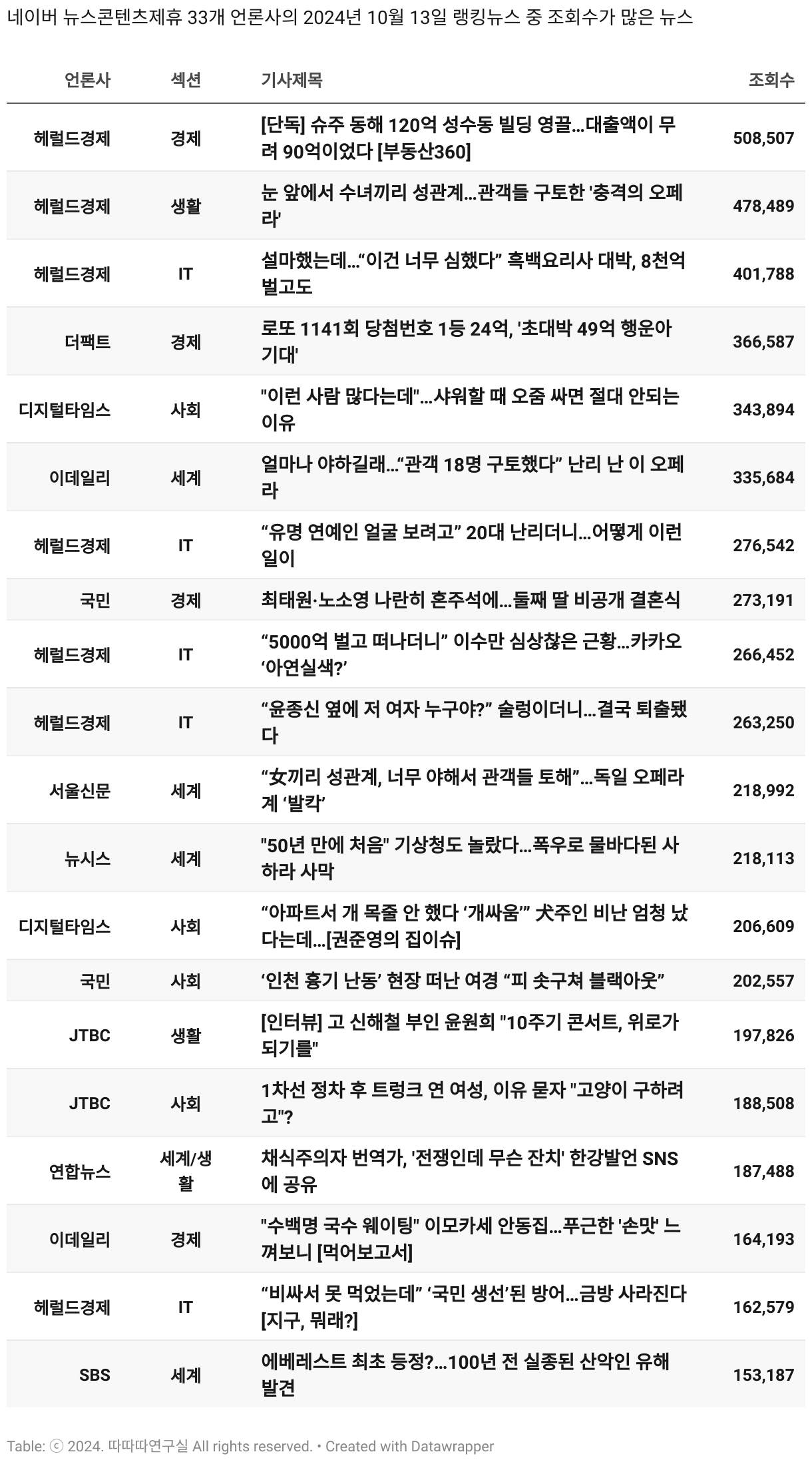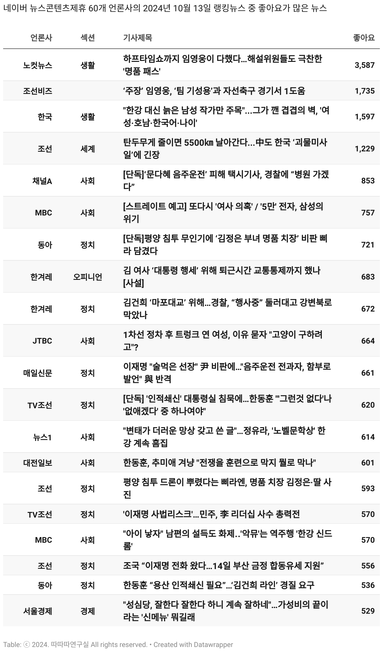 *데이터 수집 기간 : 2024년 6월 10일 *데이터 수집 대상 : 네이버 뉴스콘텐츠제휴 60개 언론사. 종합일간지 10개(경향신문, 국민일보, 동아일보, 문화일보, 서울신문, 세계일보, 조선일보, 중앙일보, 한겨레신문, 한국일보), 방송/통신사 14개(뉴스1, 뉴시스, 연합뉴스, 연합뉴스TV, 채널A, 한국경제TV, JTBC, KBS, MBC, MBN, SBS, SBS BIZ, TV조선, YTN), 경제지 11개(매일경제, 머니투데이, 비즈워치, 서울경제, 아시아경제, 이데일리, 조선비즈, 조세일보, 파이낸셜뉴스, 한국경제(유튜브제외), 헤럴드경제) 인터넷 8개(노컷뉴스, 더팩트, 데일리안, 머니S, 미디어오늘, 아이뉴스24, 오마이뉴스, 프레시안), IT 5개(디지털데일리,디지털타임스, 블로터, 전자신문, 지디넷코리아), 지역 12개(강원도민일보, 강원일보, 경기일보, 국제신문, 대구MBC, 대전일보, 매일신문, 부산일보, 전주MBC, CJB청주방송, JIBS, kbc광주방송)
